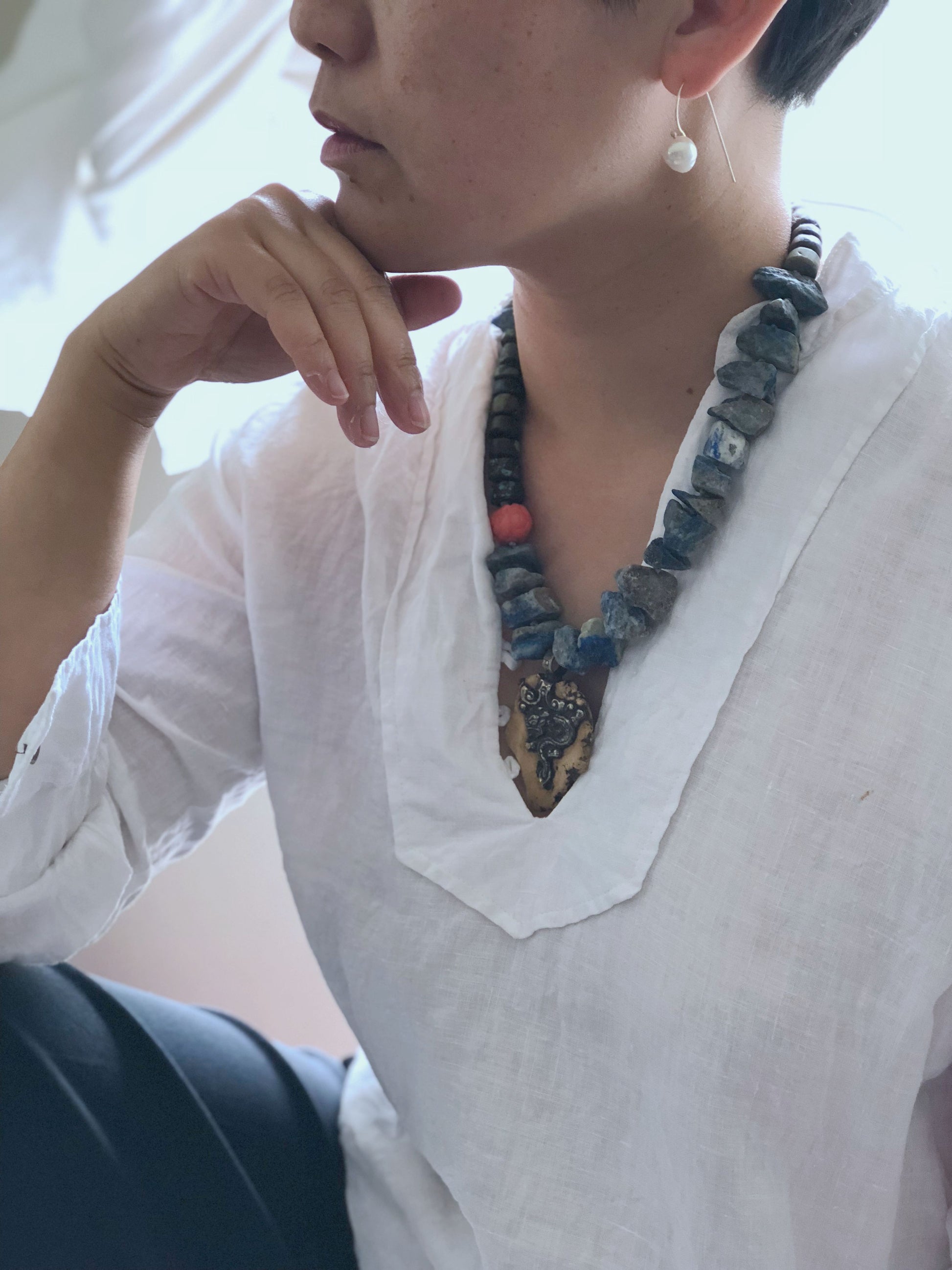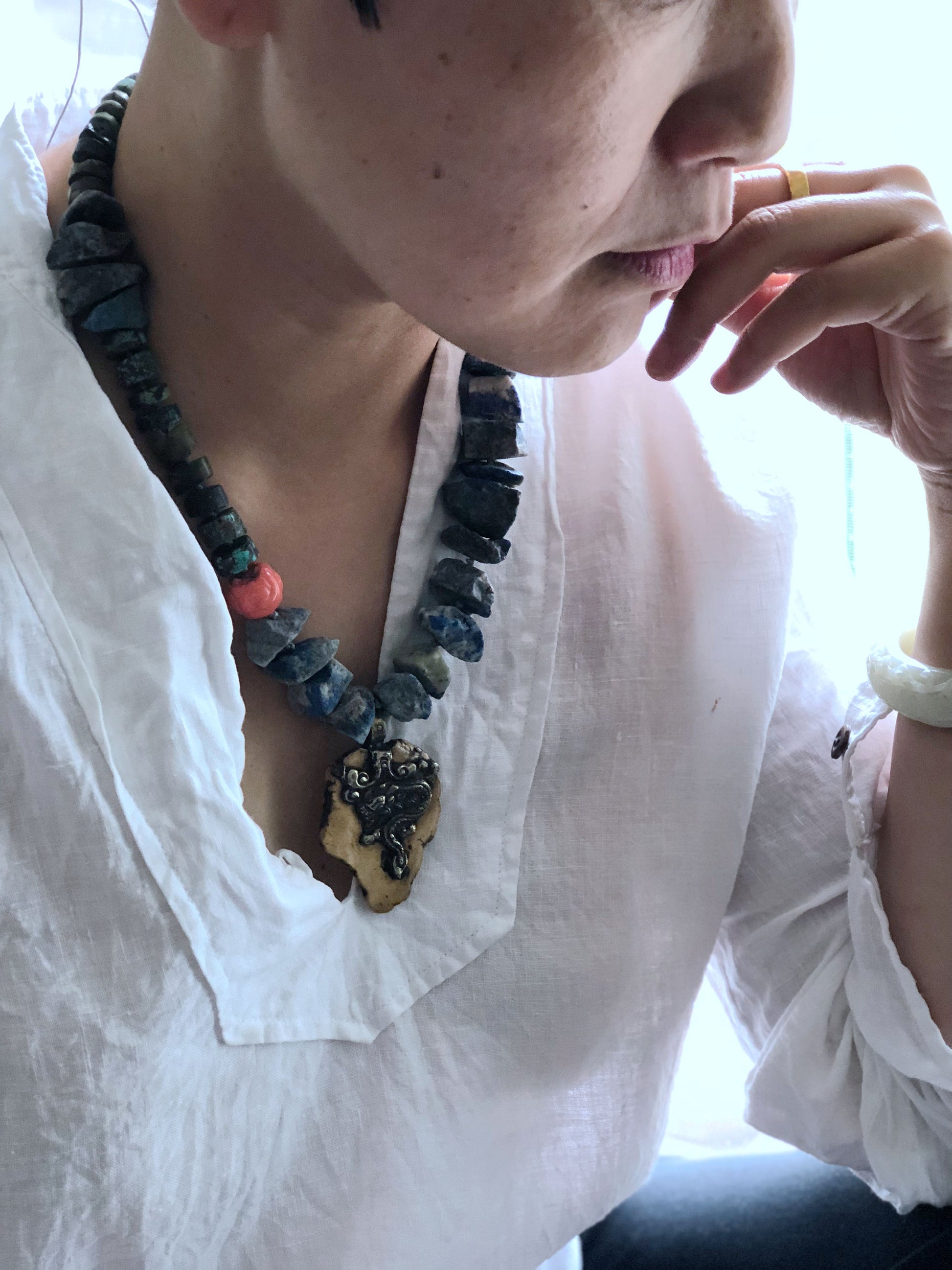Unique piece with stronger color -- old Tibetan silver pendent with jasper stone, match with unpolished irregular lapis beads, plus one piece of red coral. Another statement piece .