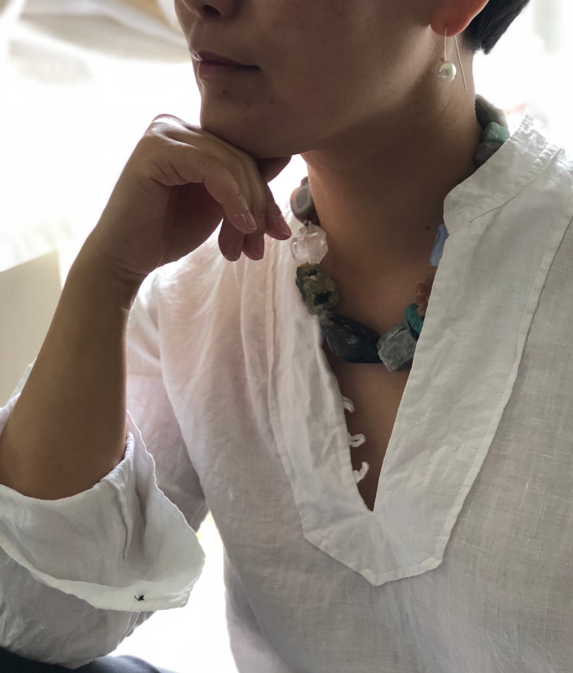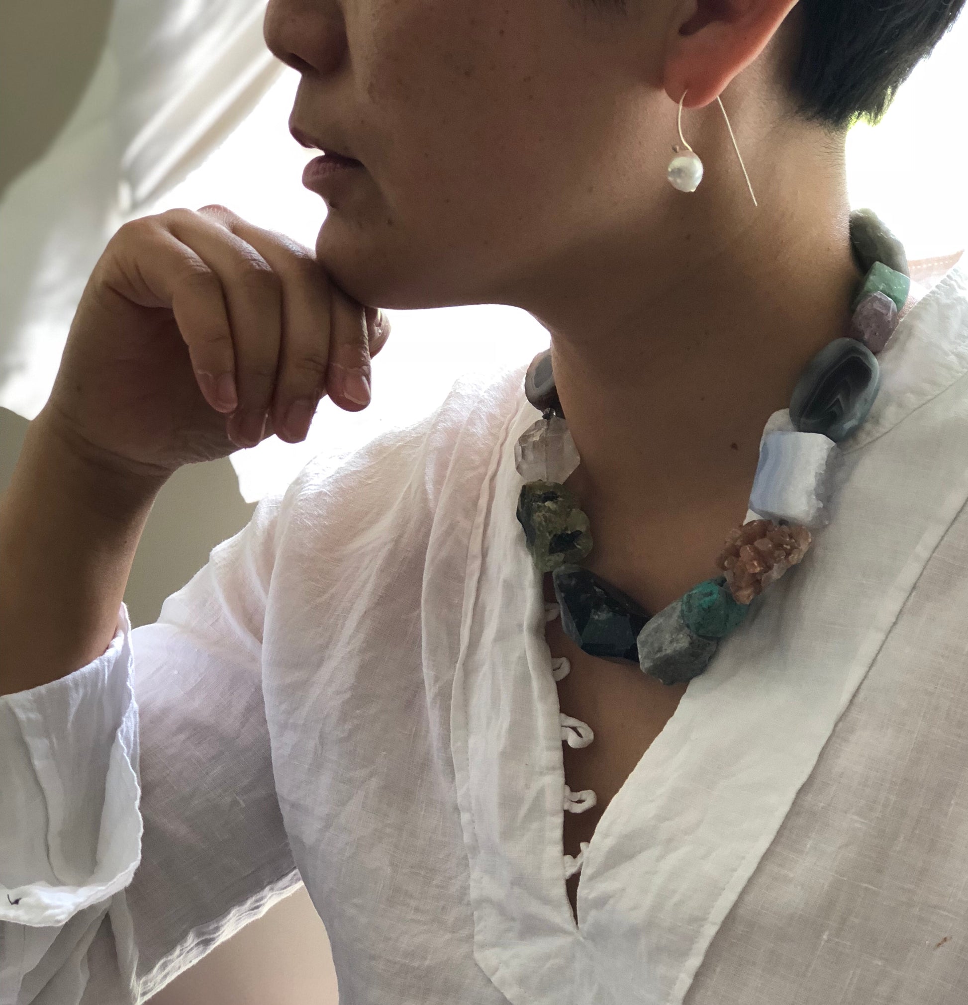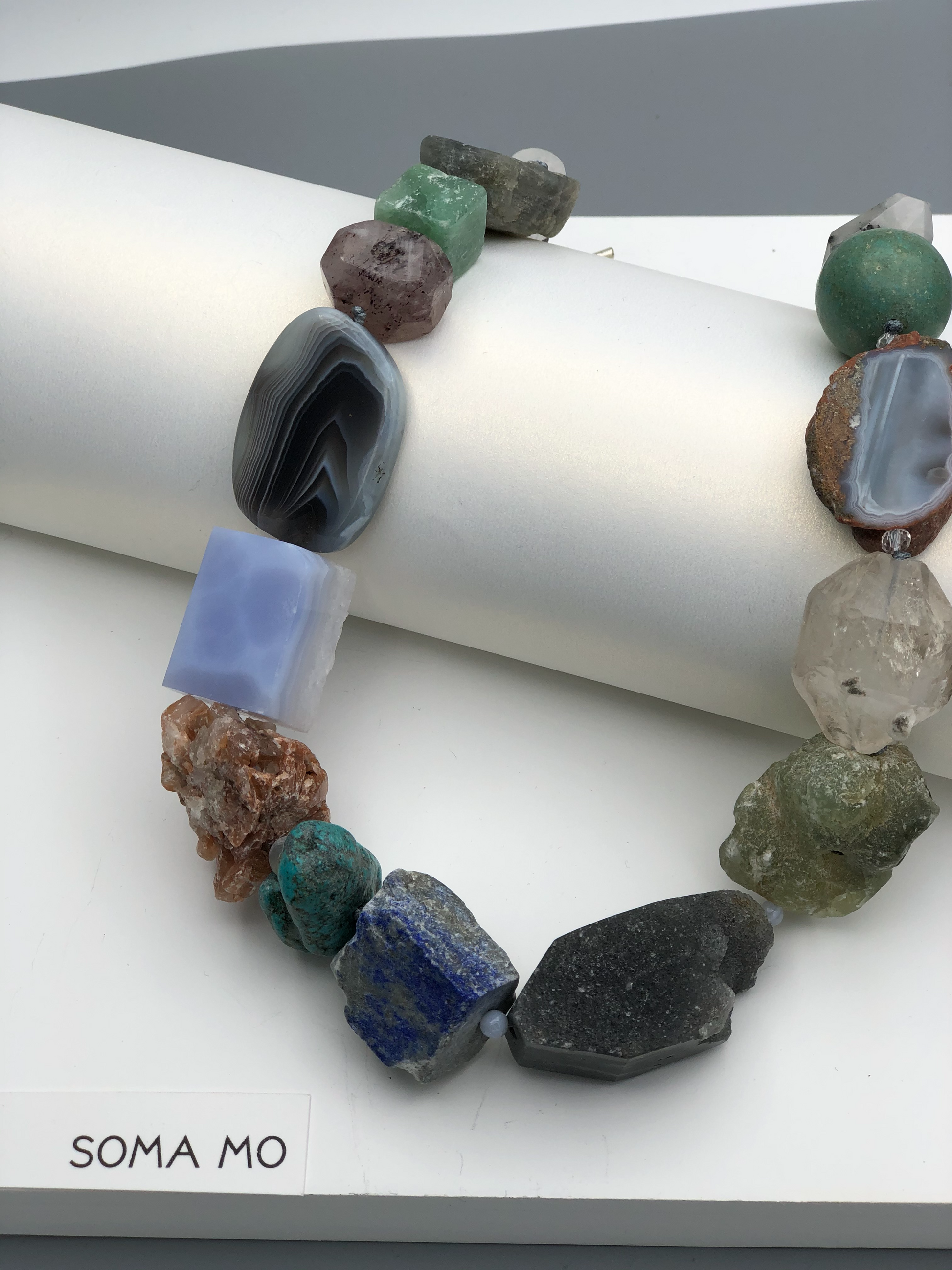 One of my signature piece , lots of rocks and colors , but balanced by size and shape , absolutely statement piece . Hand knotted between each beads.