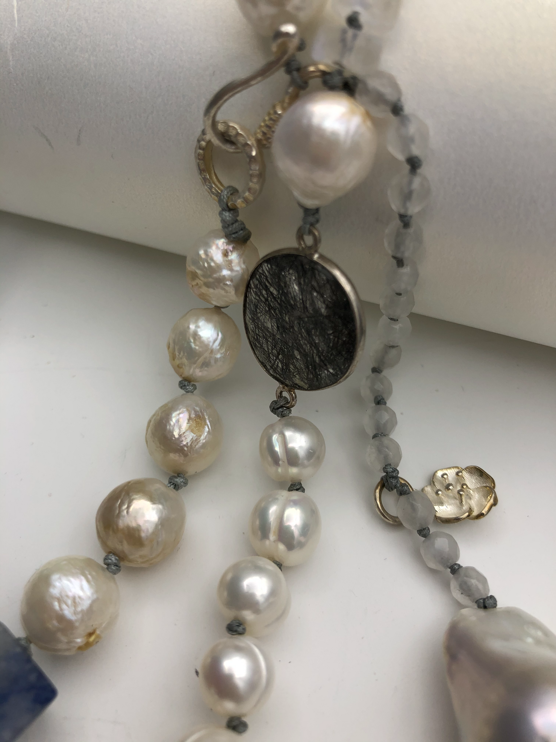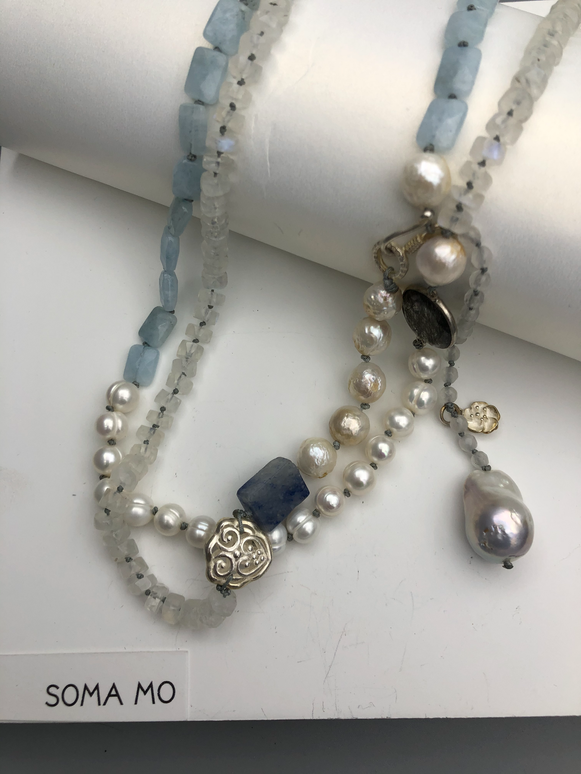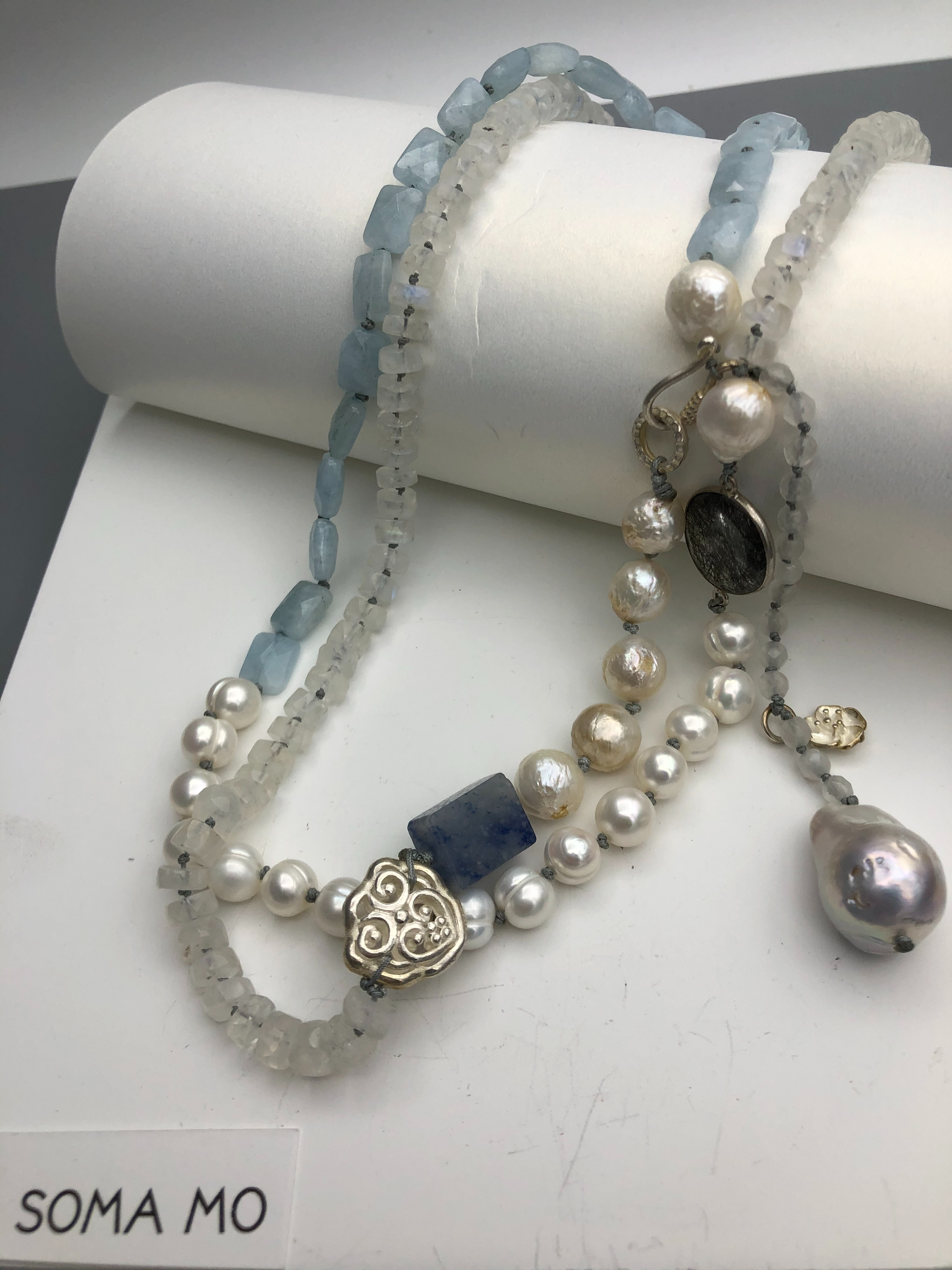 Materials : Aquamarine, moon stone, fresh water pearl, silver , agate