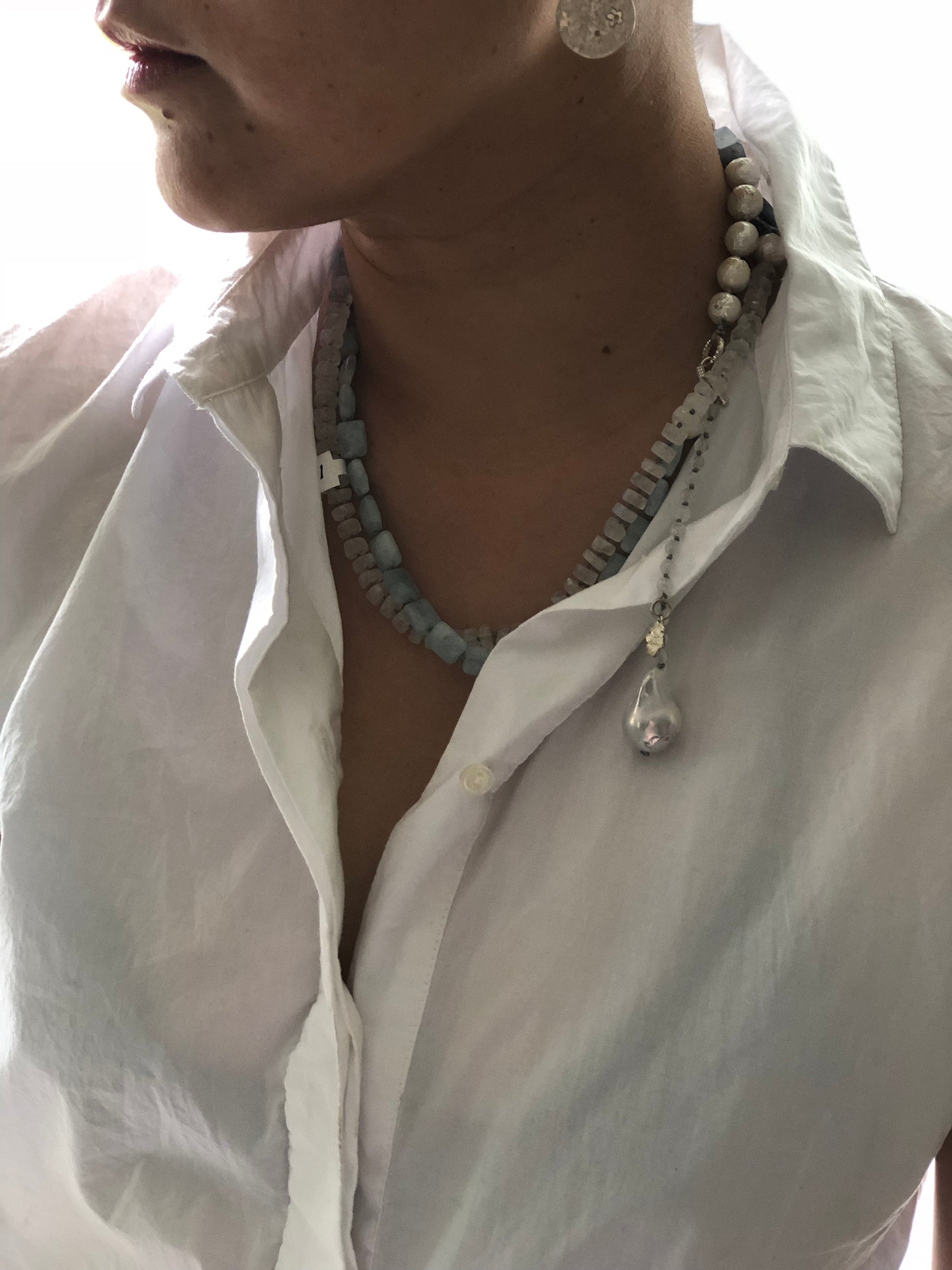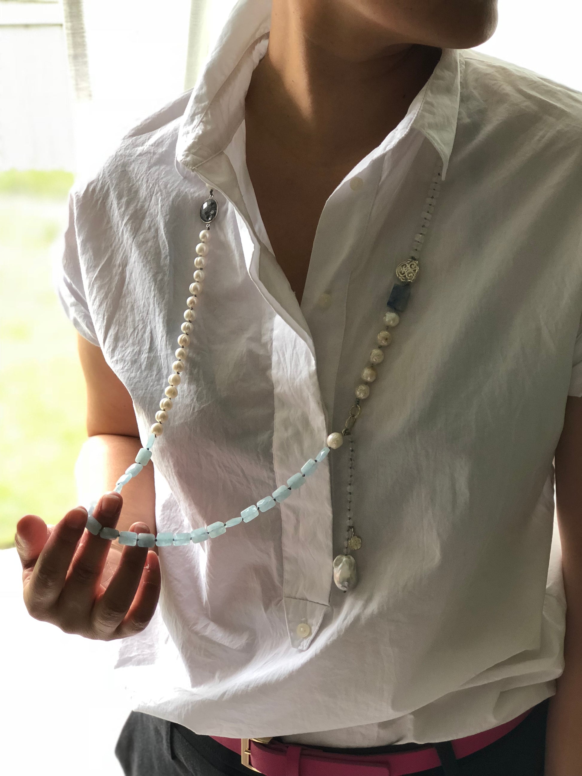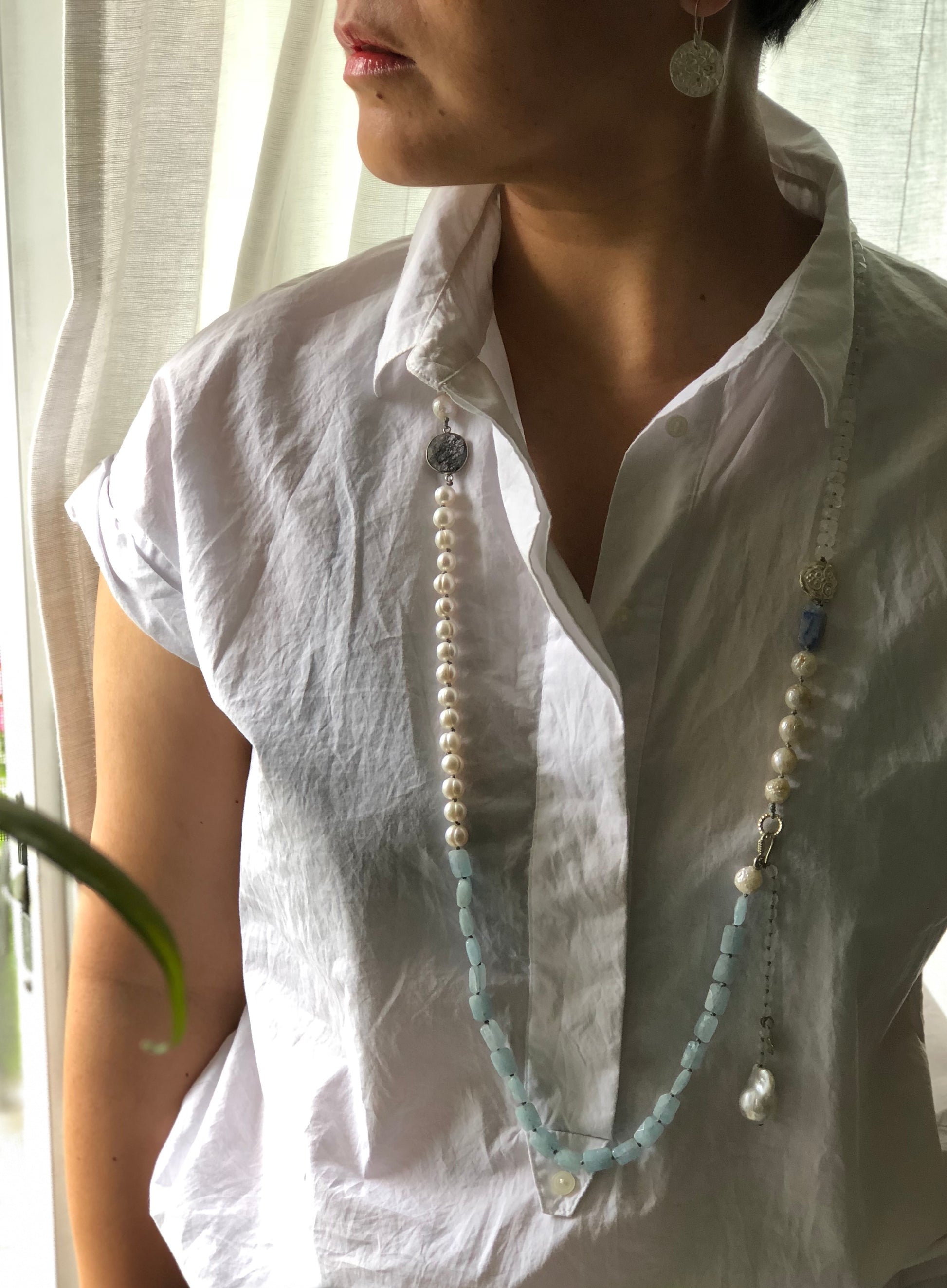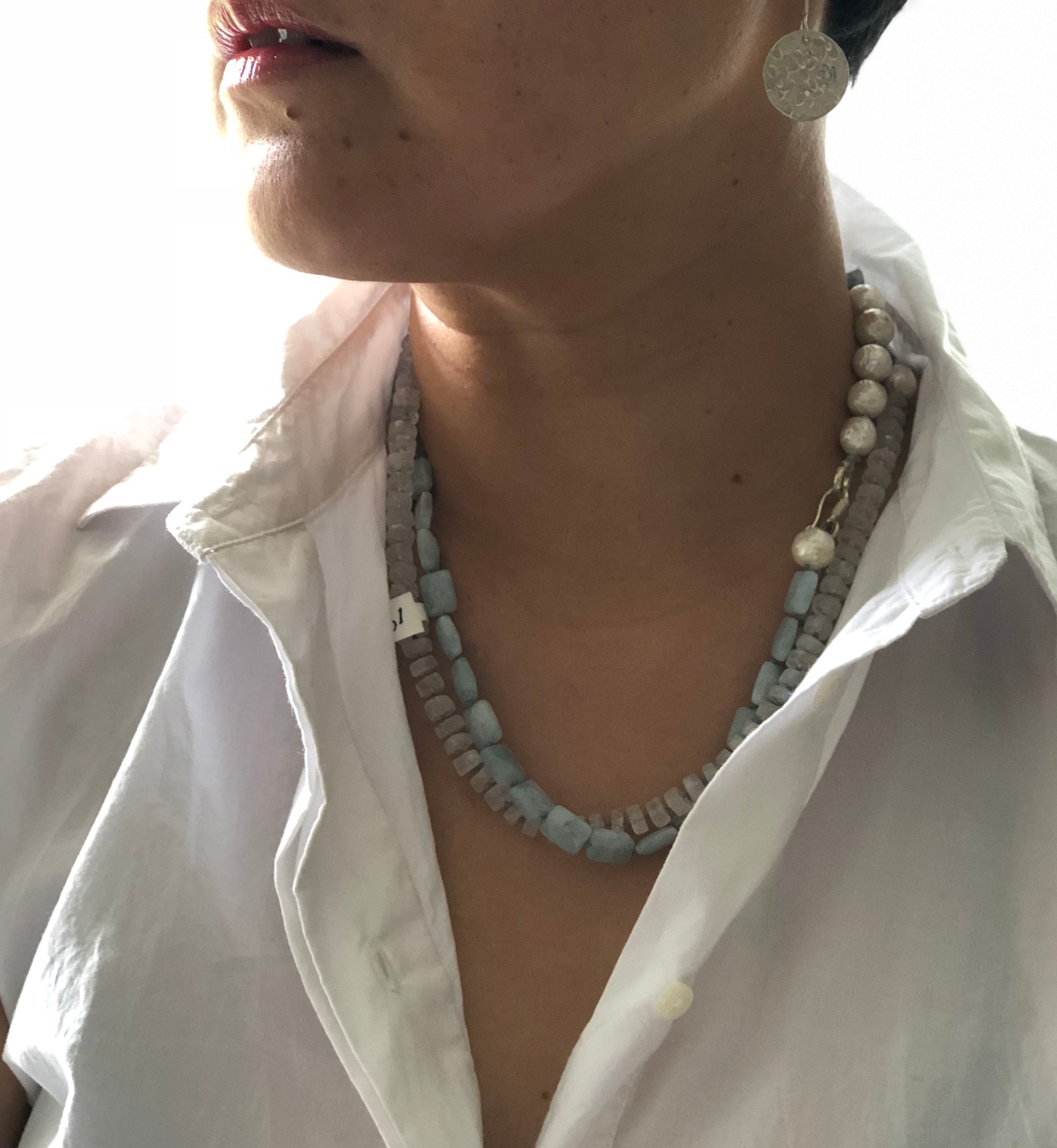 A spring and summer color, soft and light . Made of aquamarine and moonstone, with some luster from fresh water pearl . You can wear long or doubled. Hand knotted between each beads.