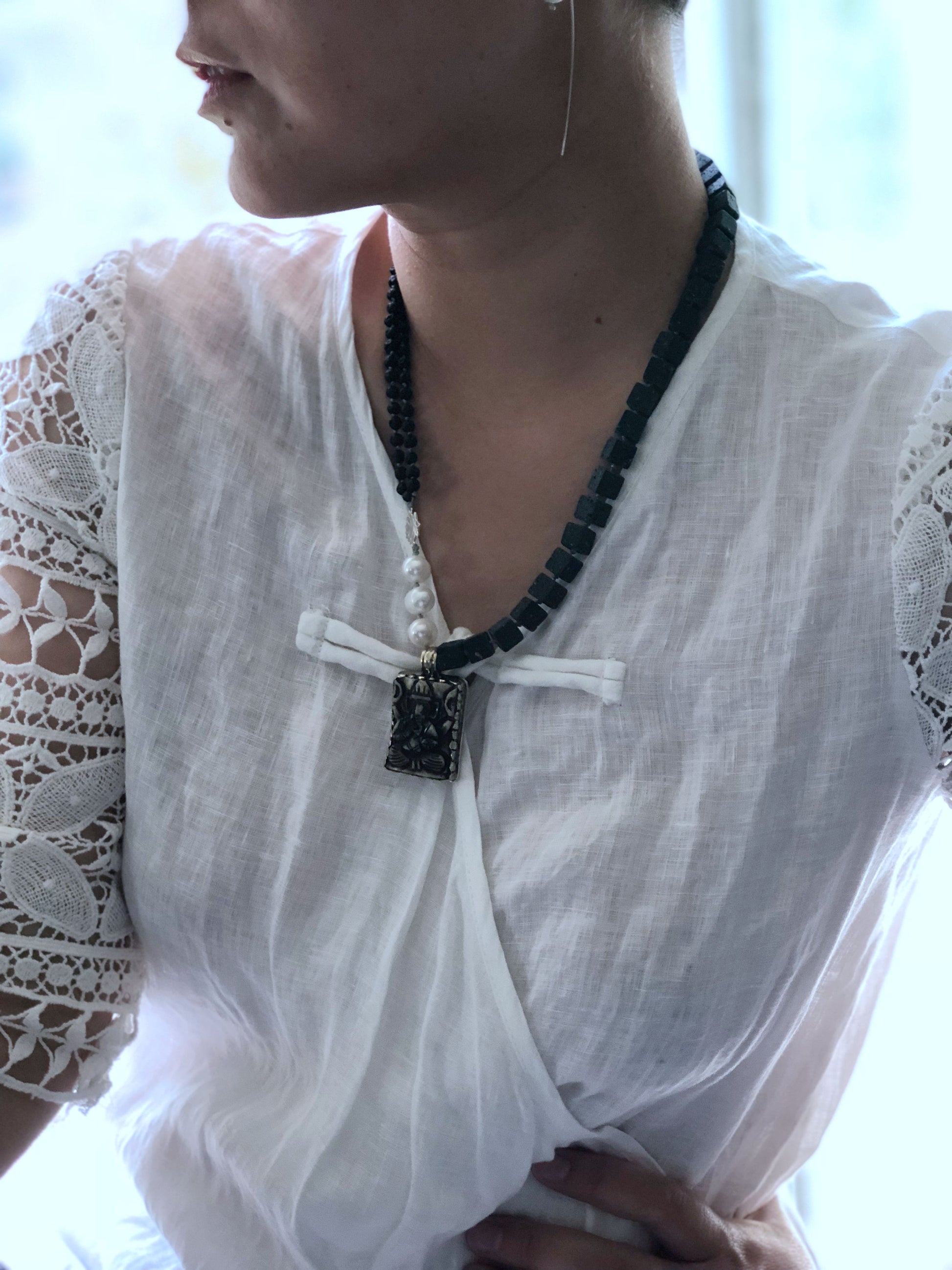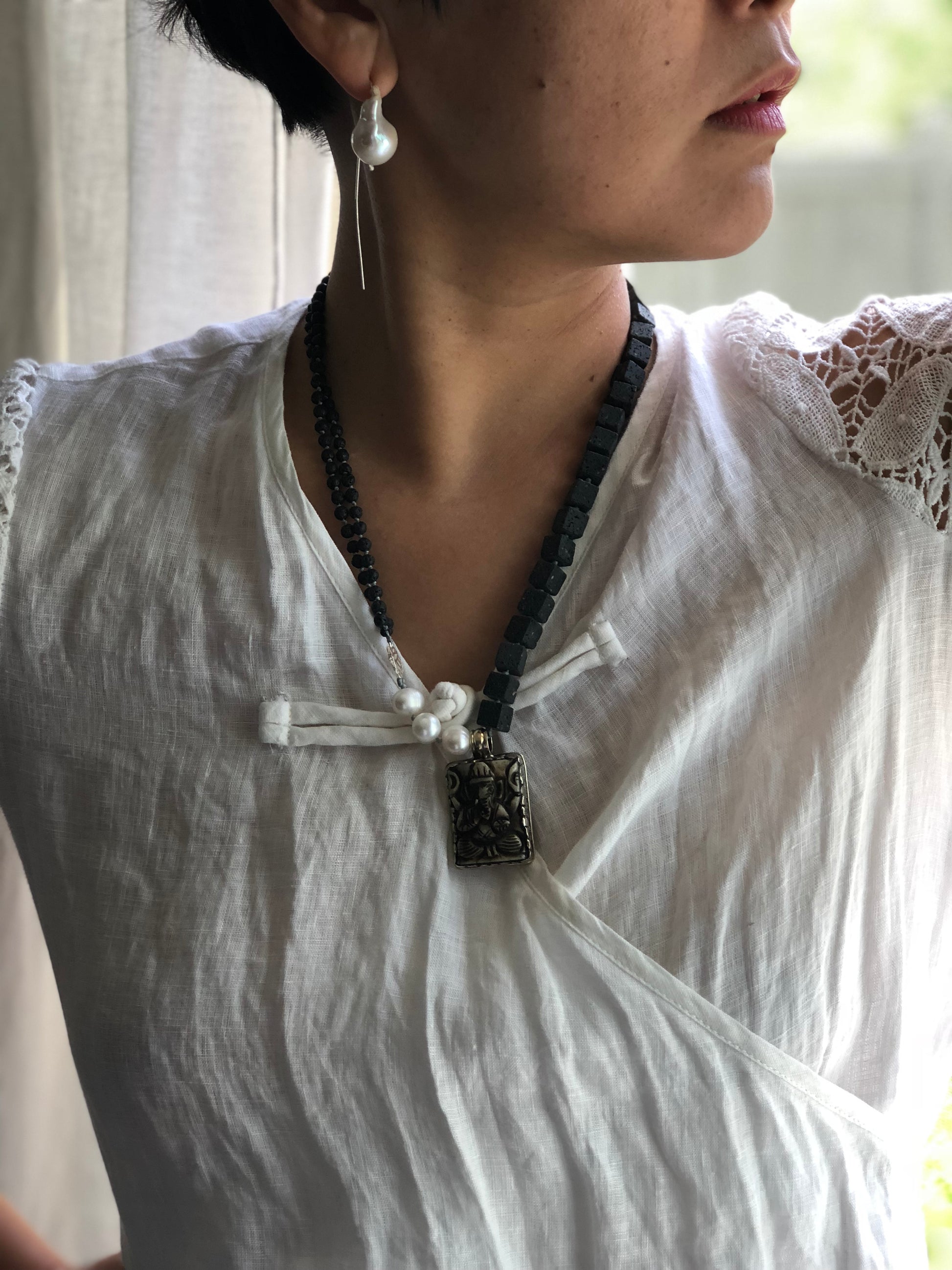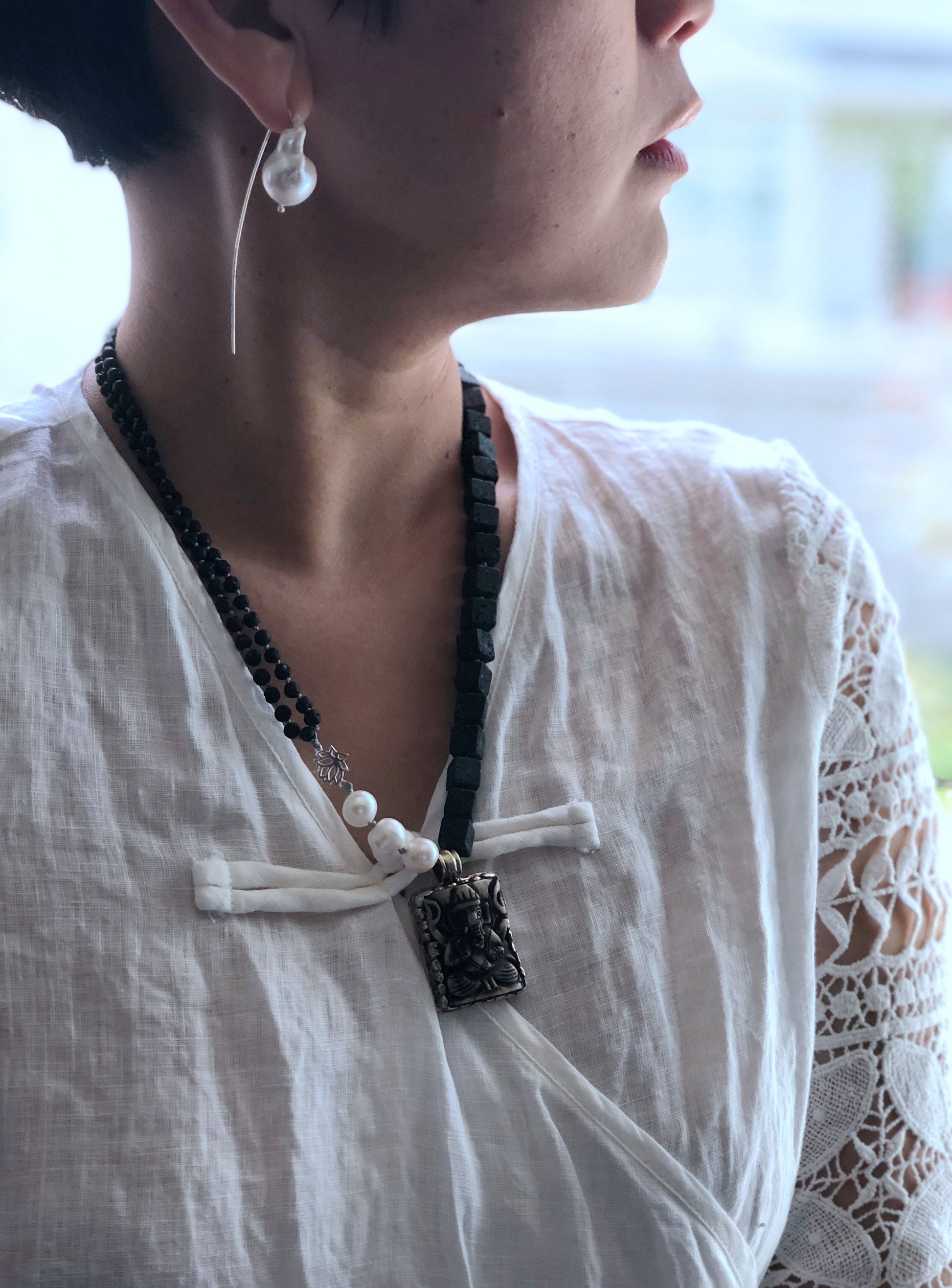 Materials : Lava rock, fresh water pearl, garnesh pendent from Nepal