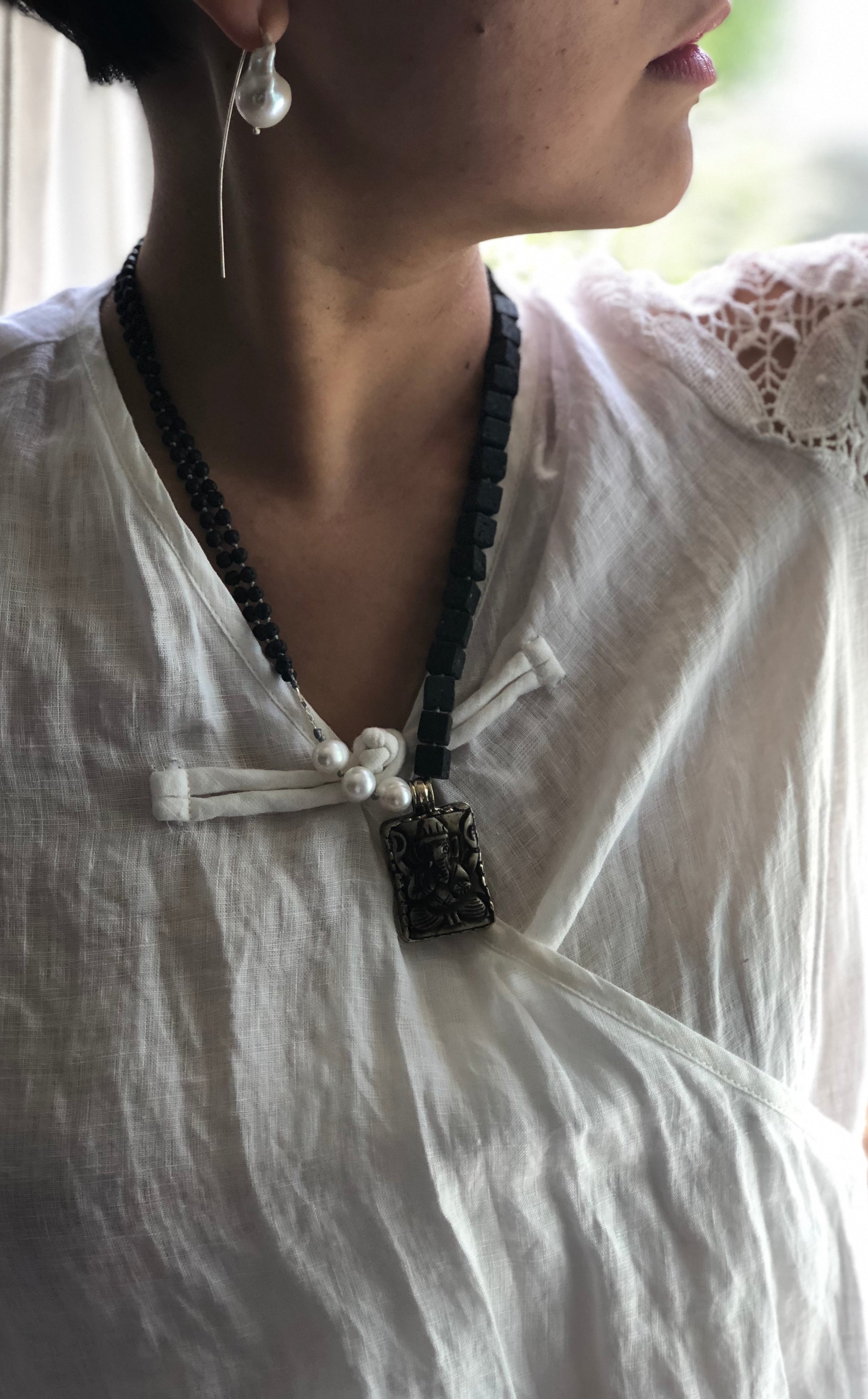 Garnesh with black and white, classic and simple beauty. Hand knotted between each beads.