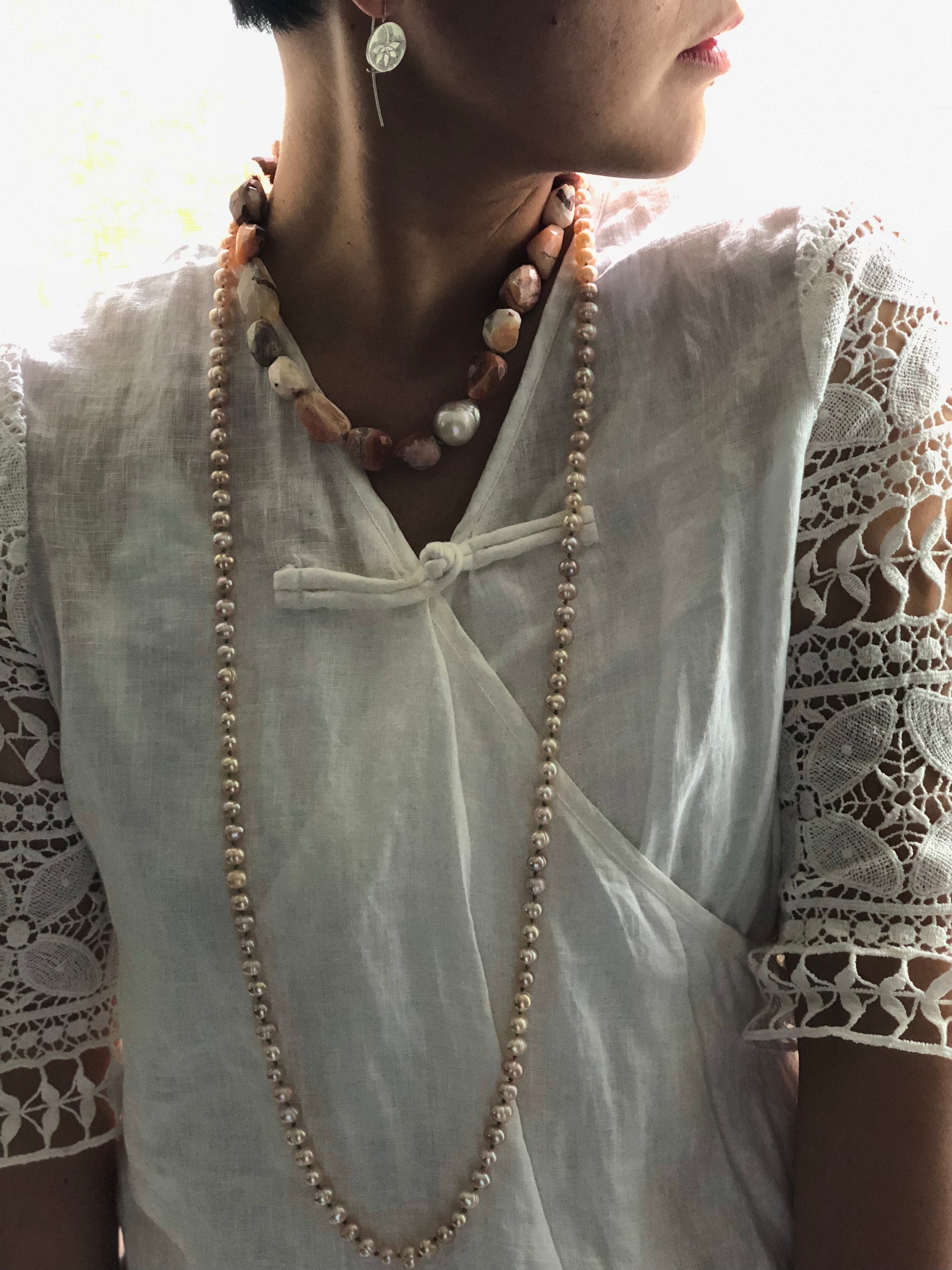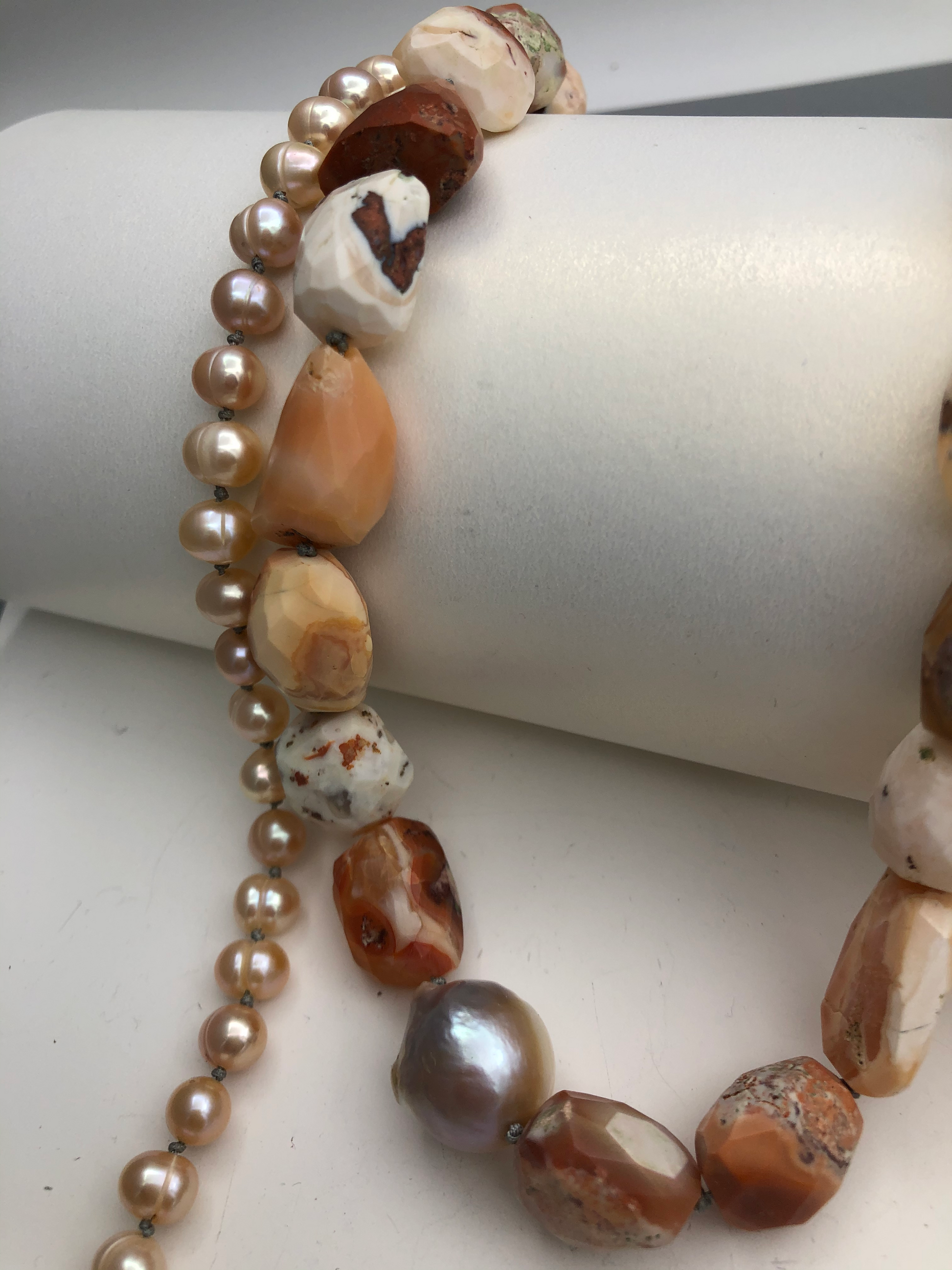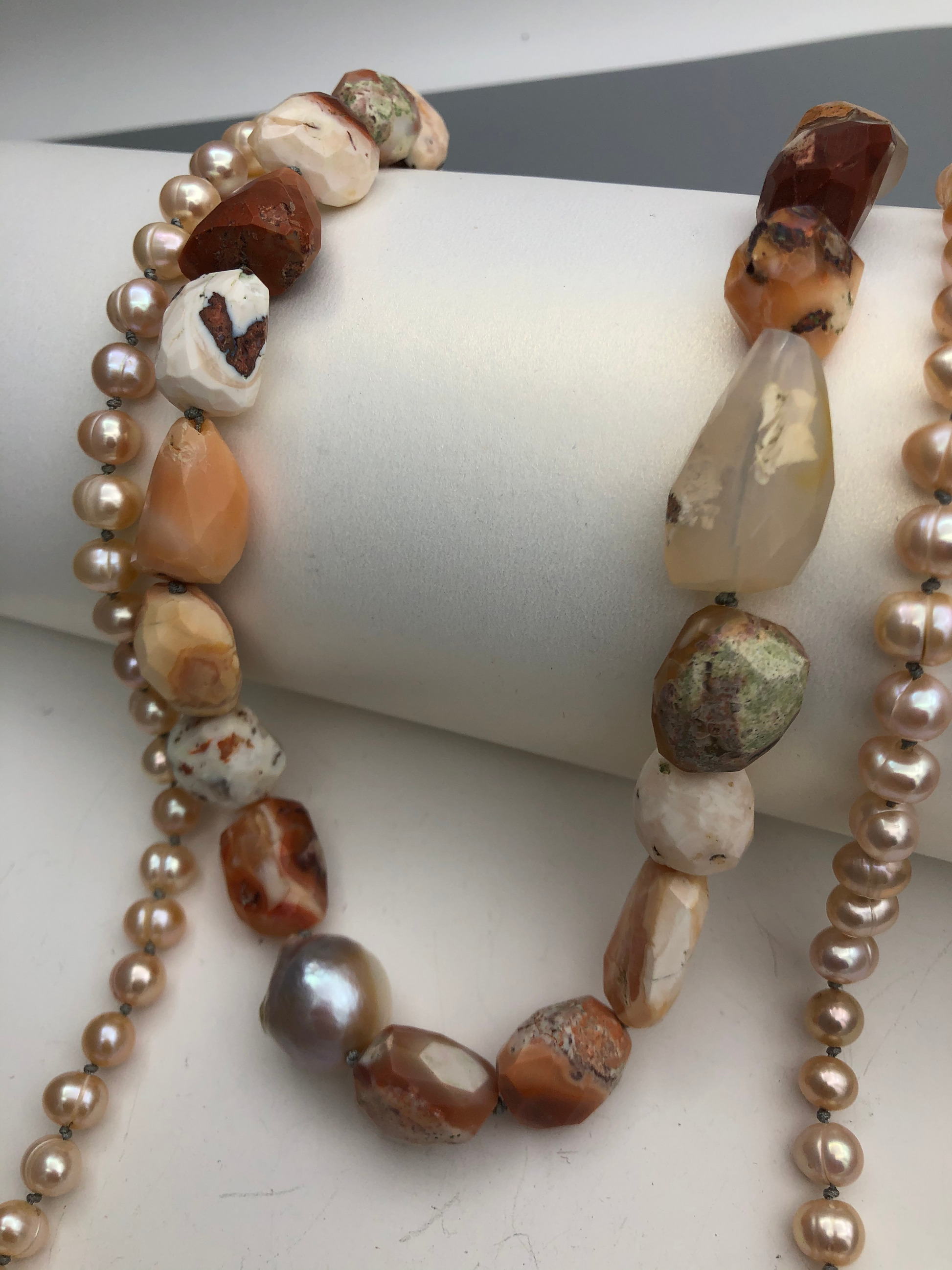 Pink Opal with long strand of fresh water pearl, a delicate and classic piece. Hand knotted between each beads.
