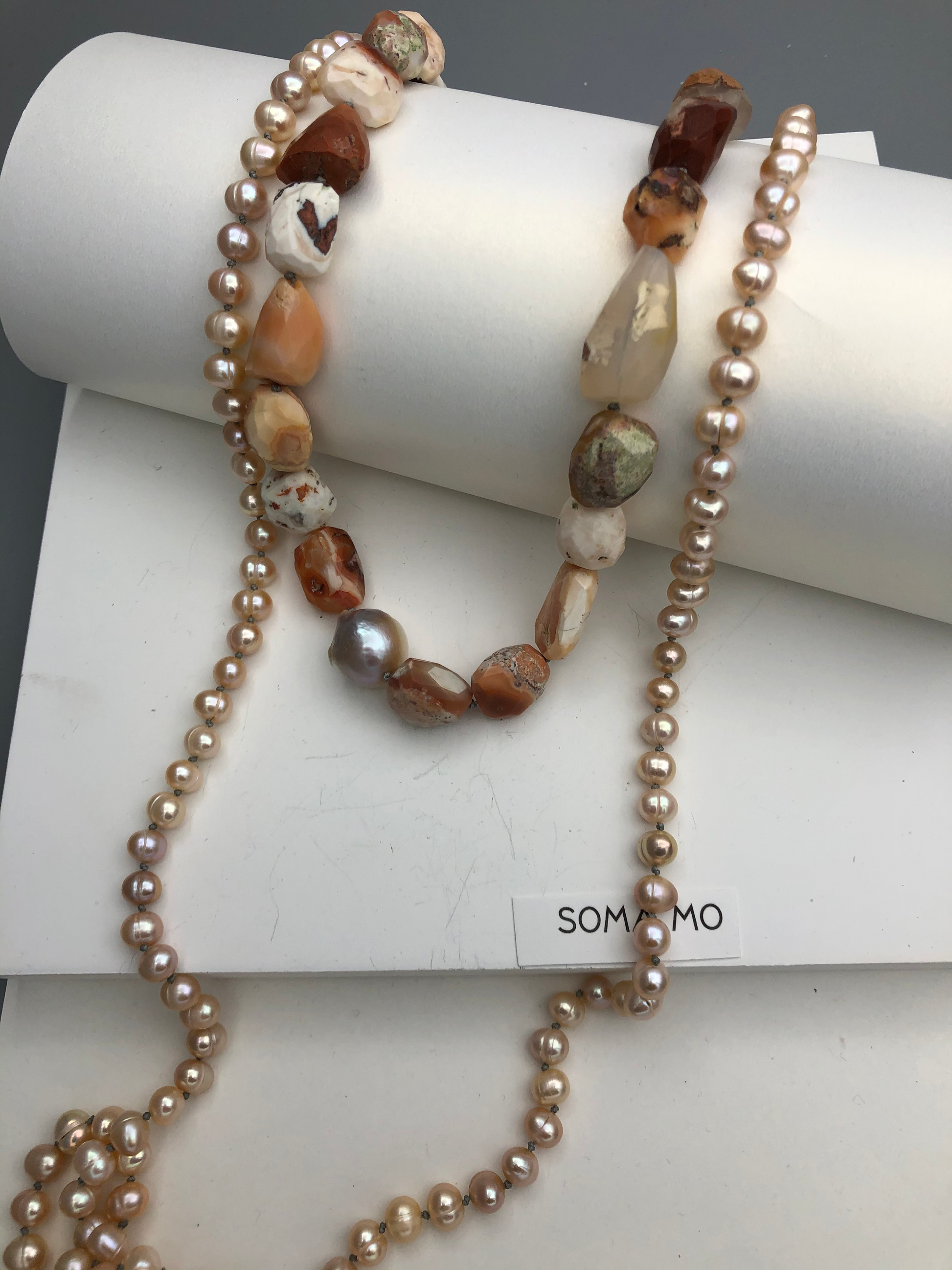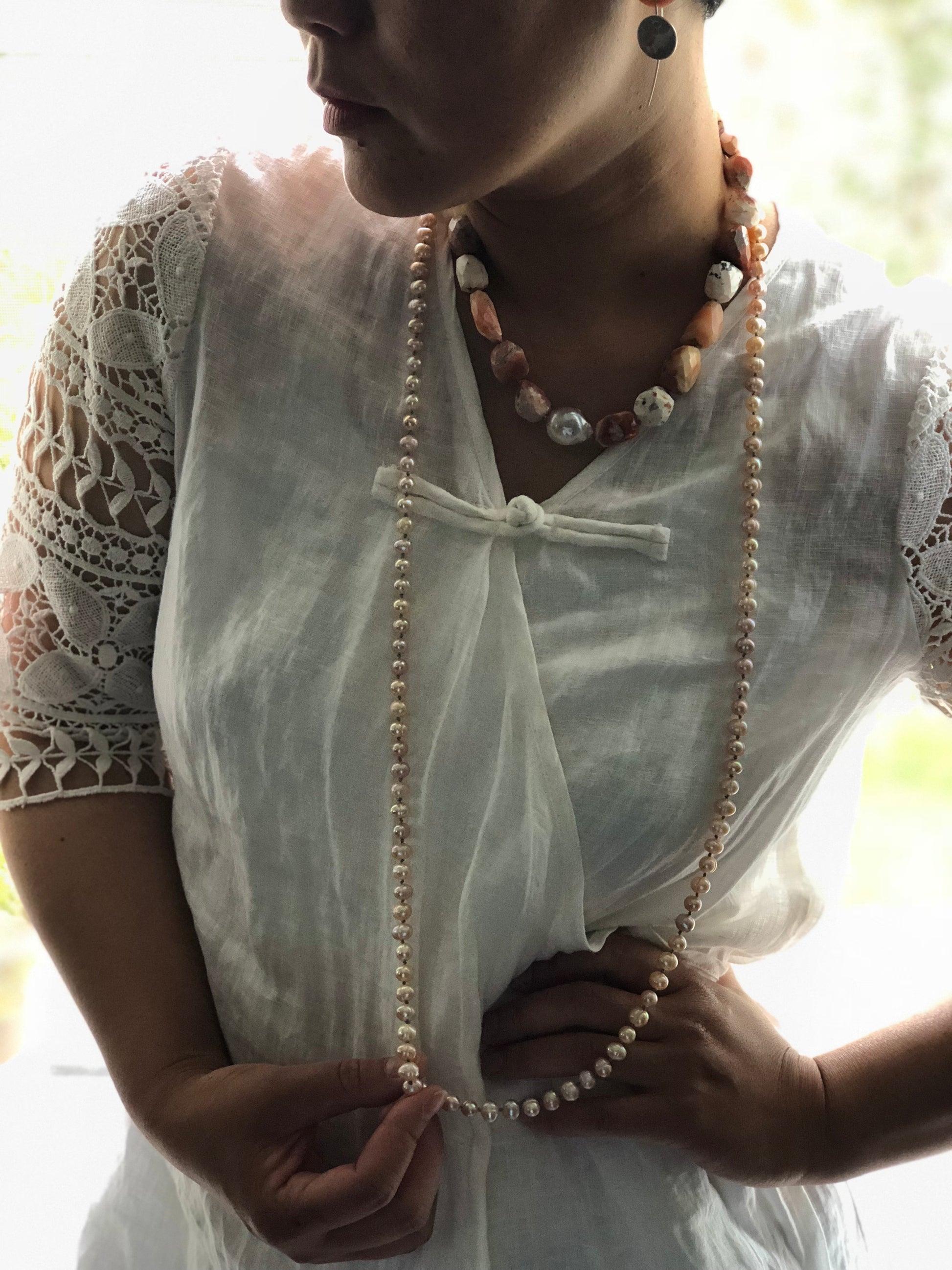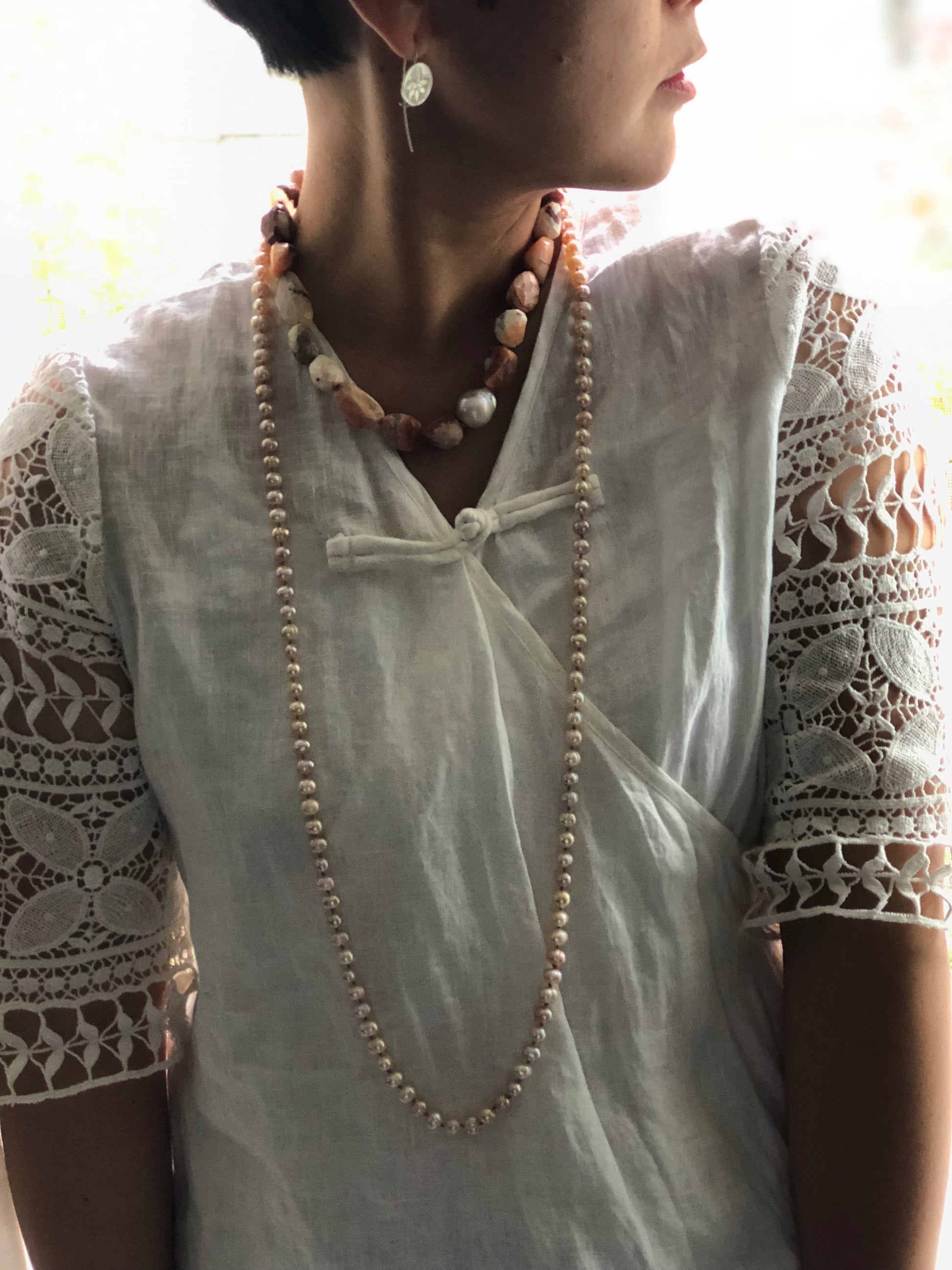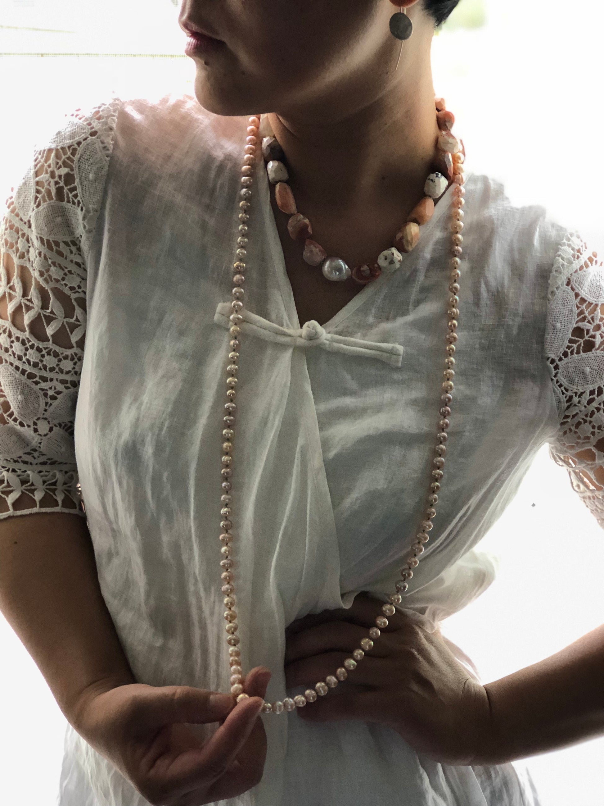 Pink Opal with long strand of fresh water pearl, a delicate and classic piece. Hand knotted between each beads.
