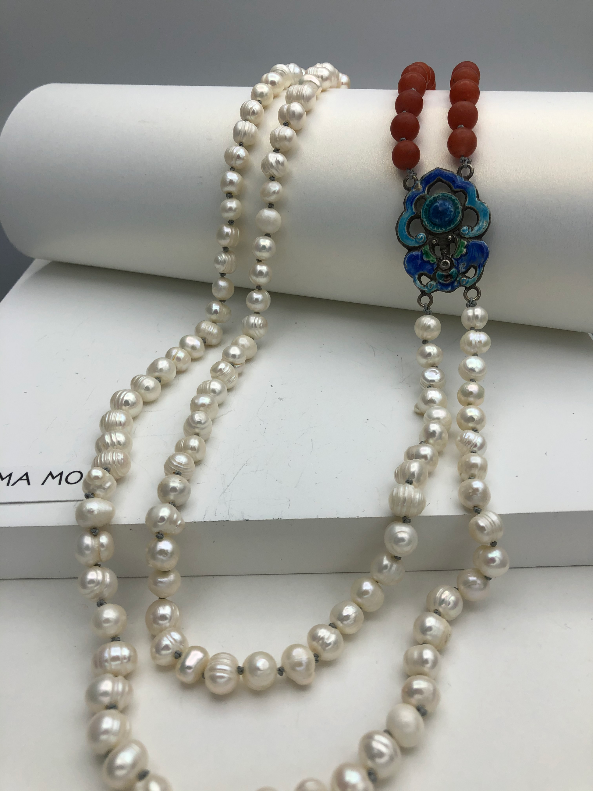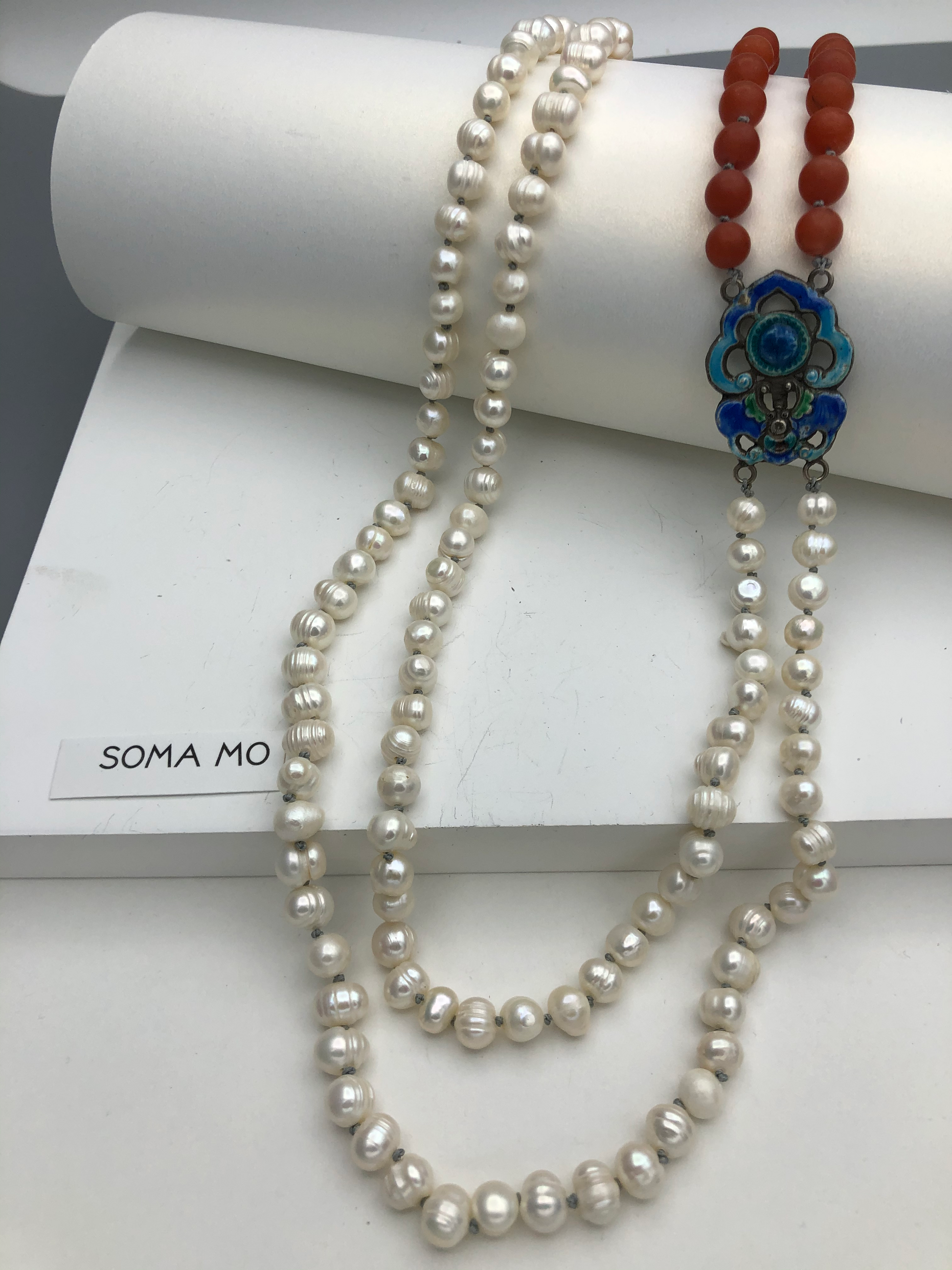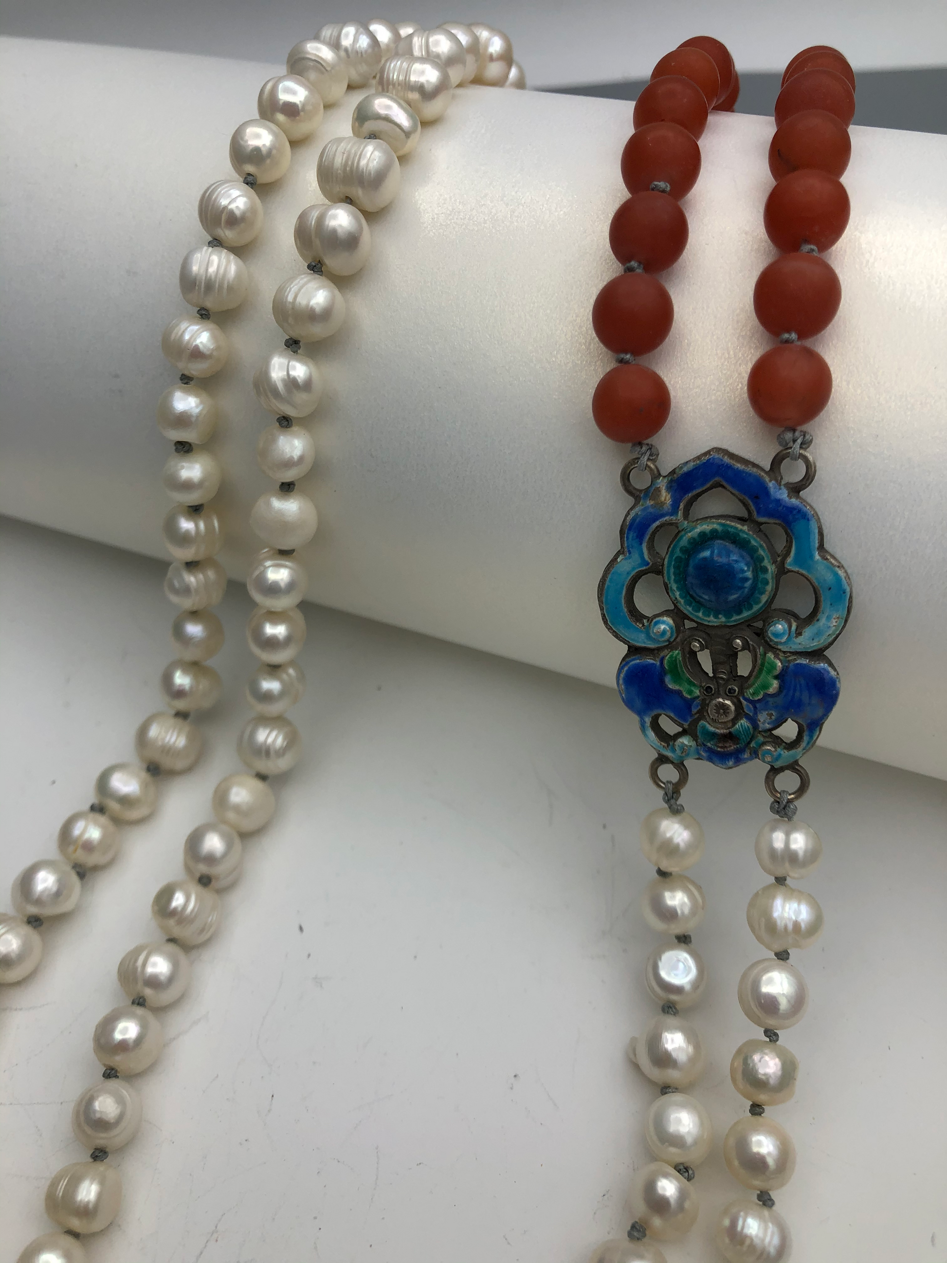 The blue enamel pendent was an vintage piece I got , made of fine silver with enamel, very bright blue color. match with red agate and white pearls, classic piece. Hand knotted between each beads.
