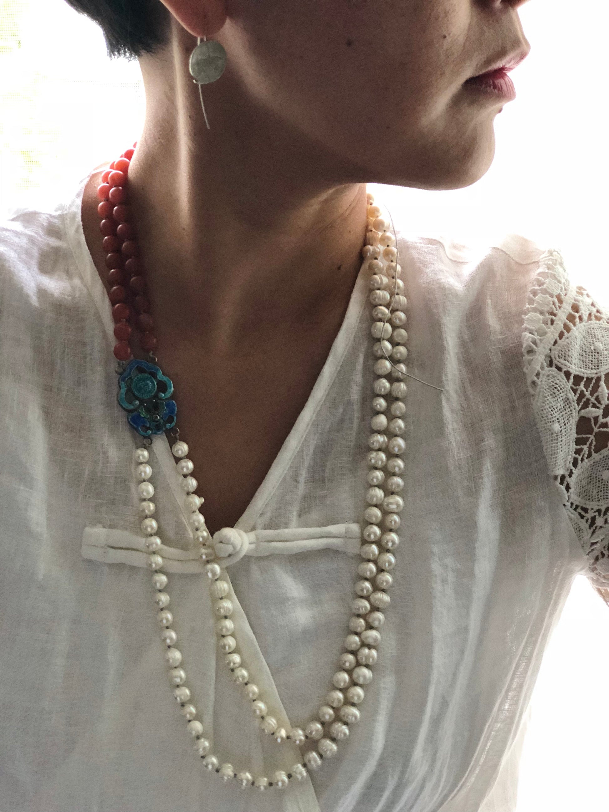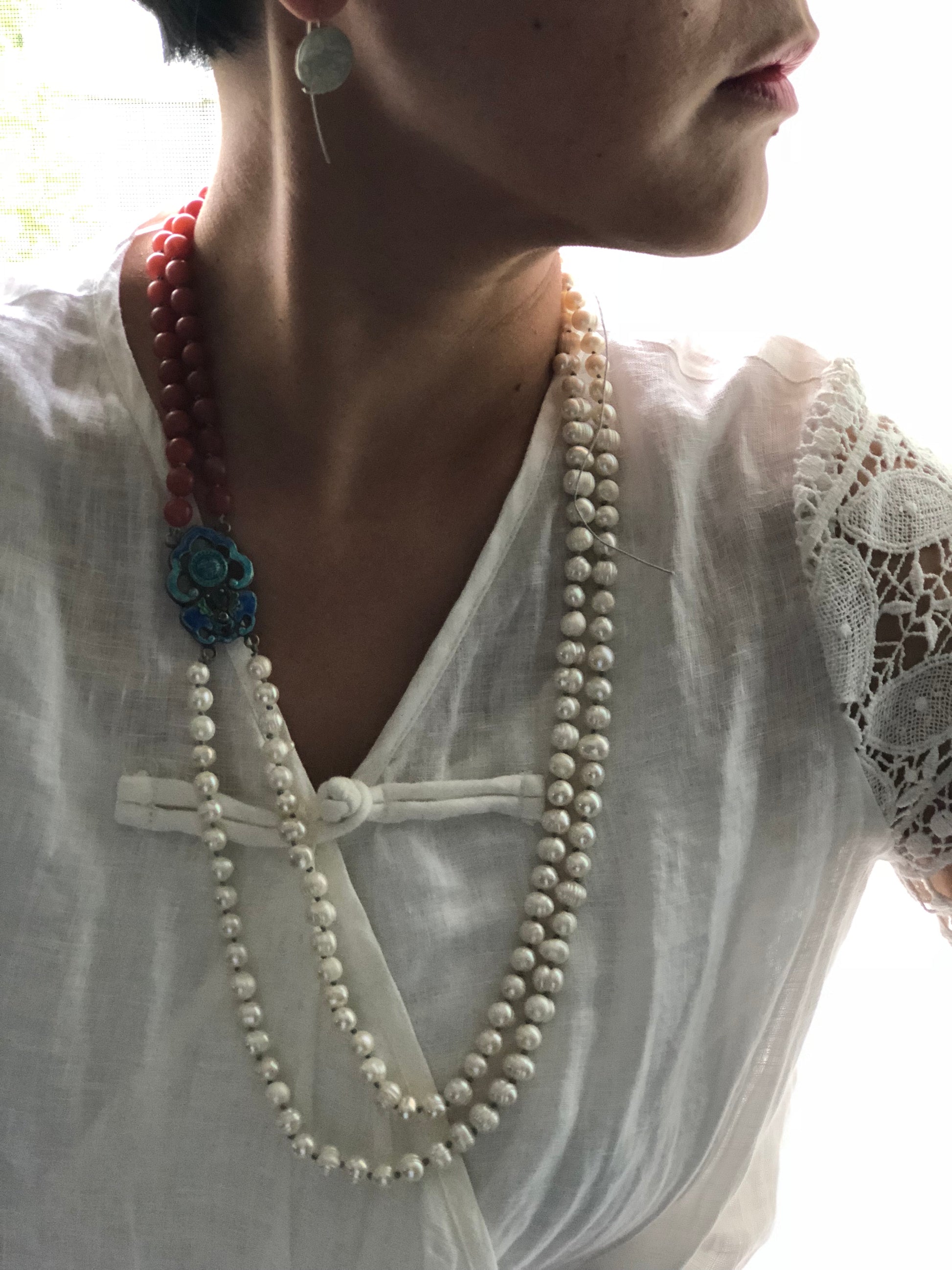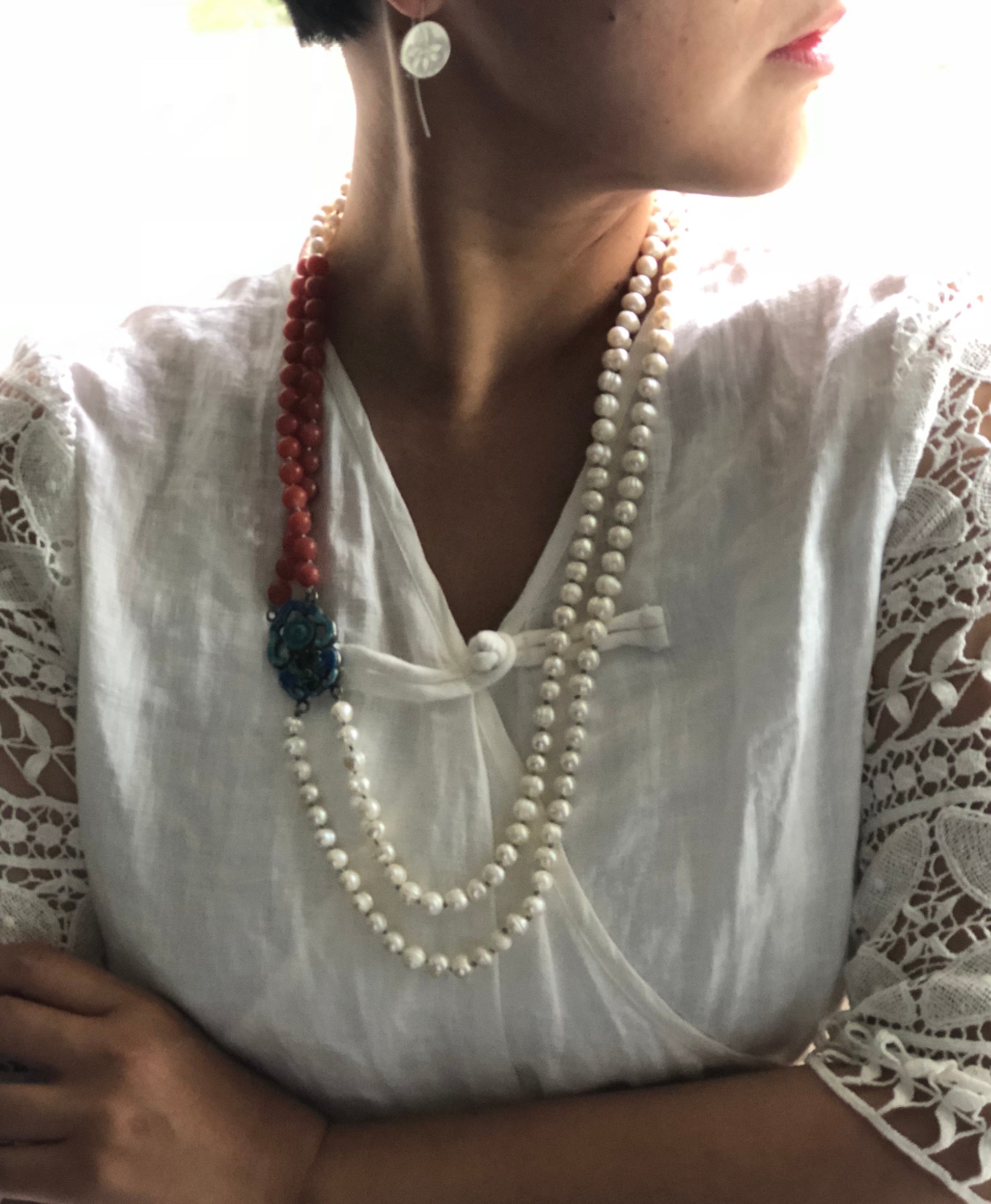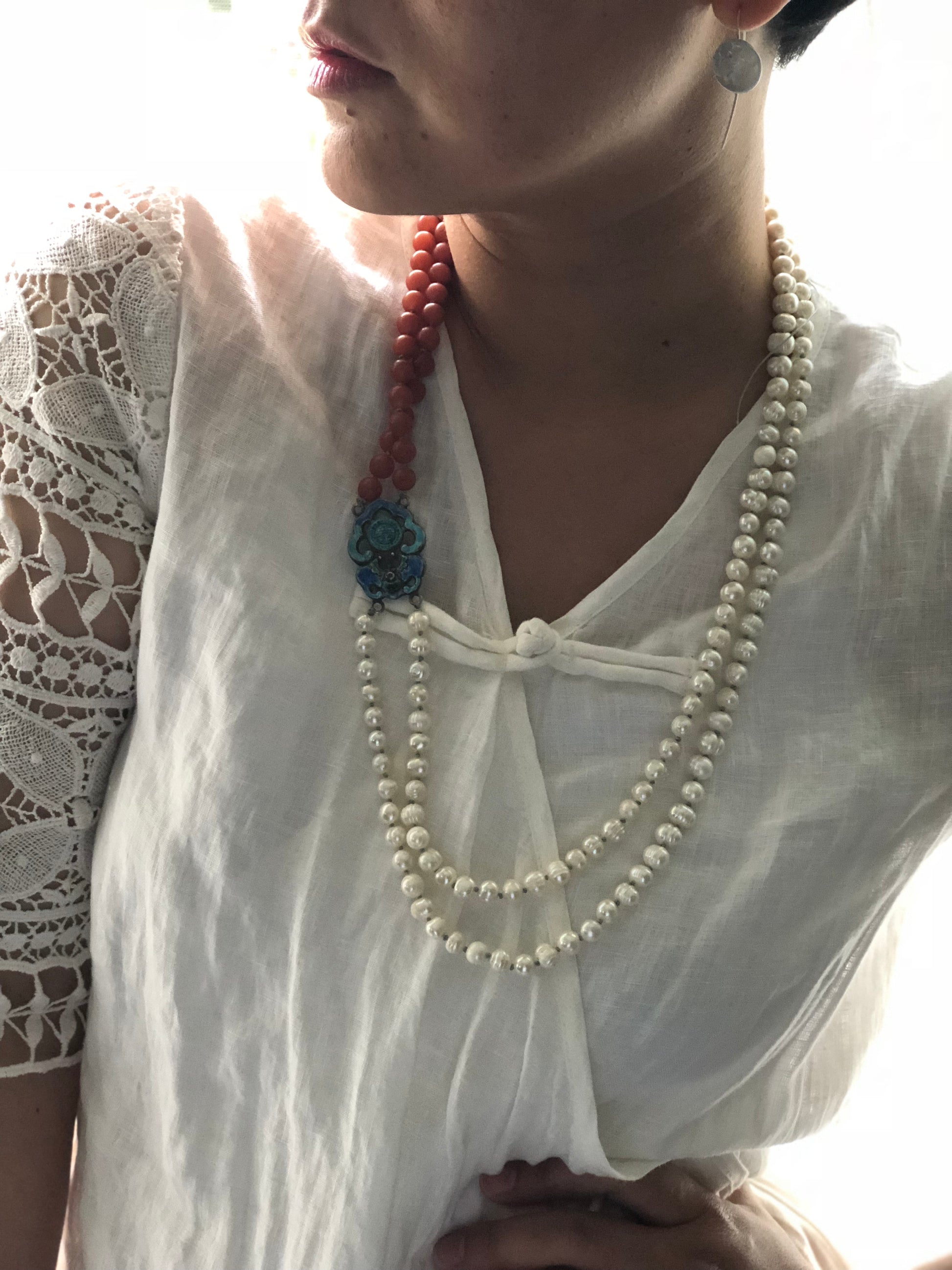The blue enamel pendent was an vintage piece I got , made of fine silver with enamel, very bright blue color. match with red agate and white pearls, classic piece. Hand knotted between each beads.