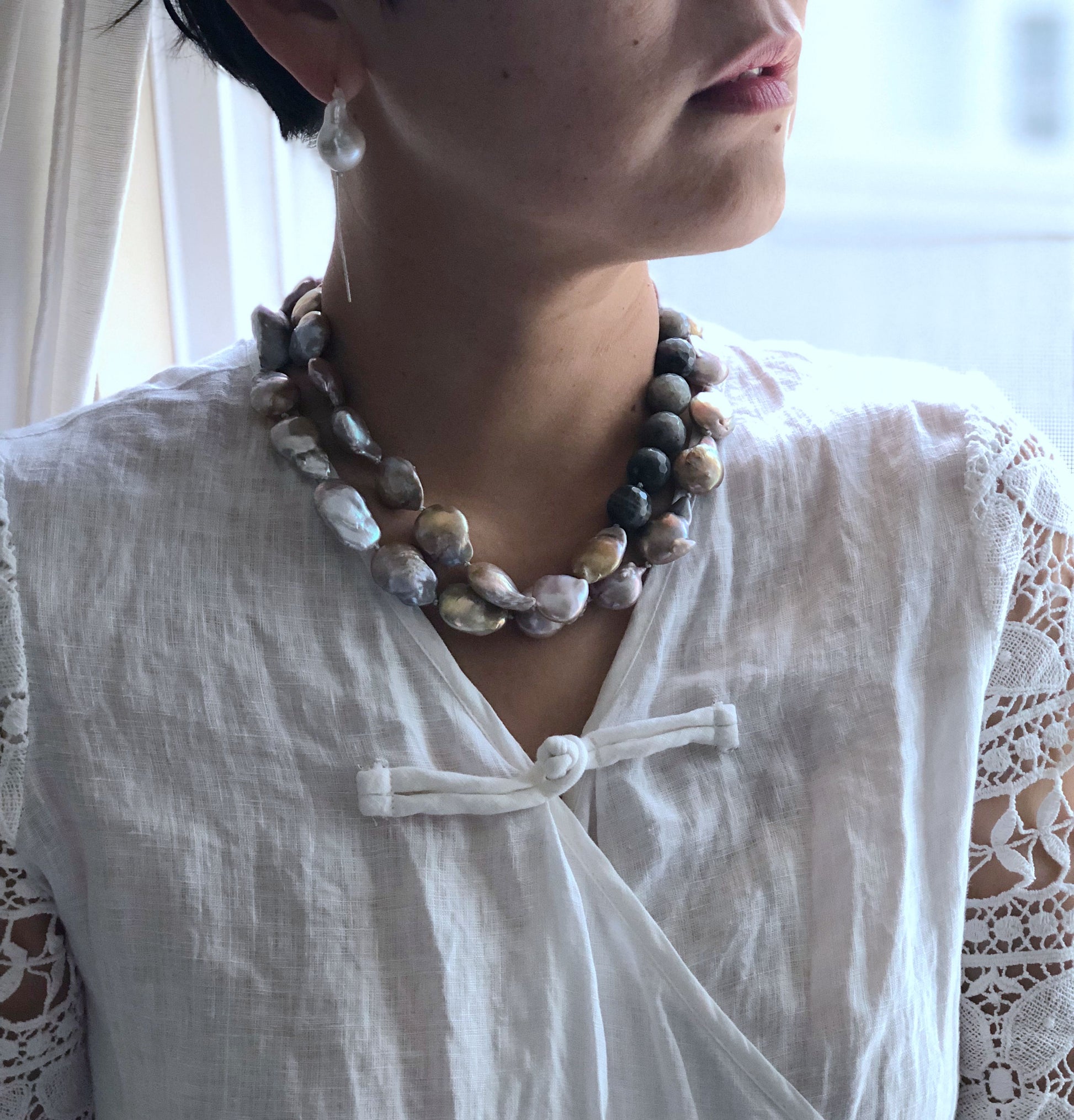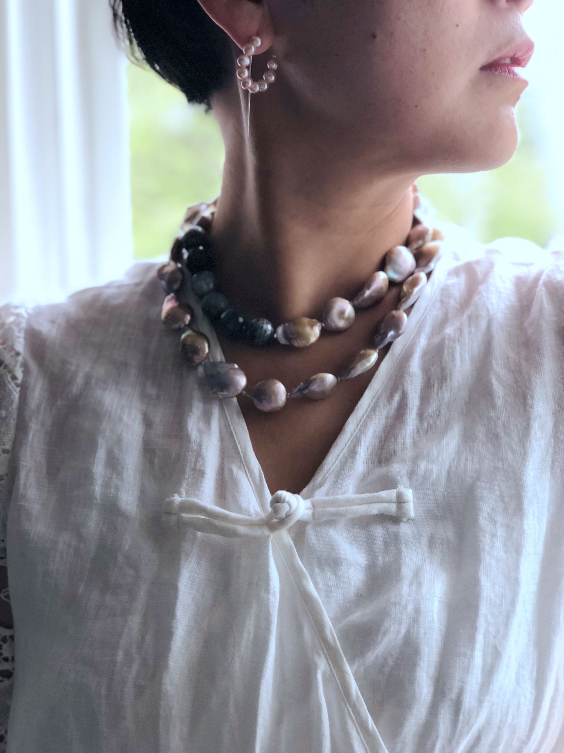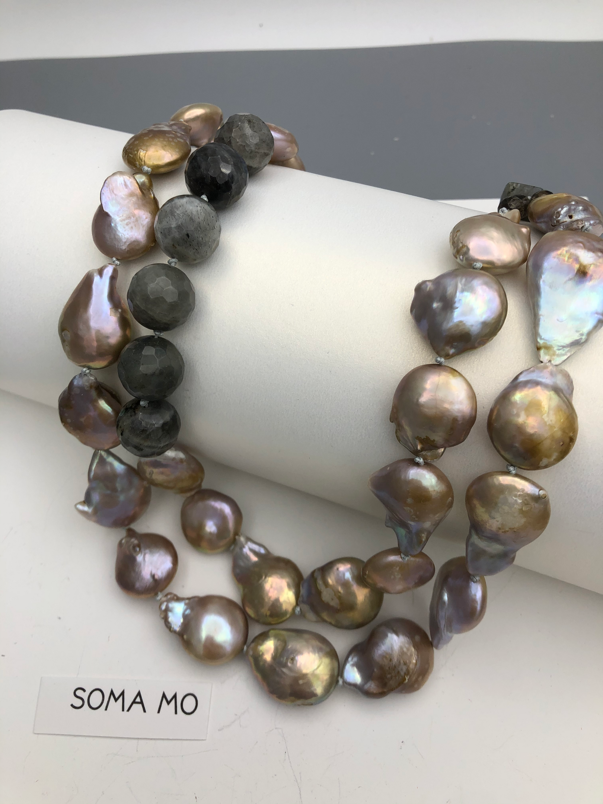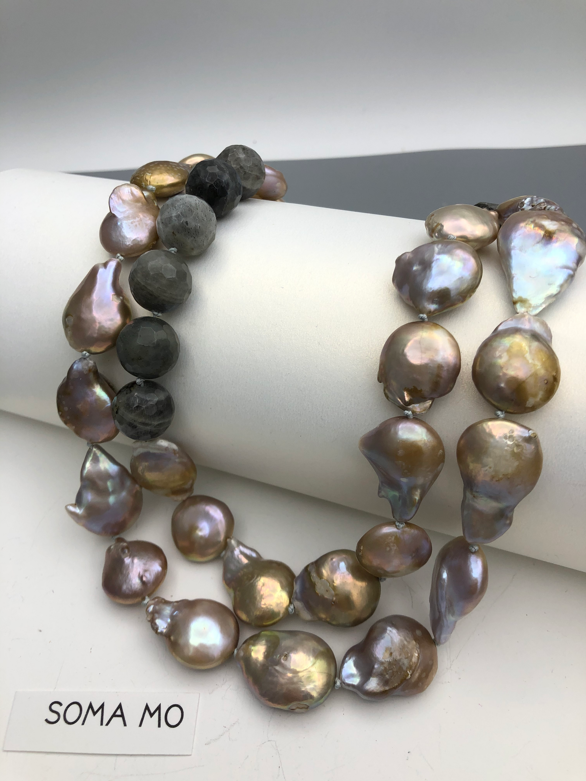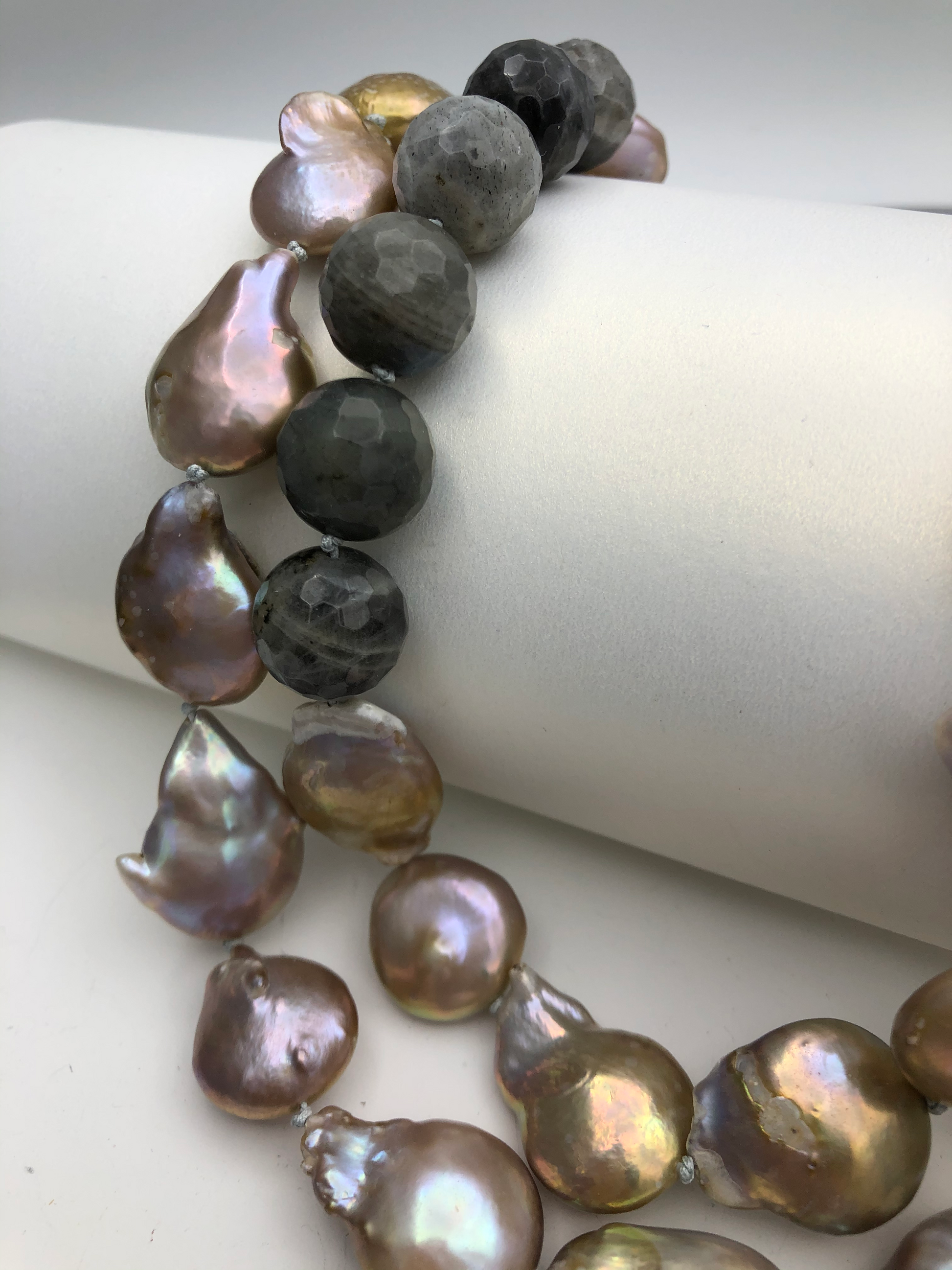 Two strands of golden baroque pearls, with some labrodrite stone, a statement piece with rich luster. Hand knotted between each beads, can be resized for special request.
