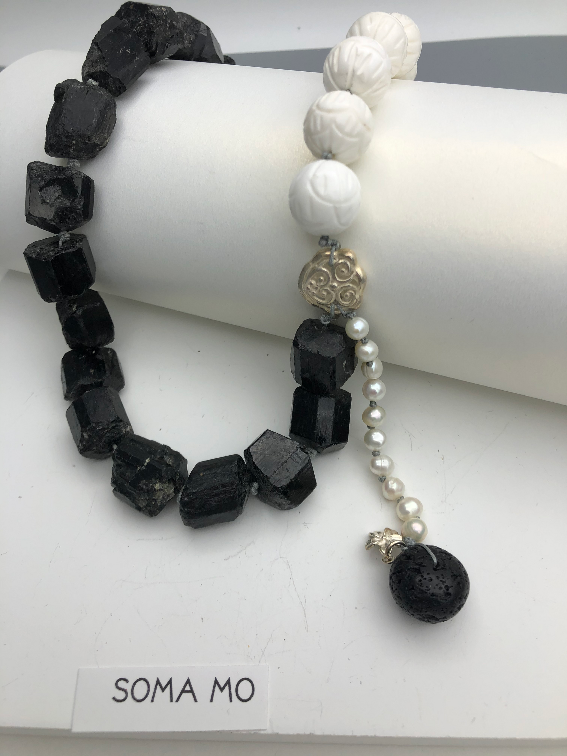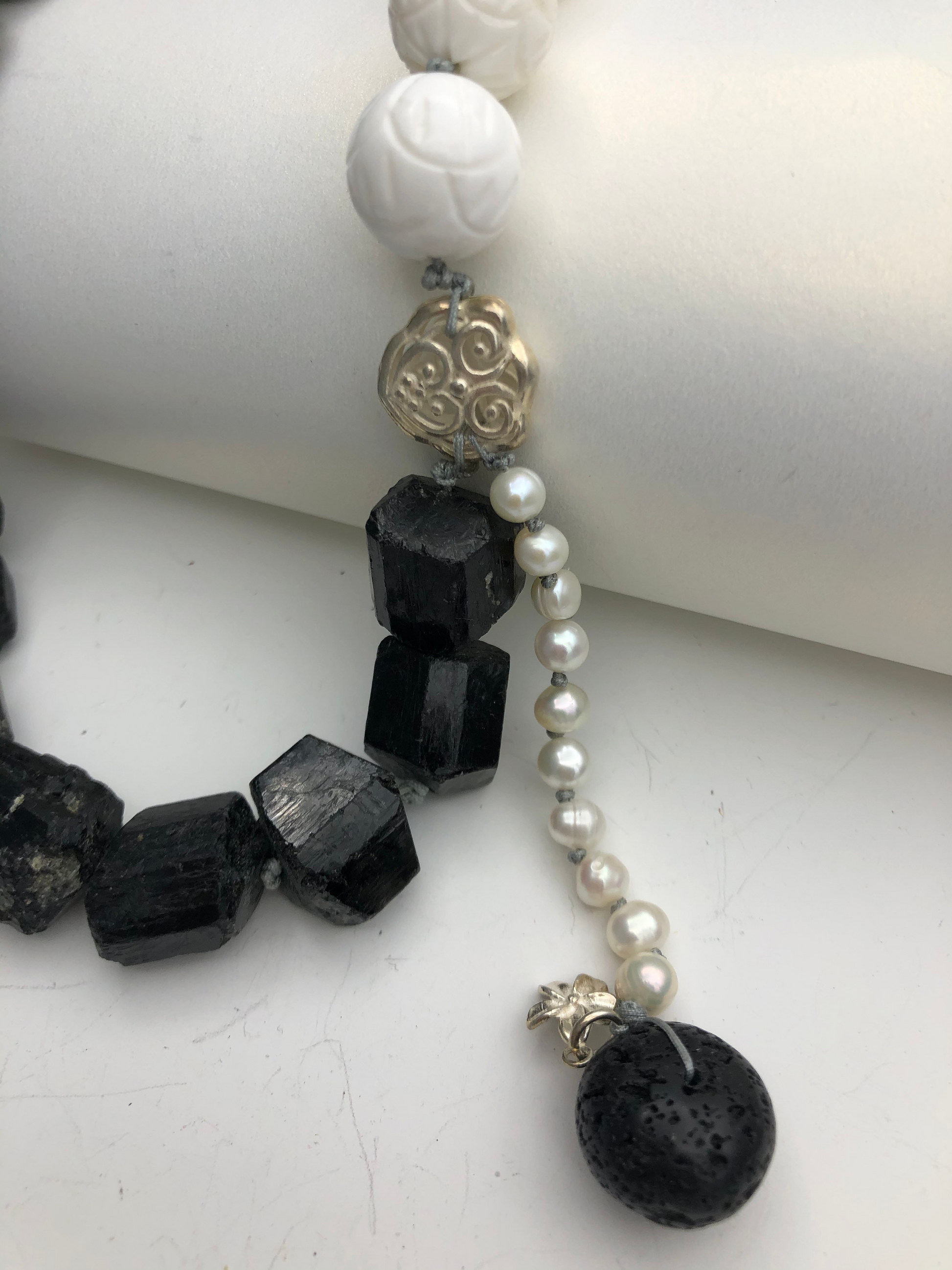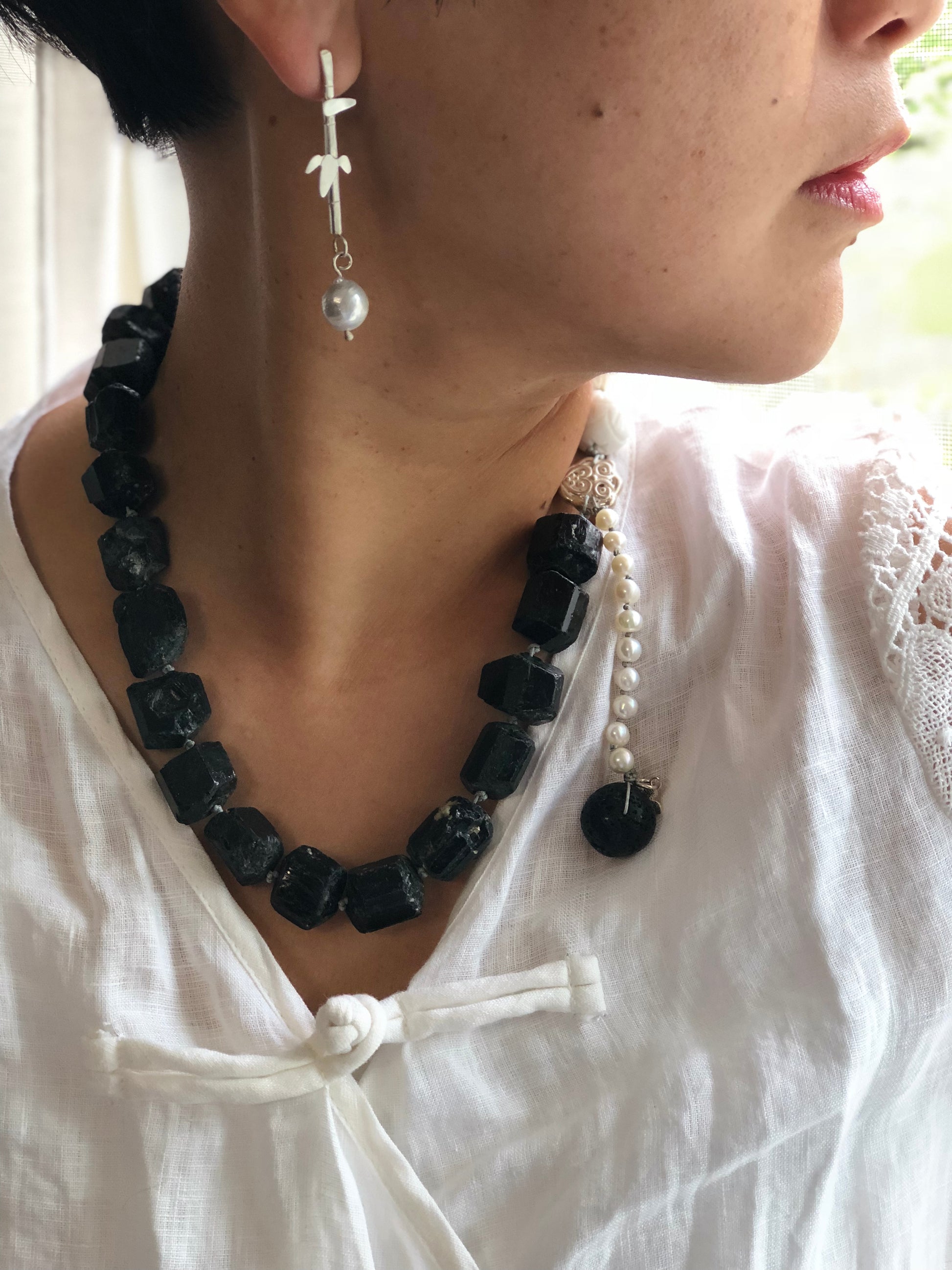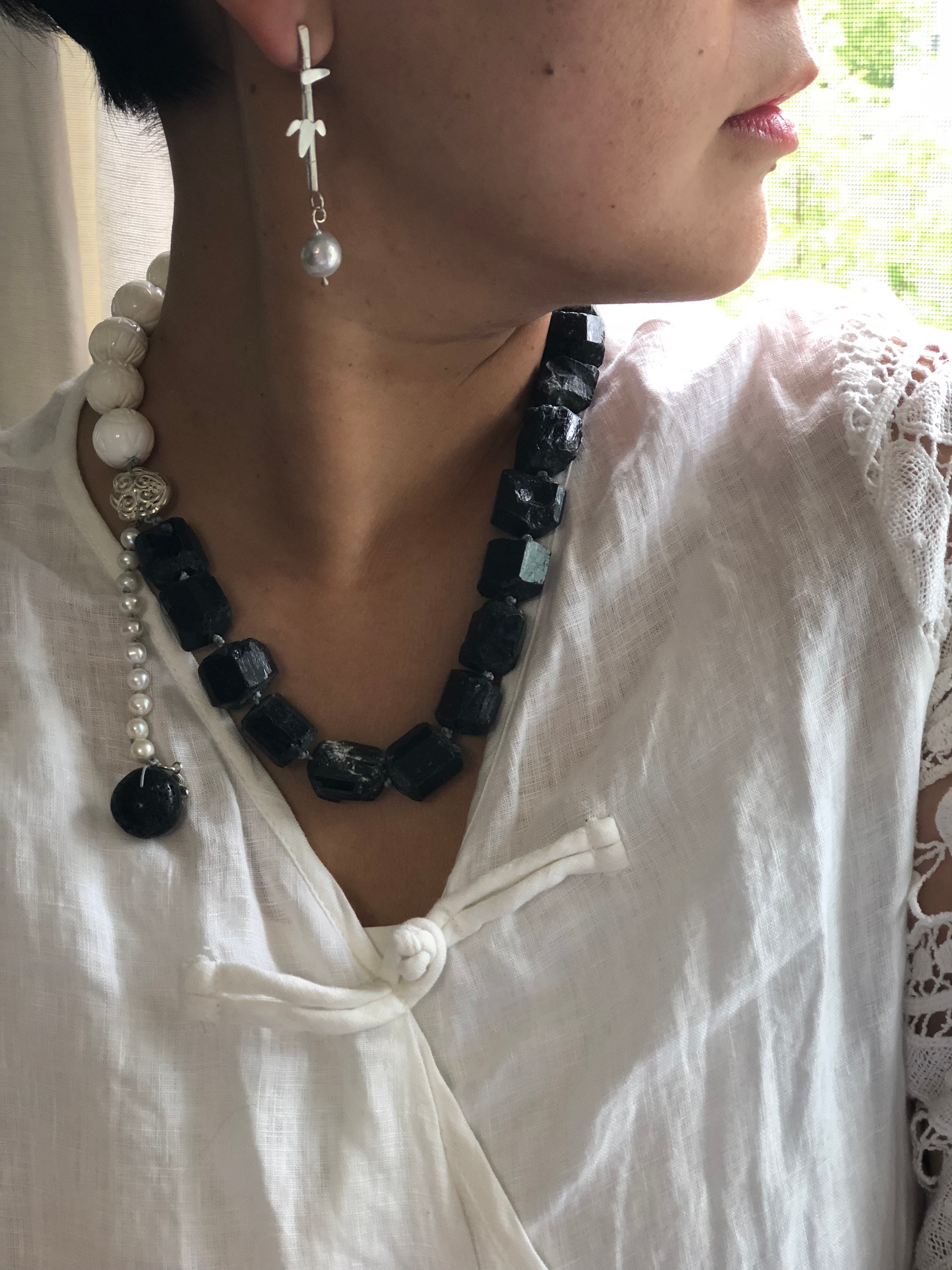 Materials : Black tourmaline, fresh water pearls, white shell, silver