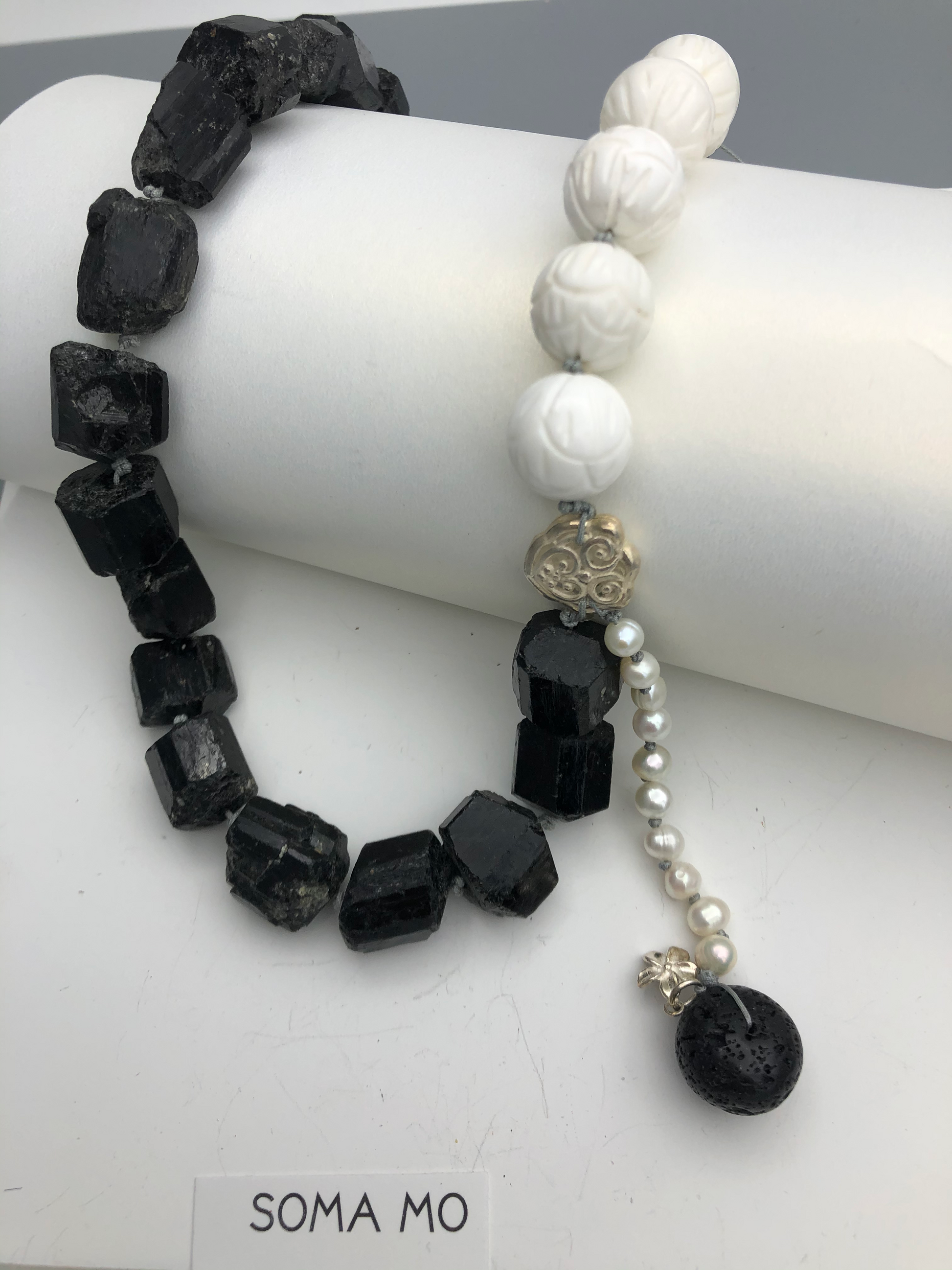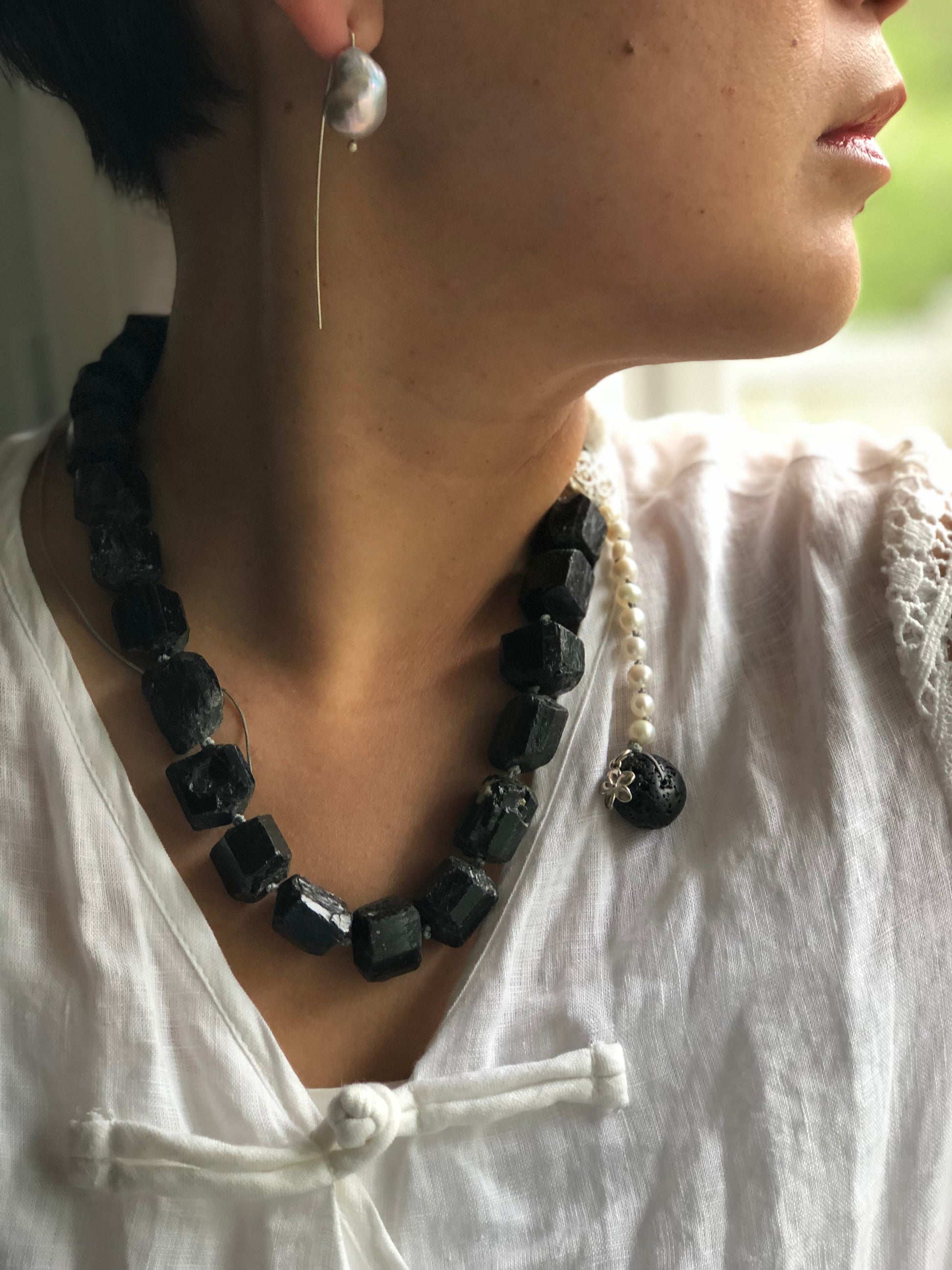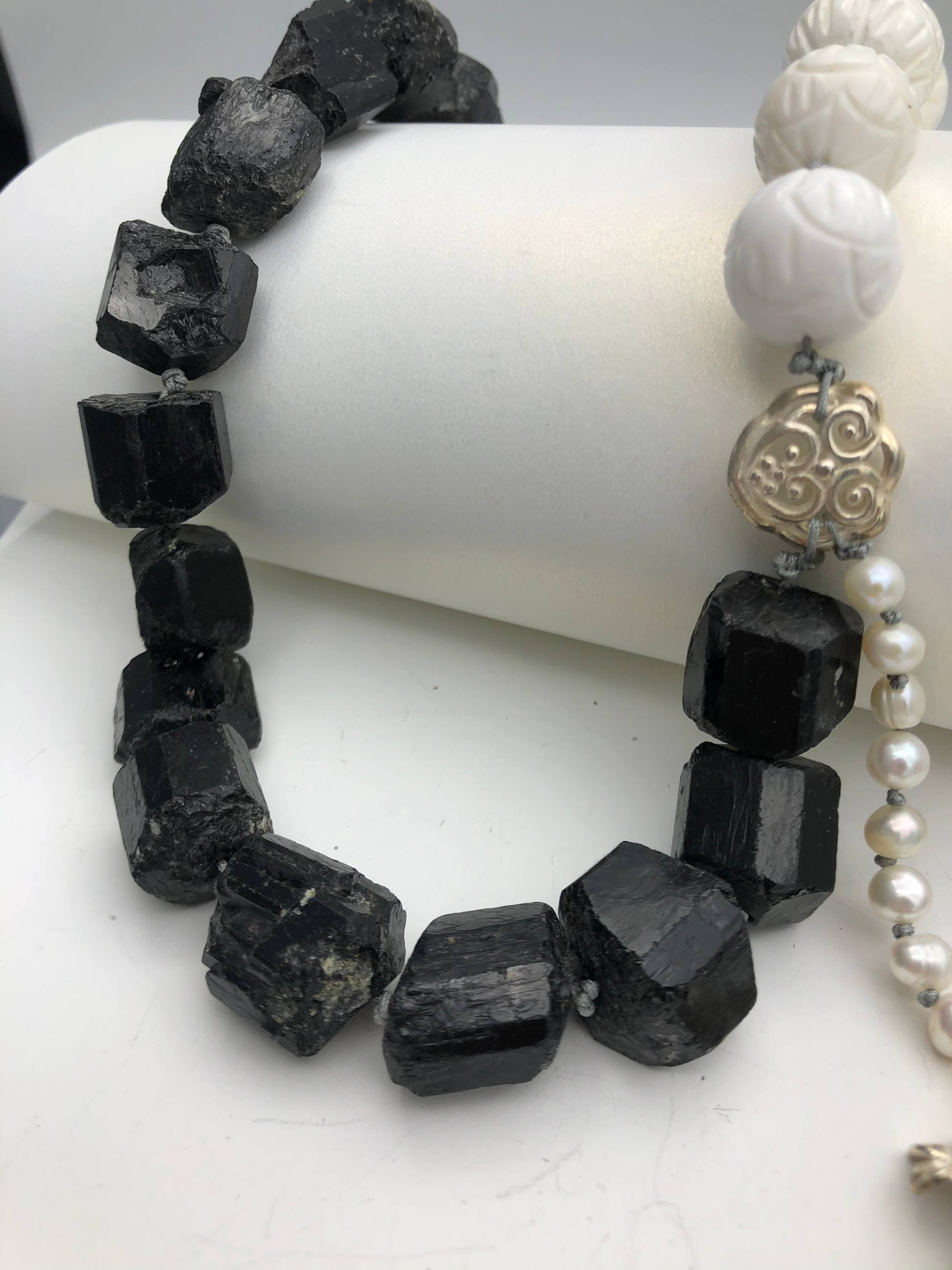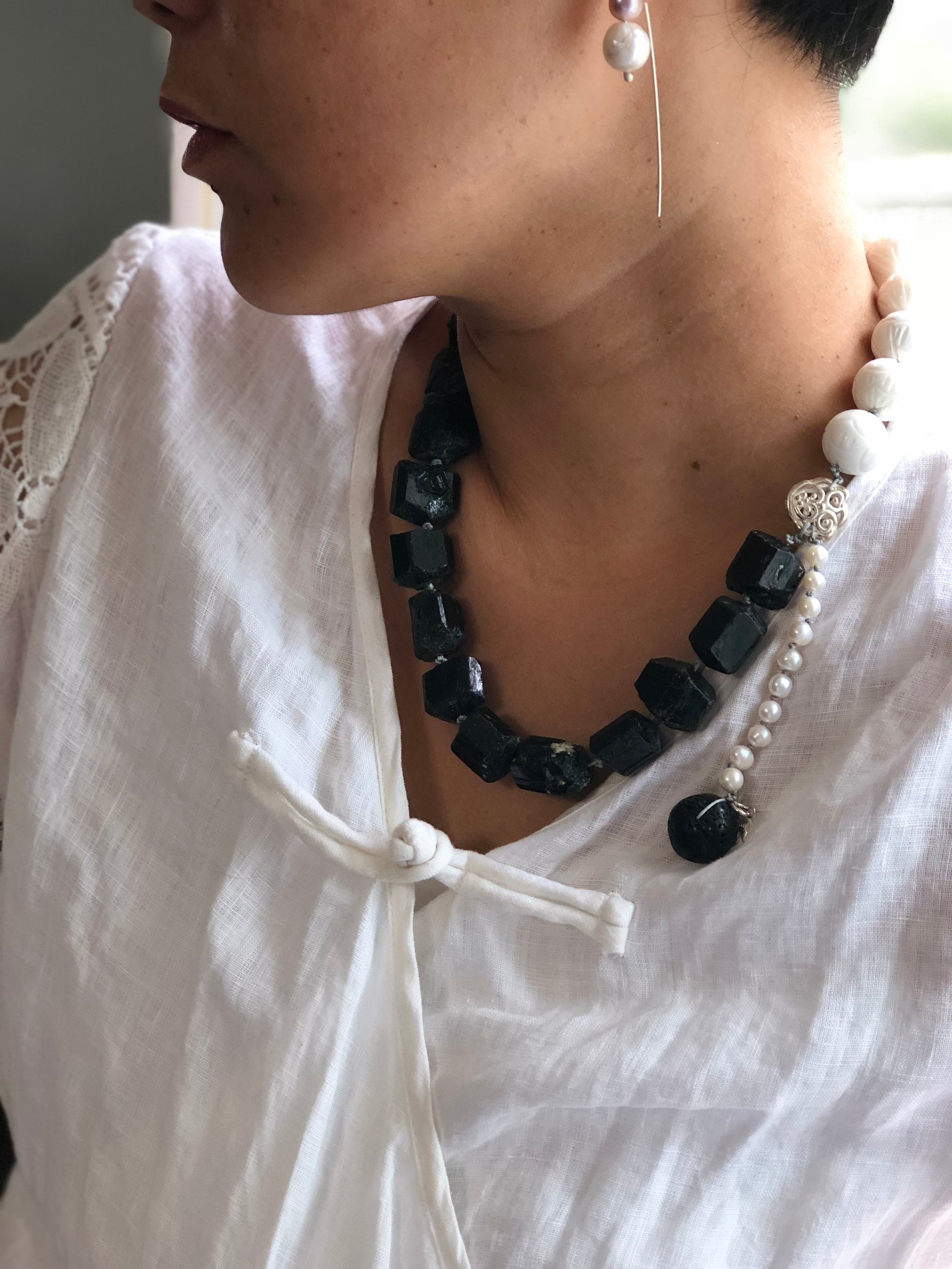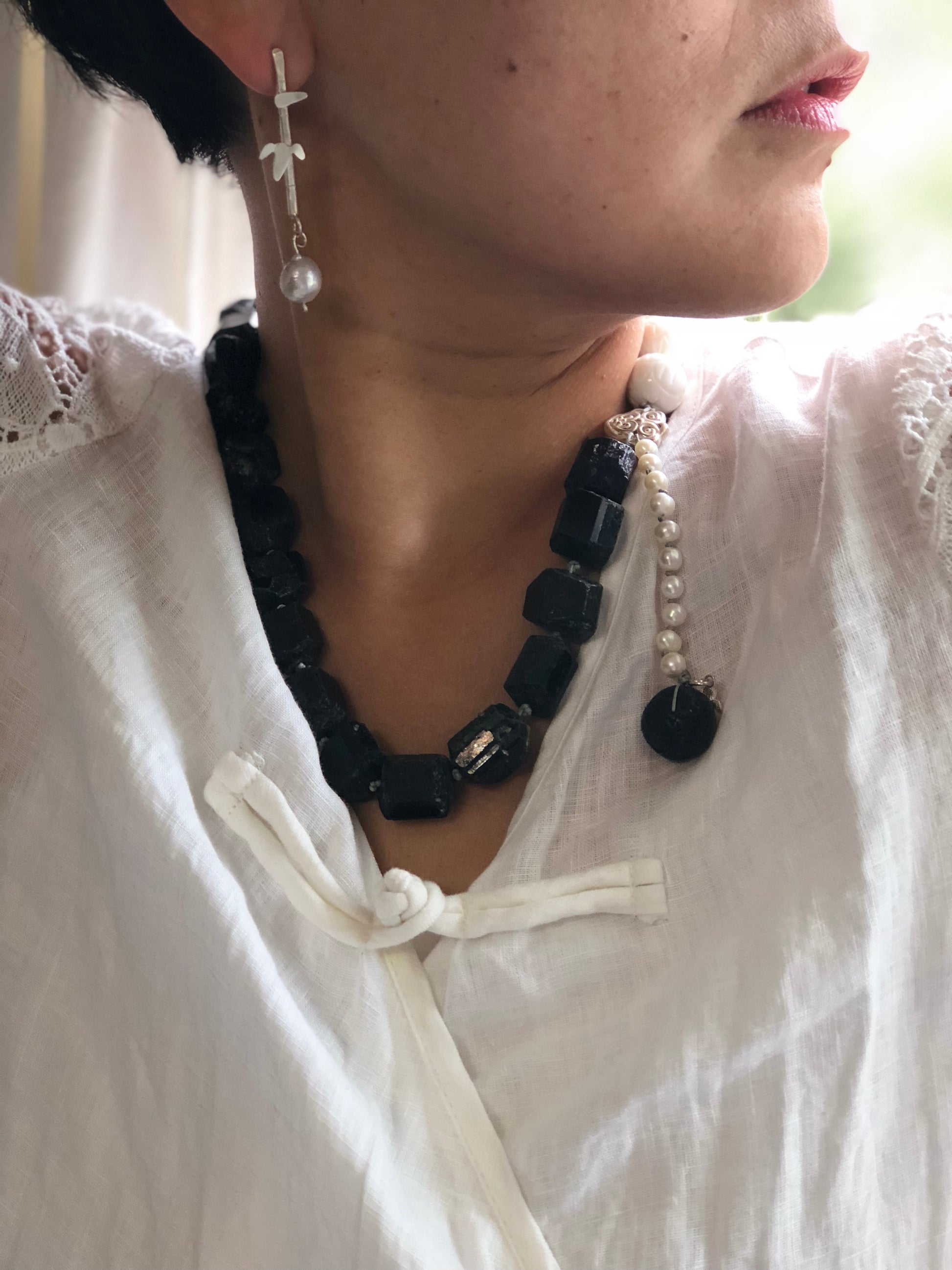 Materials : Black tourmaline, fresh water pearls, white shell, silver