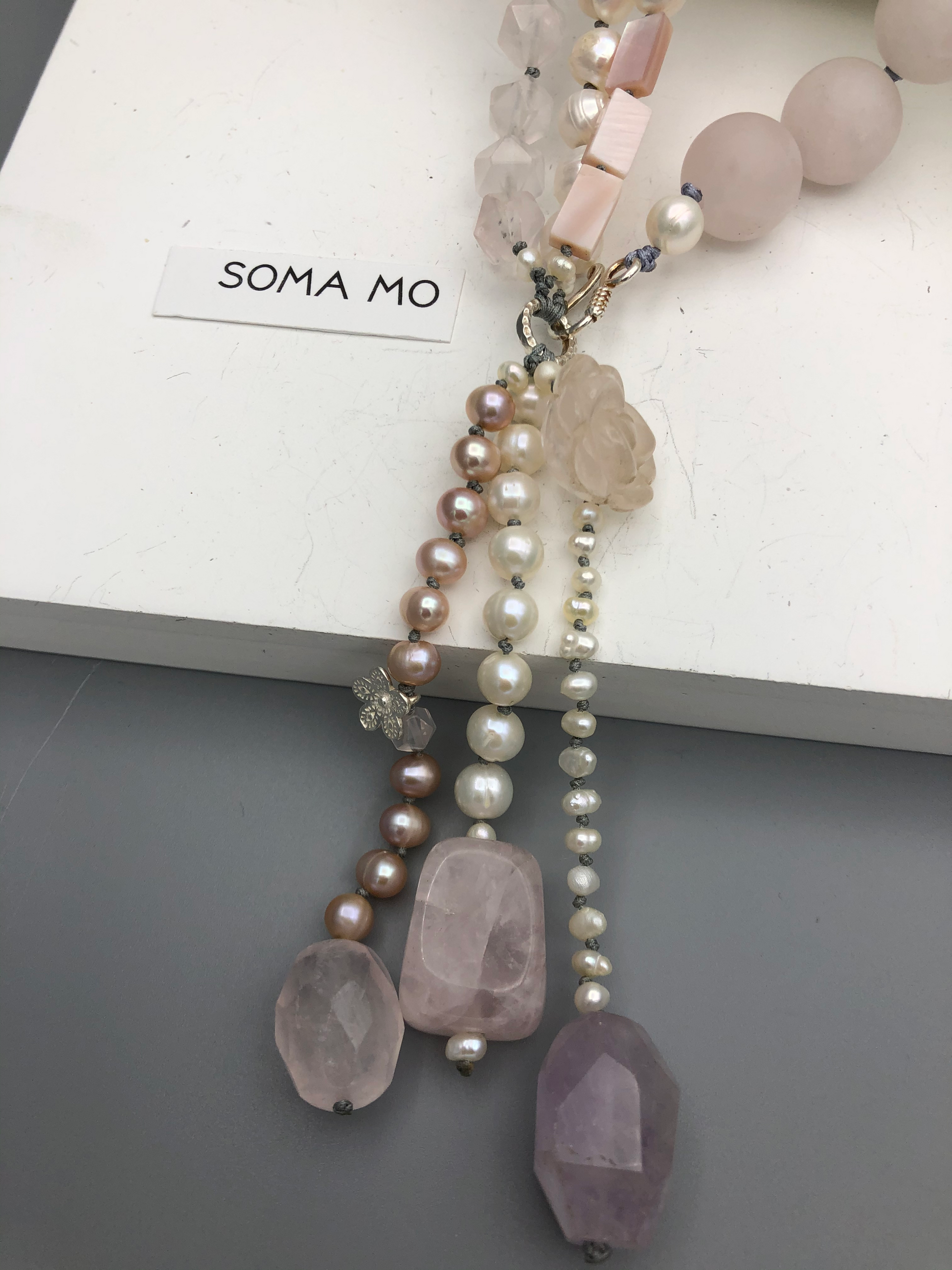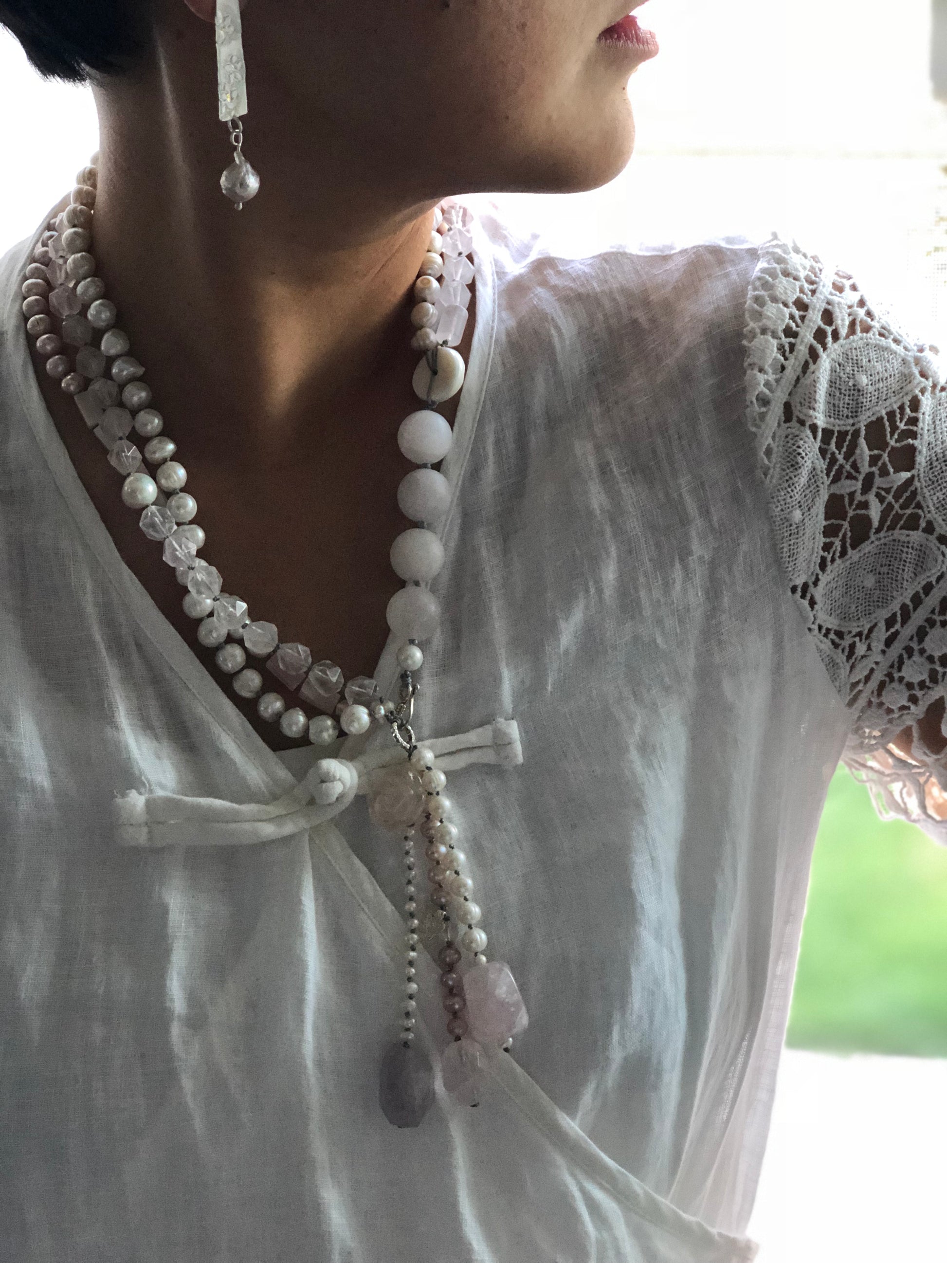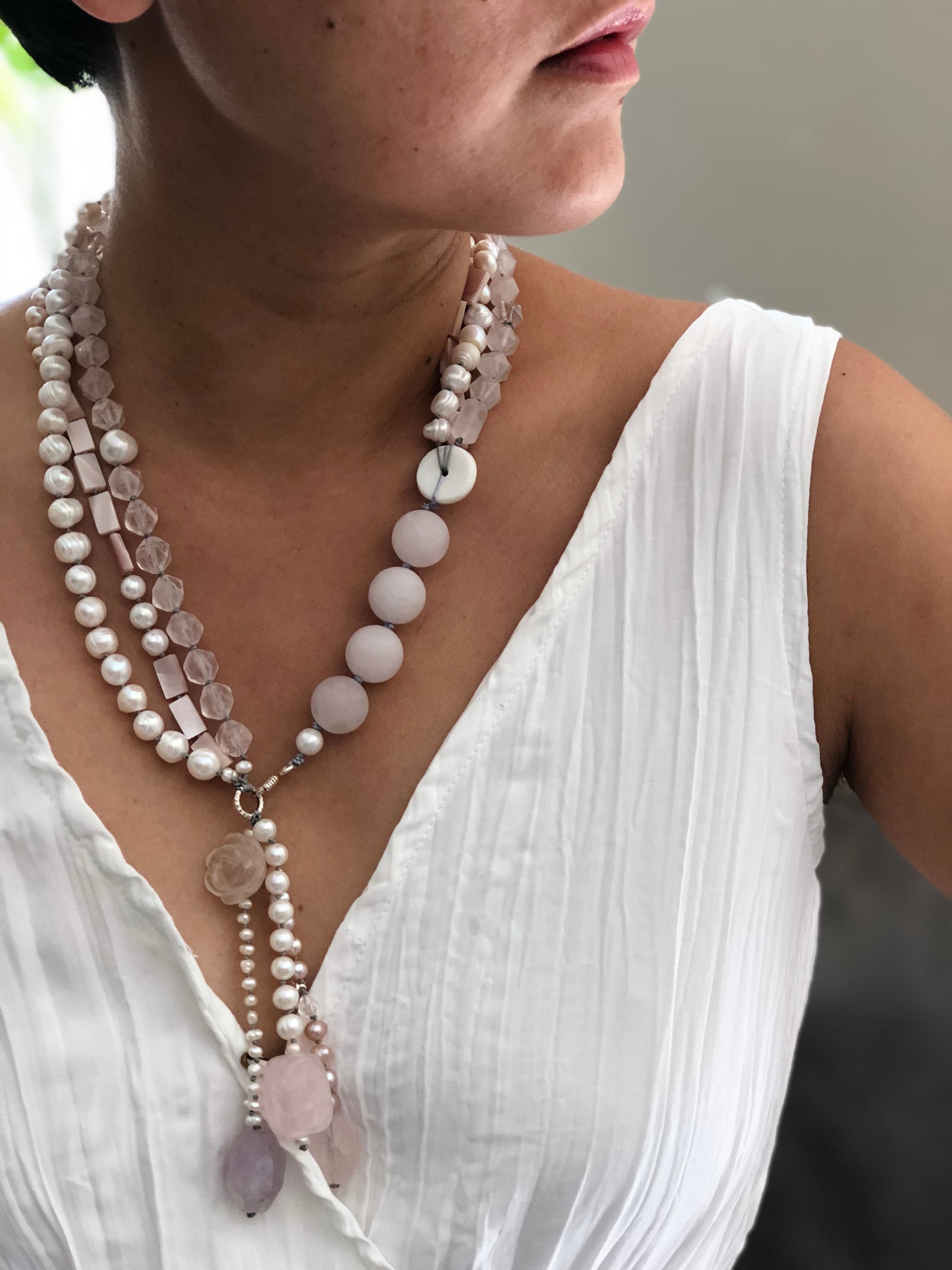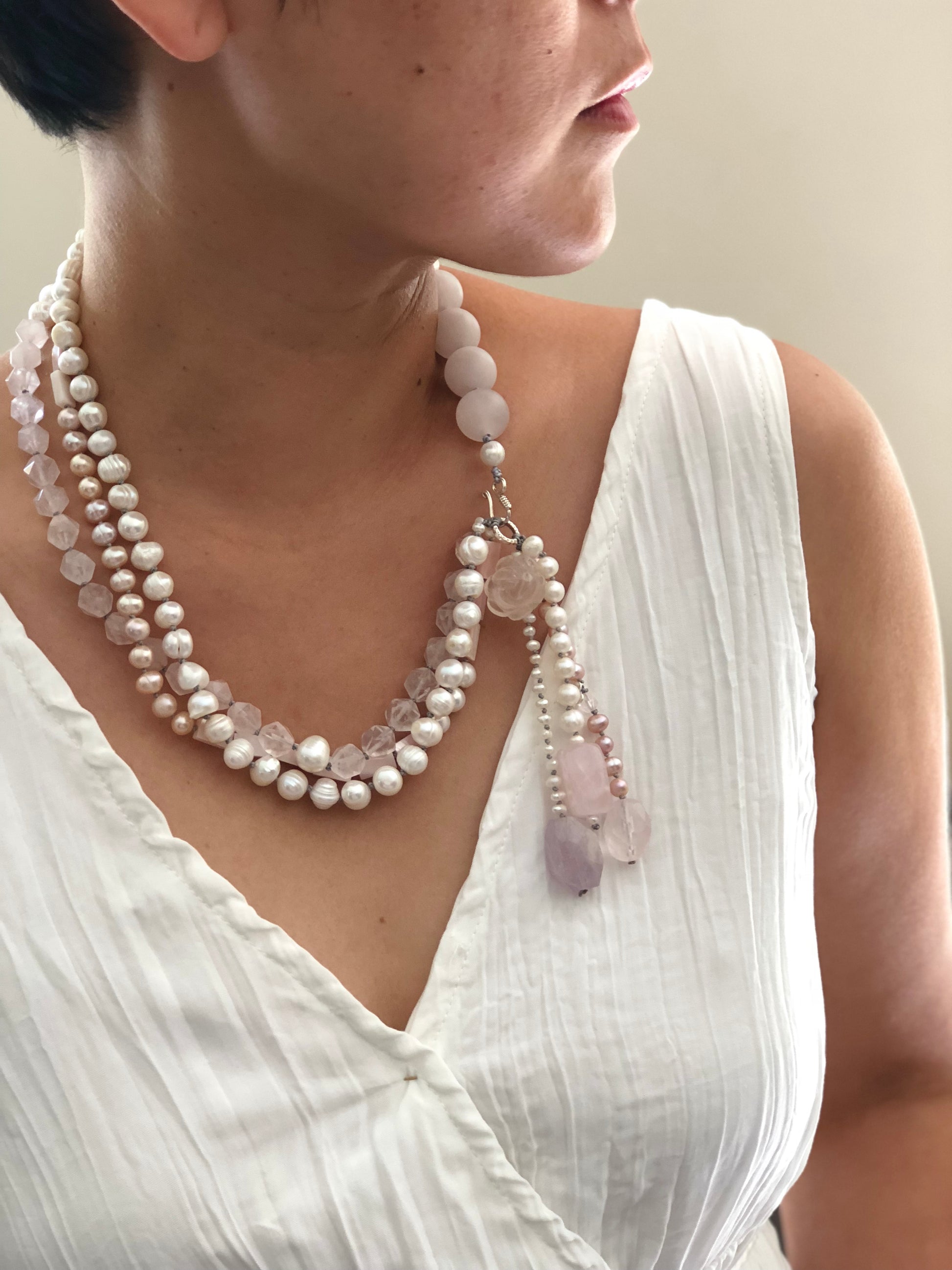 Materials : Rose quartz, fresh water pearl, silver, amethyst