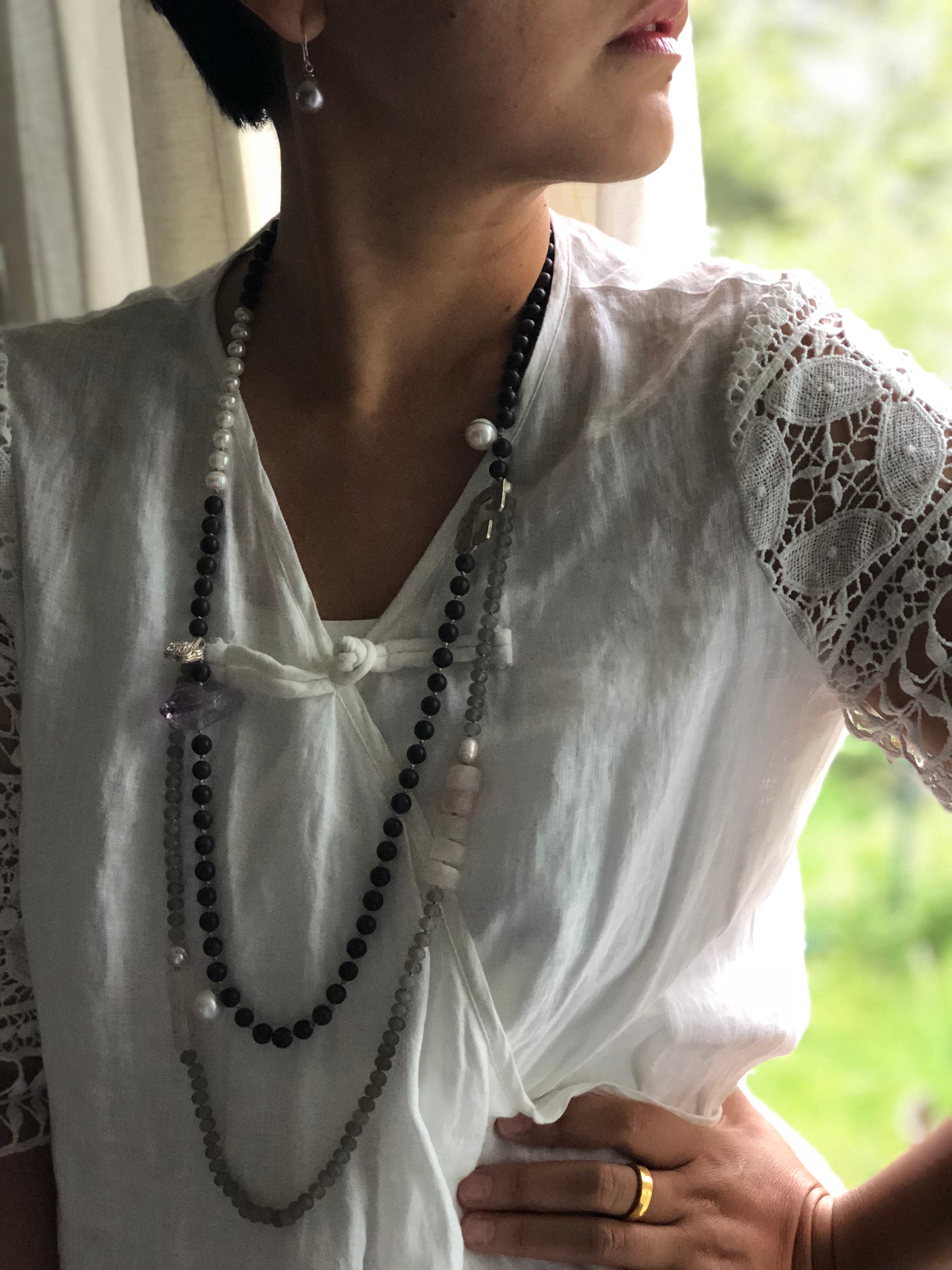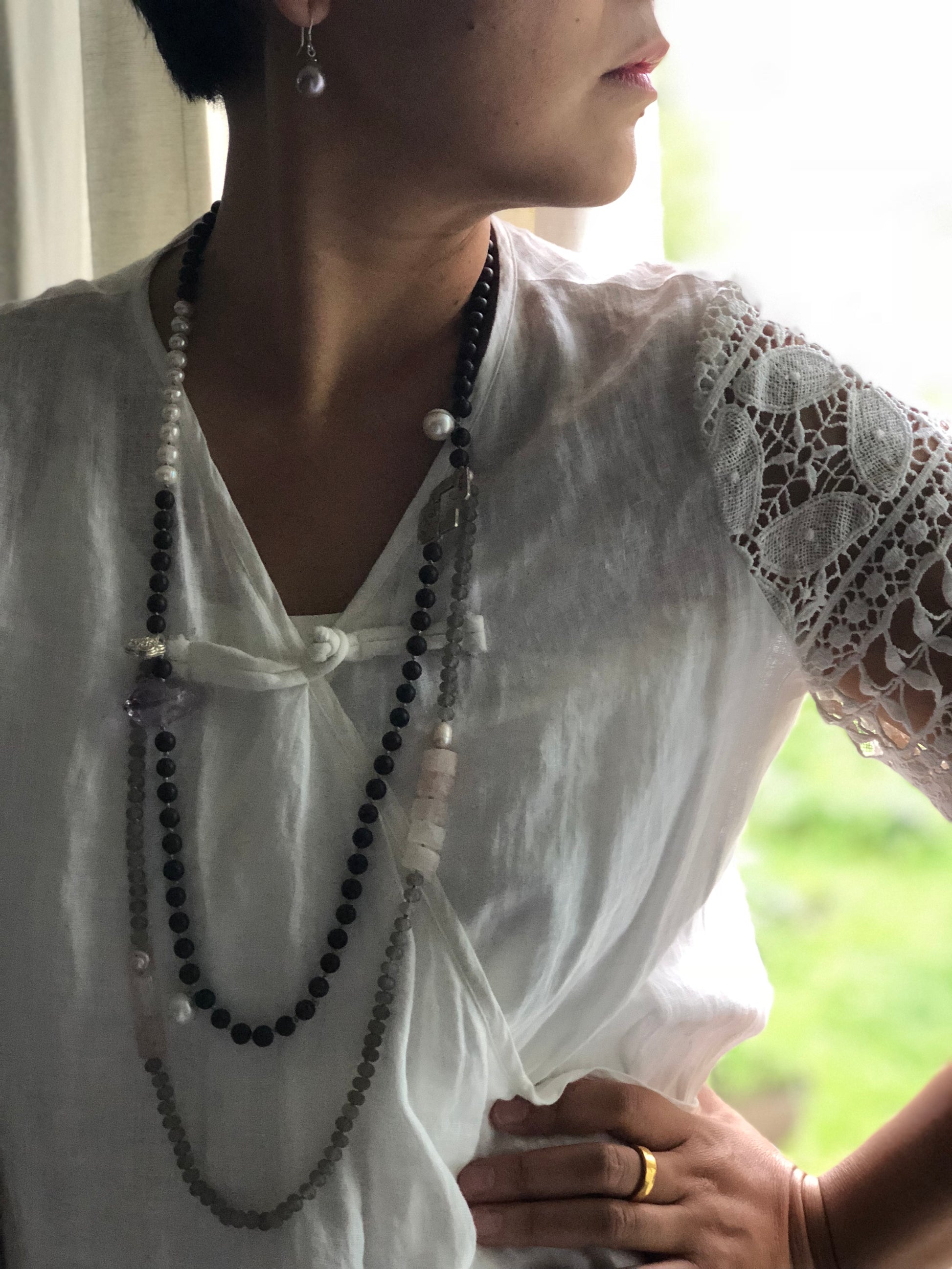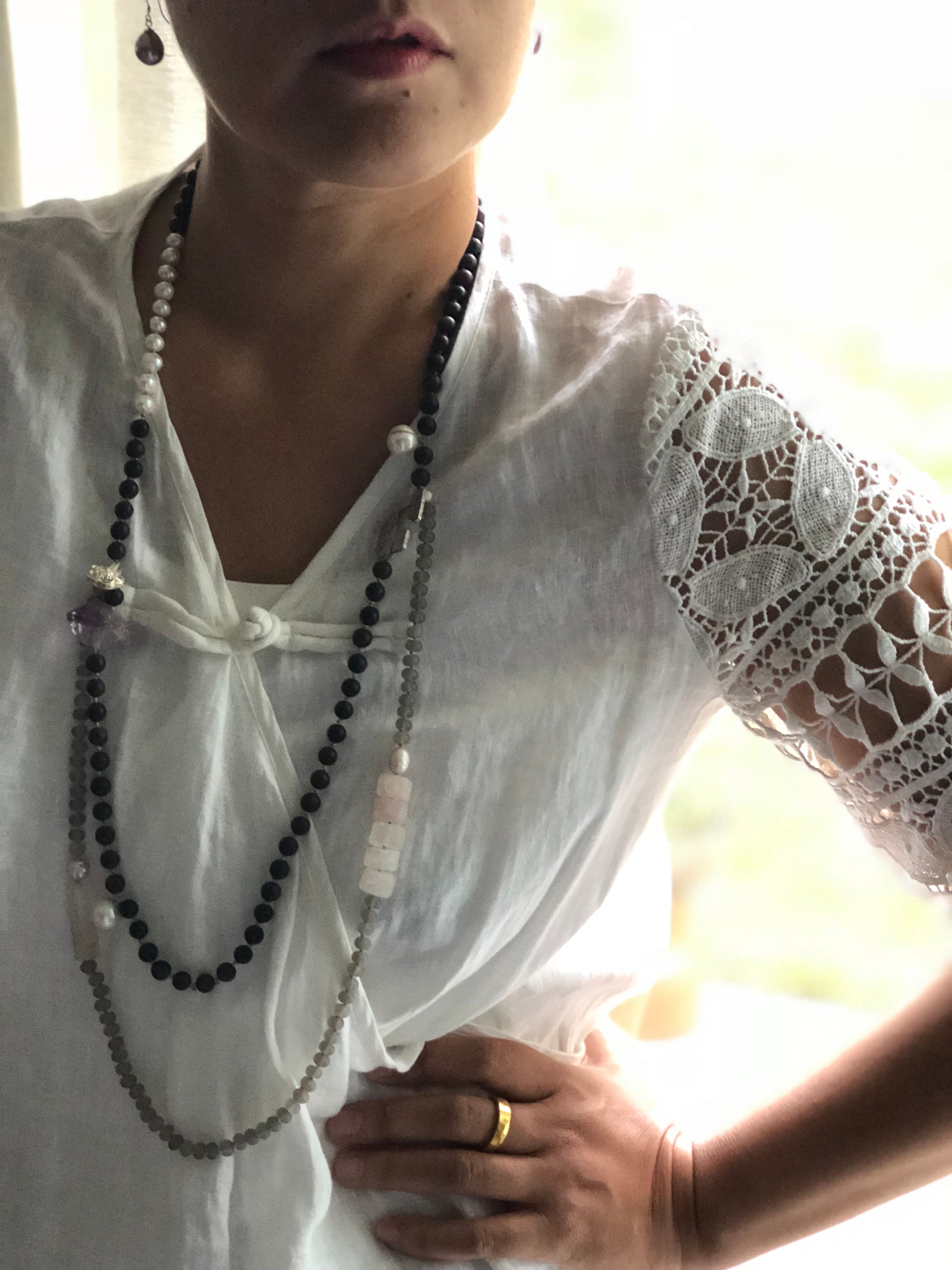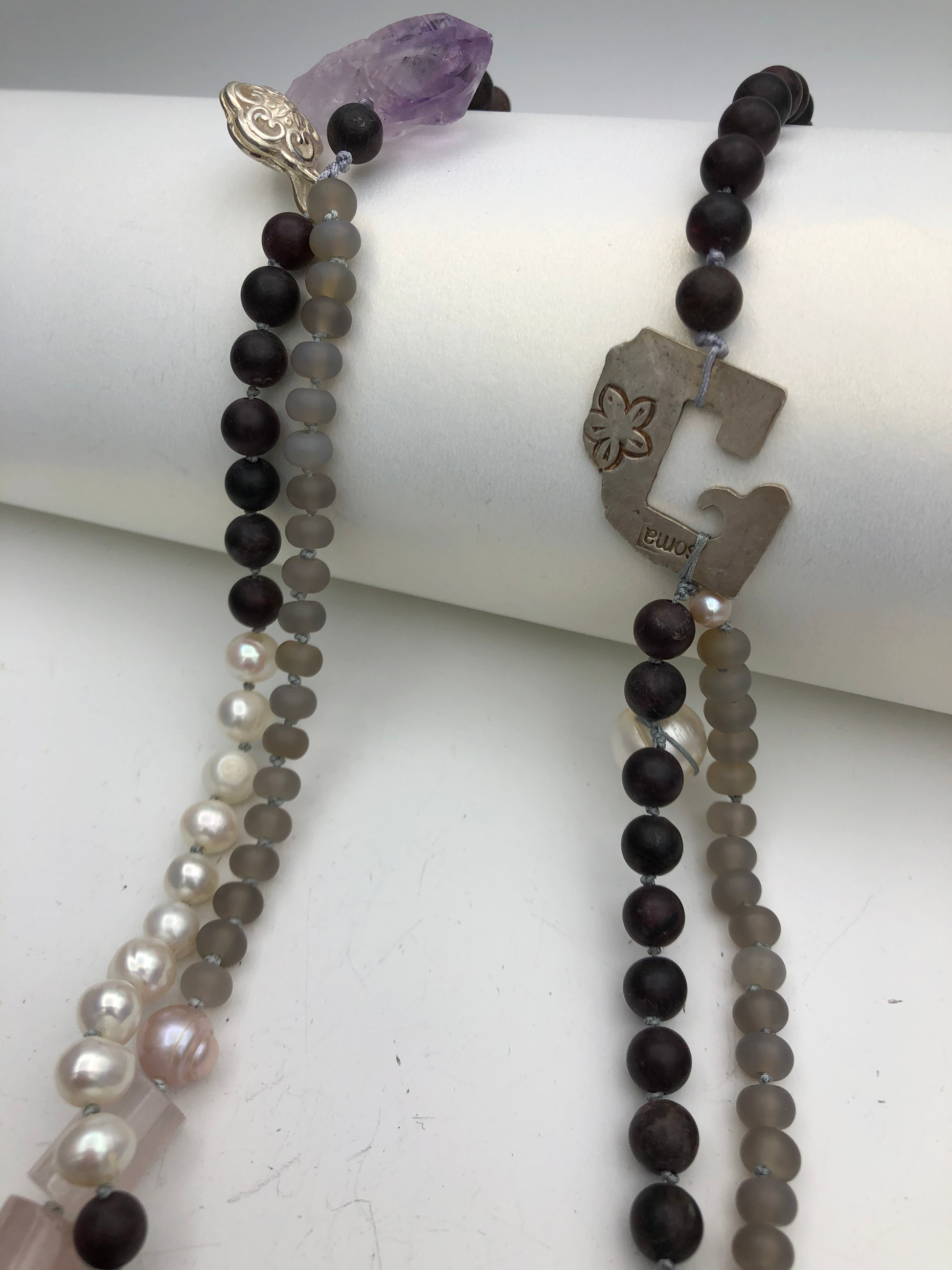 Materials : Garnet, amethyst, rose quartz, fresh water pearl, fine silver, agate