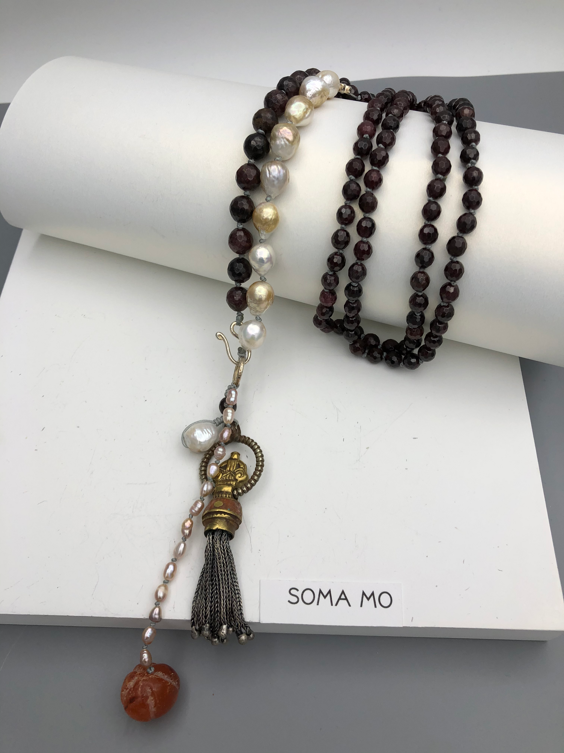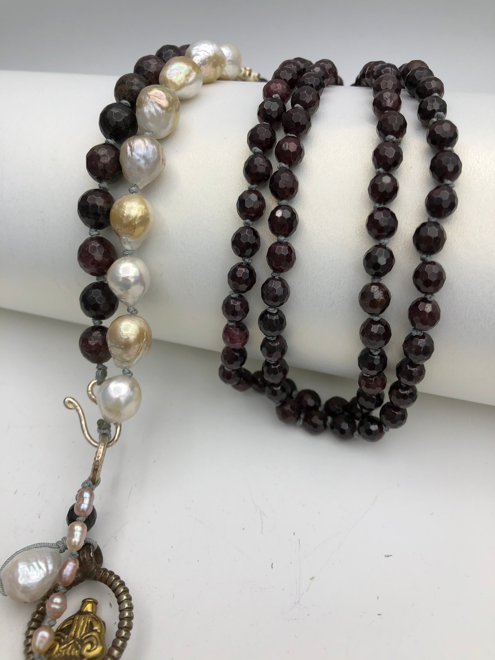 Garnet with Tibetan pendent. Hand knotted between each beads.