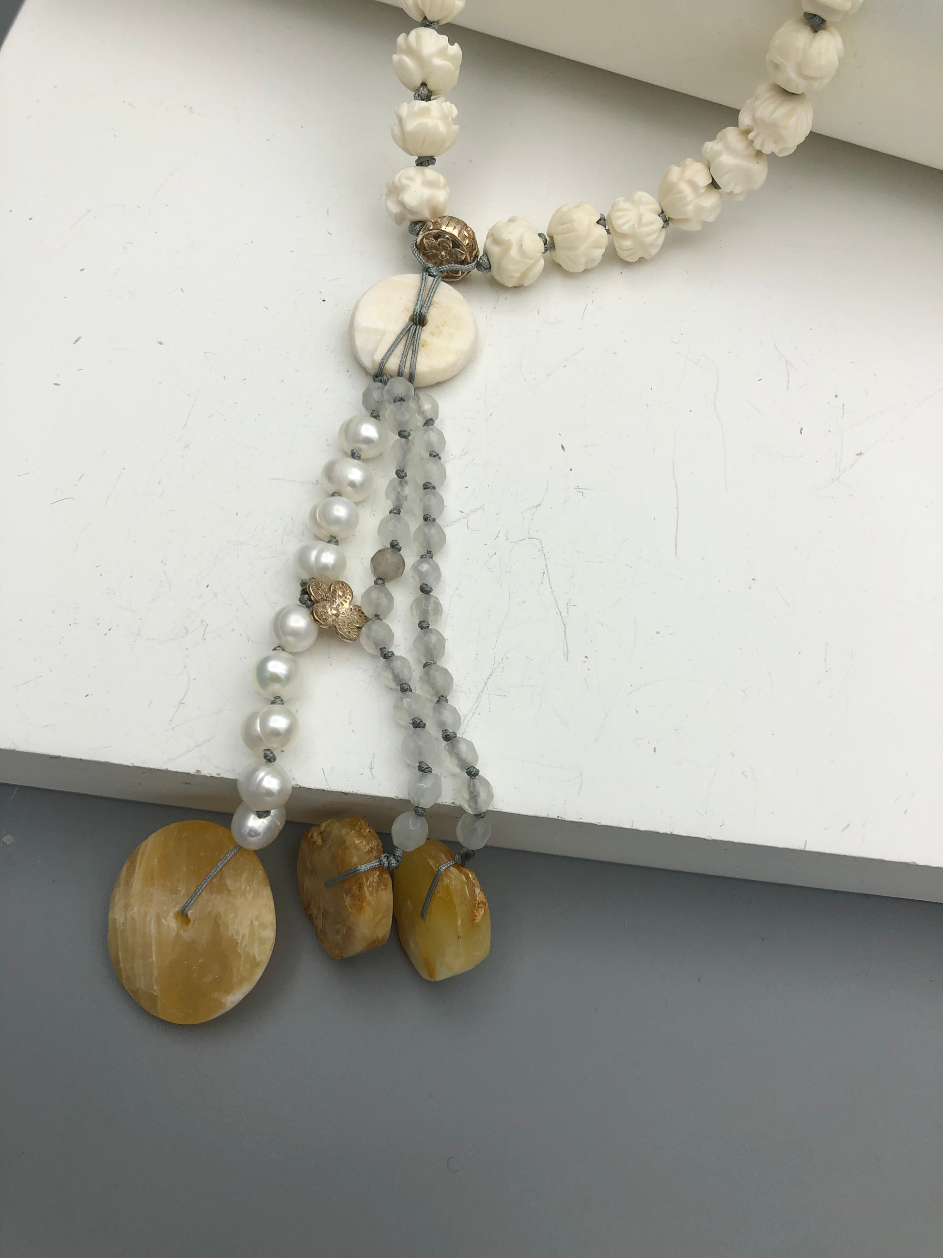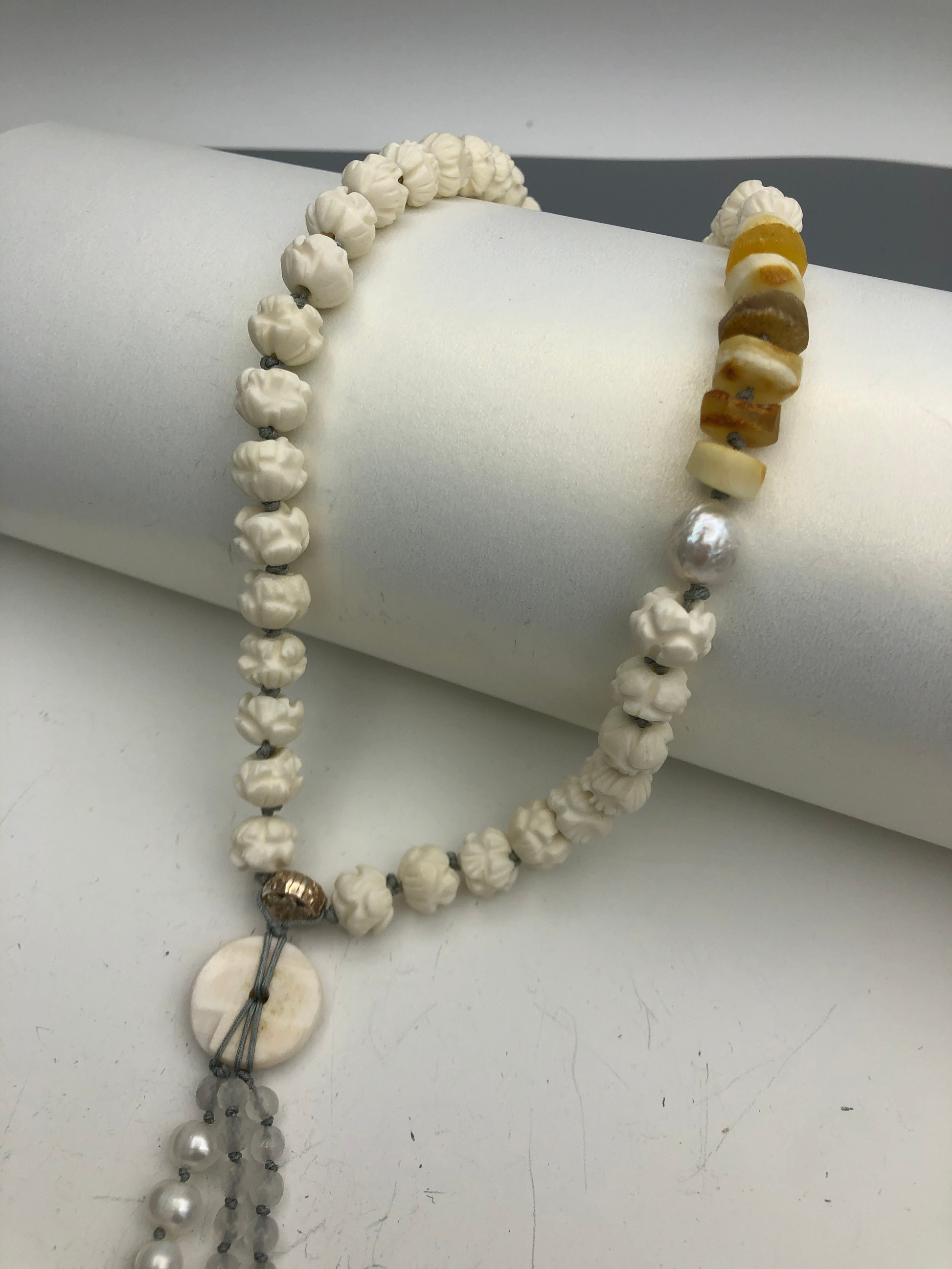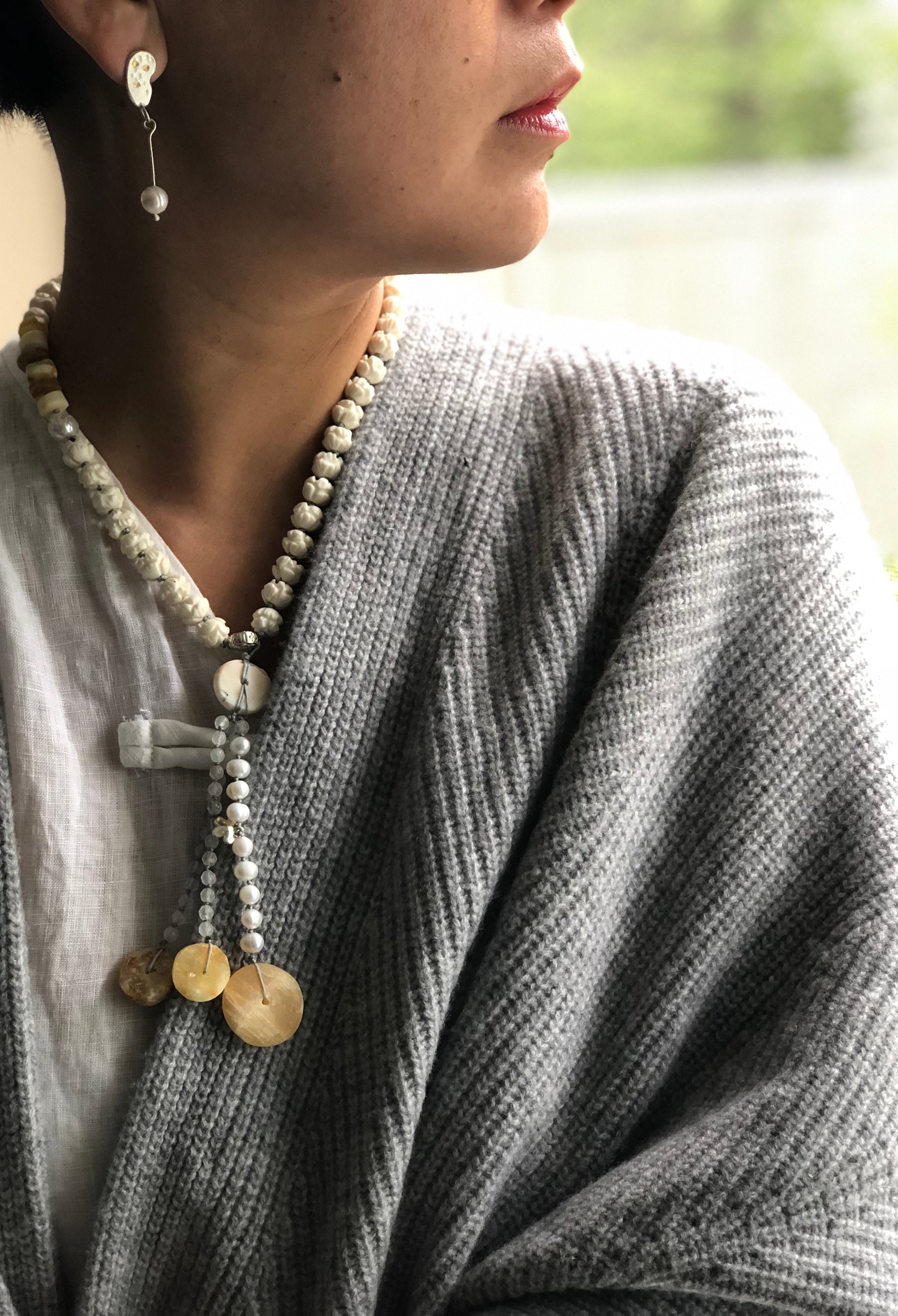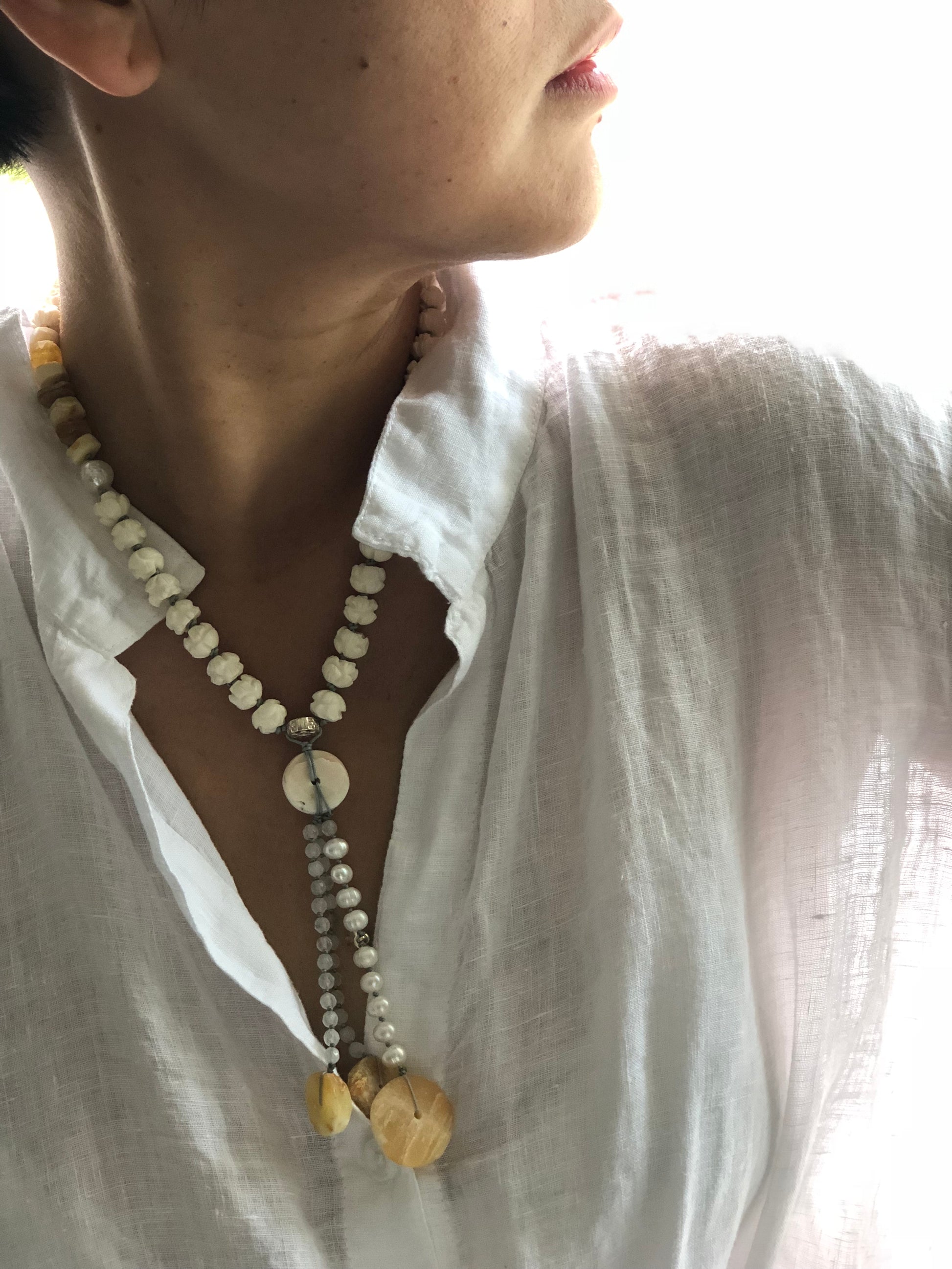 Materials : Budhi seeds, fresh water pearl, yellow jade, Baltic amber