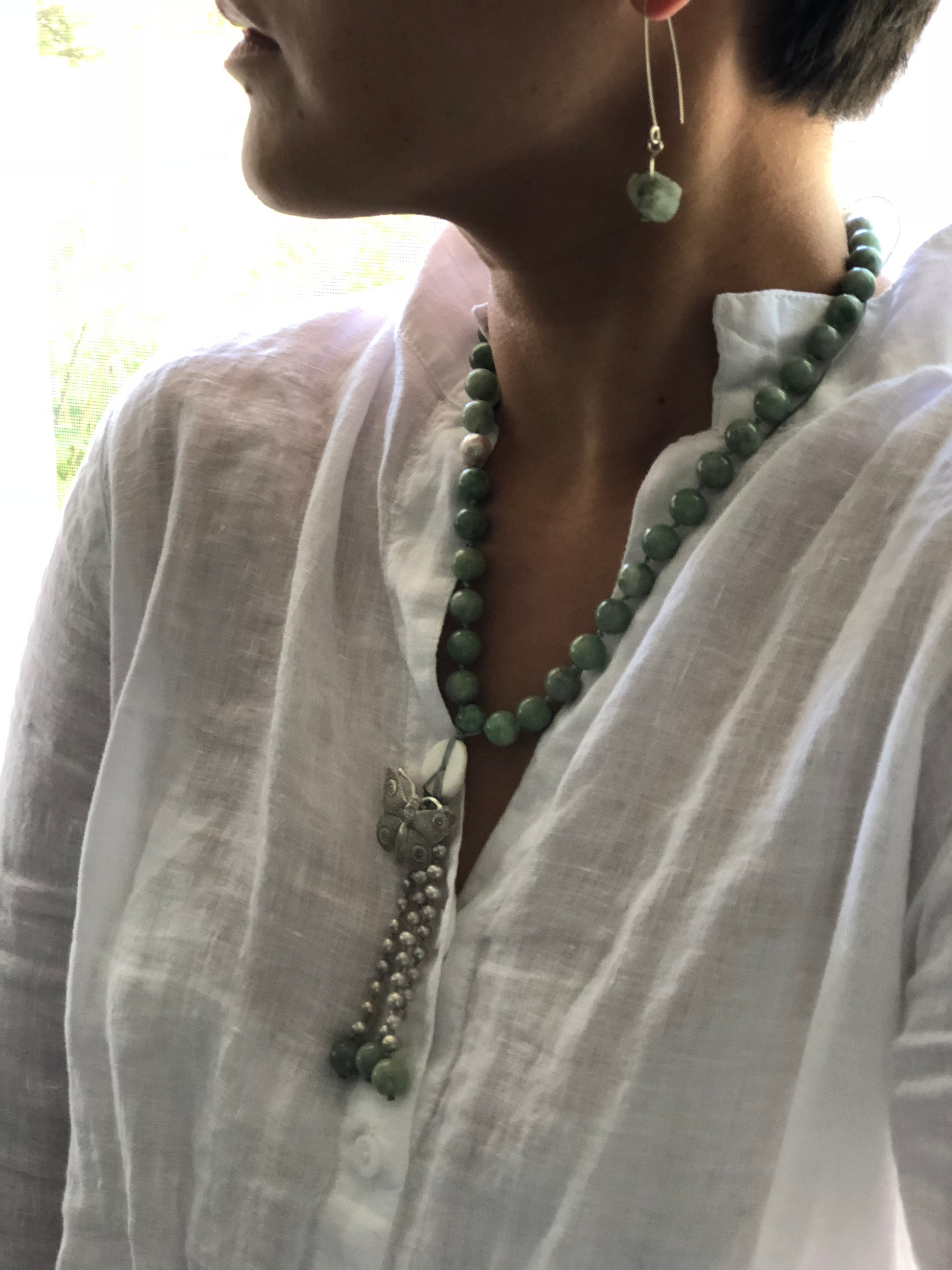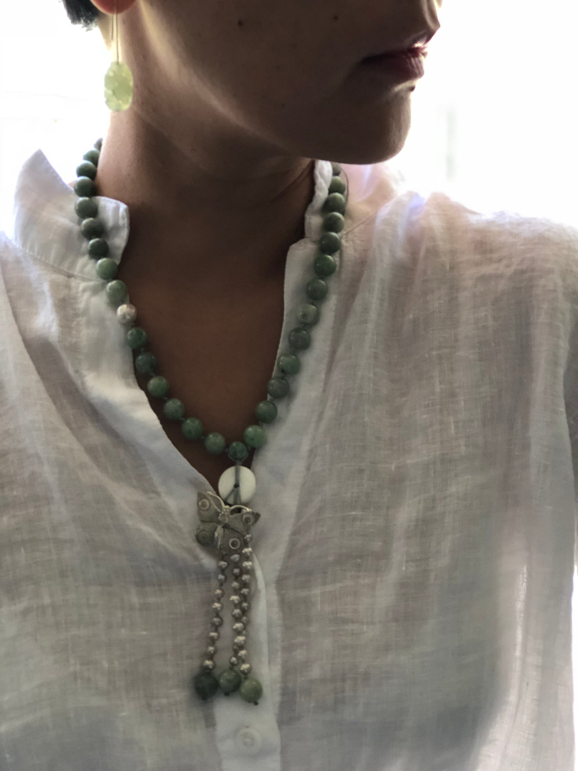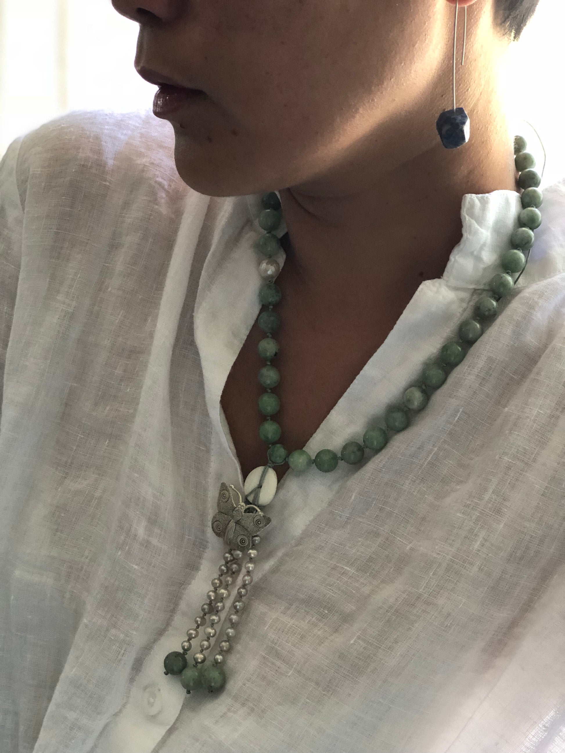 Chinese jade and fine silver butterfly work so well together. Hand knotted between each beads, can be resized for special request.