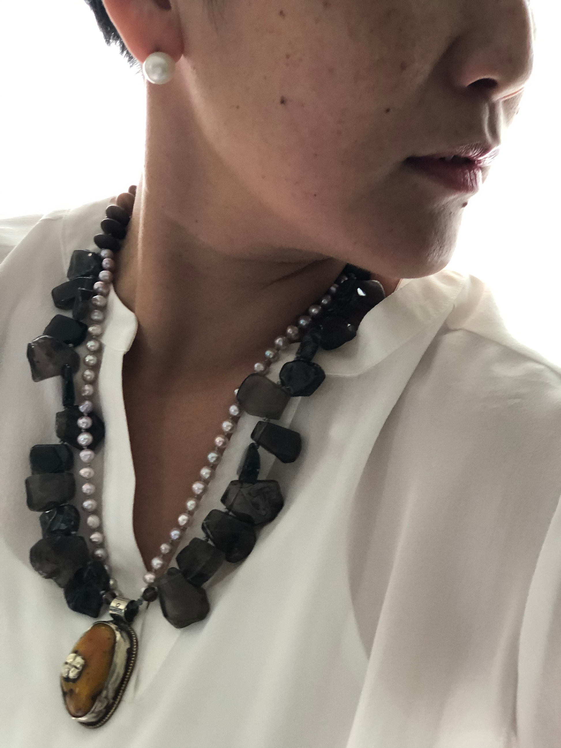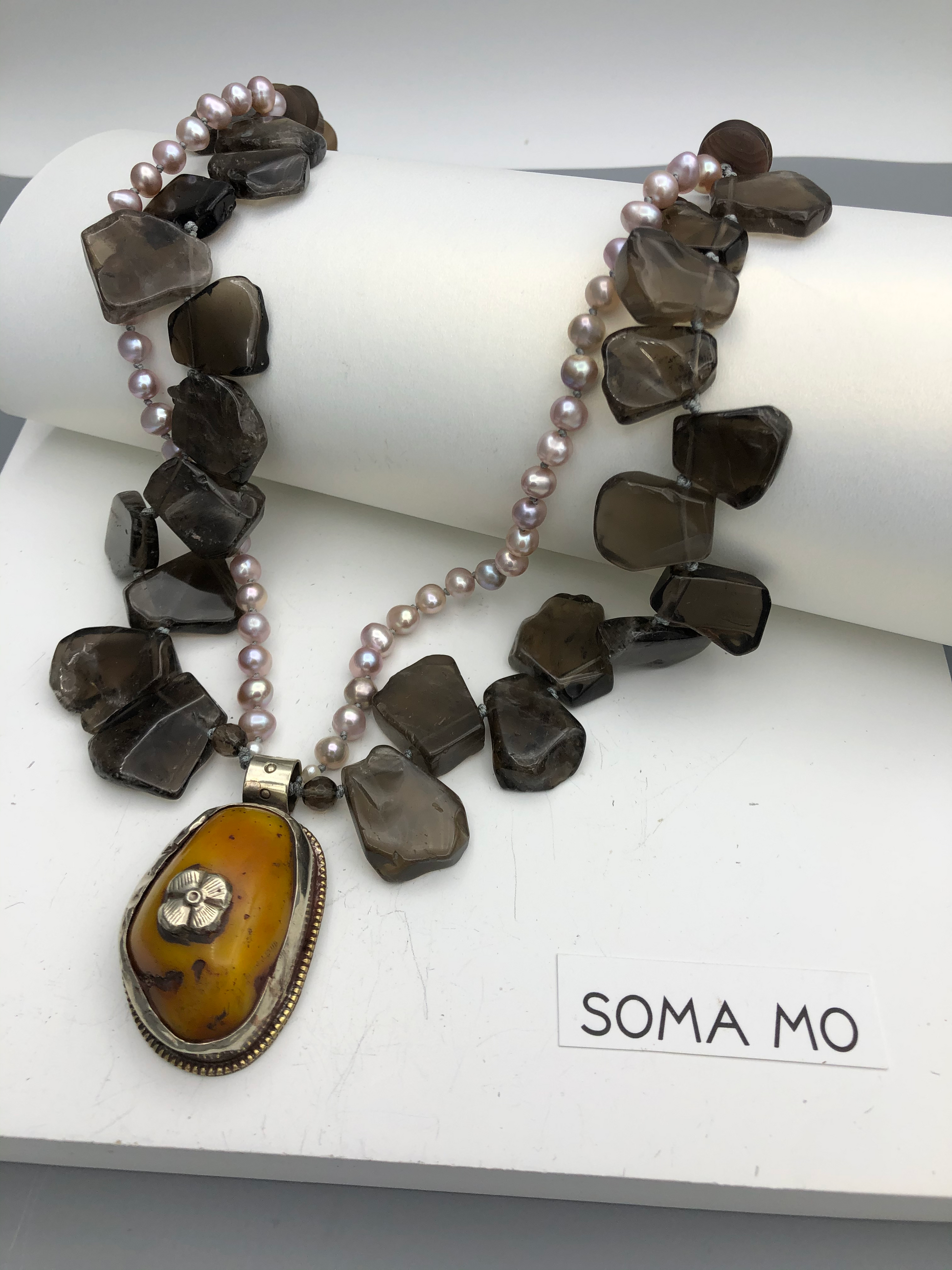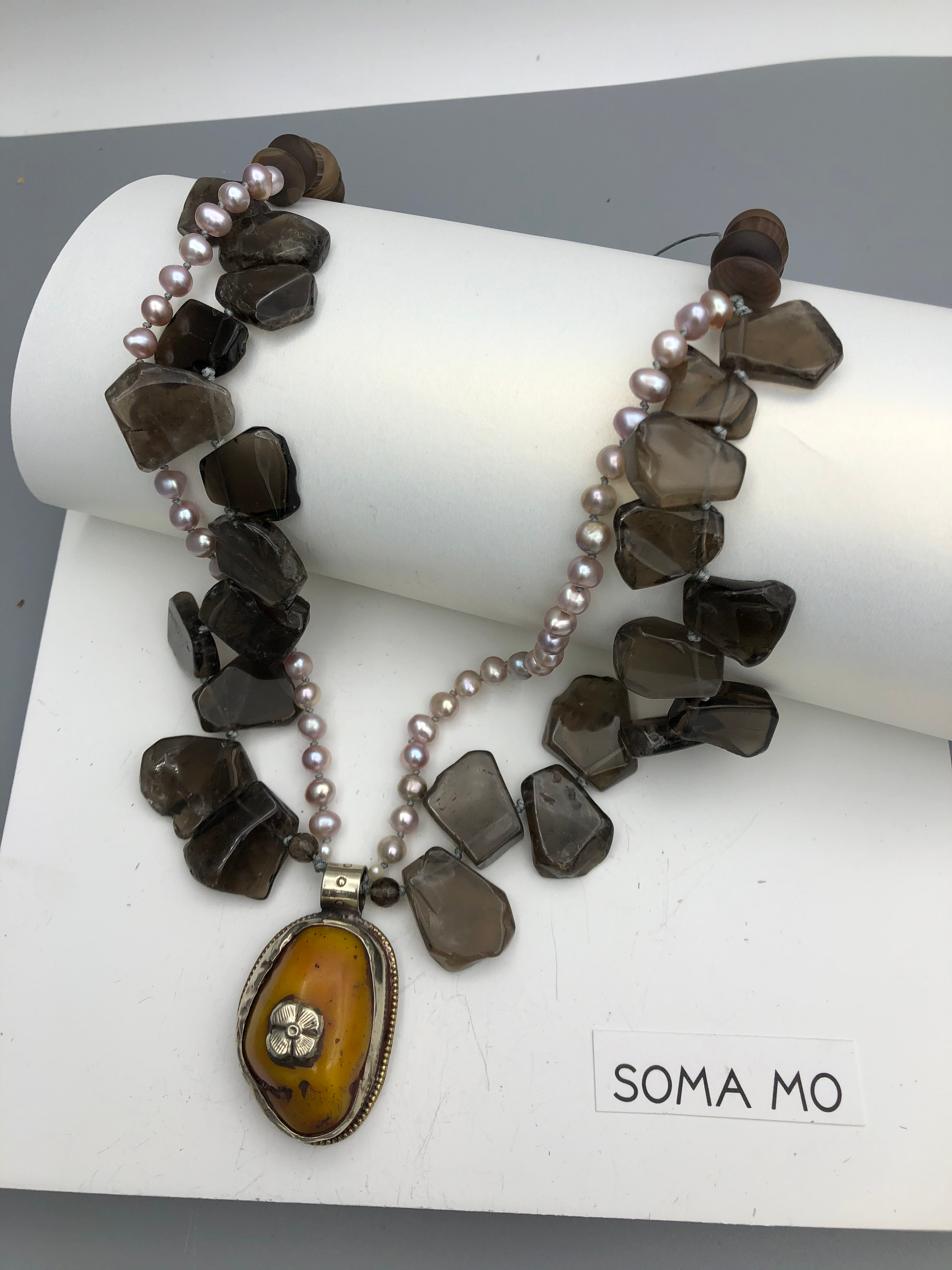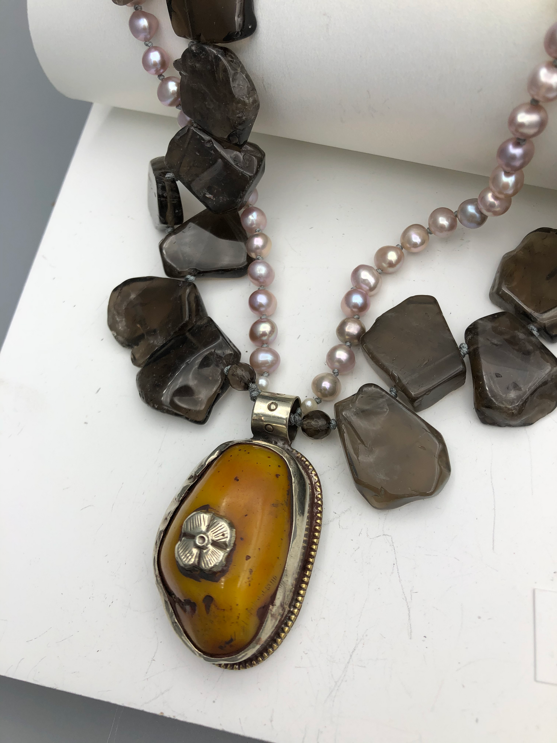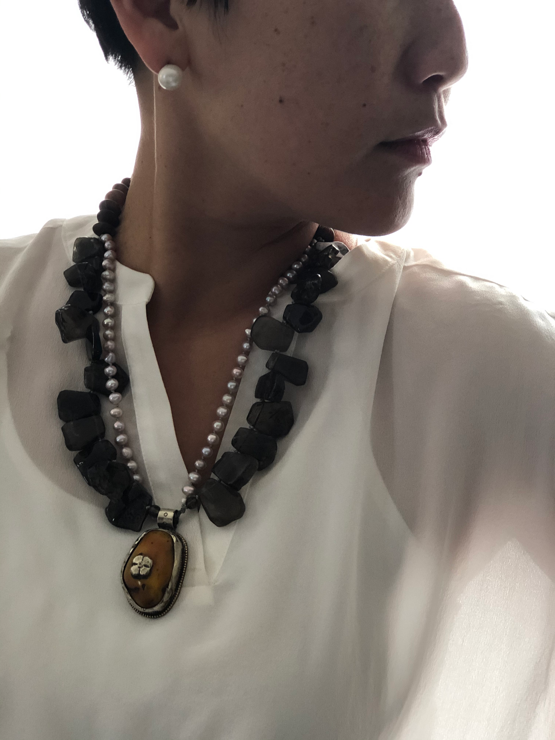 Materials : Smoky quartz, fresh water pearl, old Tibetan amber pendent