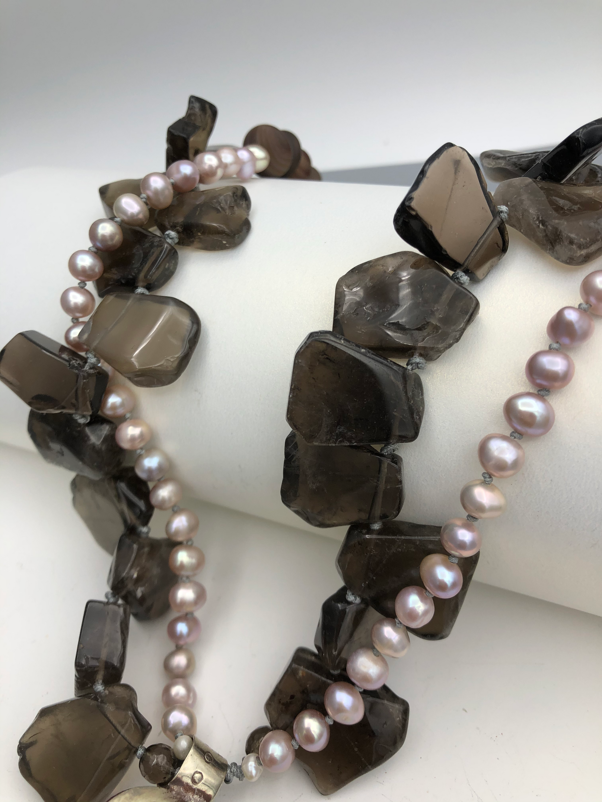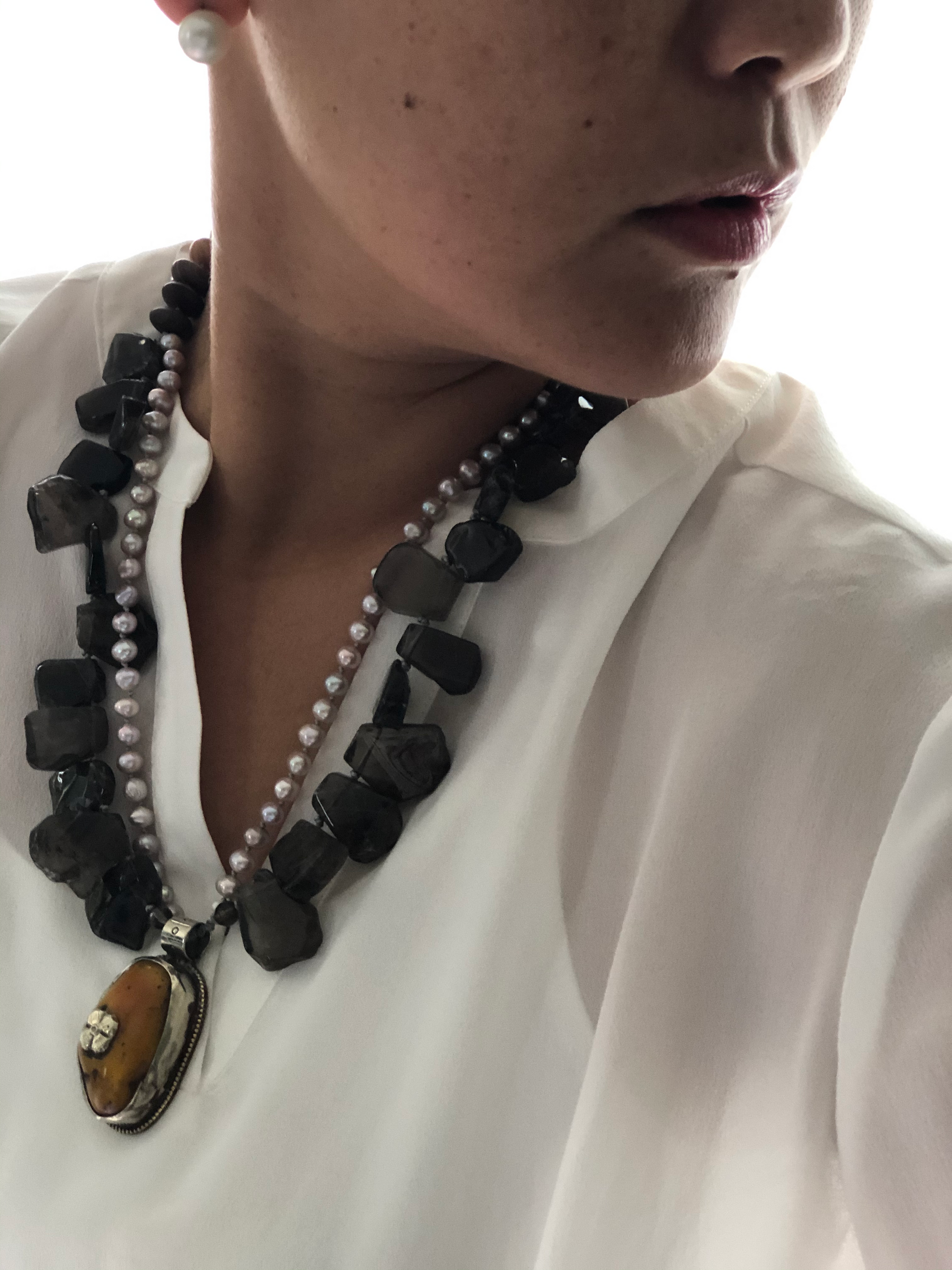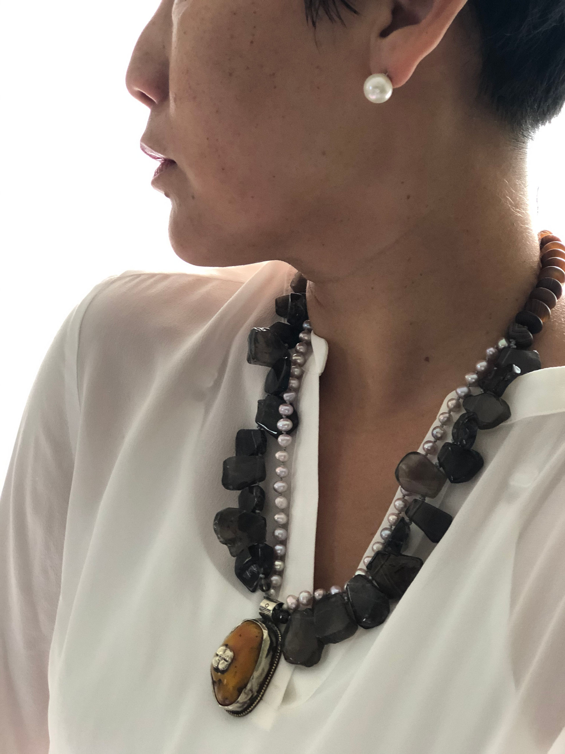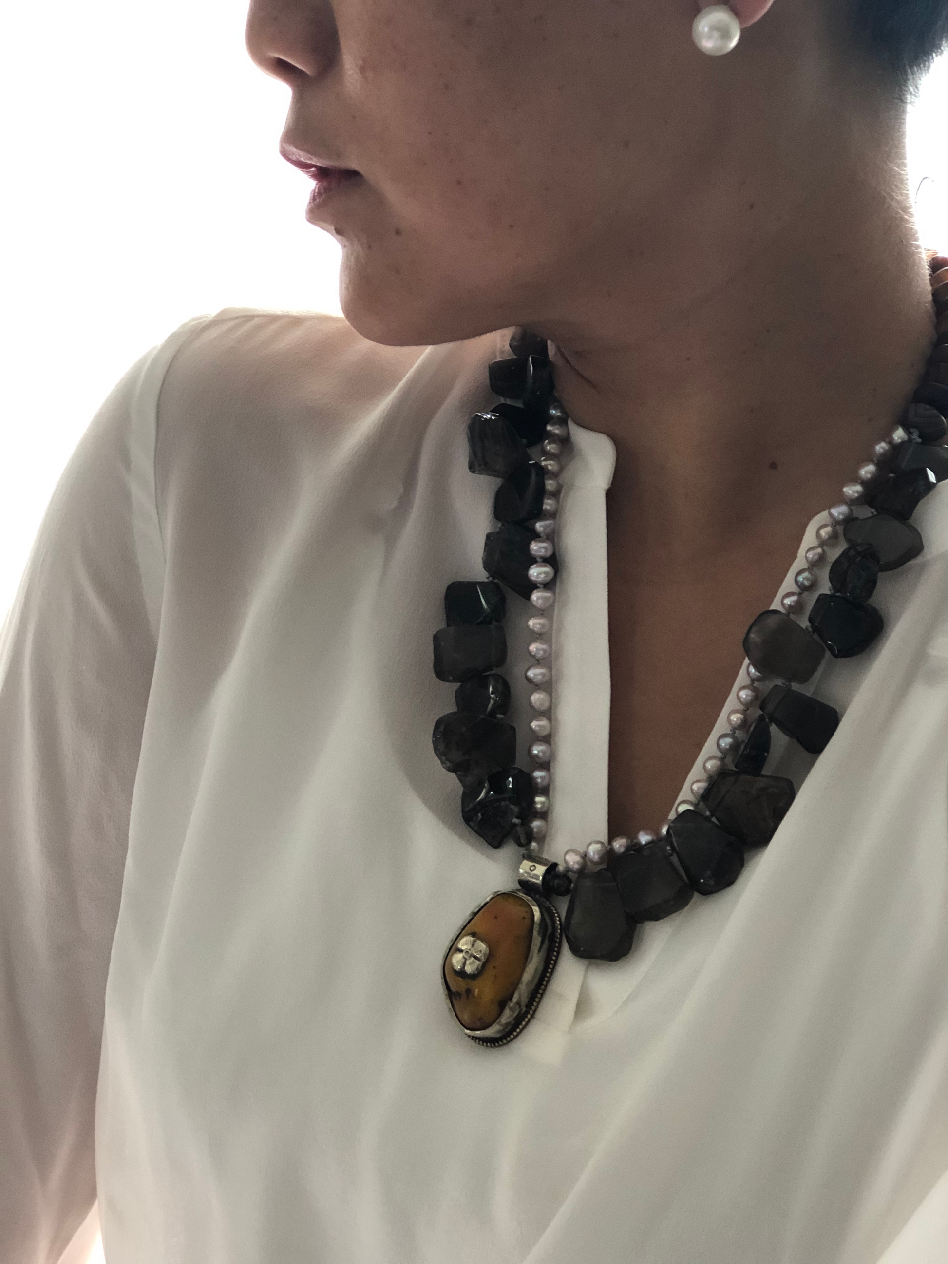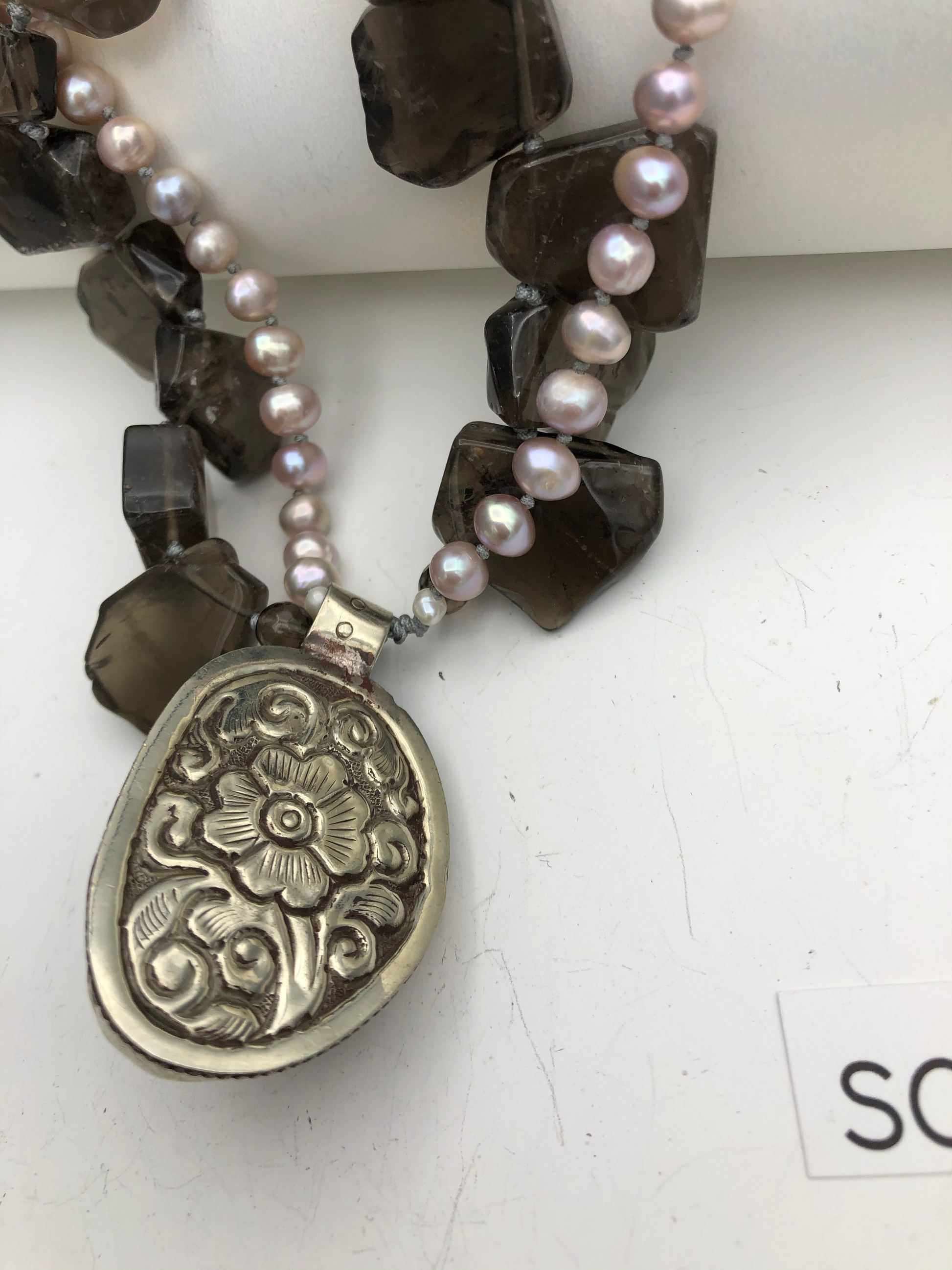 Materials : Smoky quartz, fresh water pearl, old Tibetan amber pendent