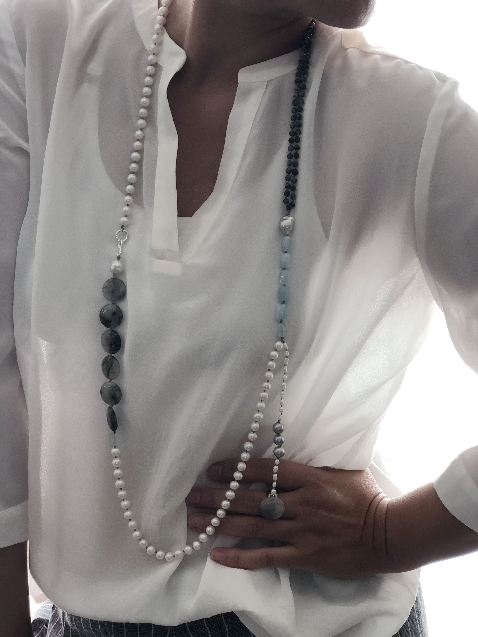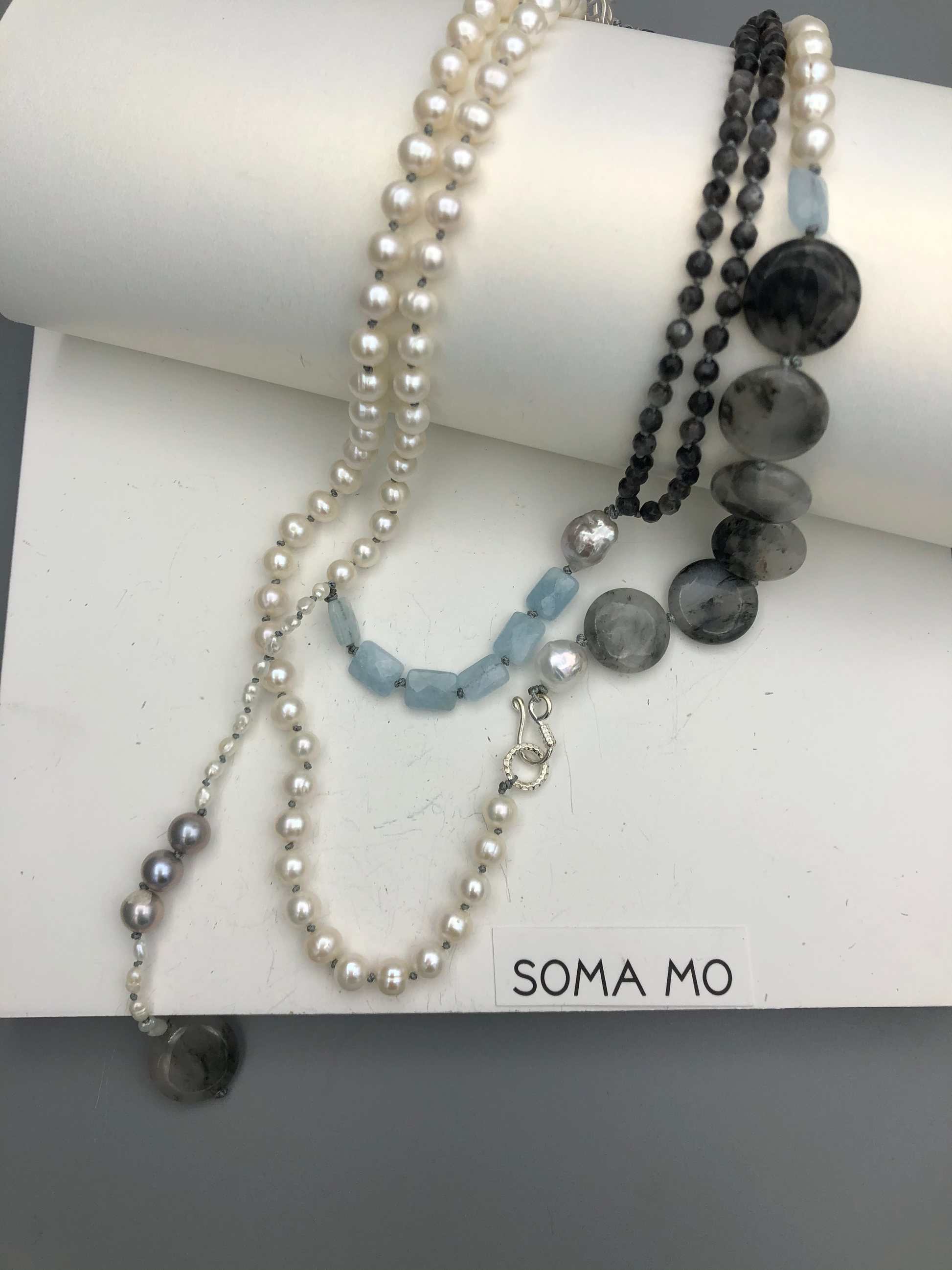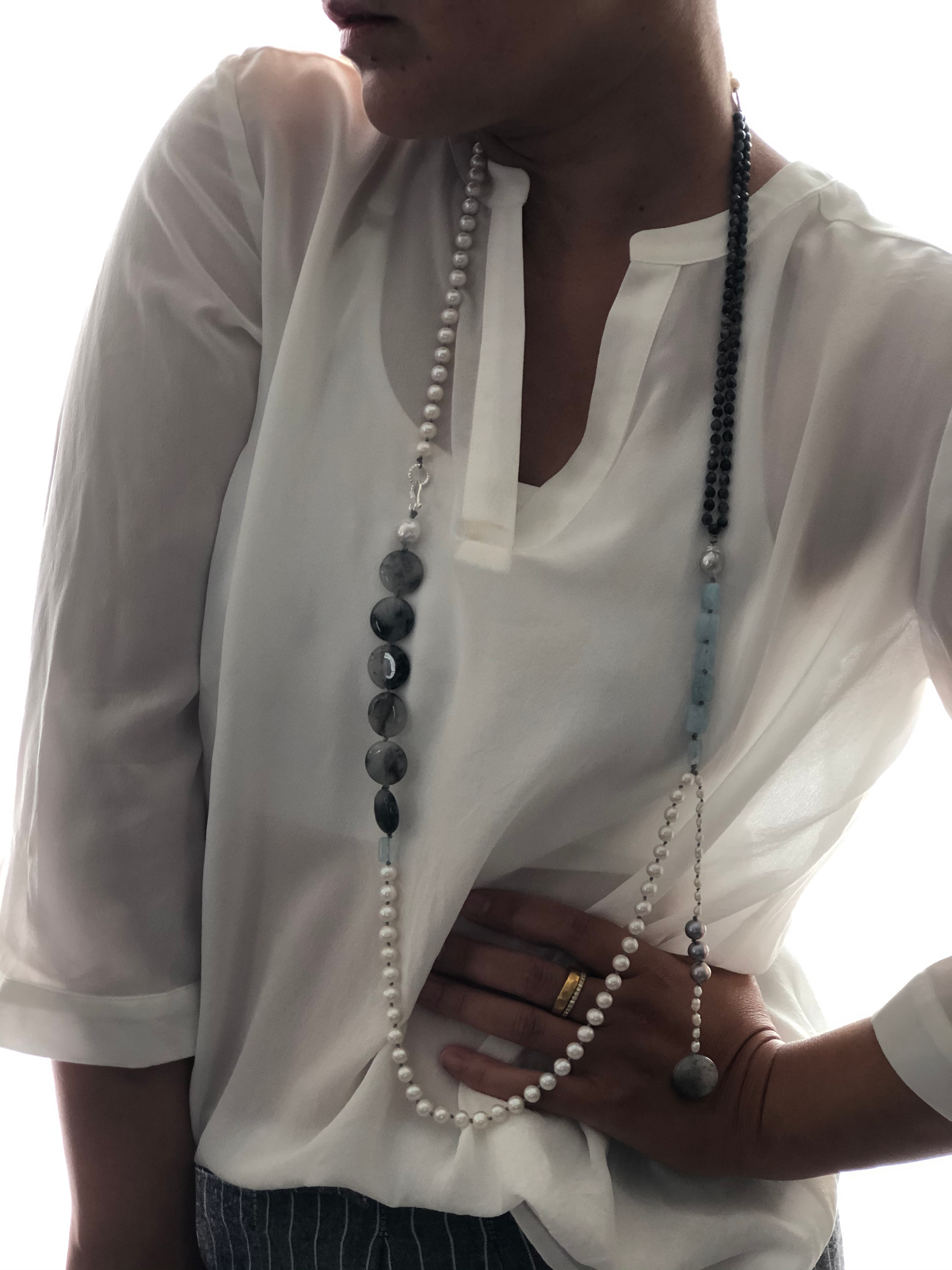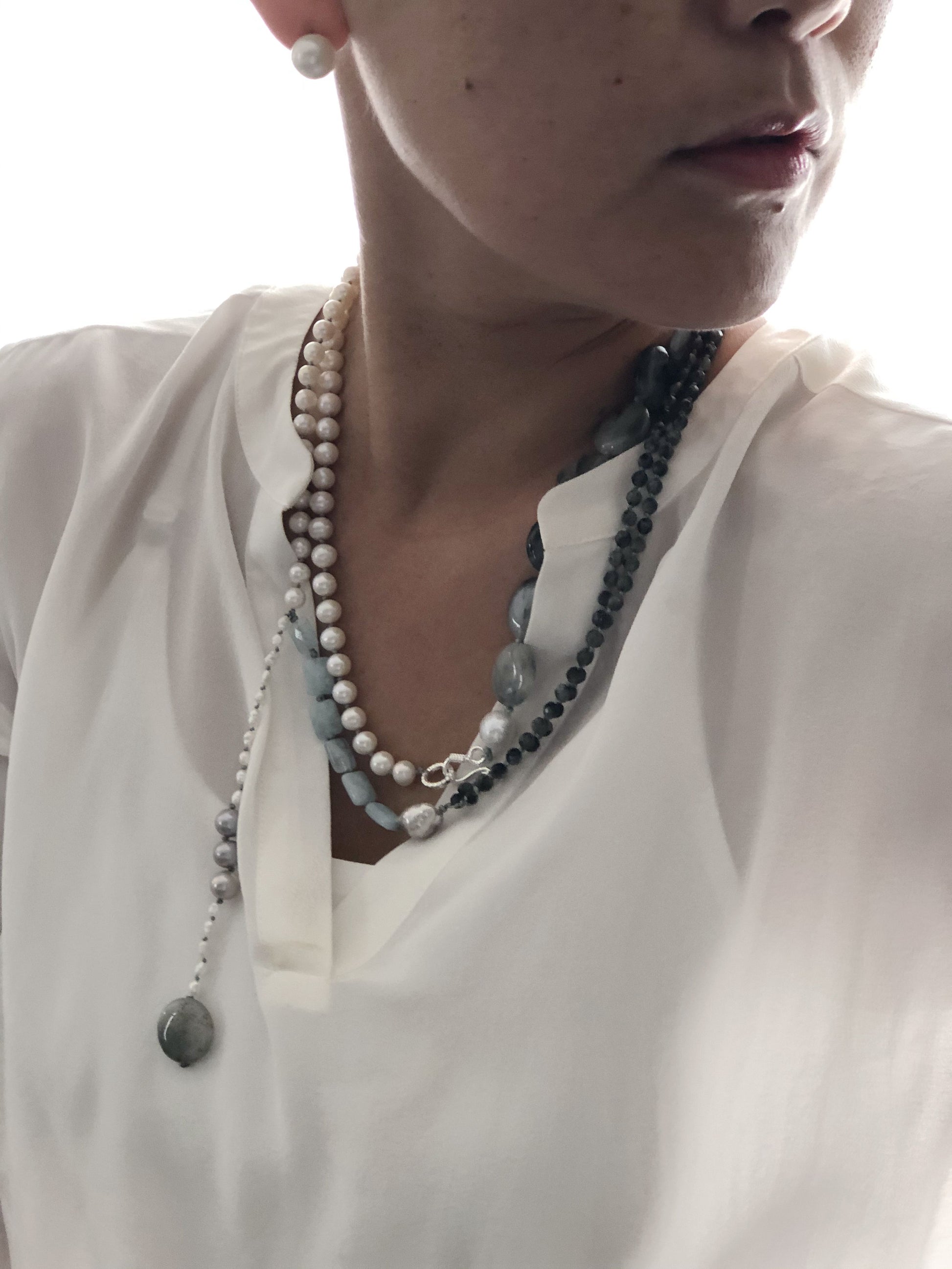 Materials : Aquamarine, fresh water pearl, grey quartz, silver