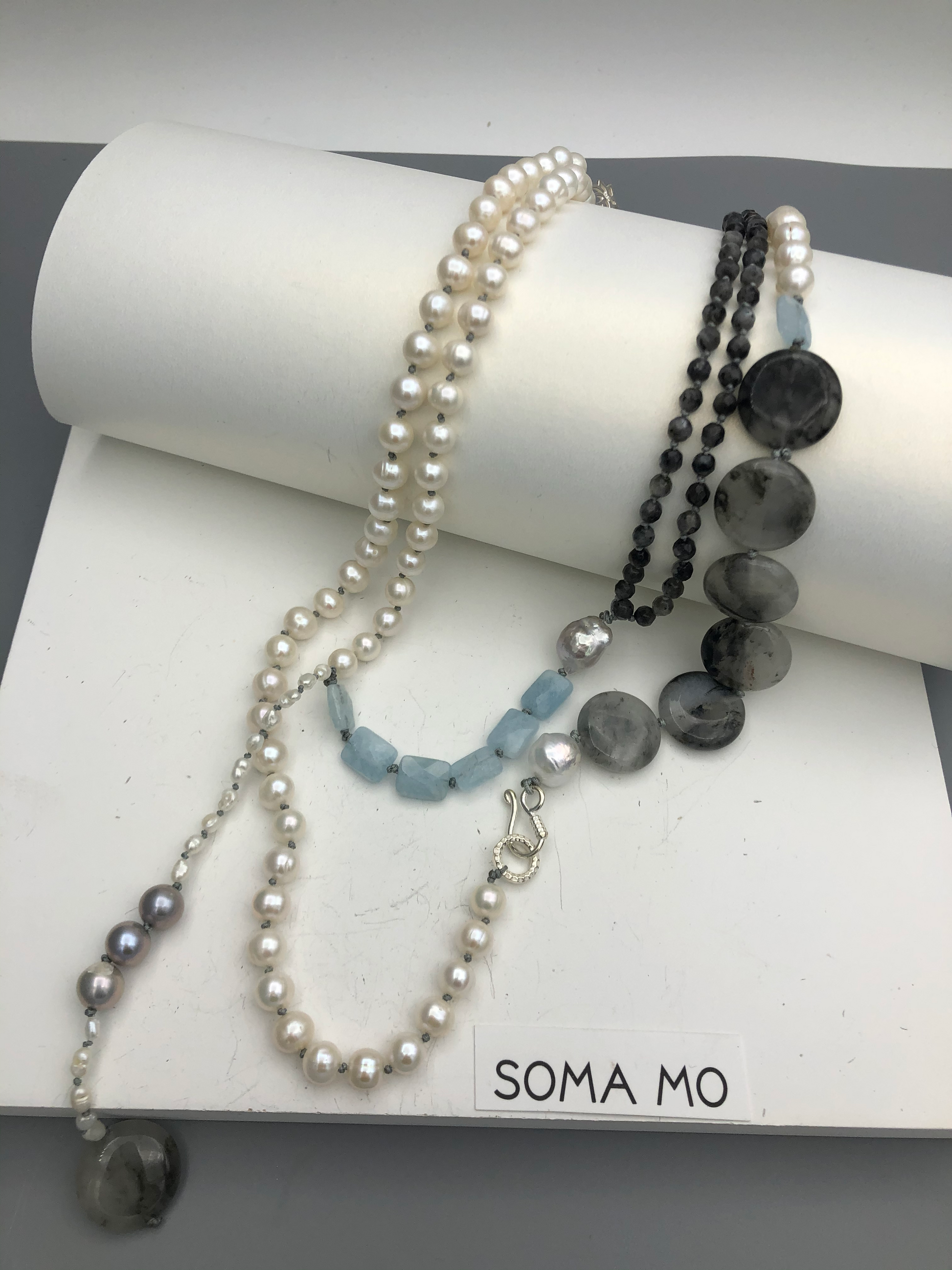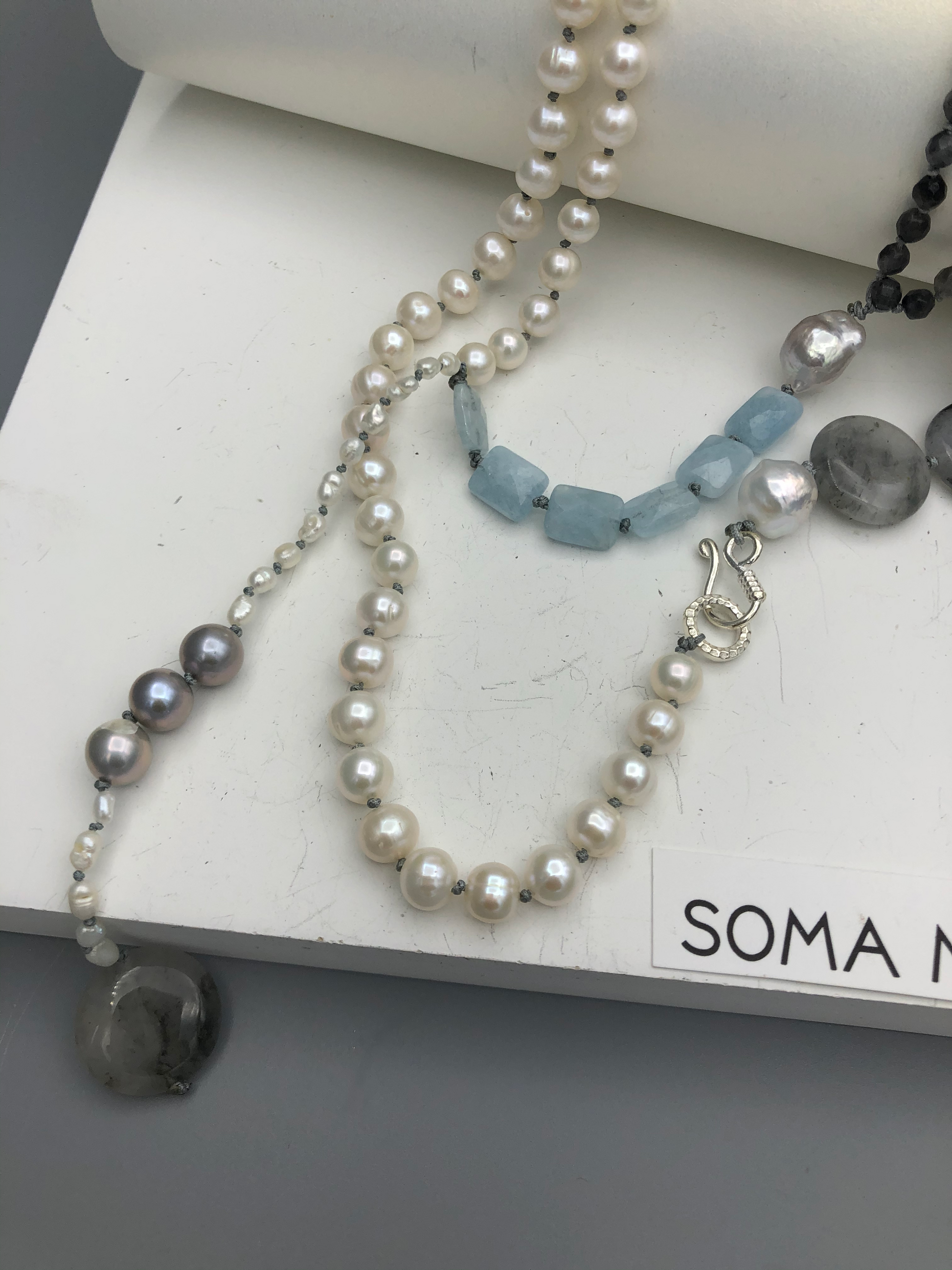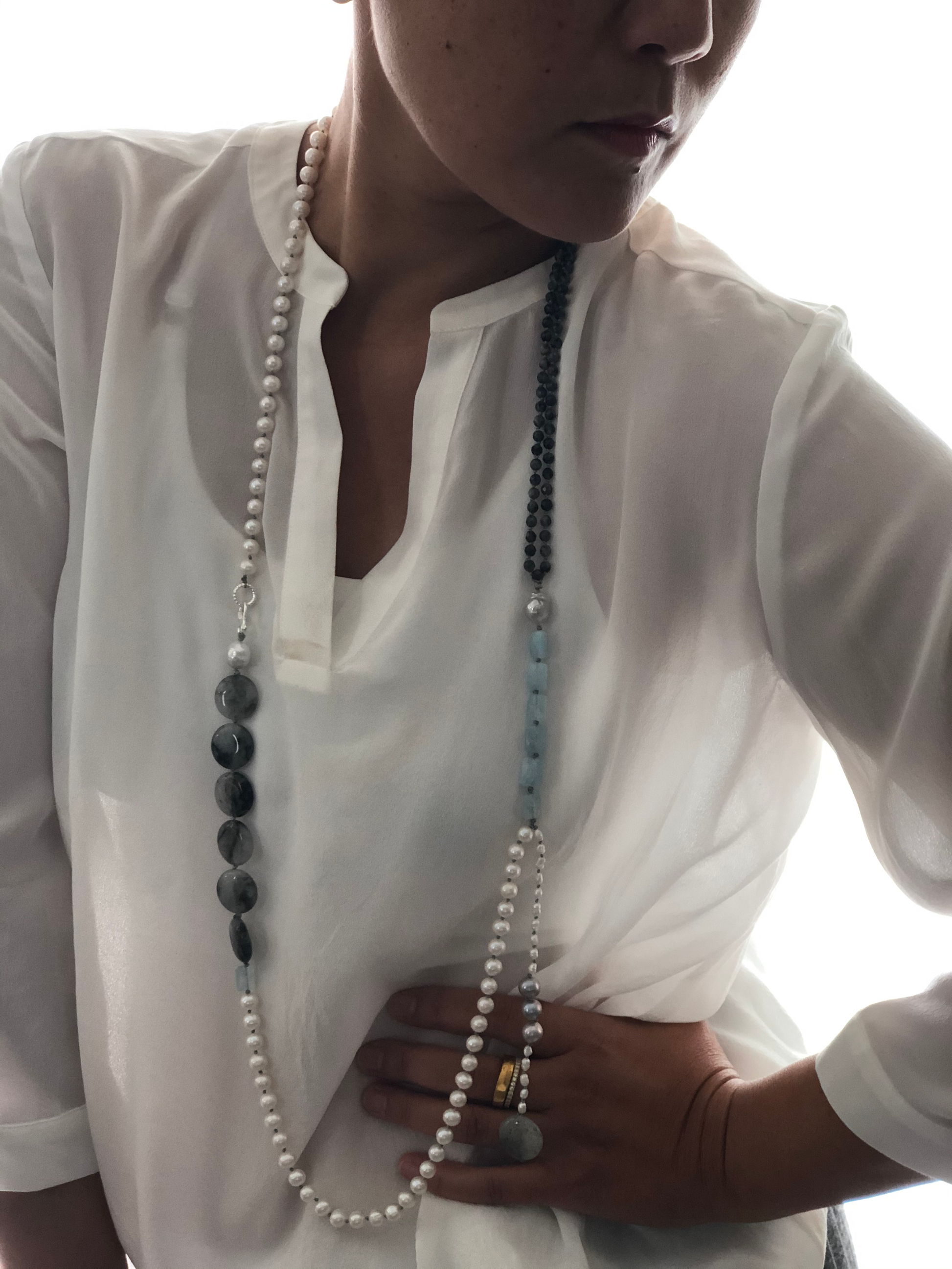 Materials : Aquamarine, fresh water pearl, grey quartz, silver