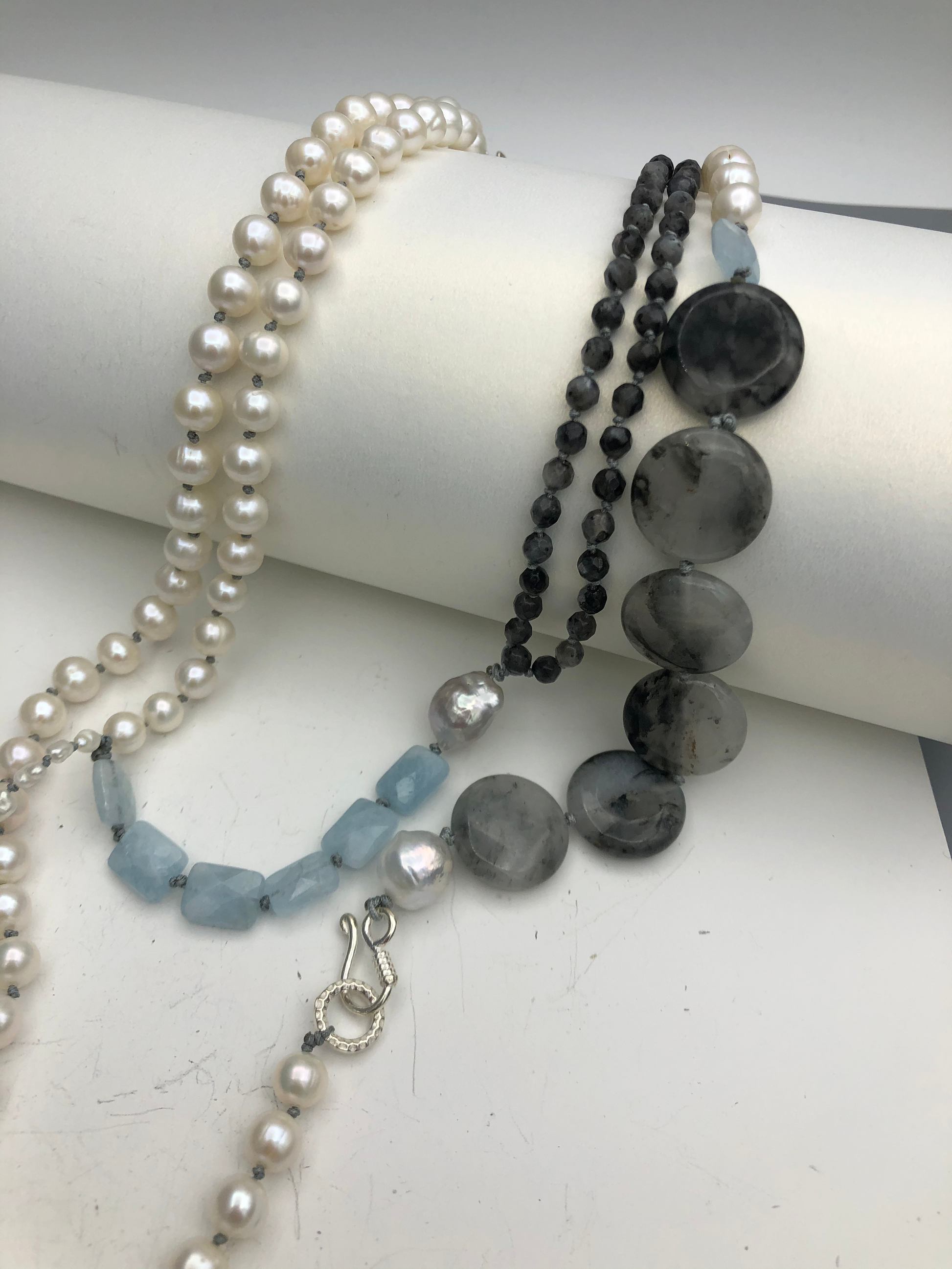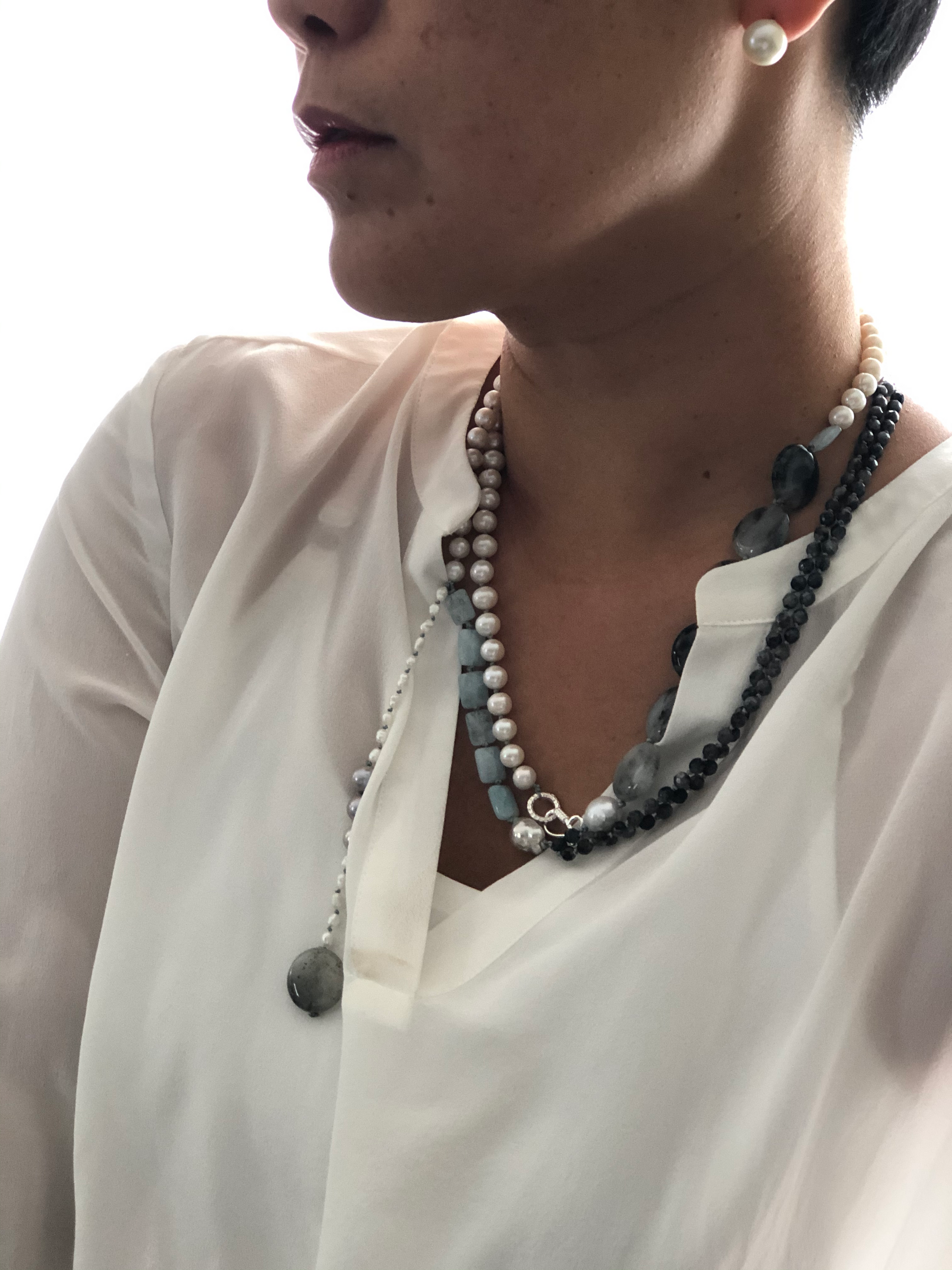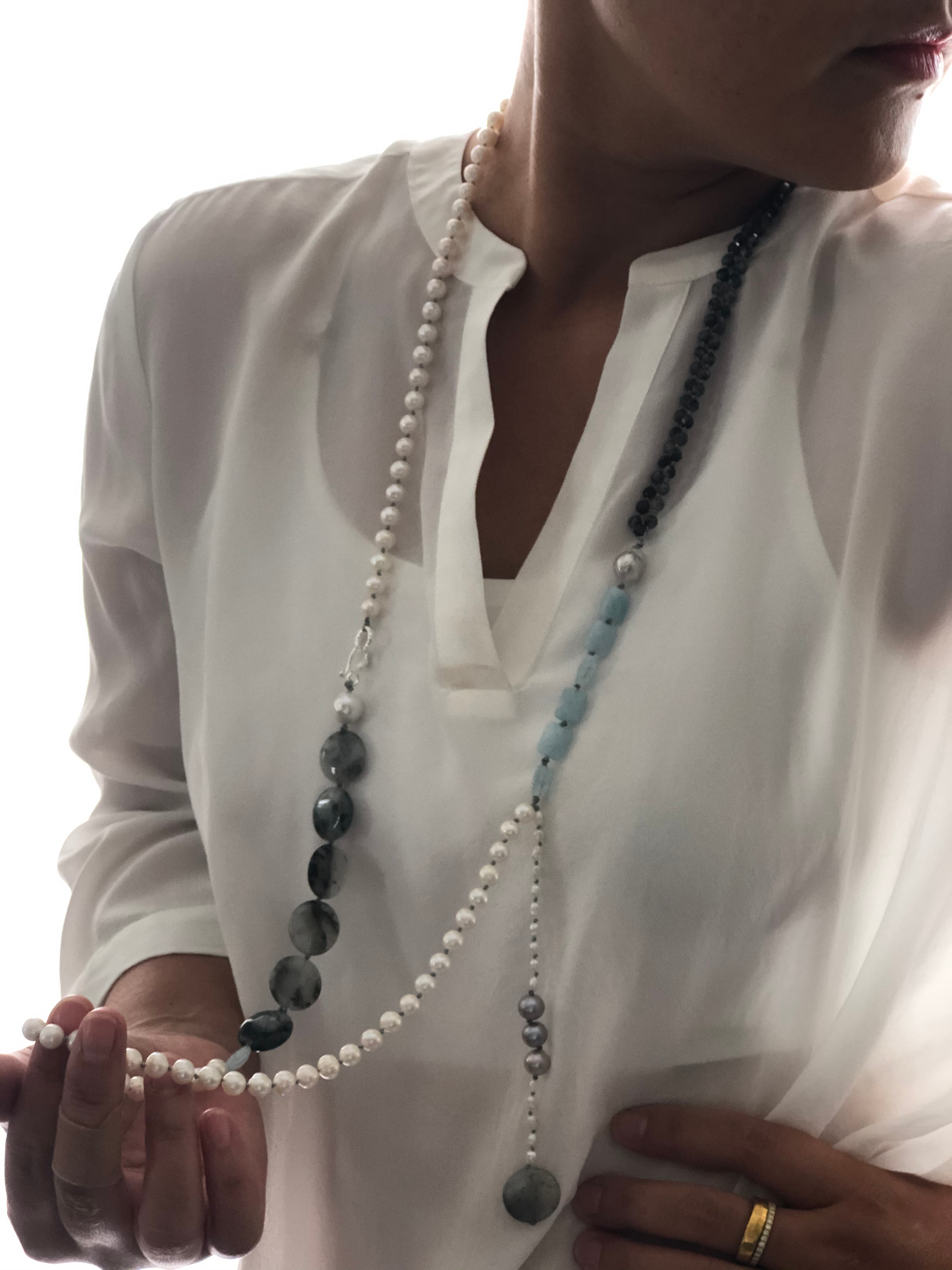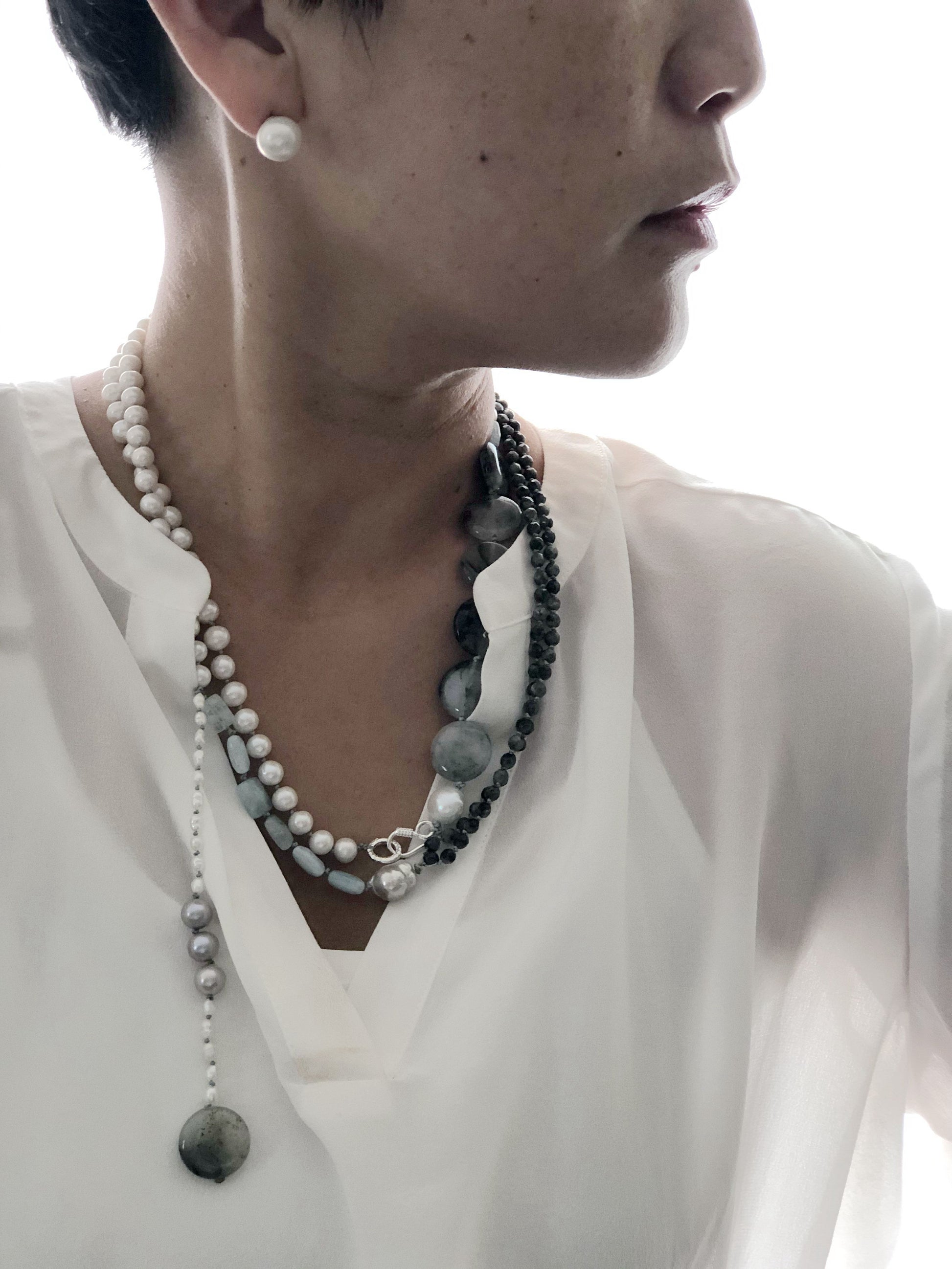 Materials : Aquamarine, fresh water pearl, grey quartz, silver
