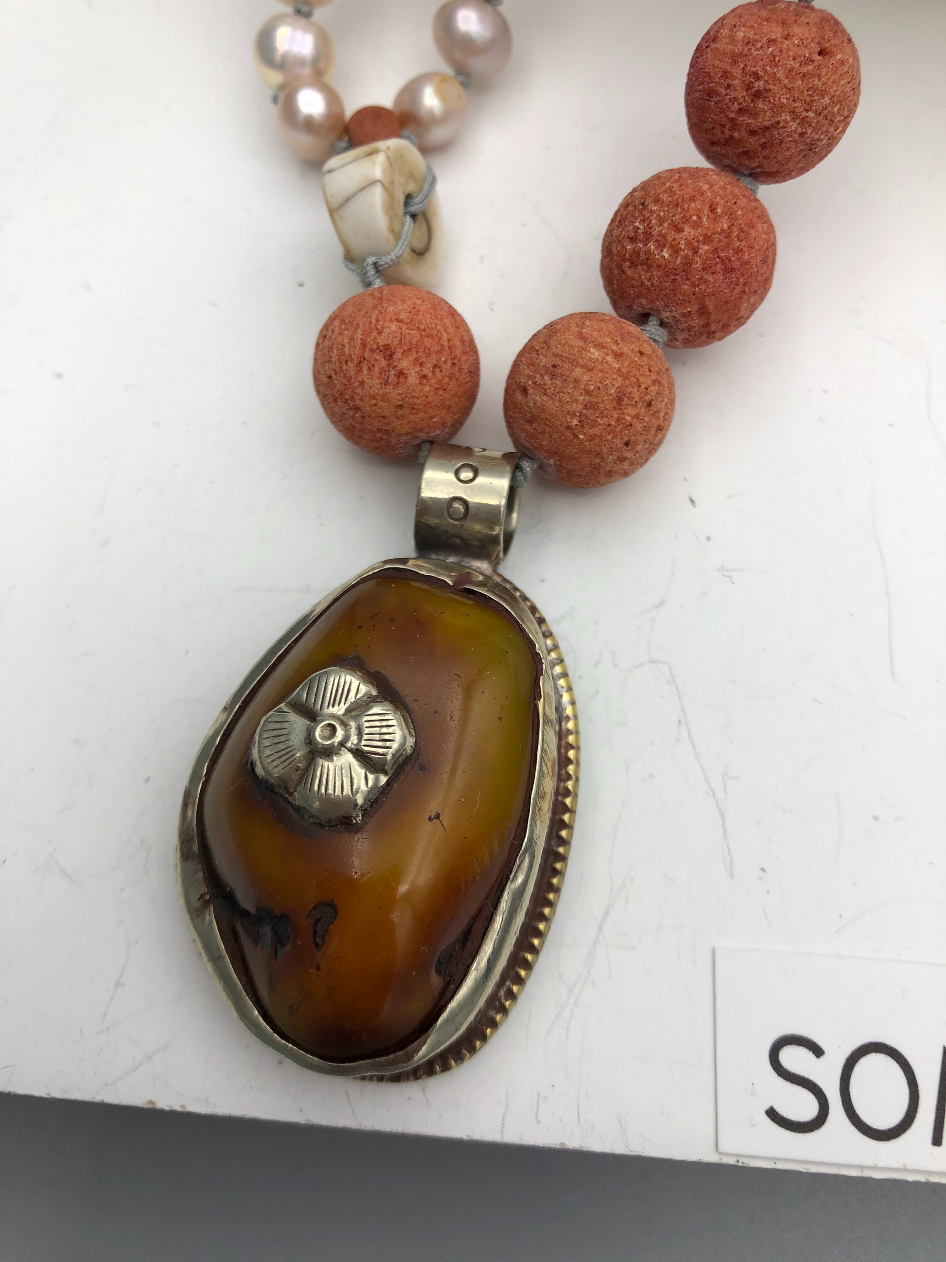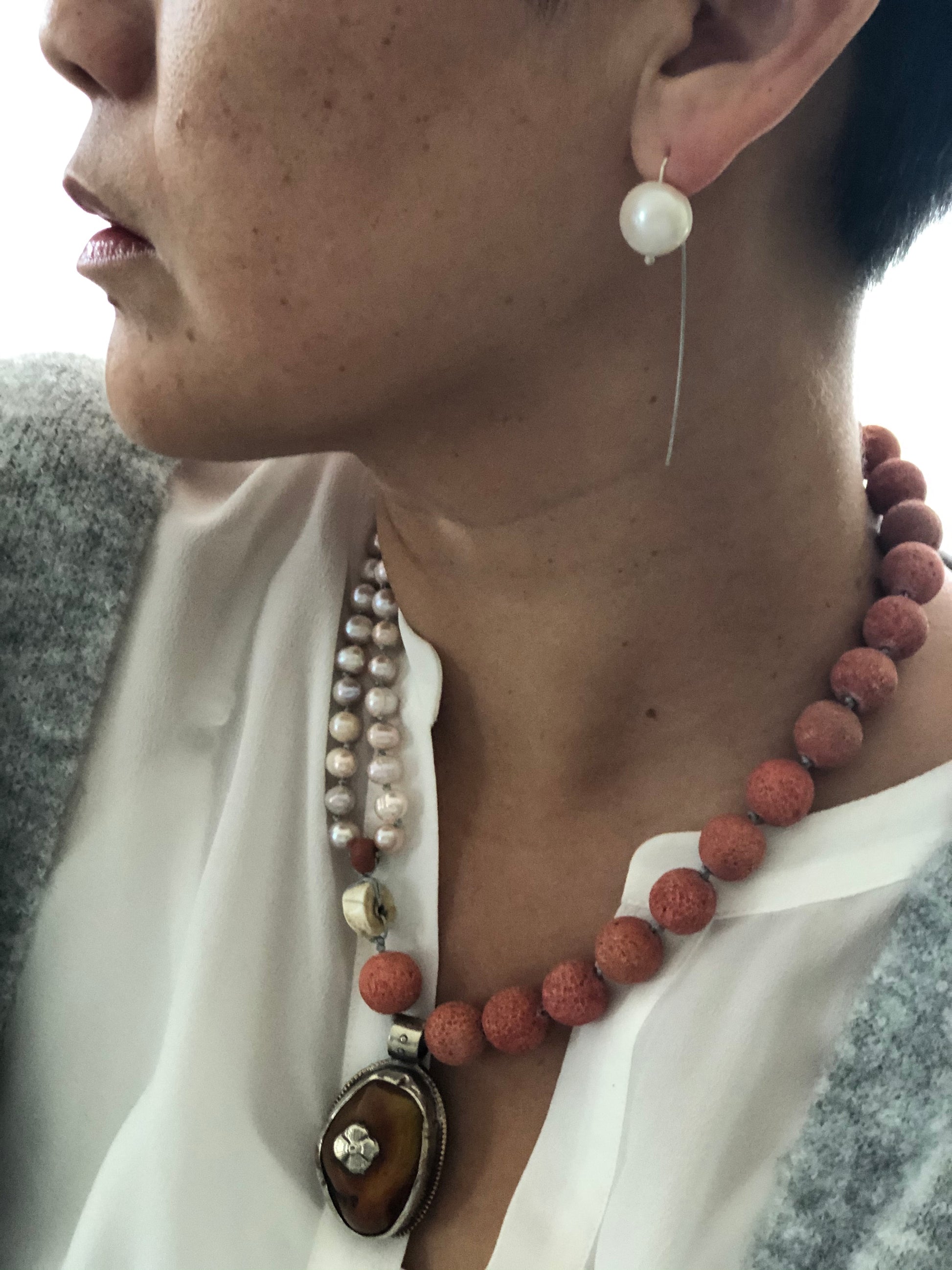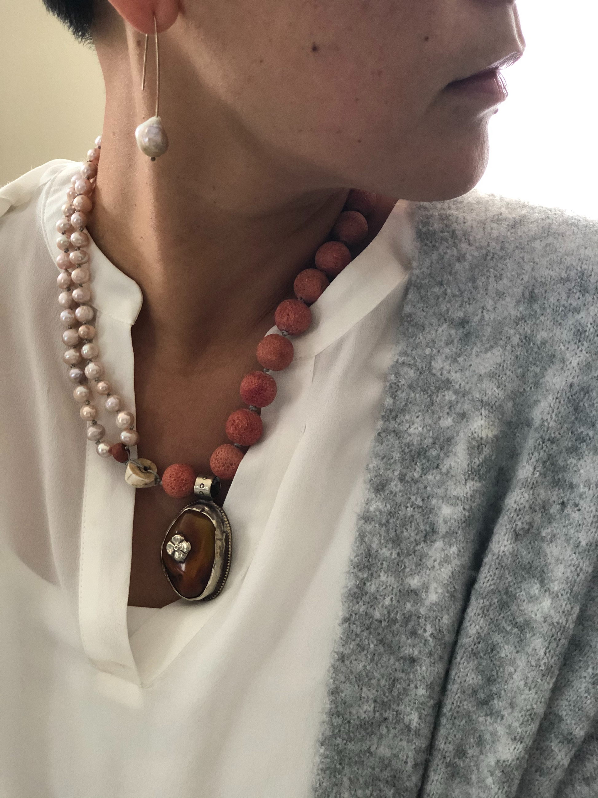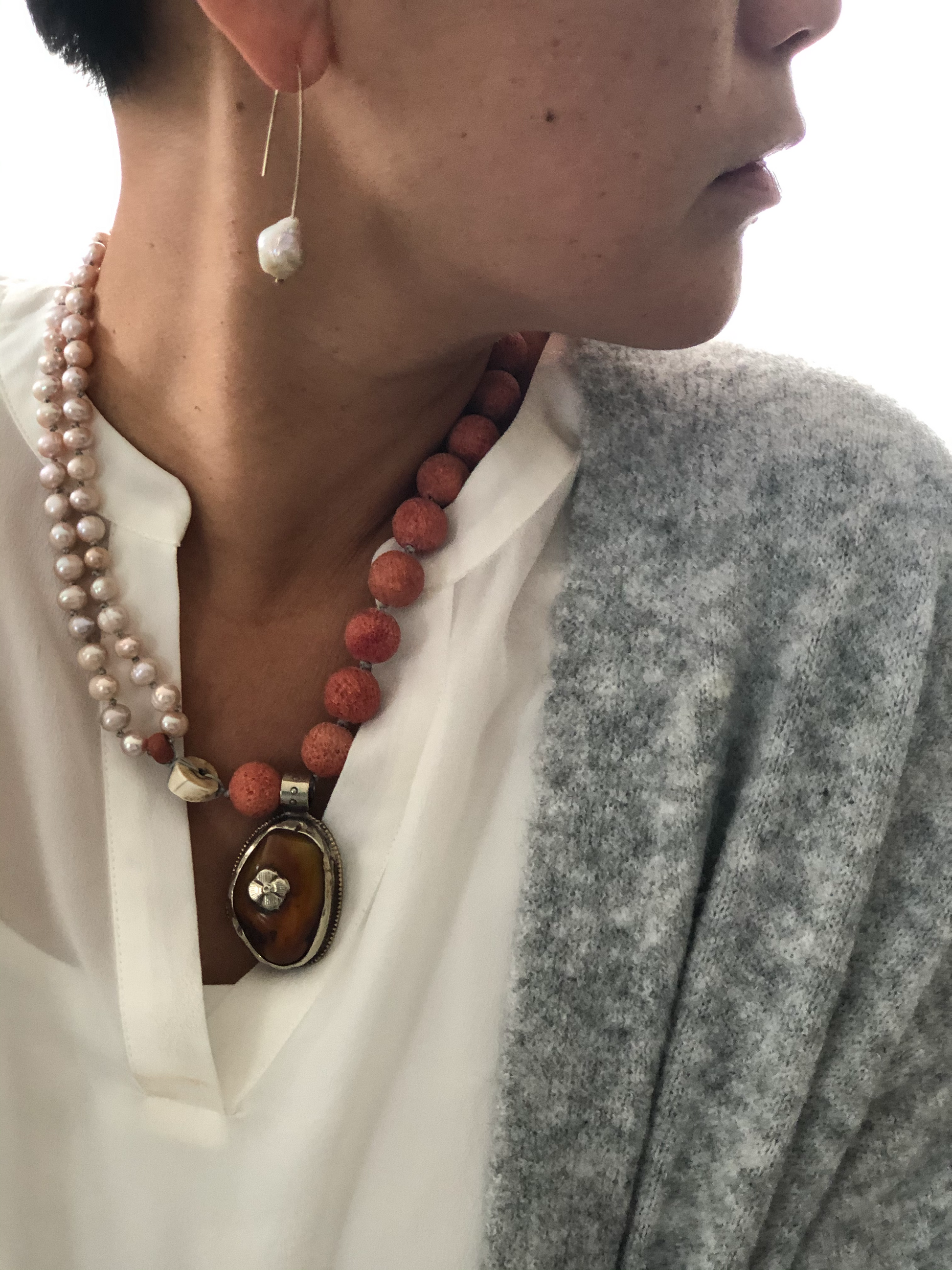 Materials : Sponge coral, fresh water pearl, old Tibetan pendent