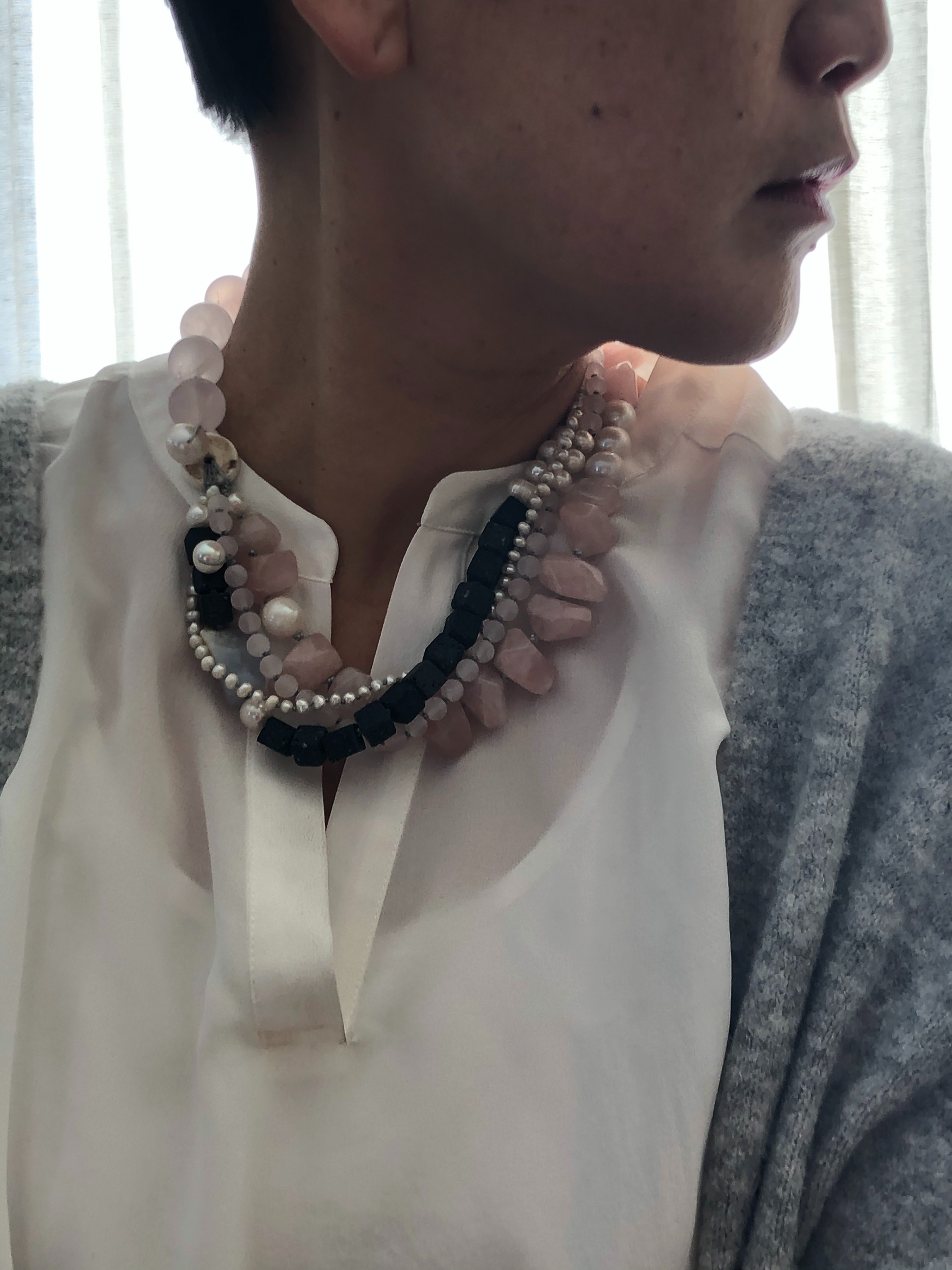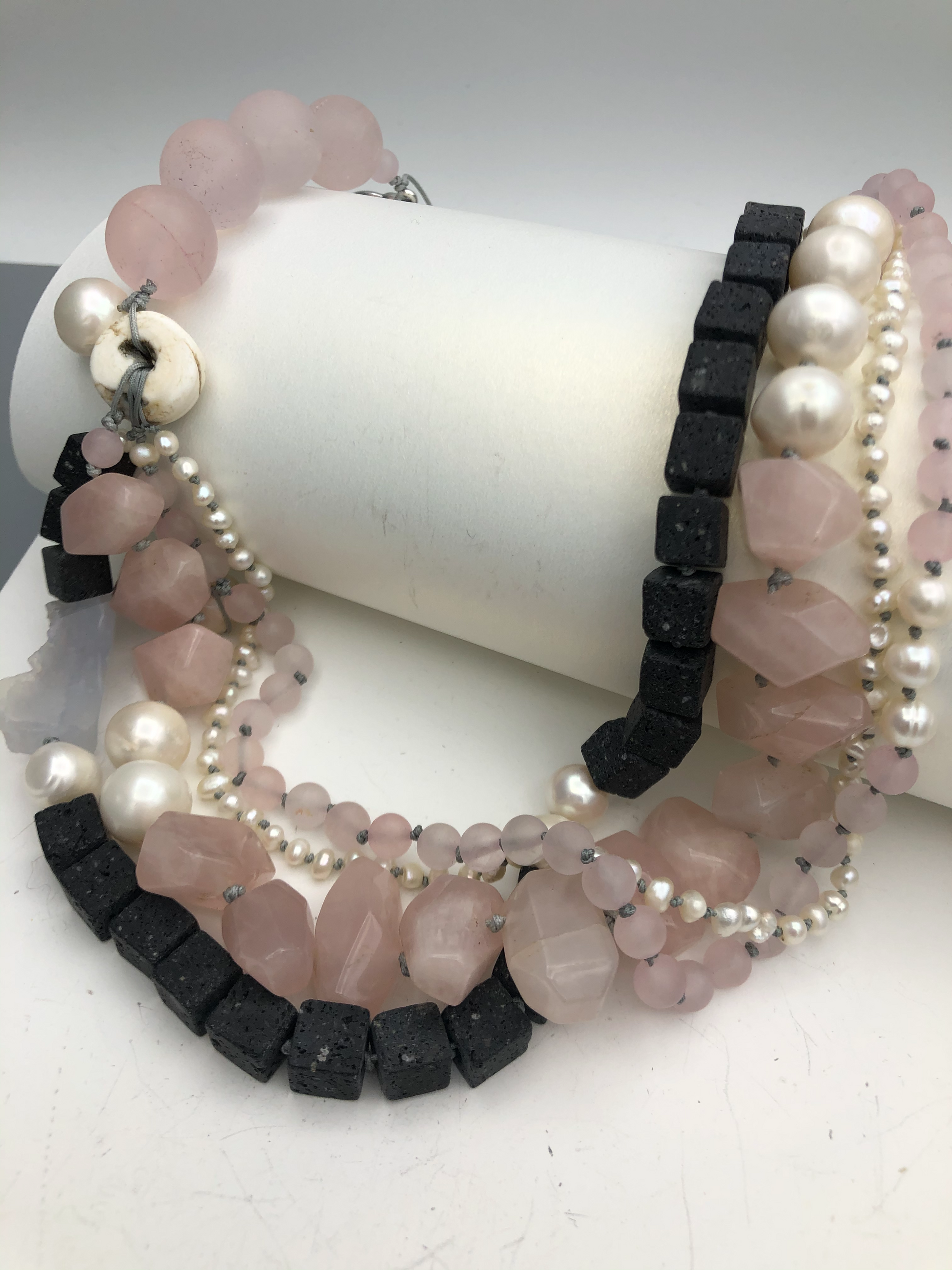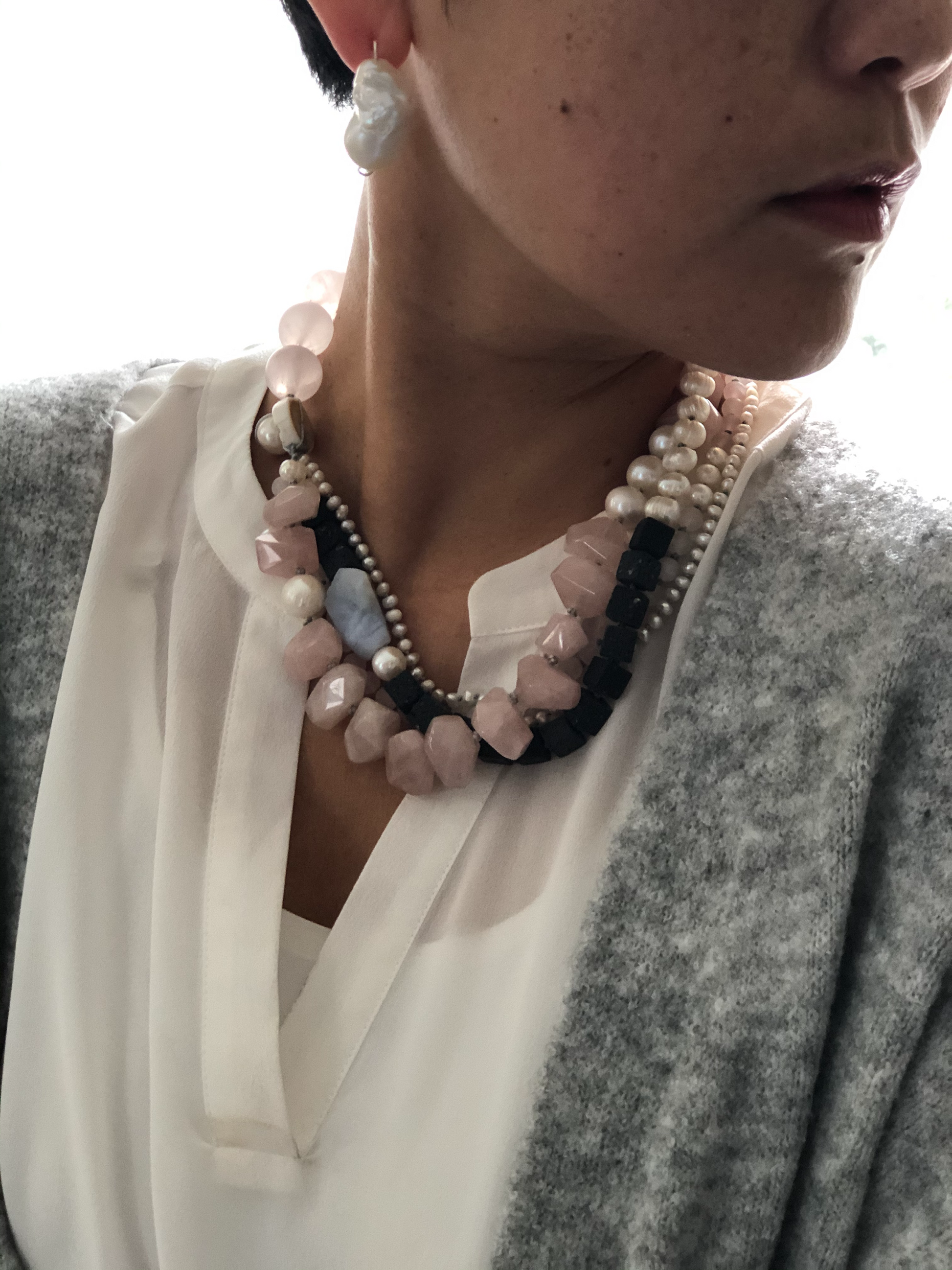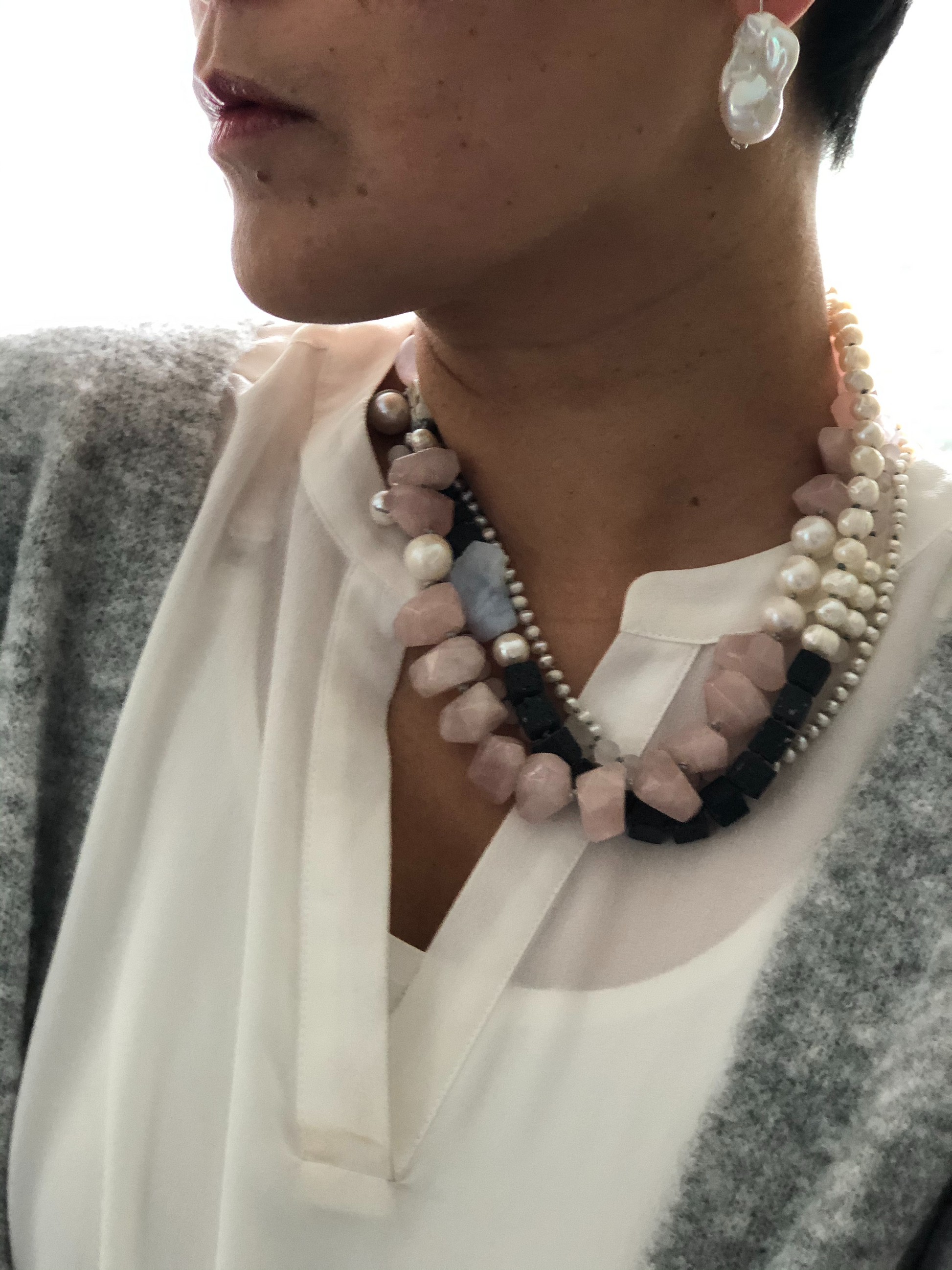 Materials : Rose quartz, lava, fresh water pearl, blue lace agate