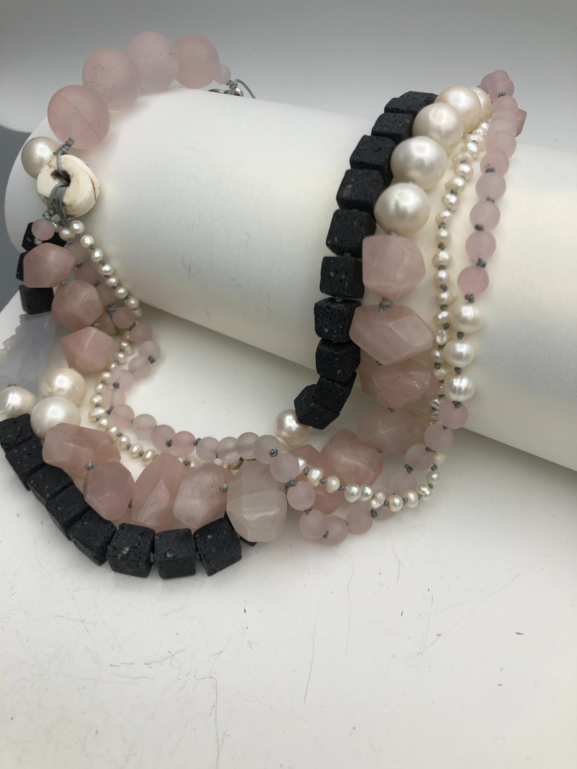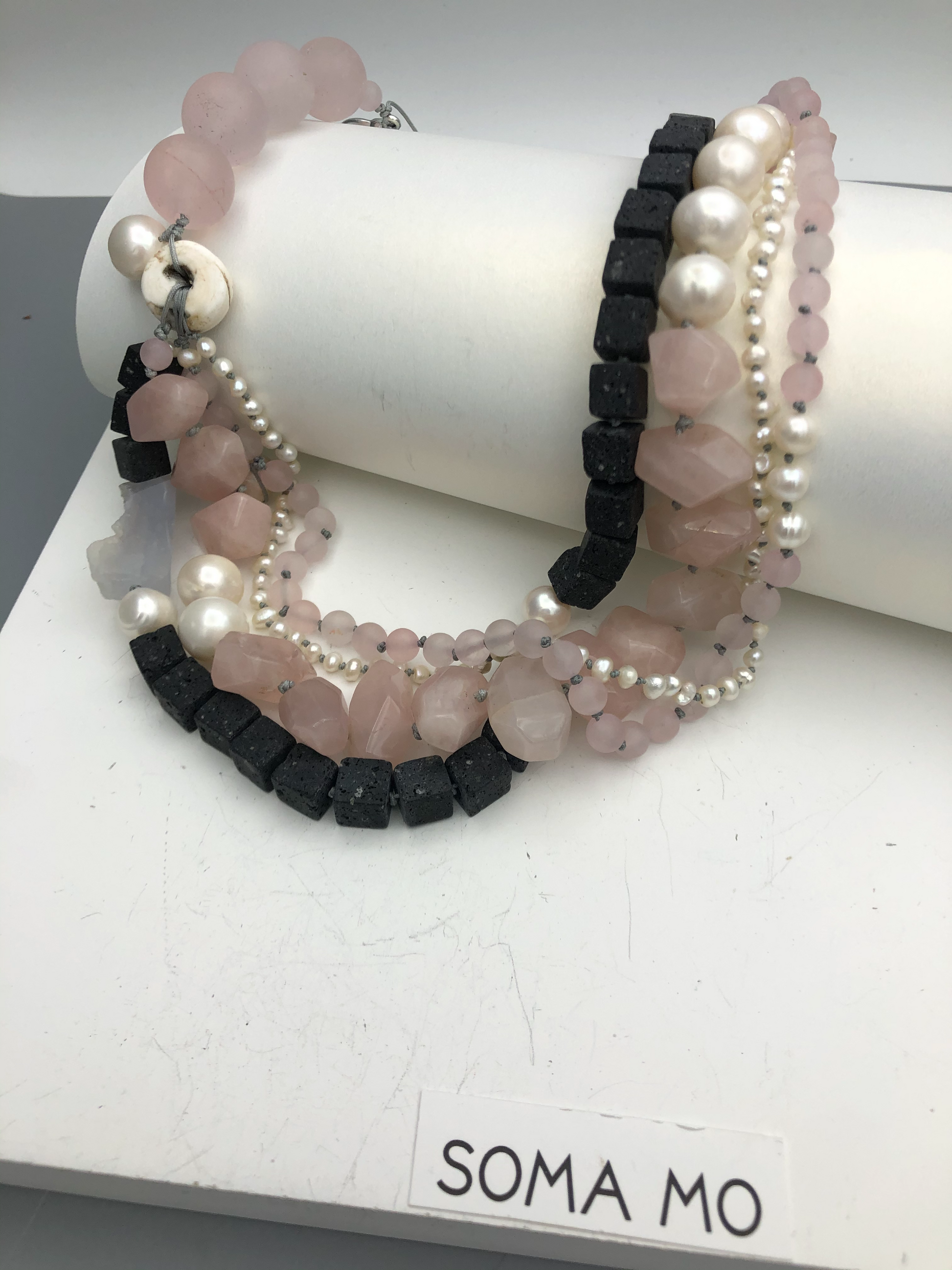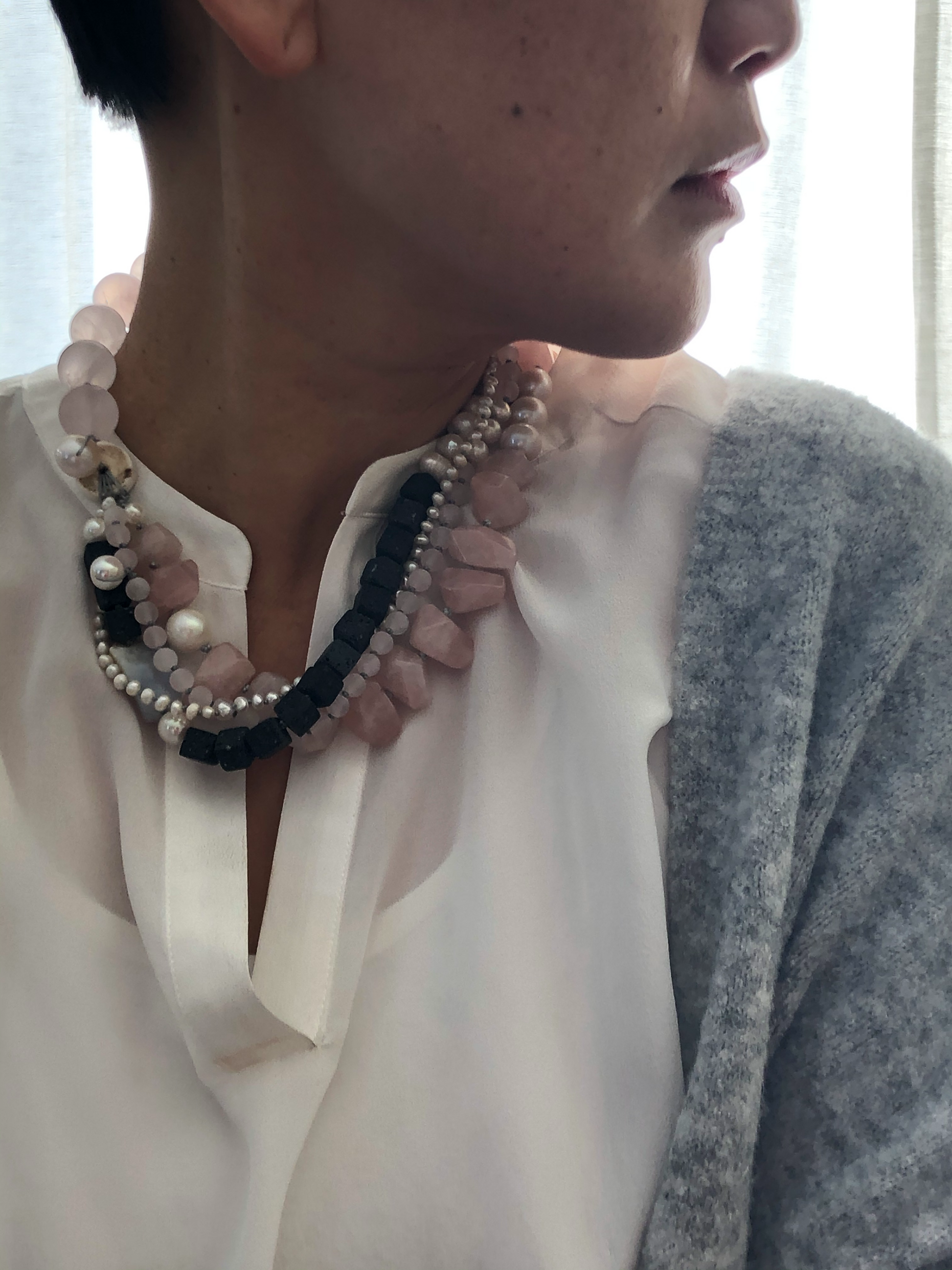 Materials : Rose quartz, lava, fresh water pearl, blue lace agate