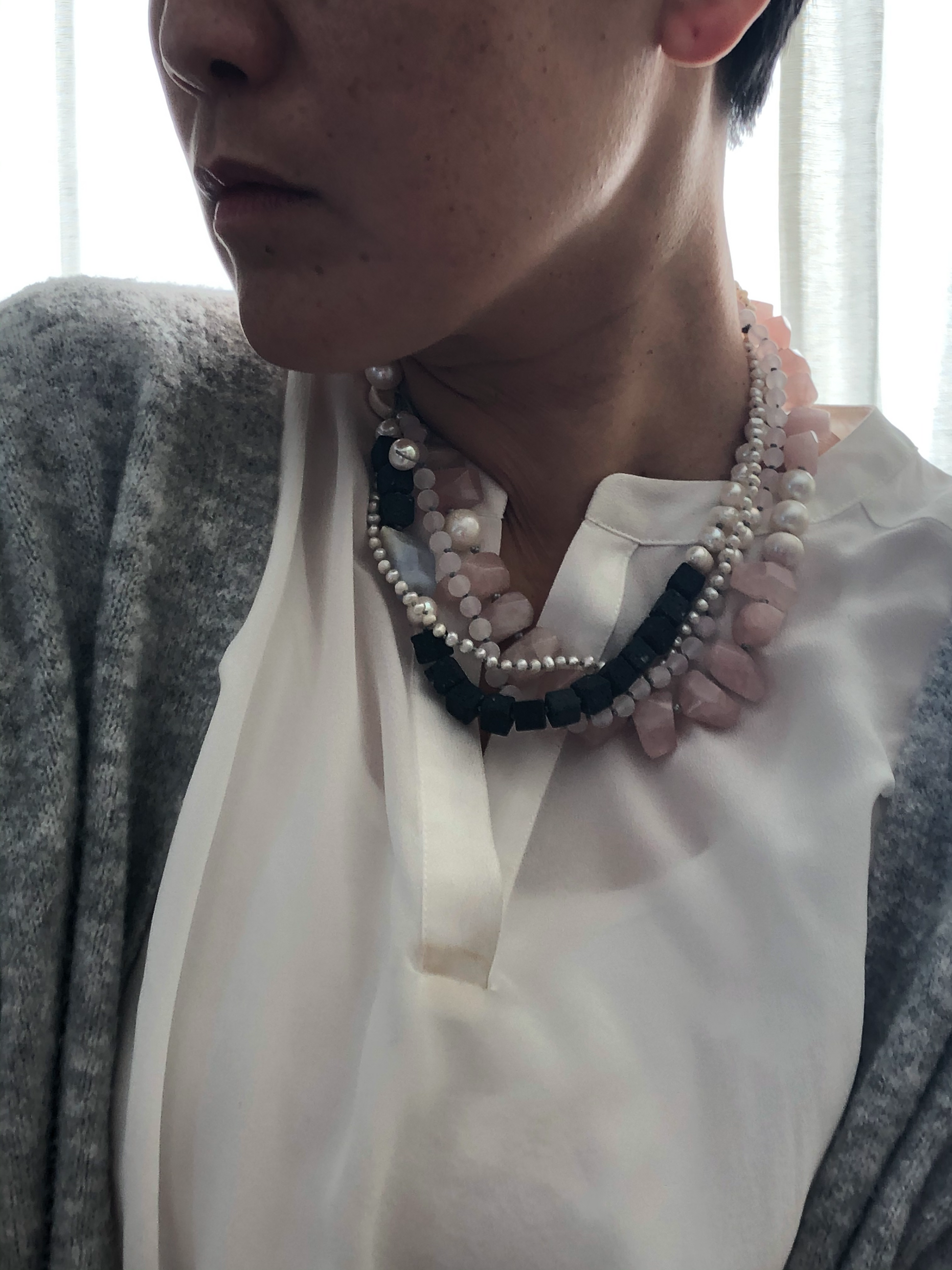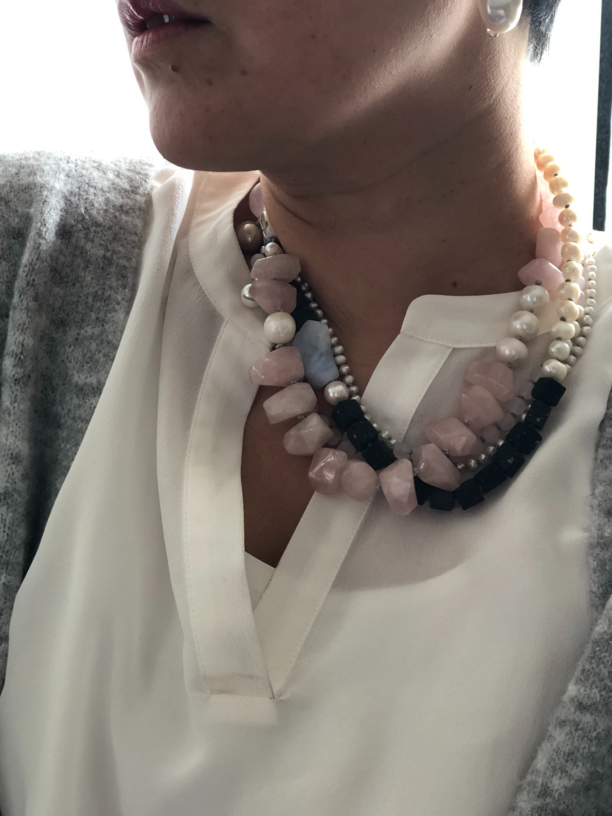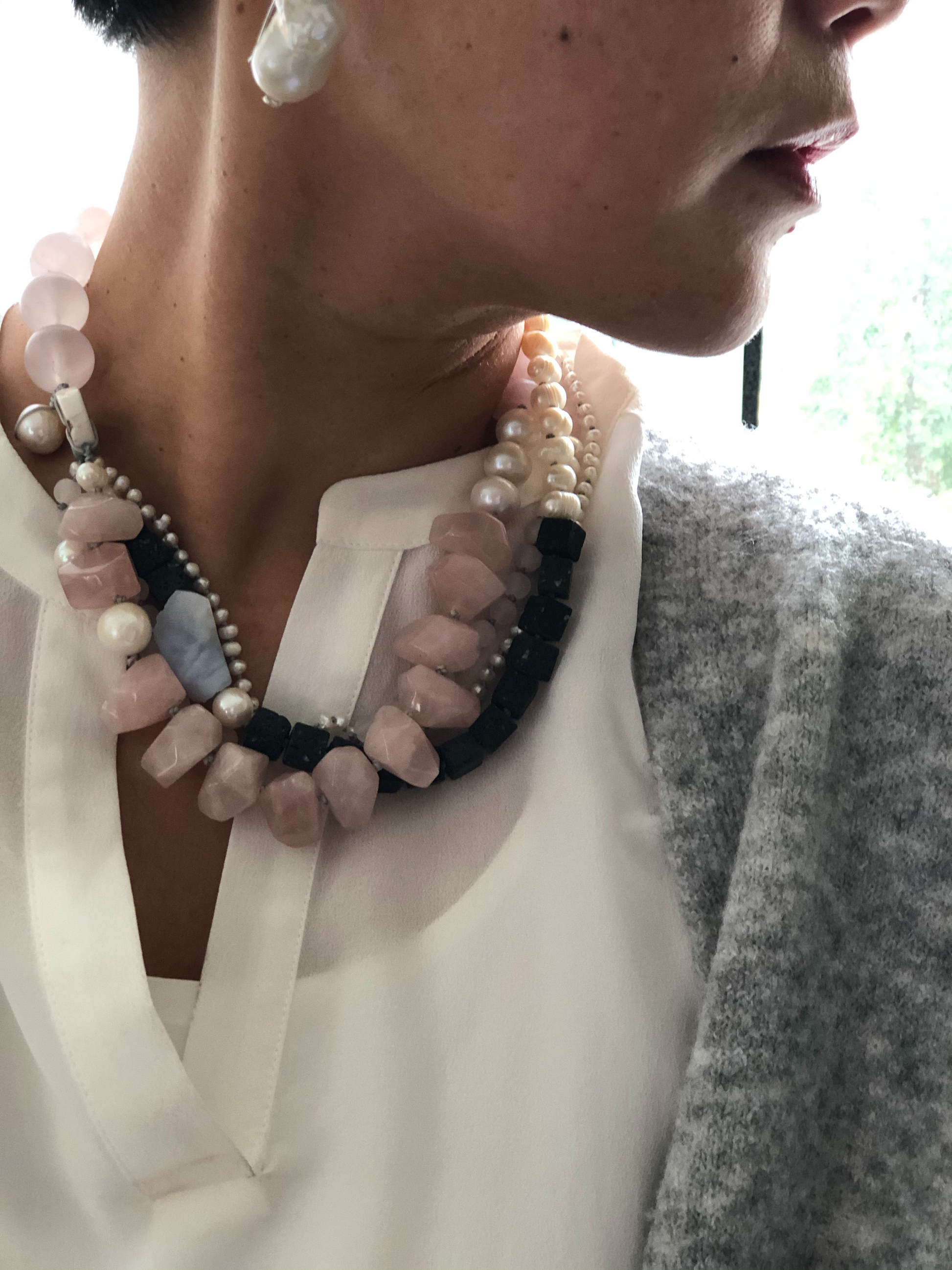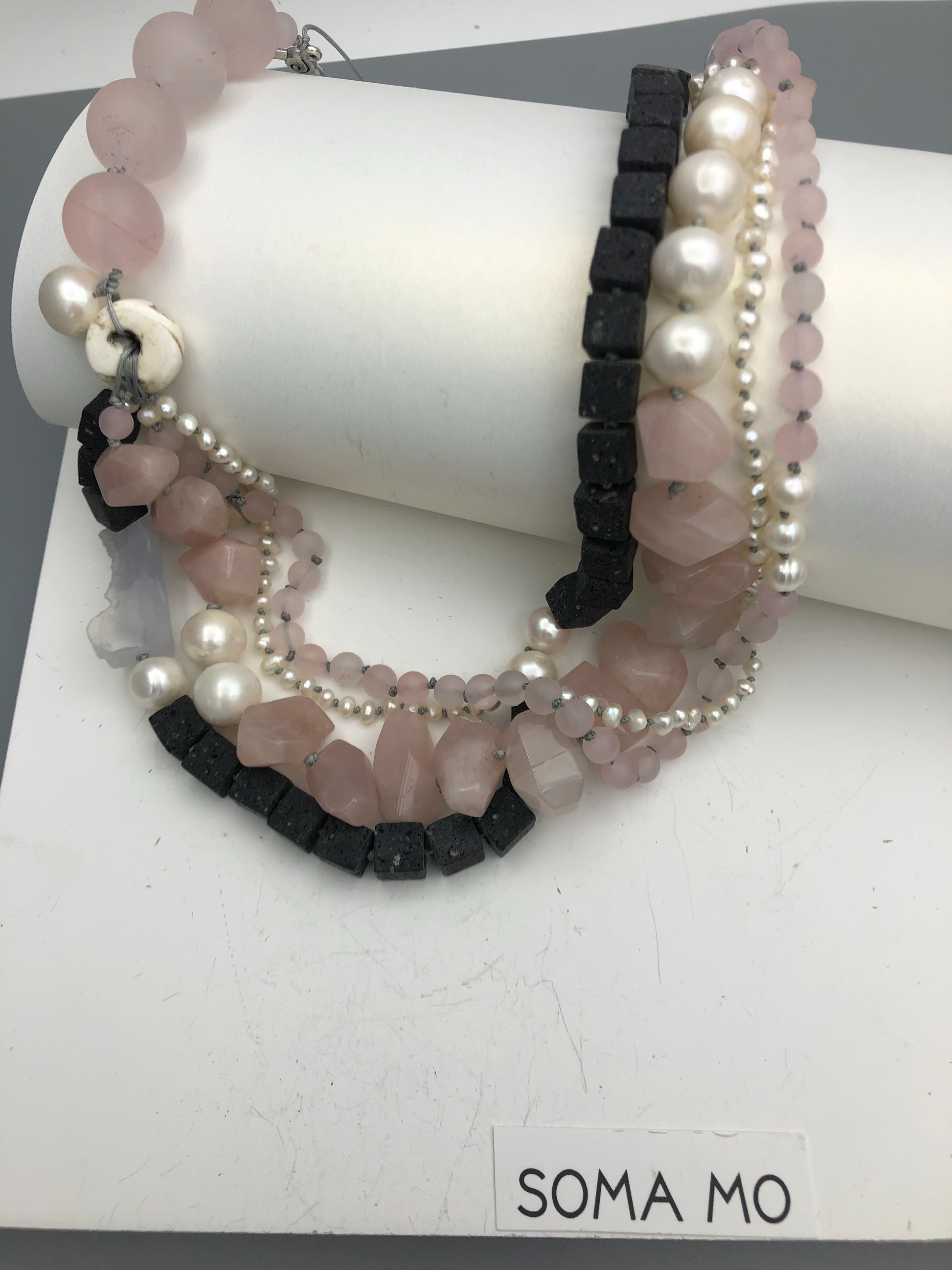 Materials : Rose quartz, lava, fresh water pearl, blue lace agate