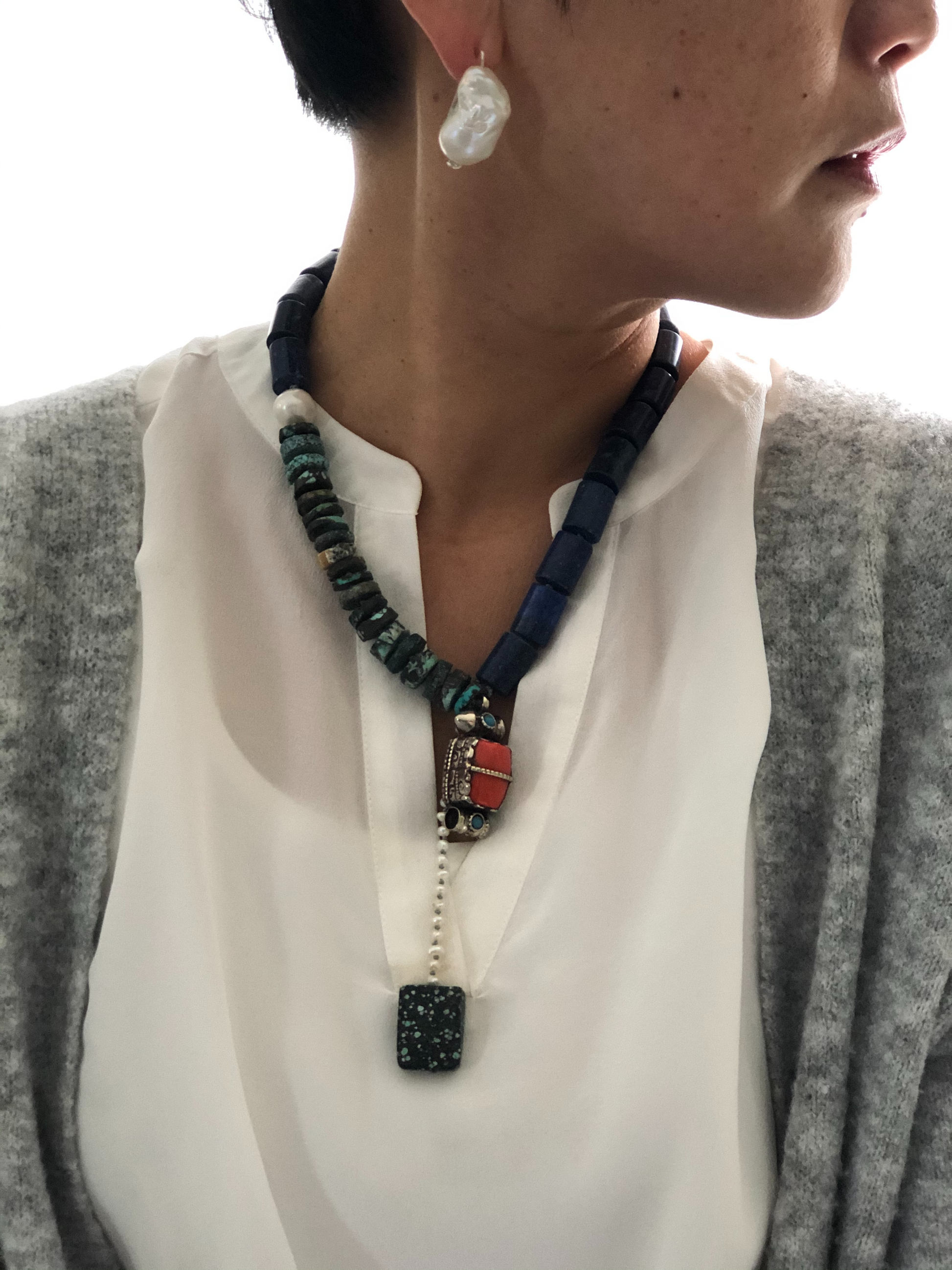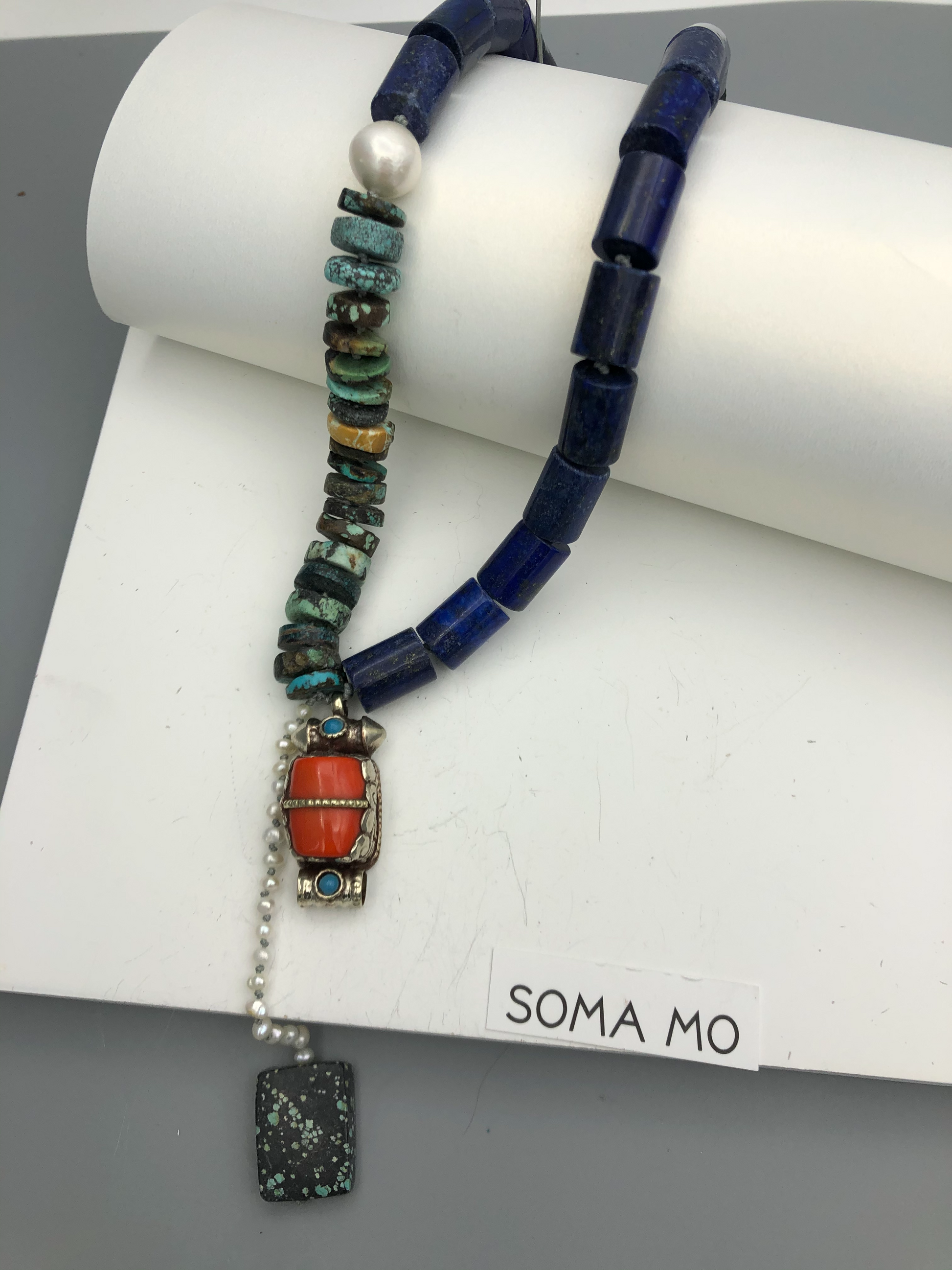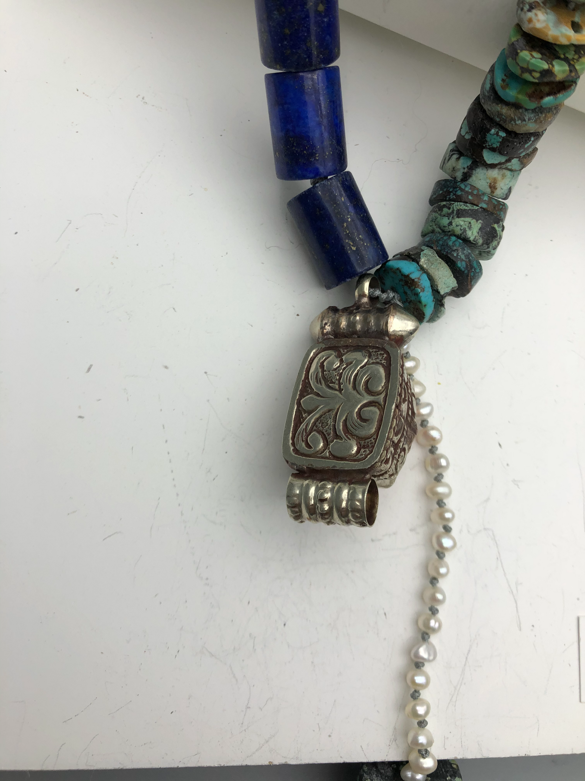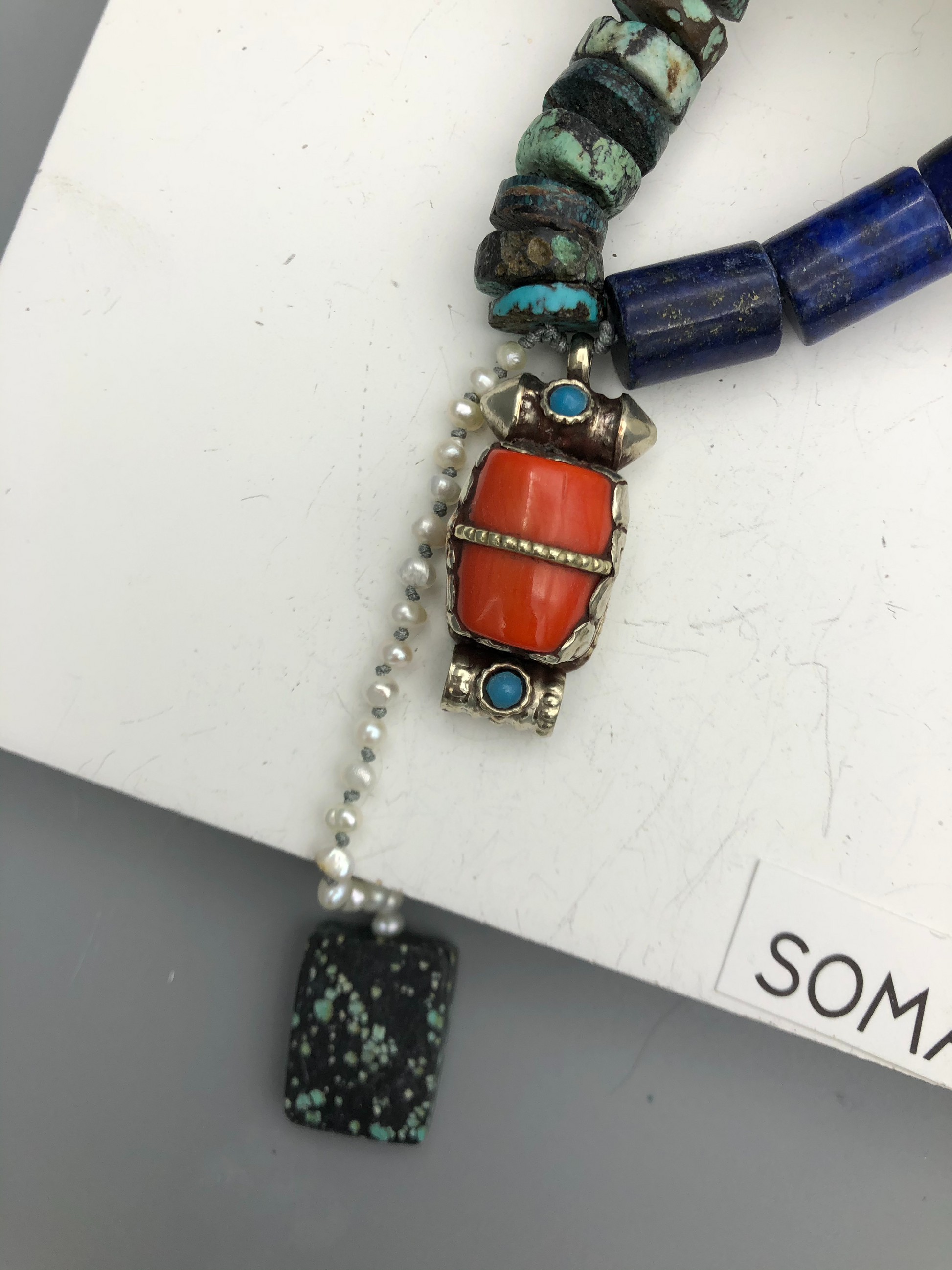 Materials : Lapis , tequoise, fresh water pearl, Tibetan silver pendent with coral
