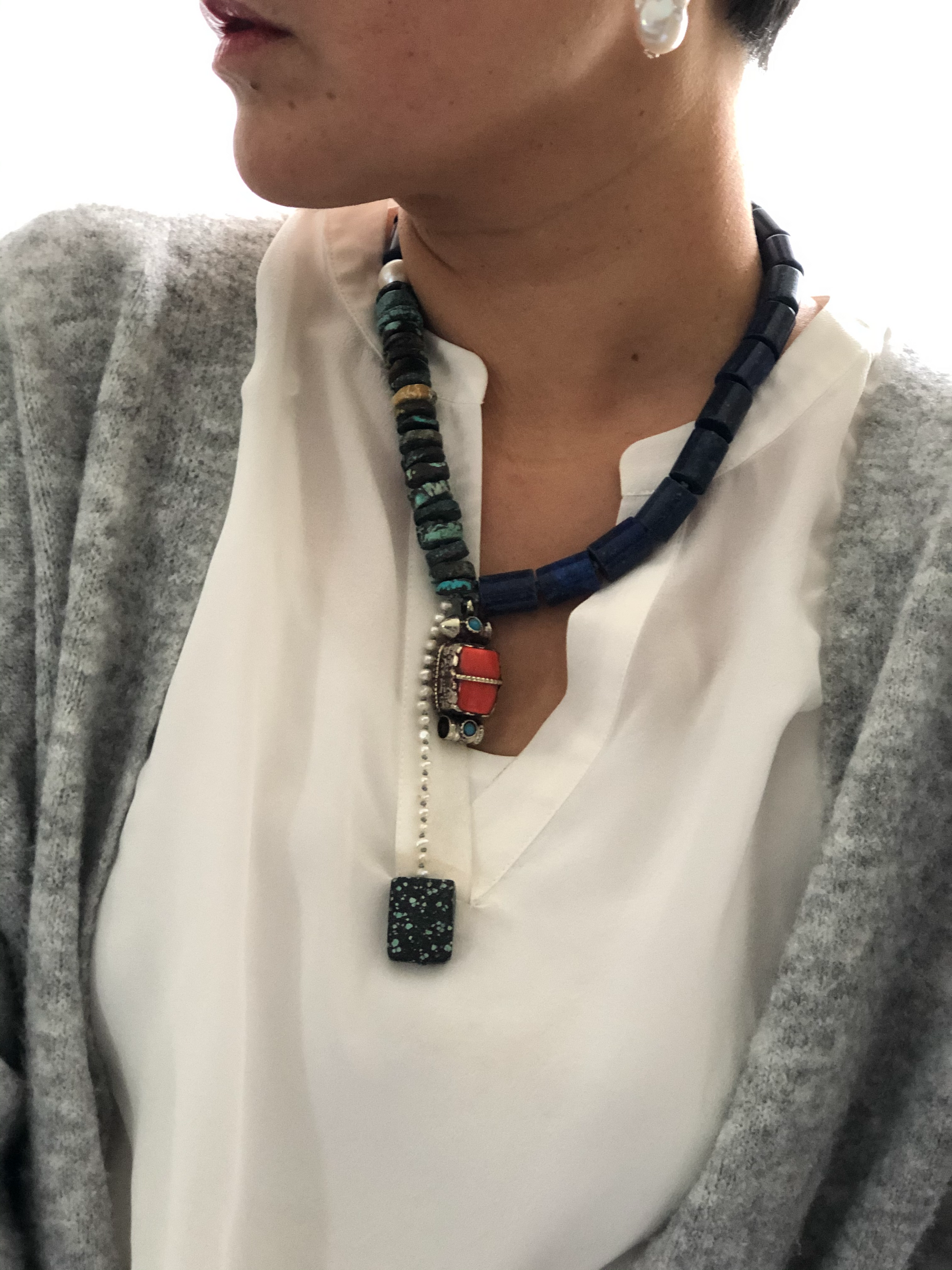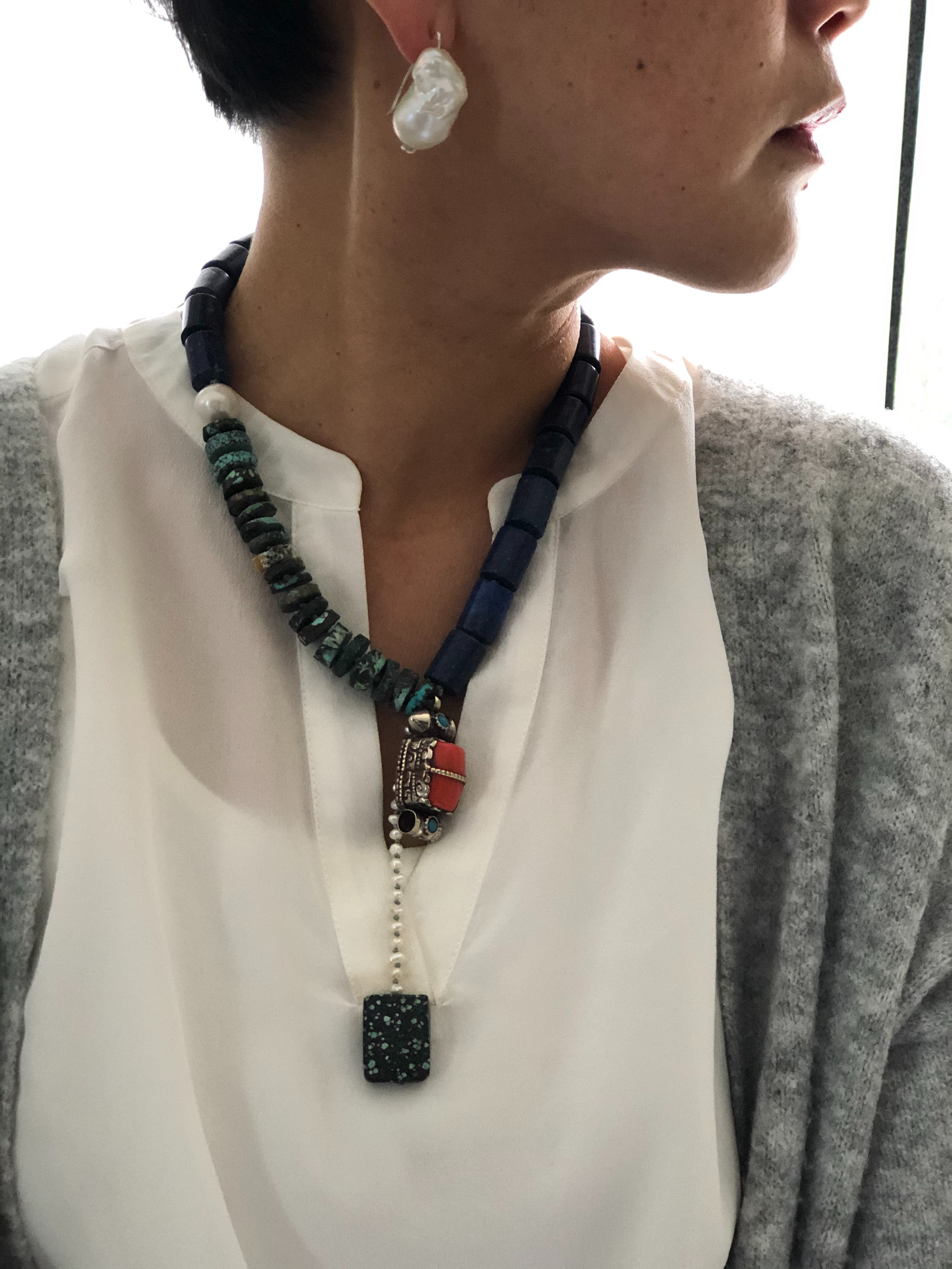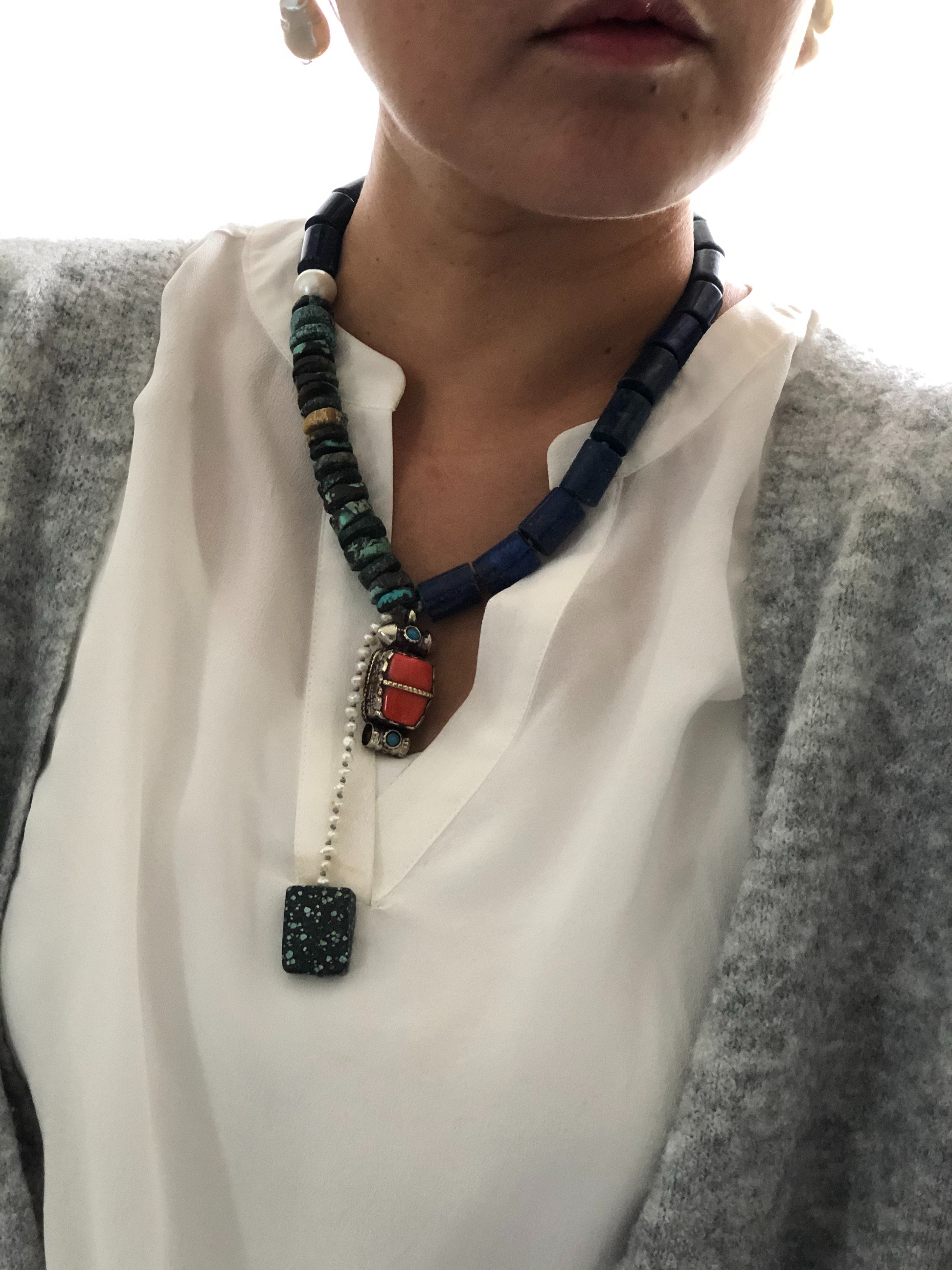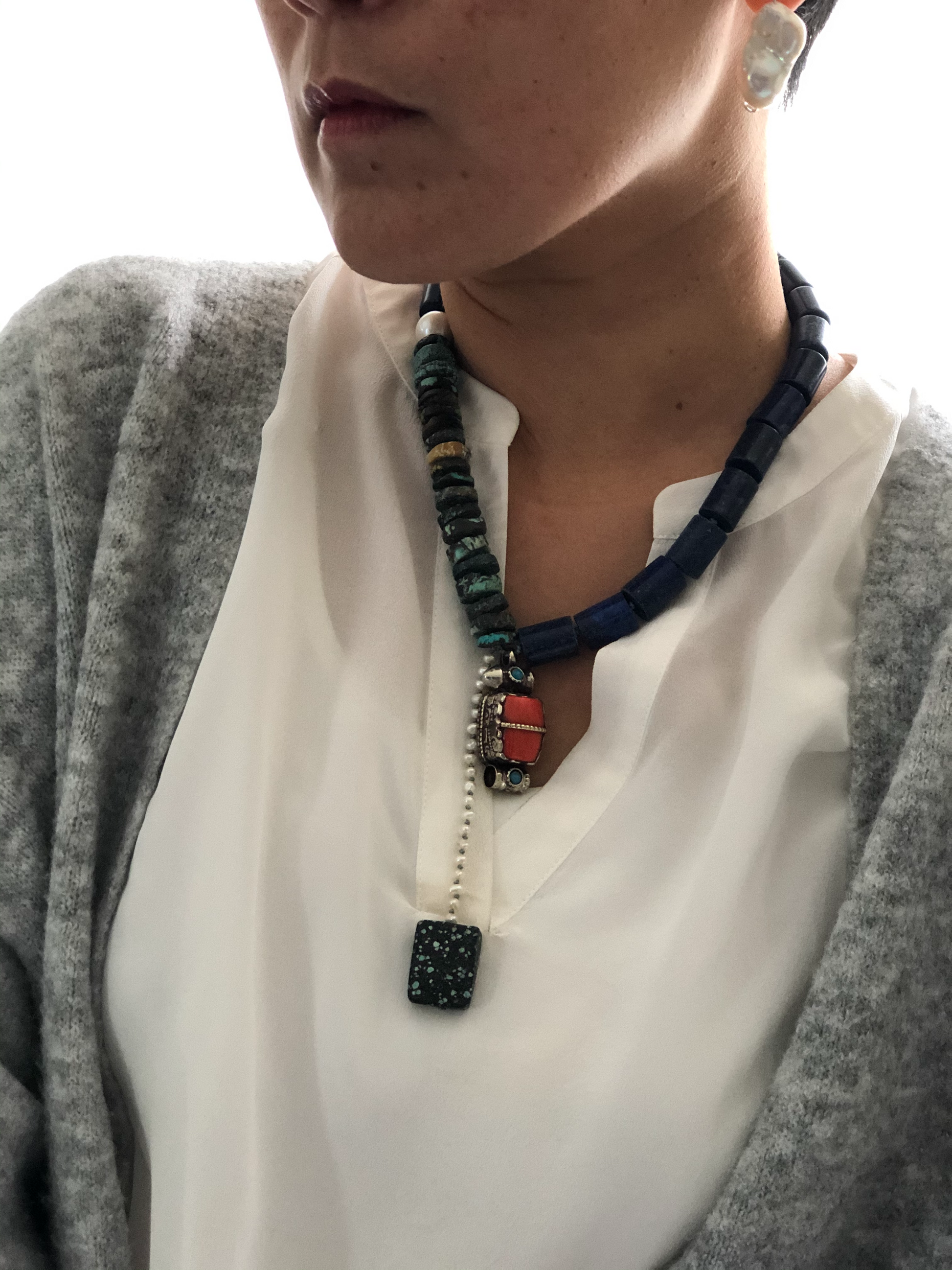 Materials : Lapis , tequoise, fresh water pearl, Tibetan silver pendent with coral