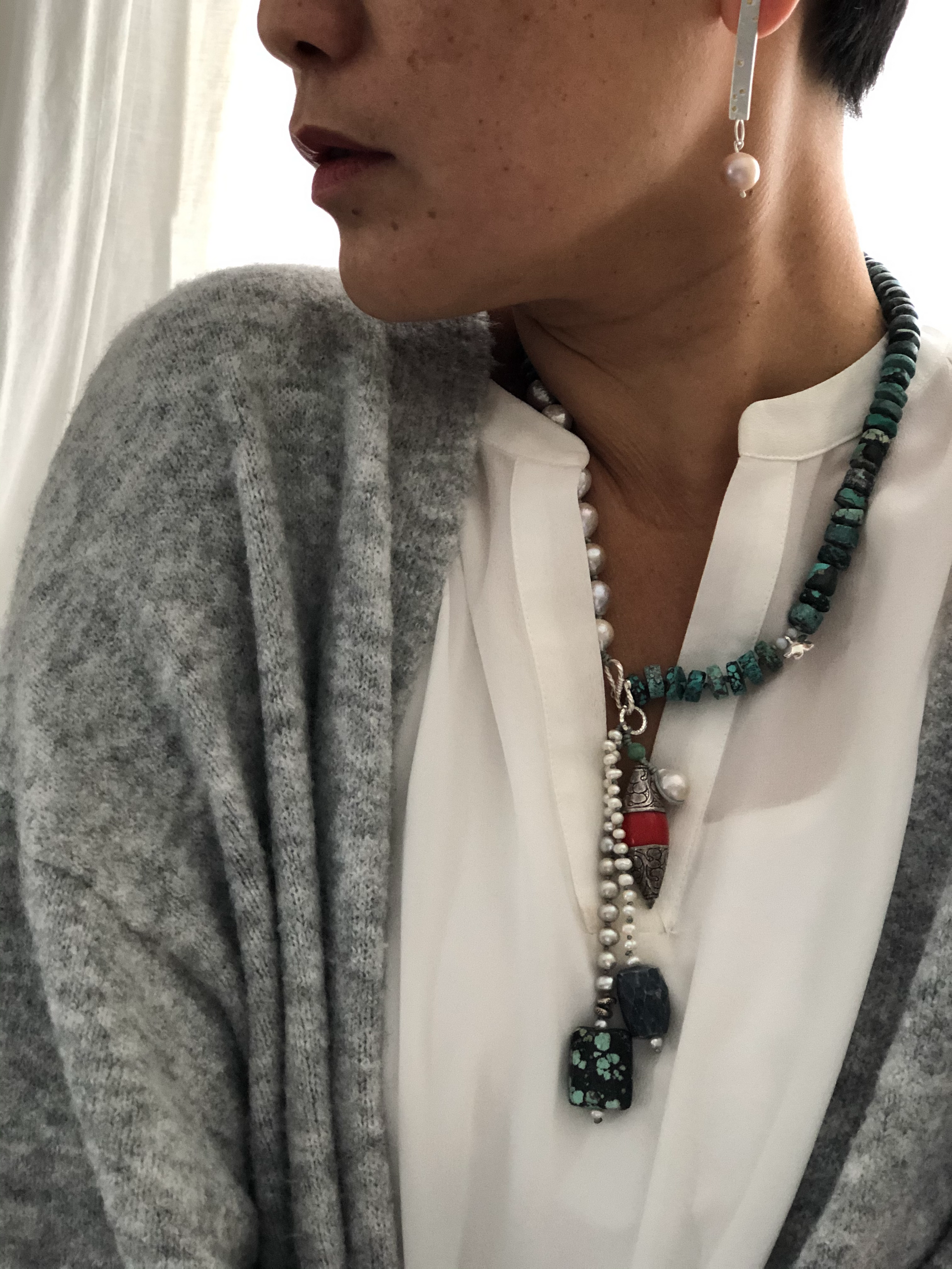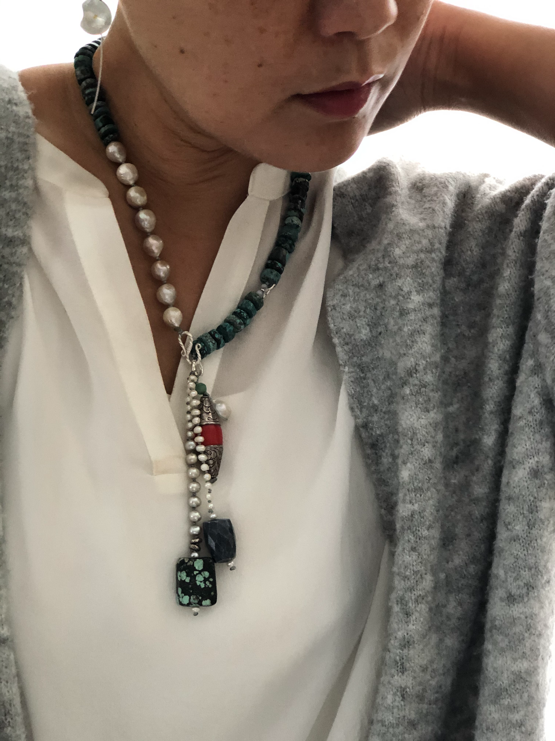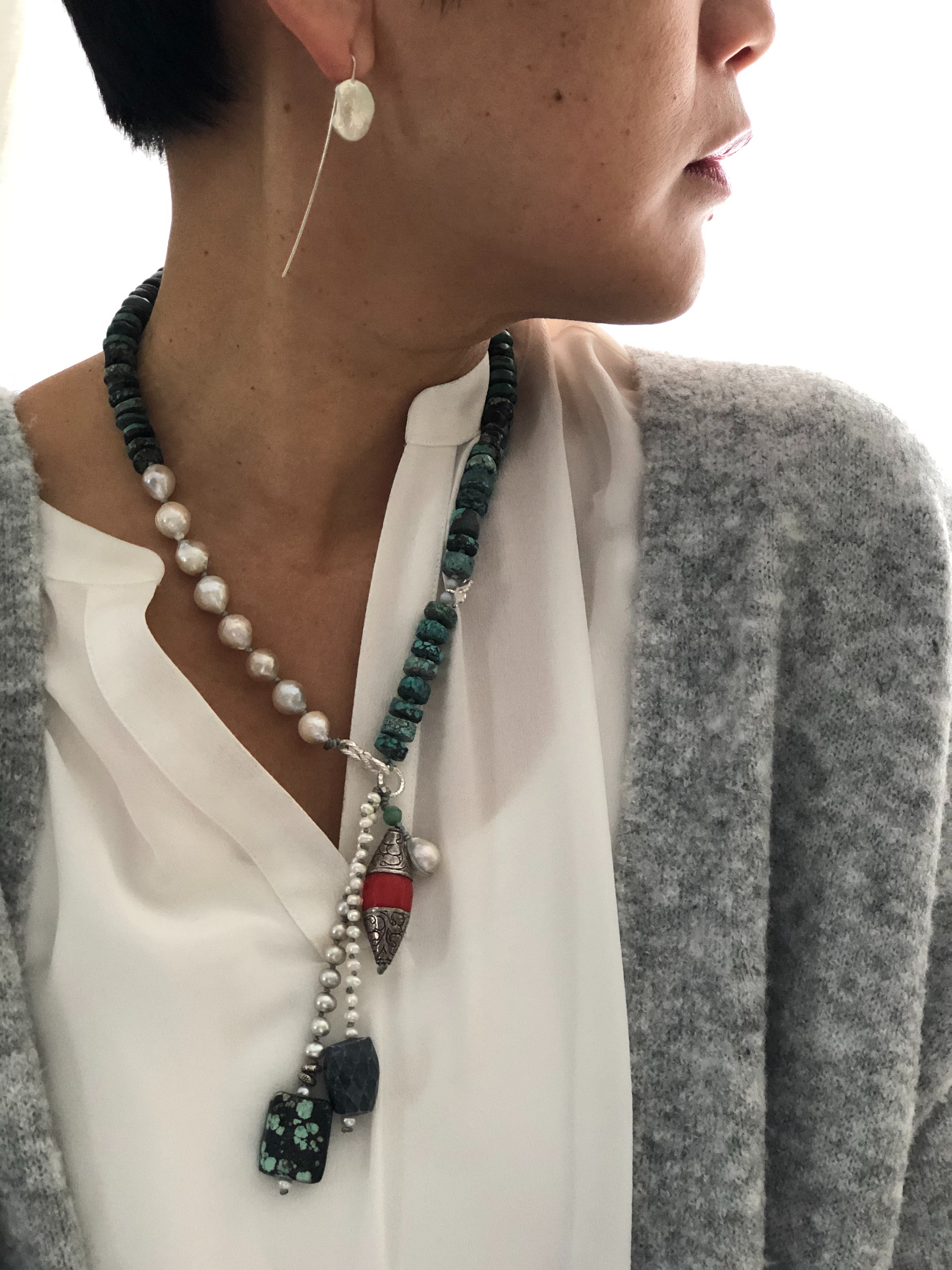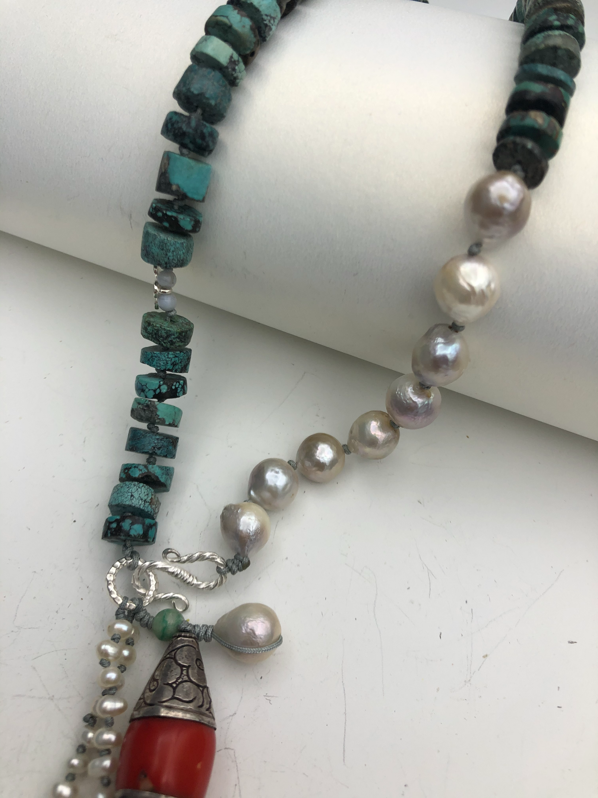 Materials : Tequoise, Tibetan silver pendent with coral, fresh water pearl