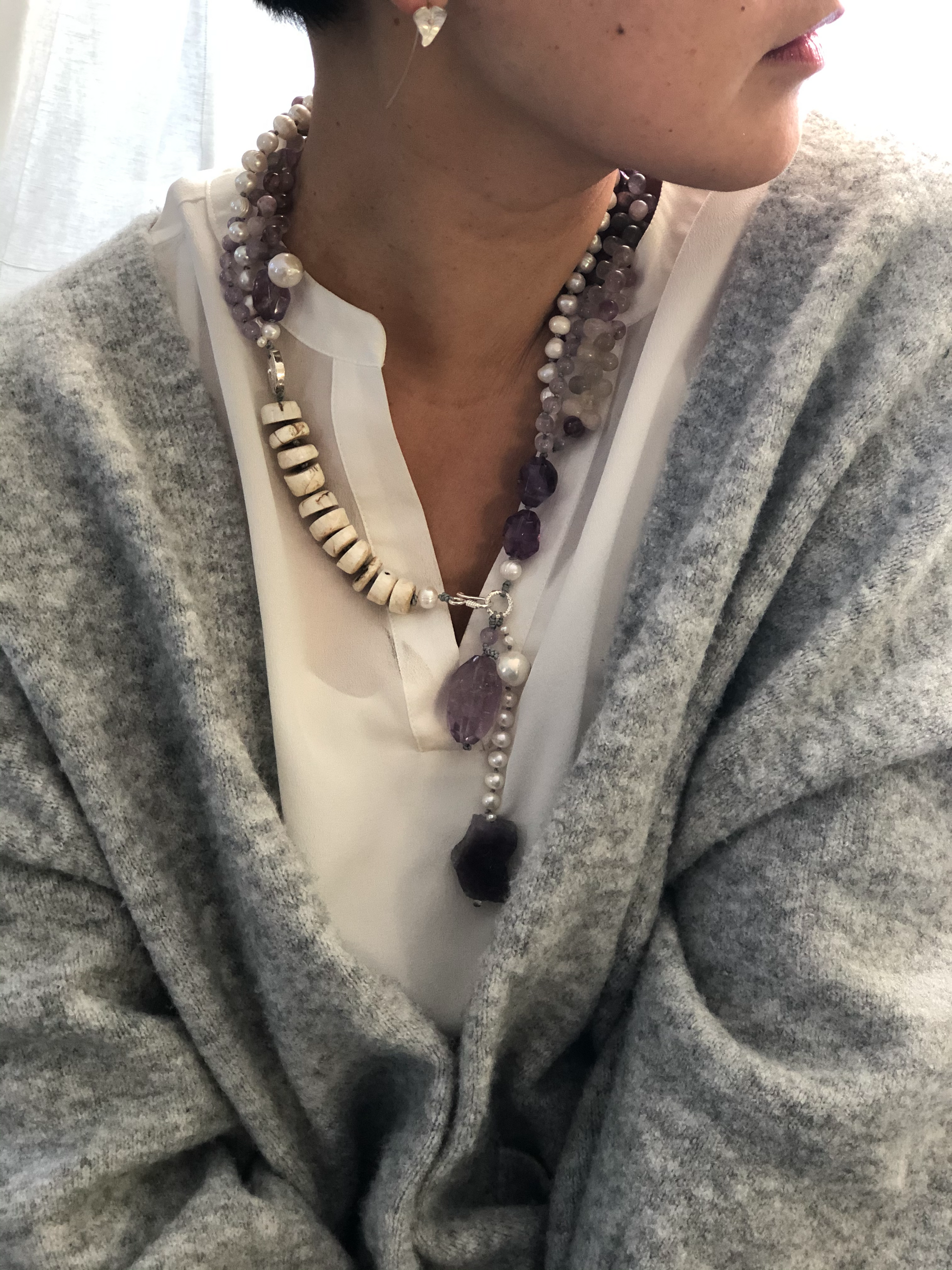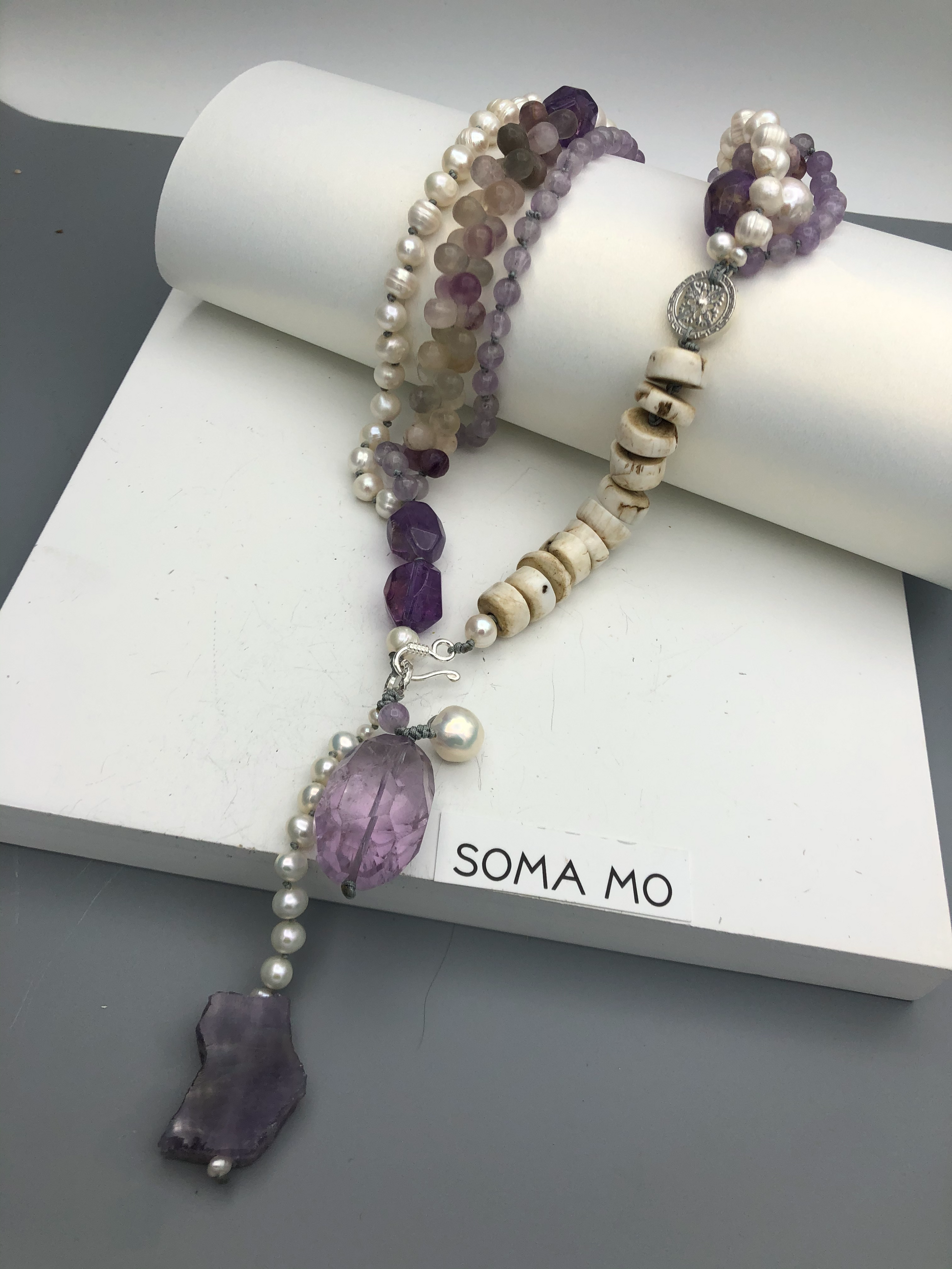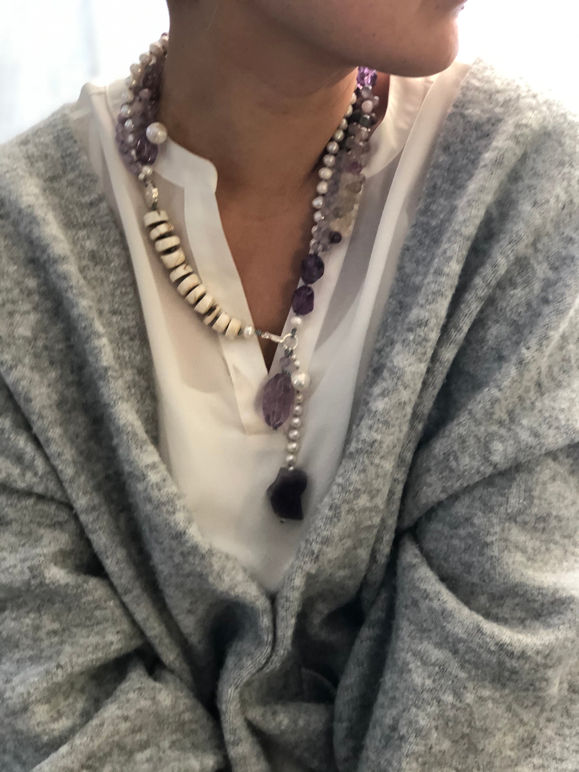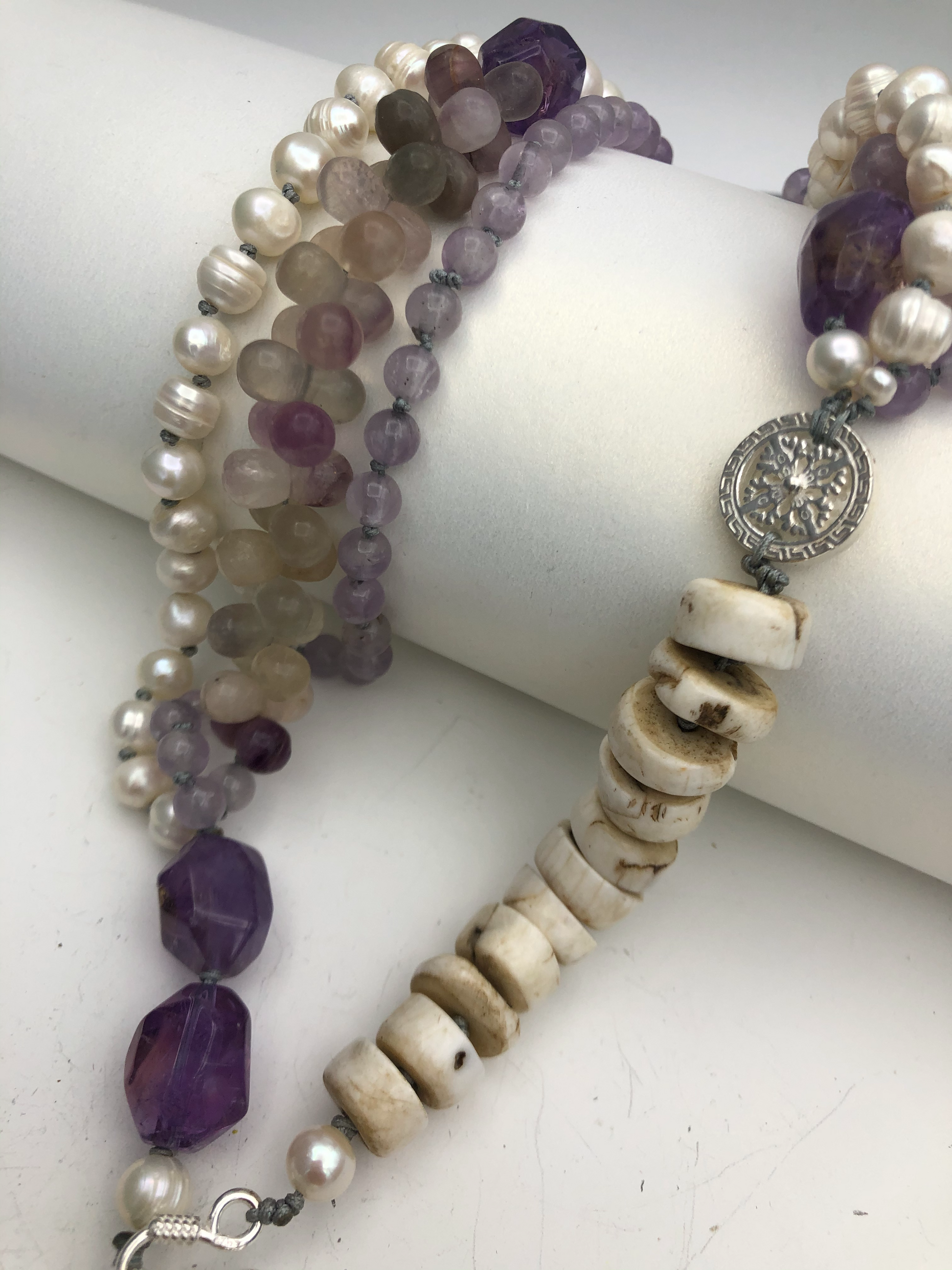 Materials : Florite, amethyst, fresh water pearl, bone beads