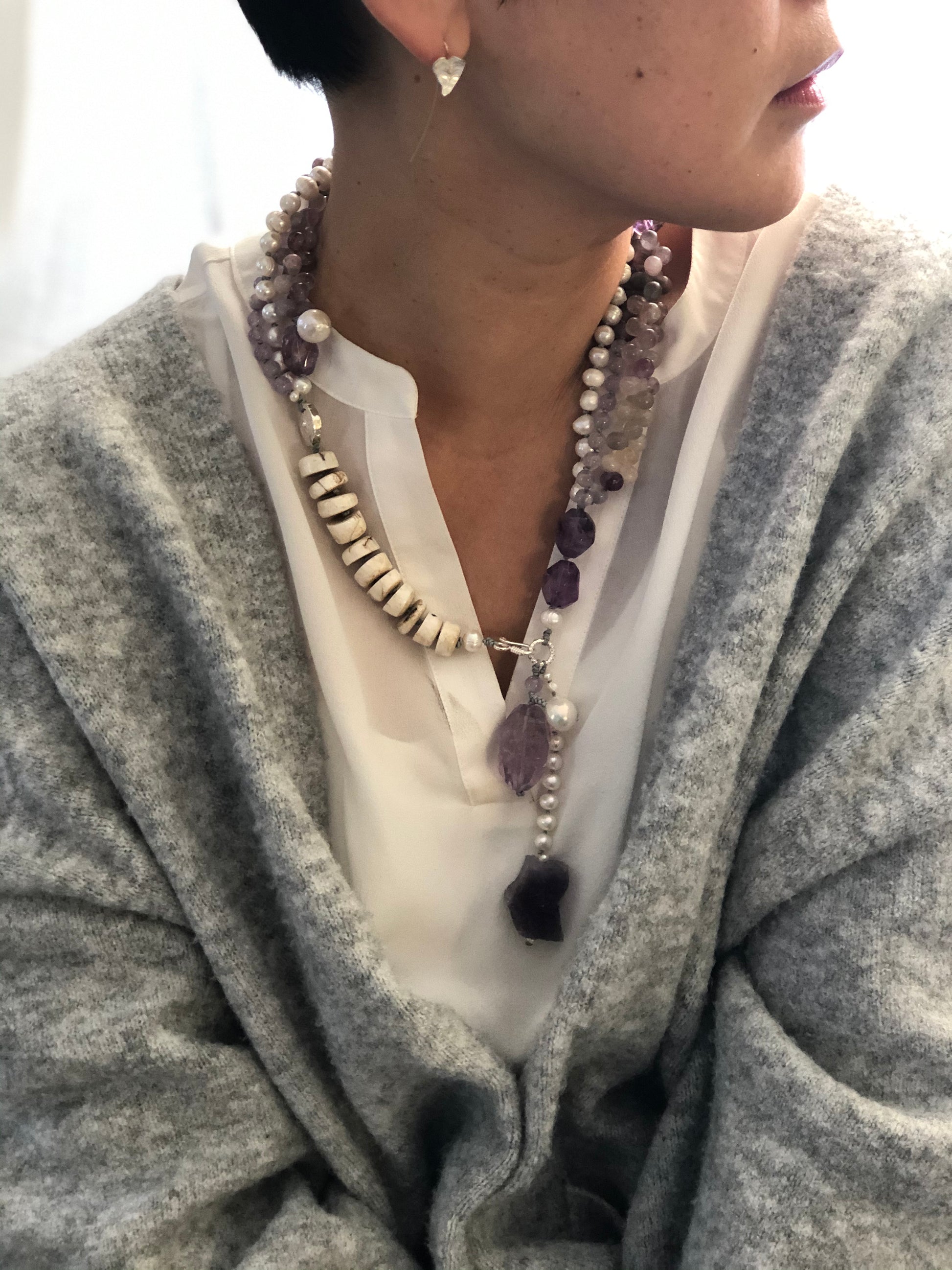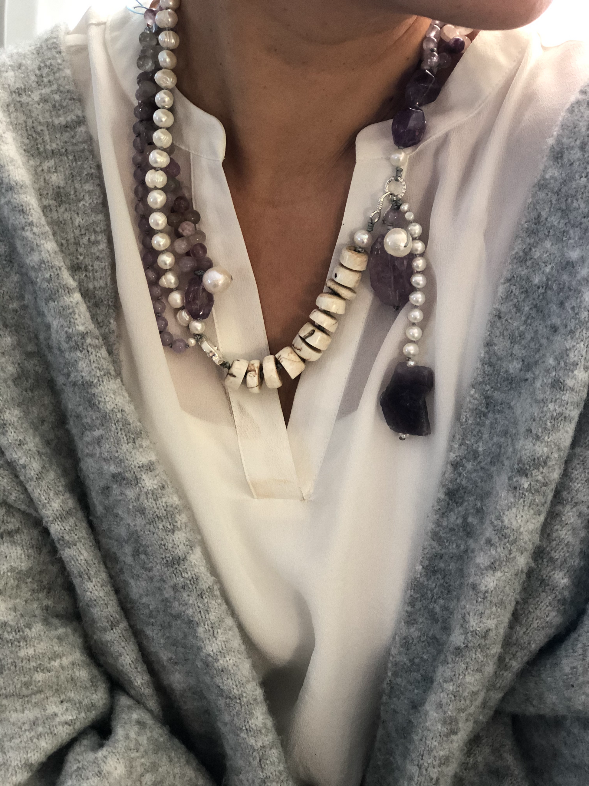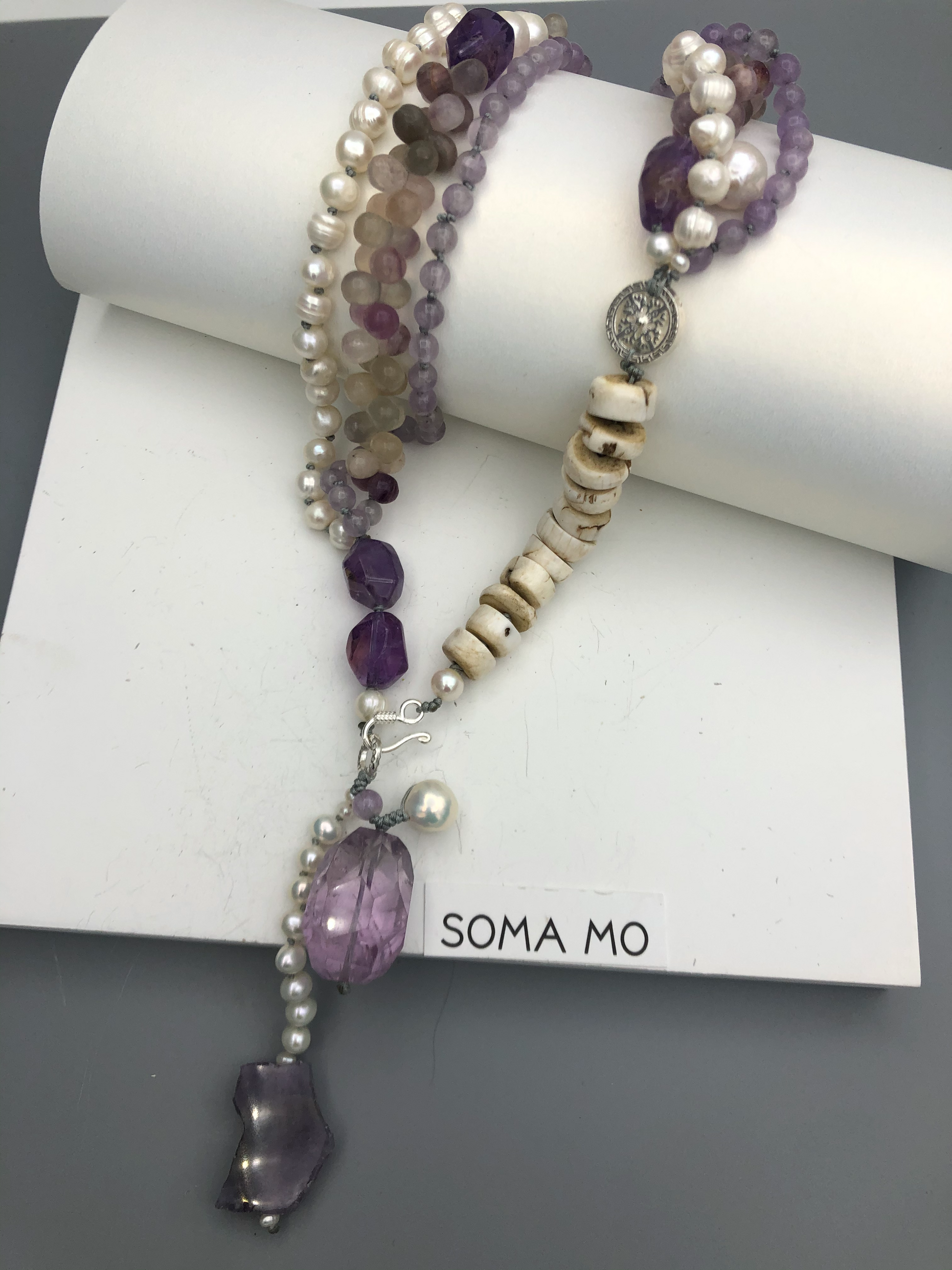Materials : Florite, amethyst, fresh water pearl, bone beads