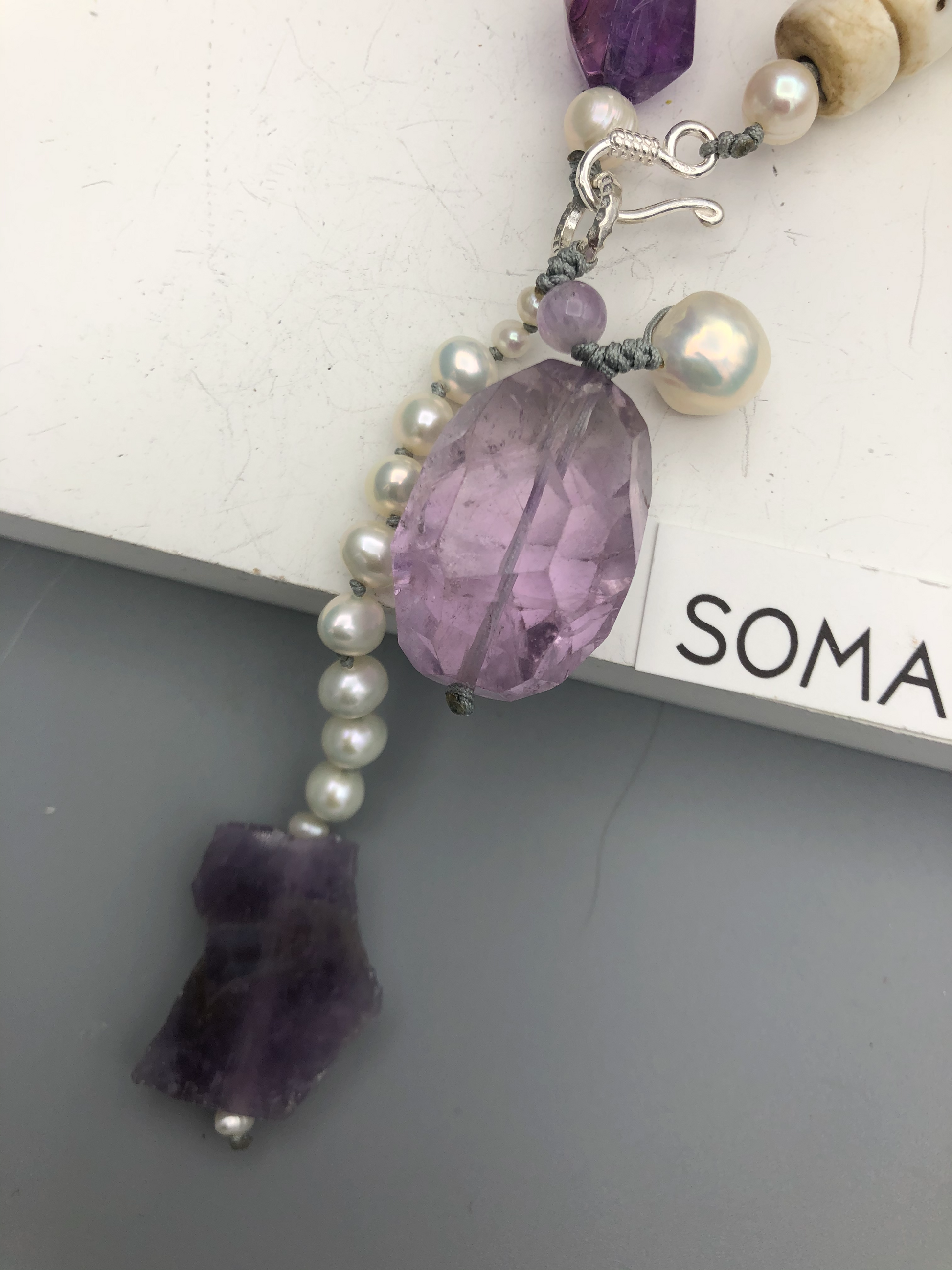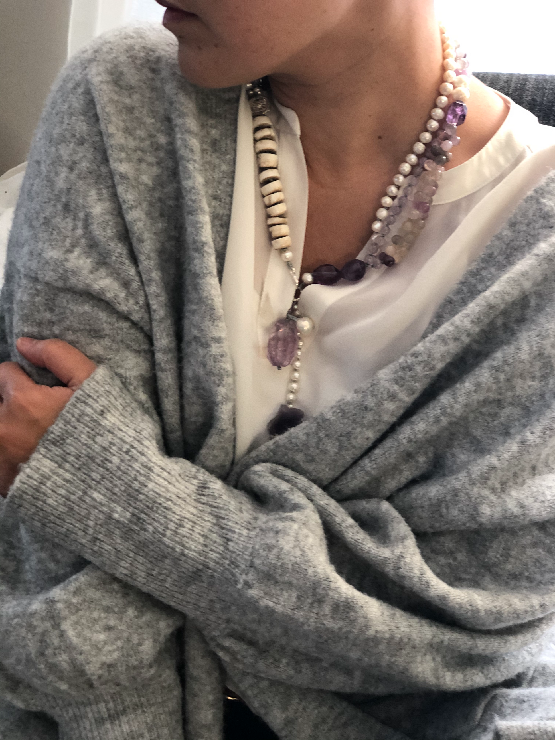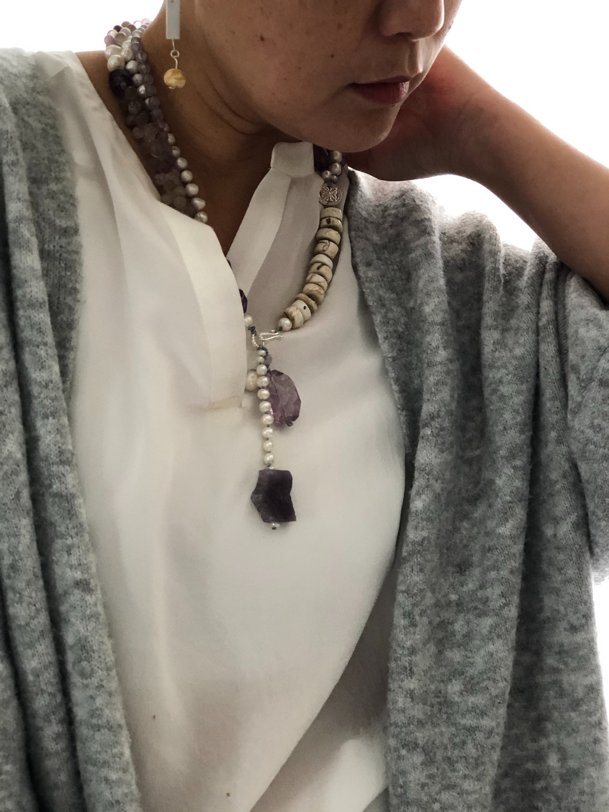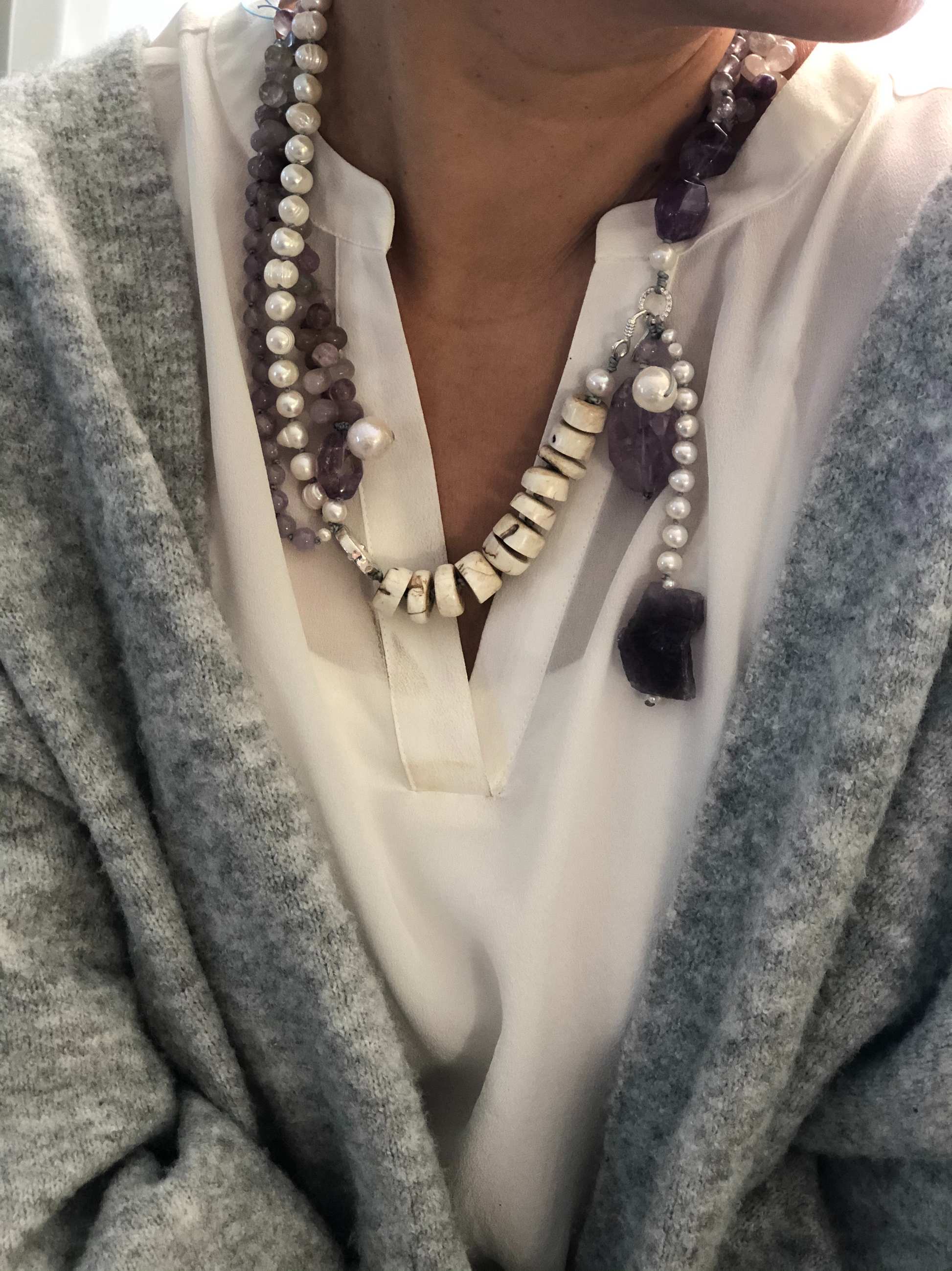 Materials : Florite, amethyst, fresh water pearl, bone beads