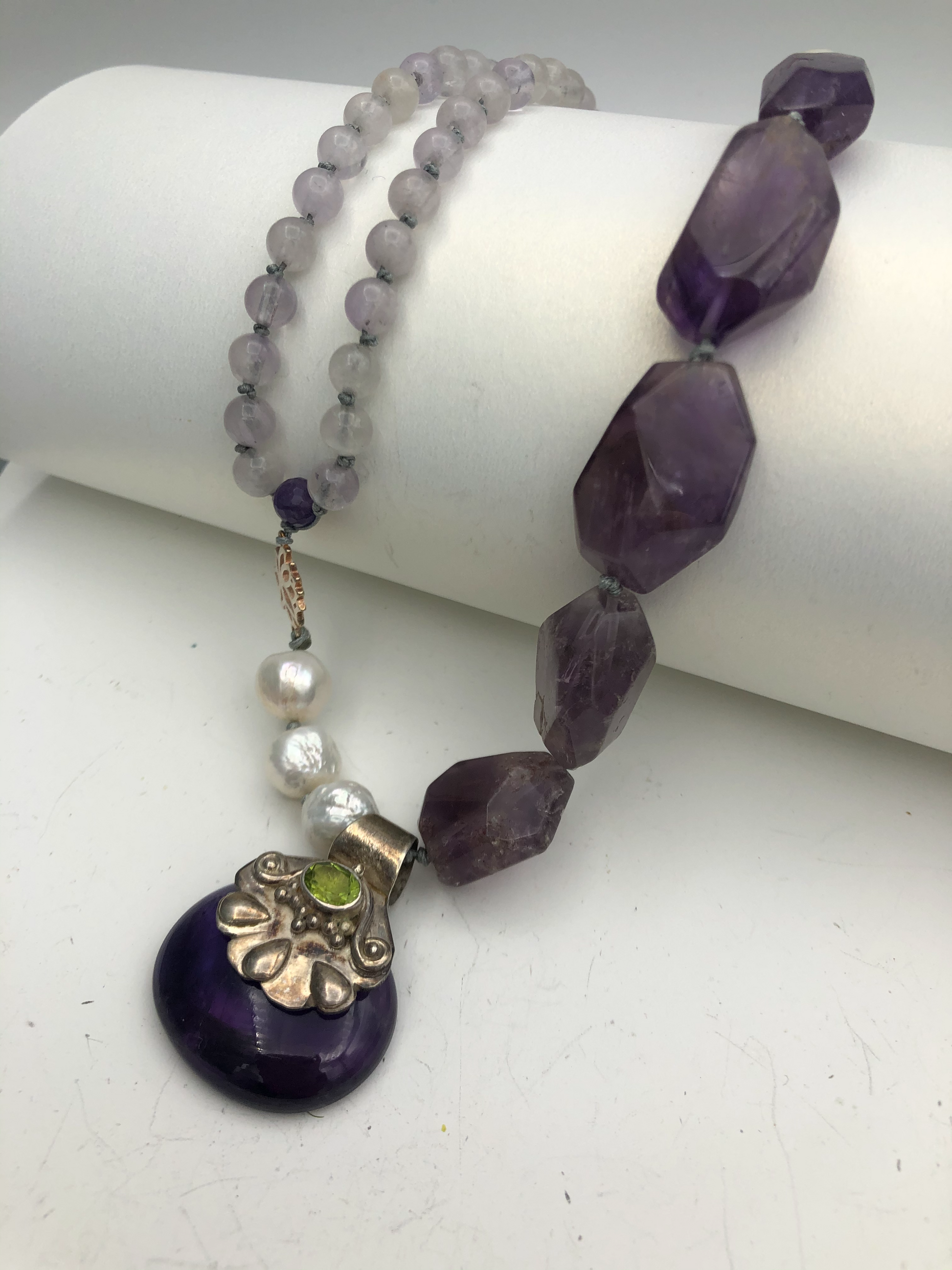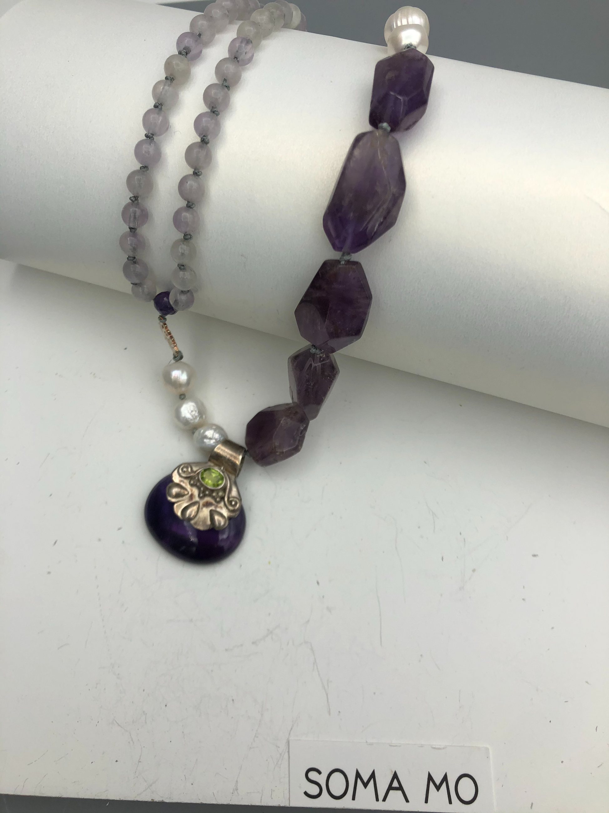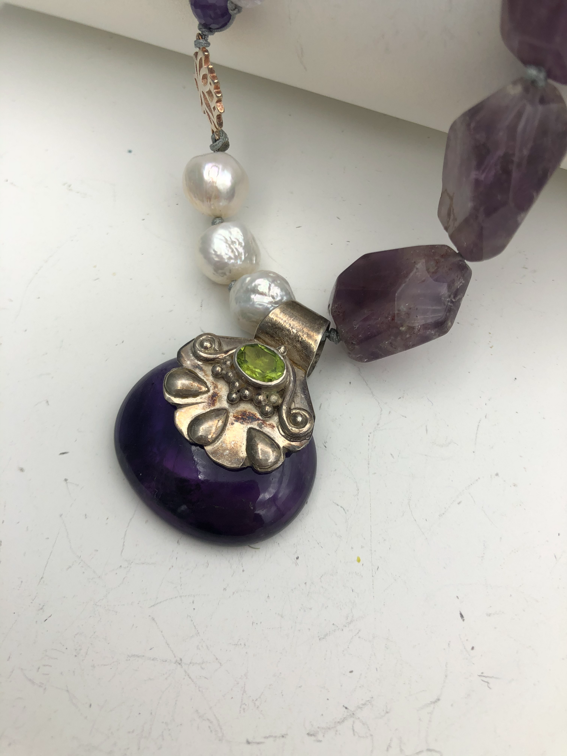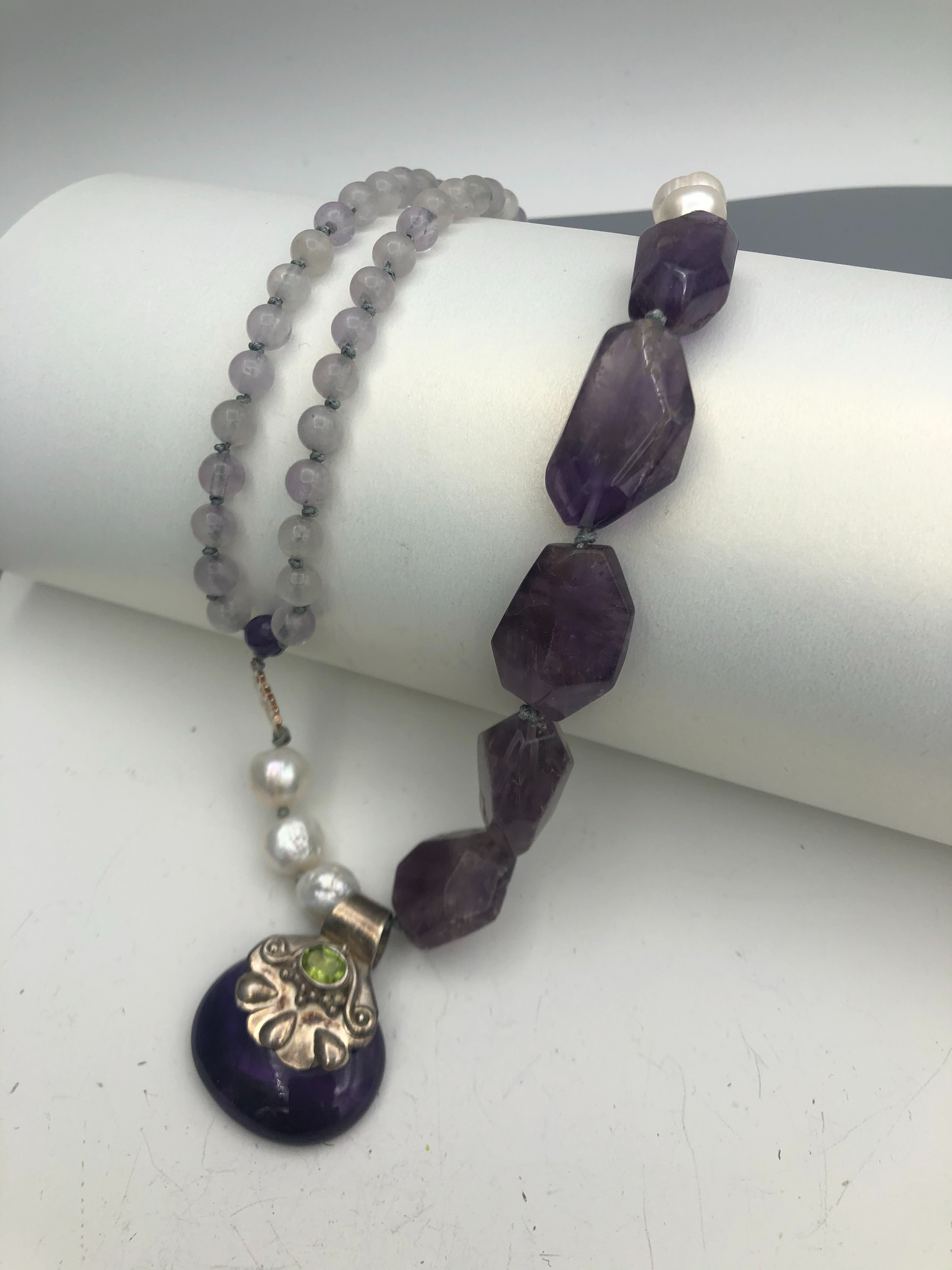 Materials : Amethyst, fresh water pearl, sterling silver pendent with amethyst and peridot