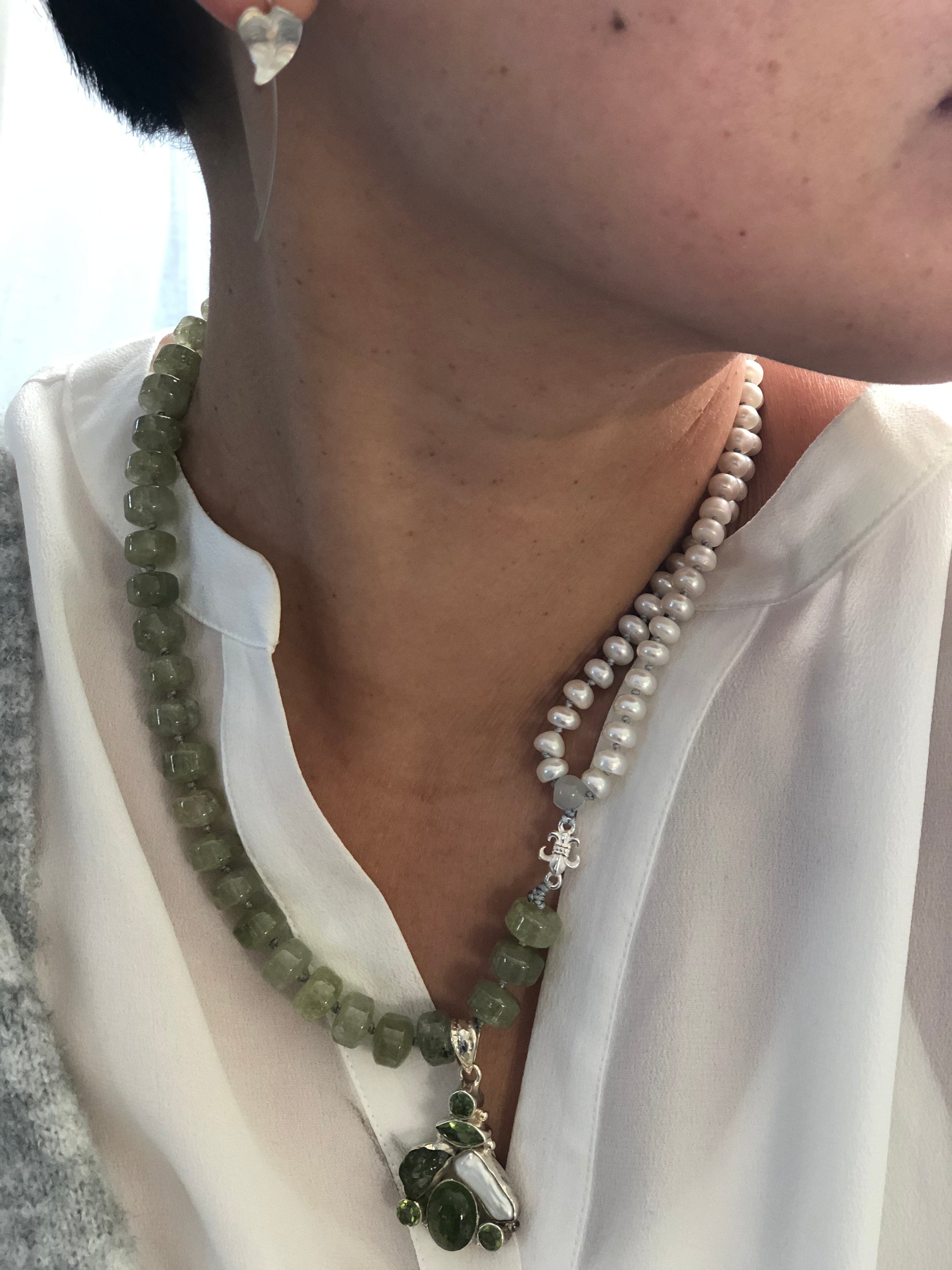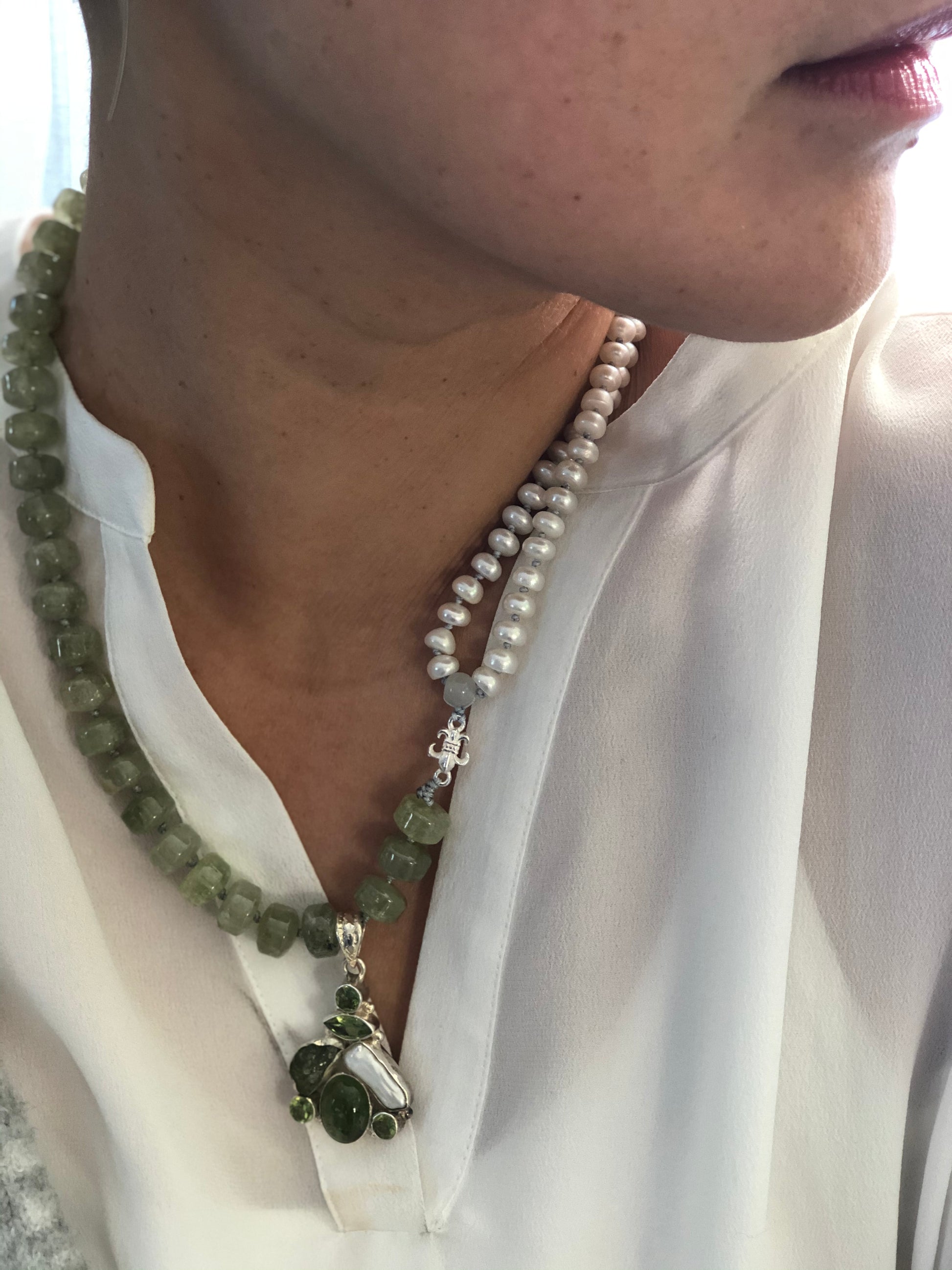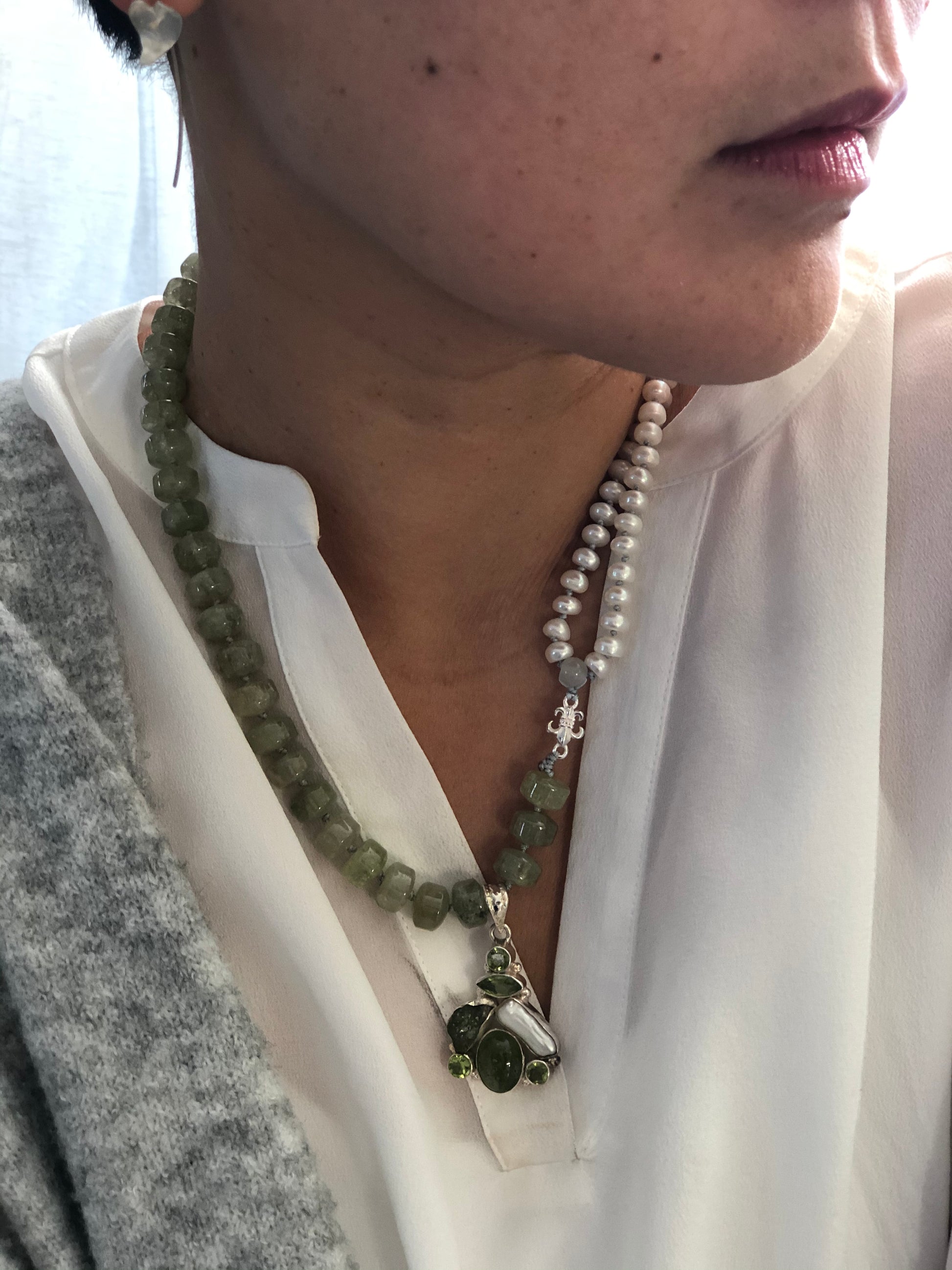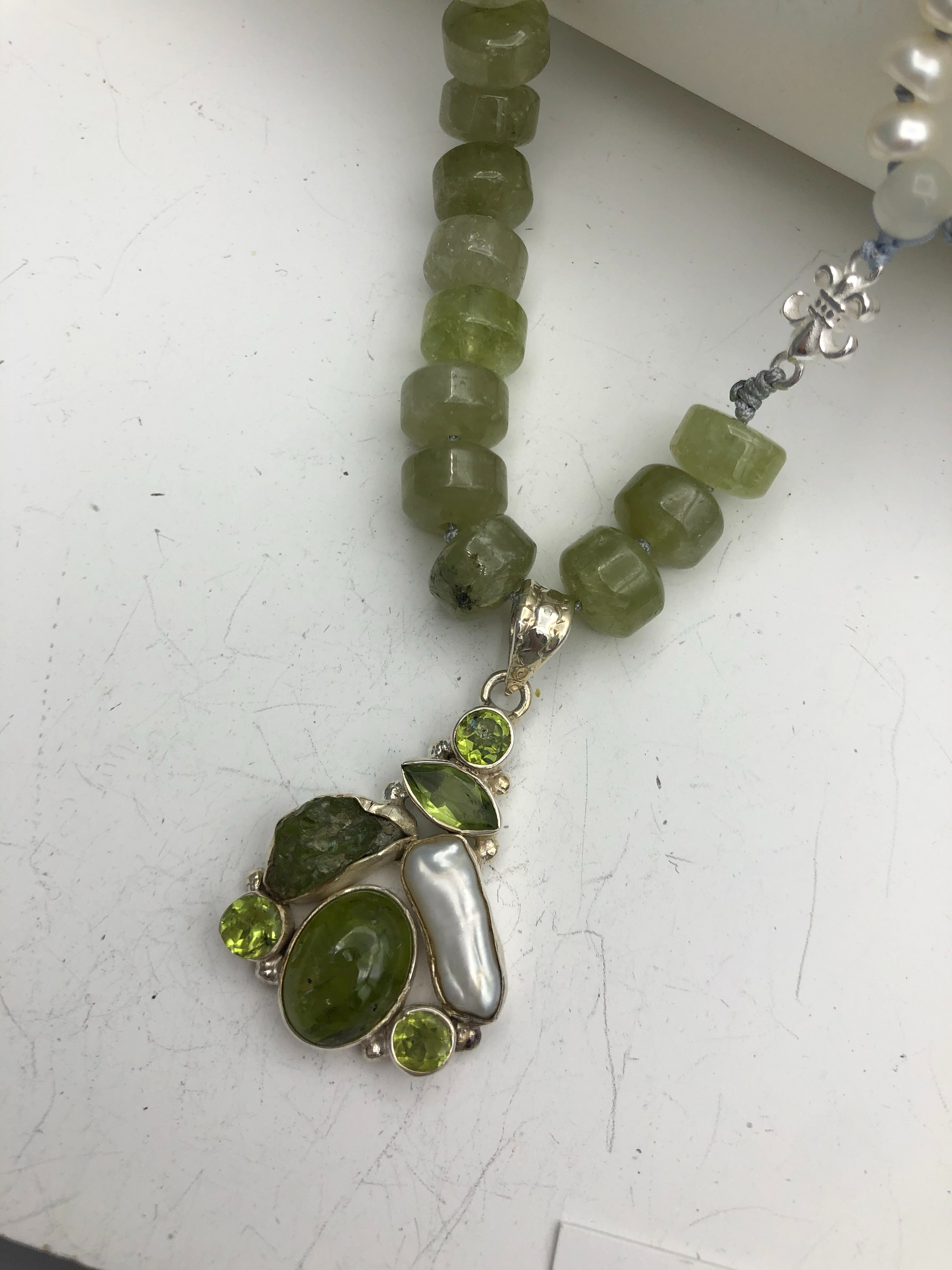Materials : Green garnet, fresh water pearl, sterling silver pendent with peridot and pearl