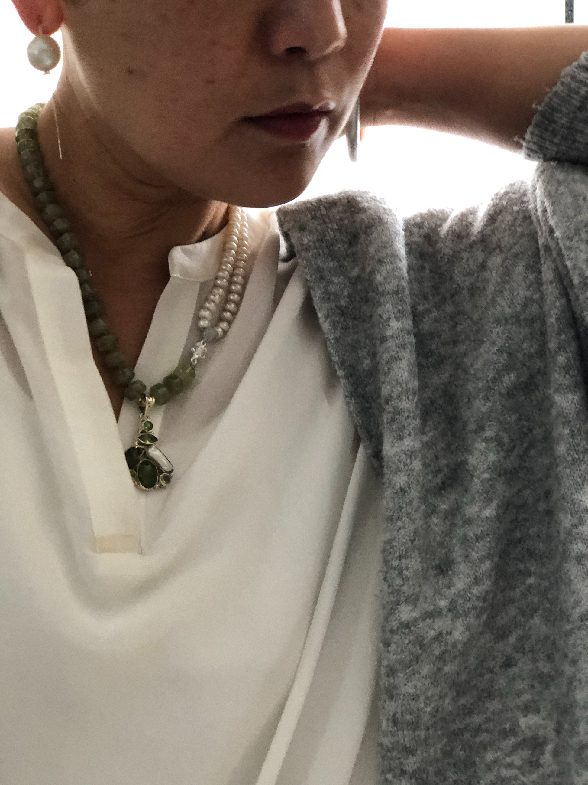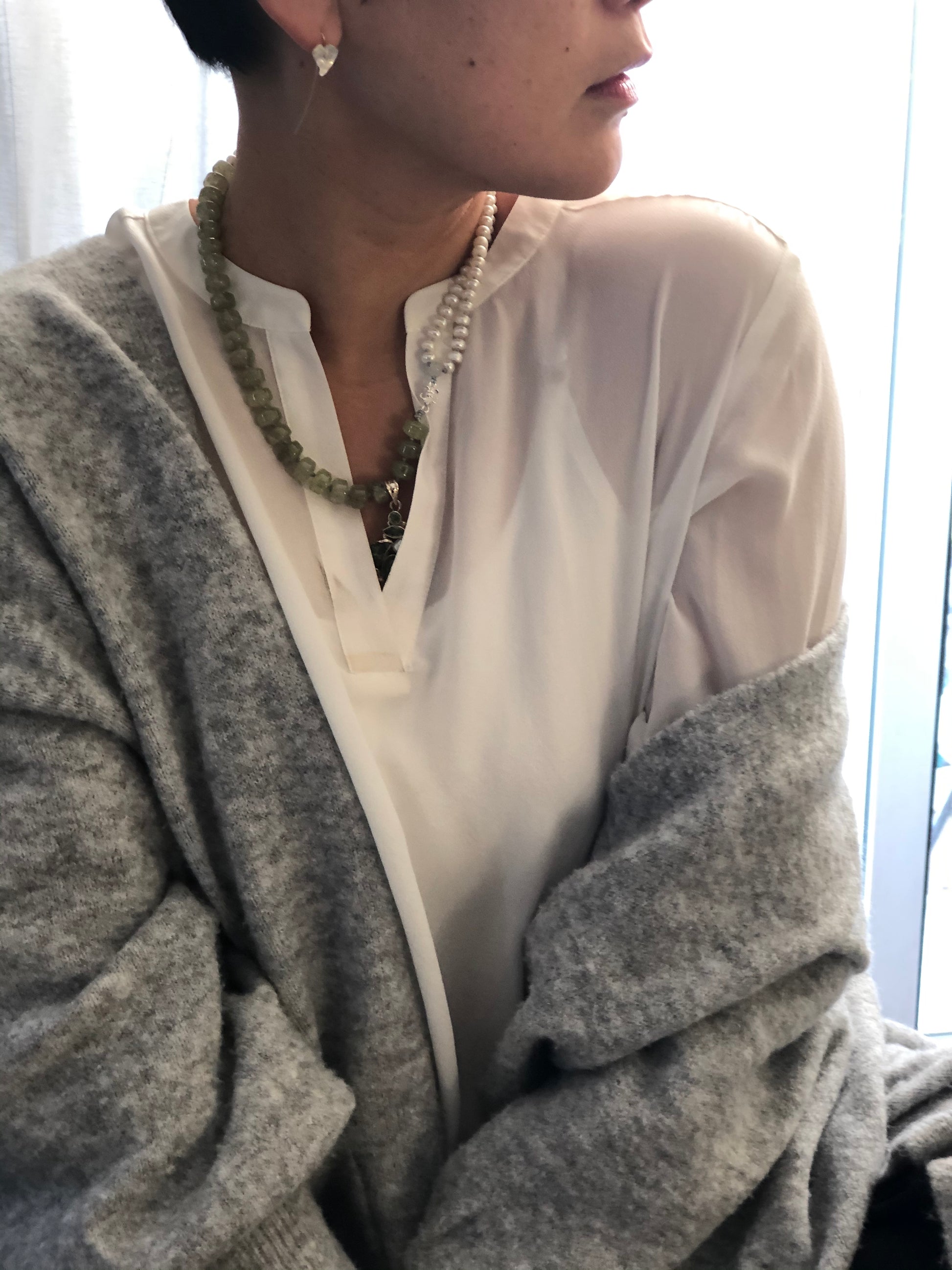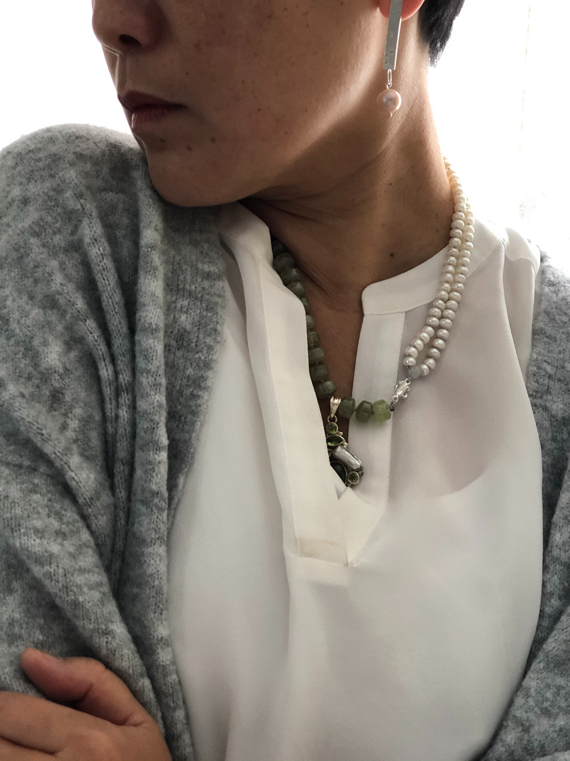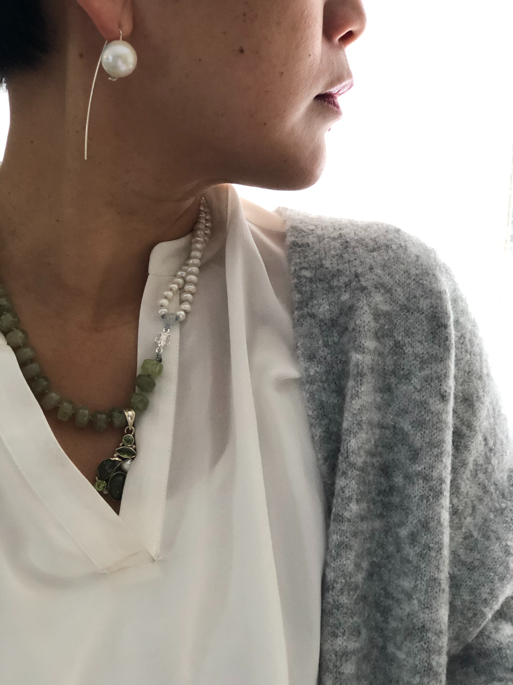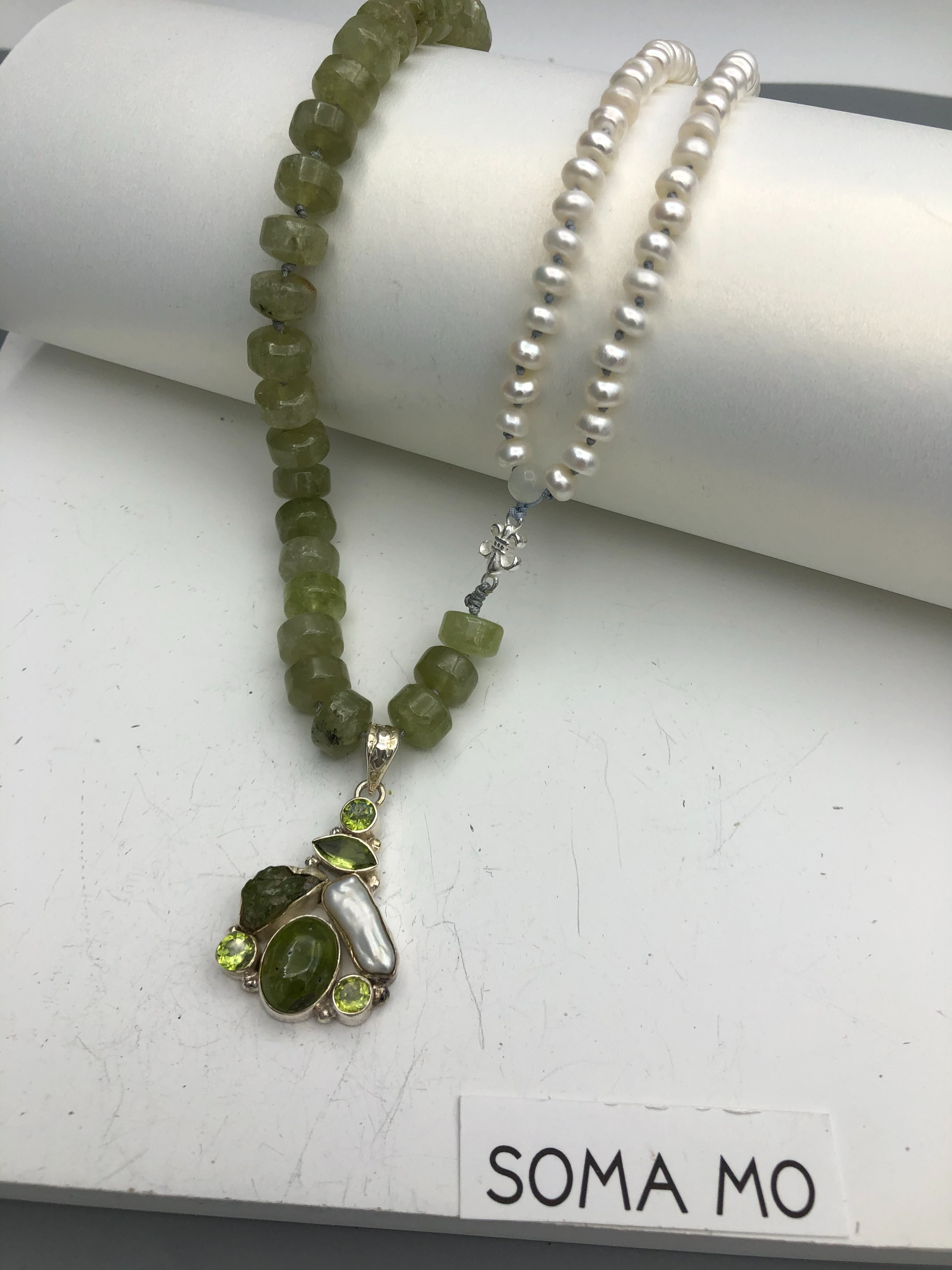 Materials : Green garnet, fresh water pearl, sterling silver pendent with peridot and pearl