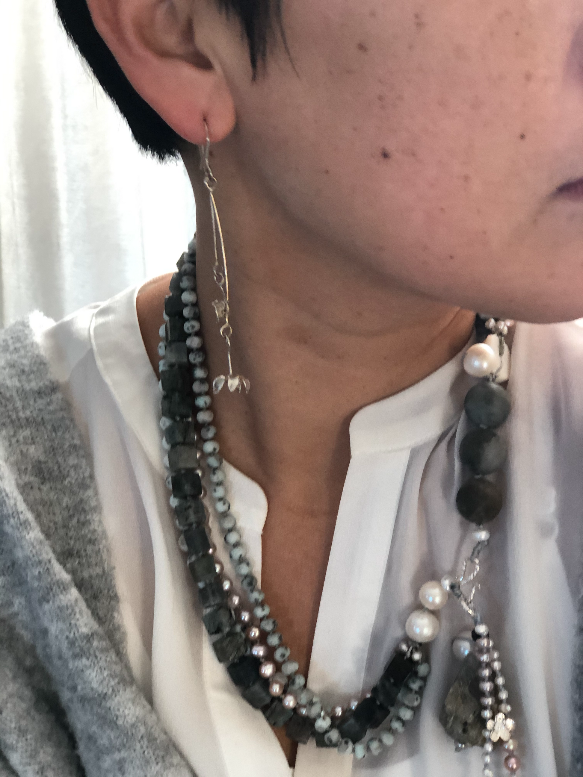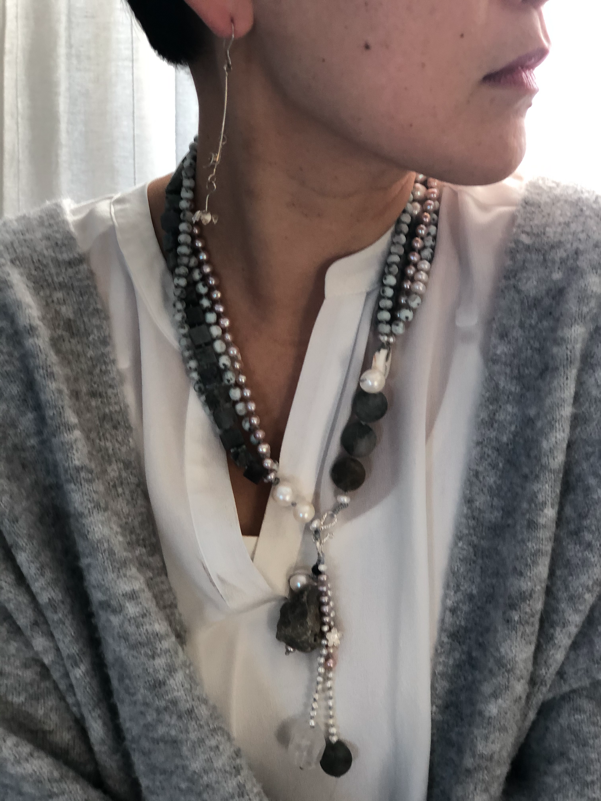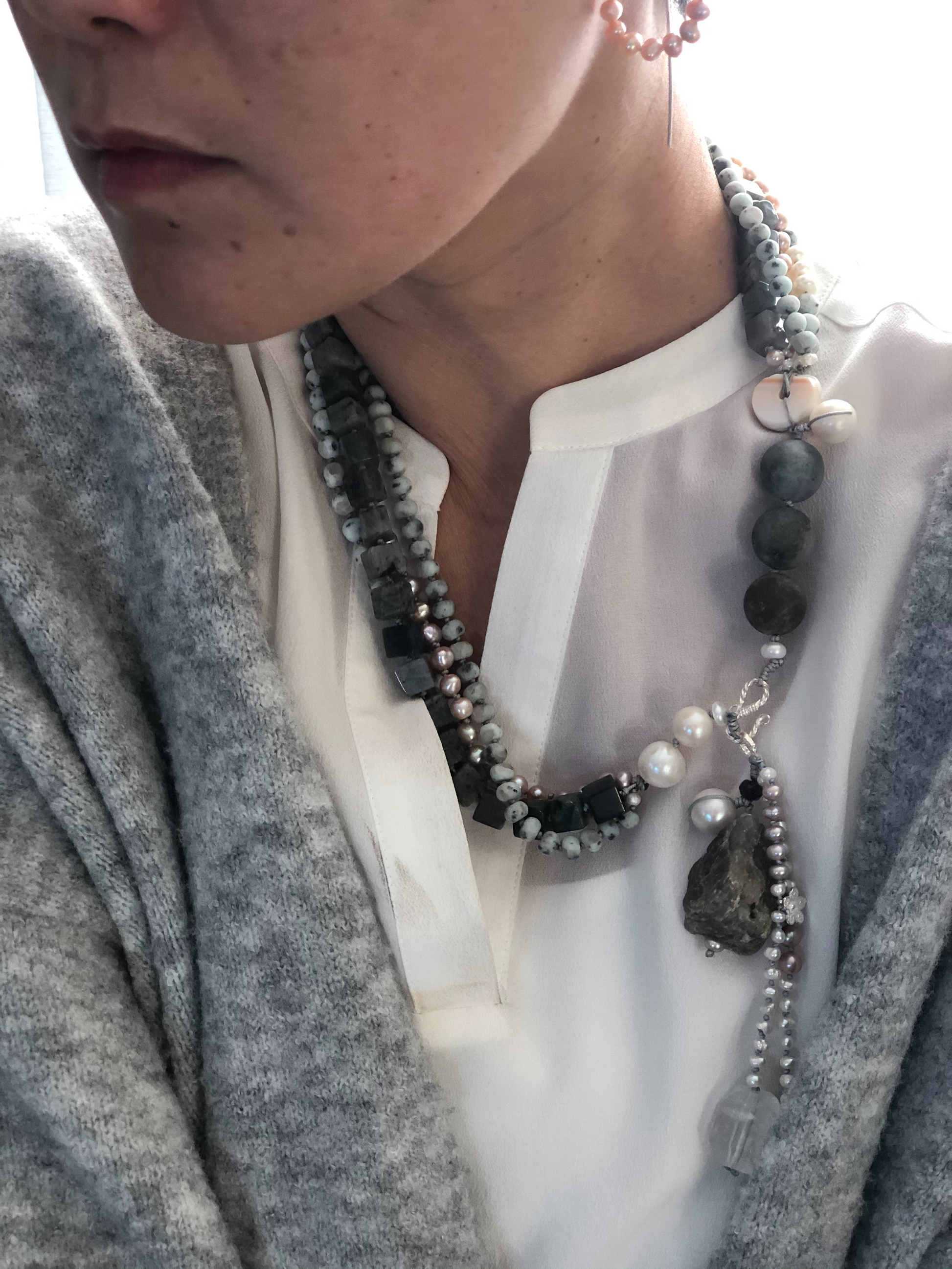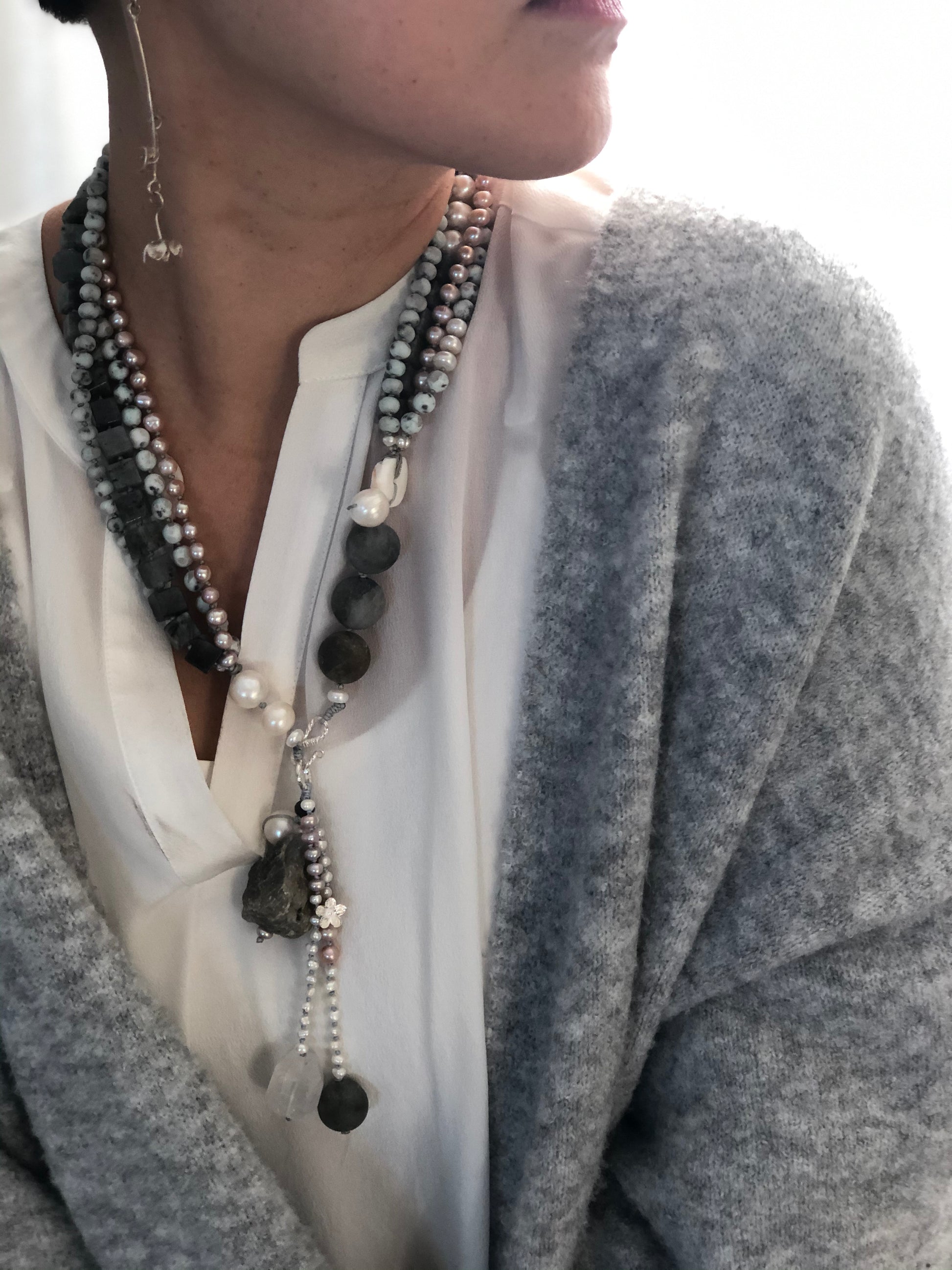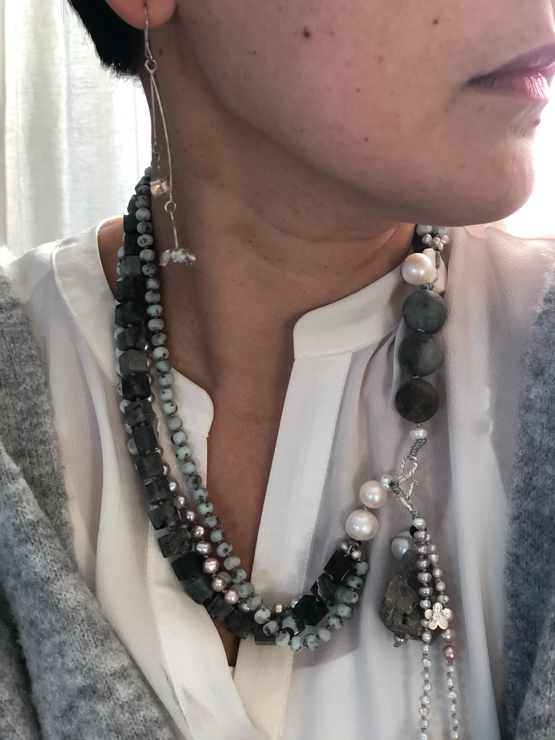 Materials : Agate, labrodrite, fresh water pearl, silver