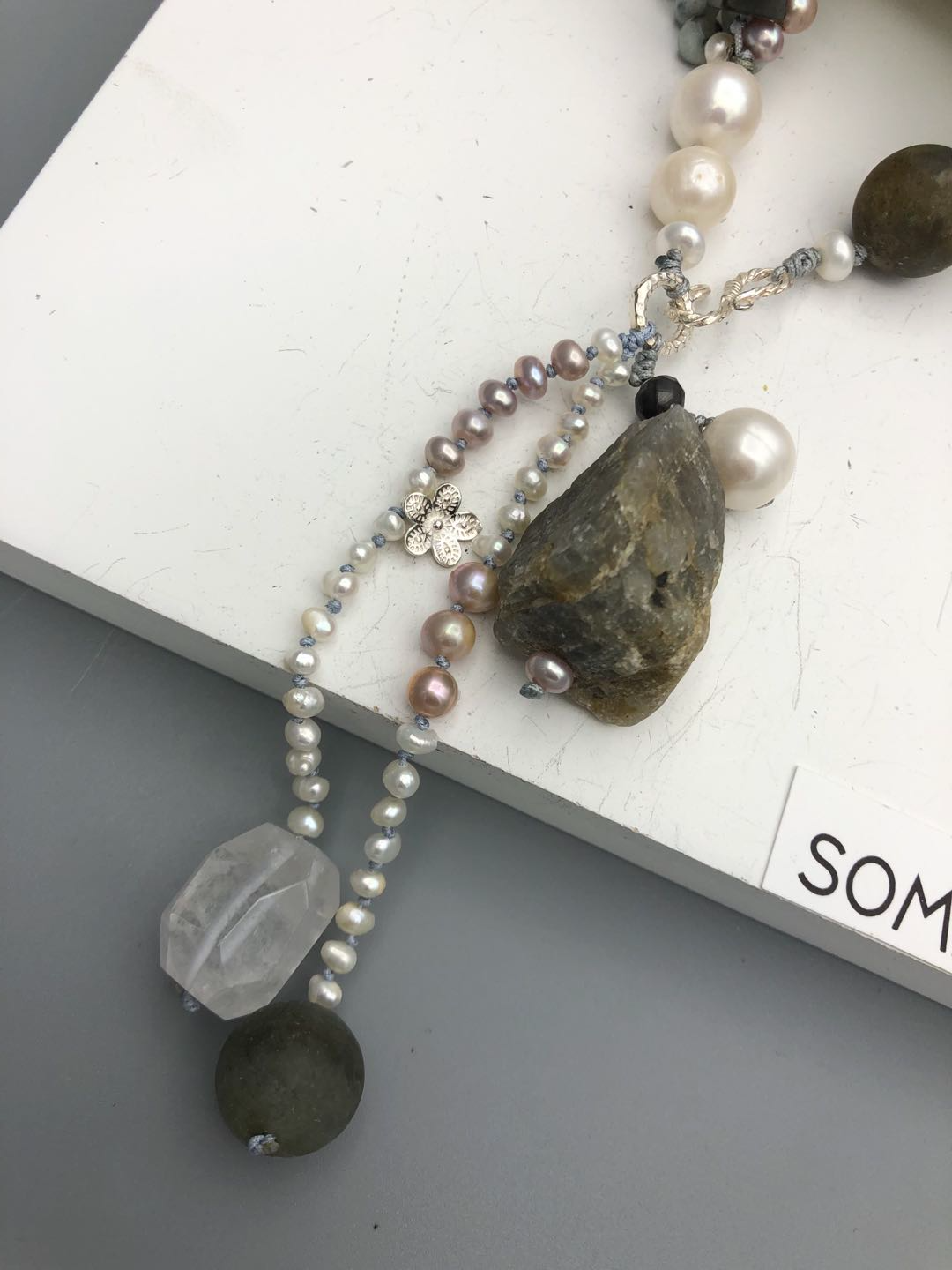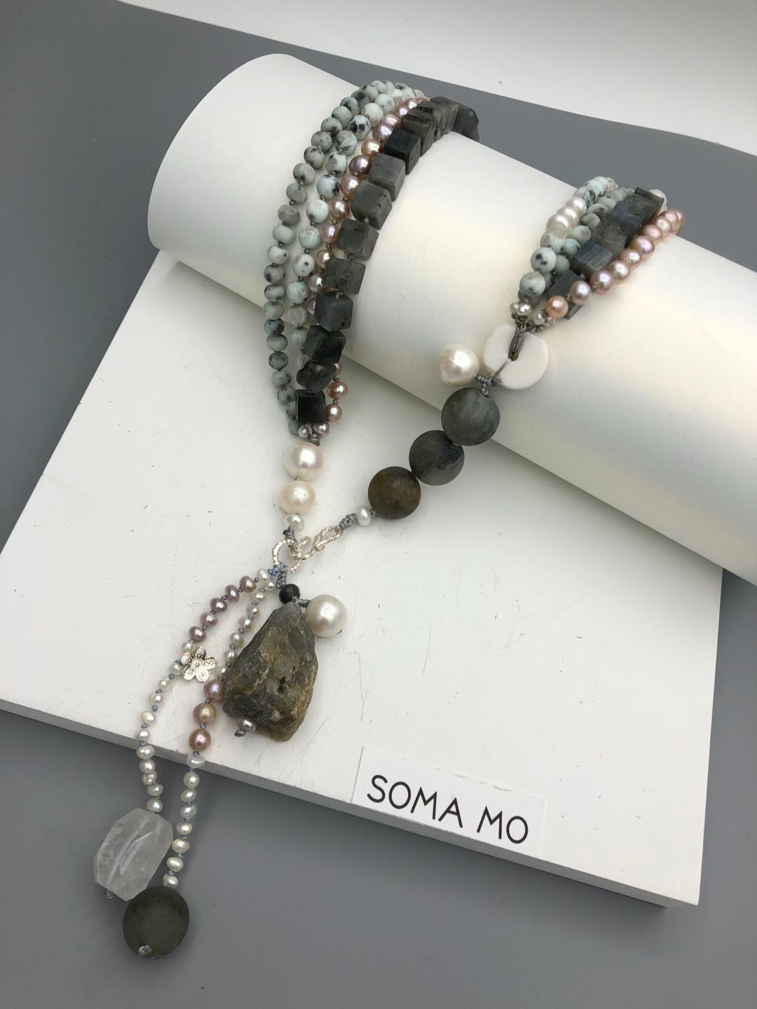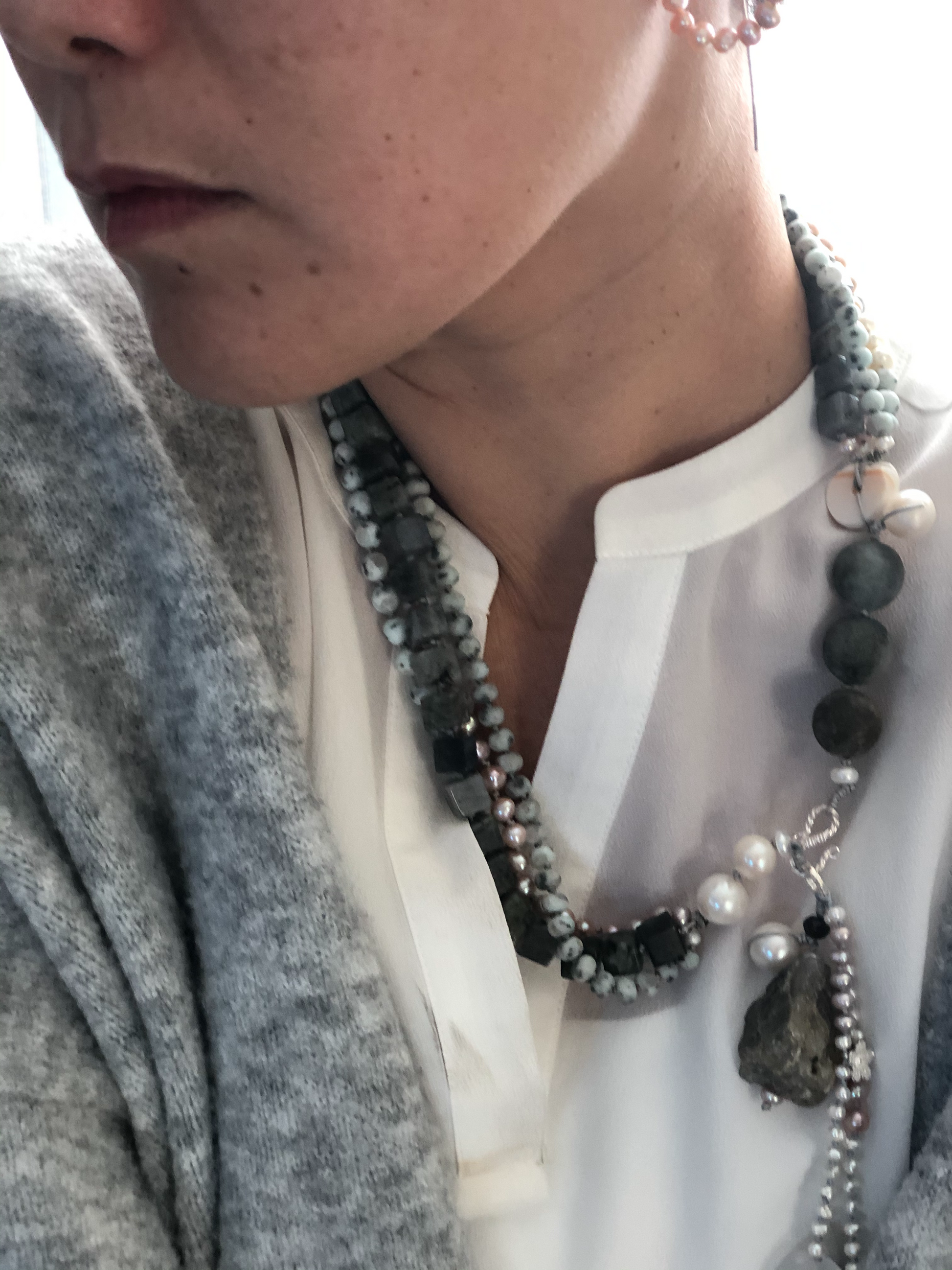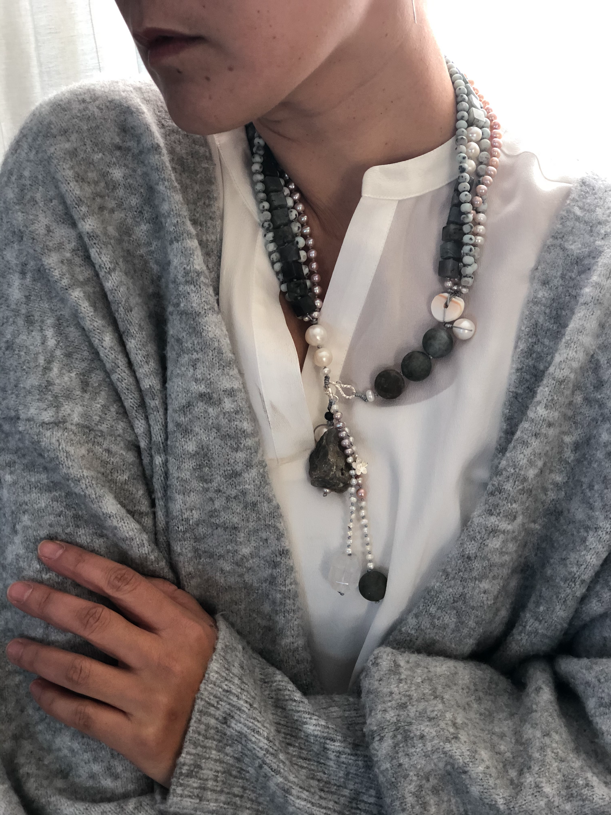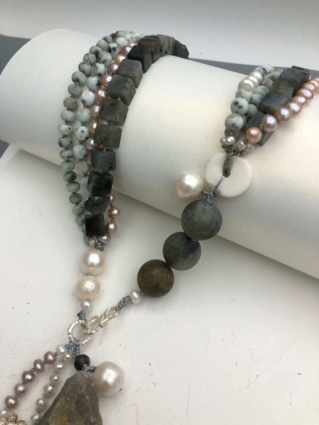 Materials : Agate, labrodrite, fresh water pearl, silver