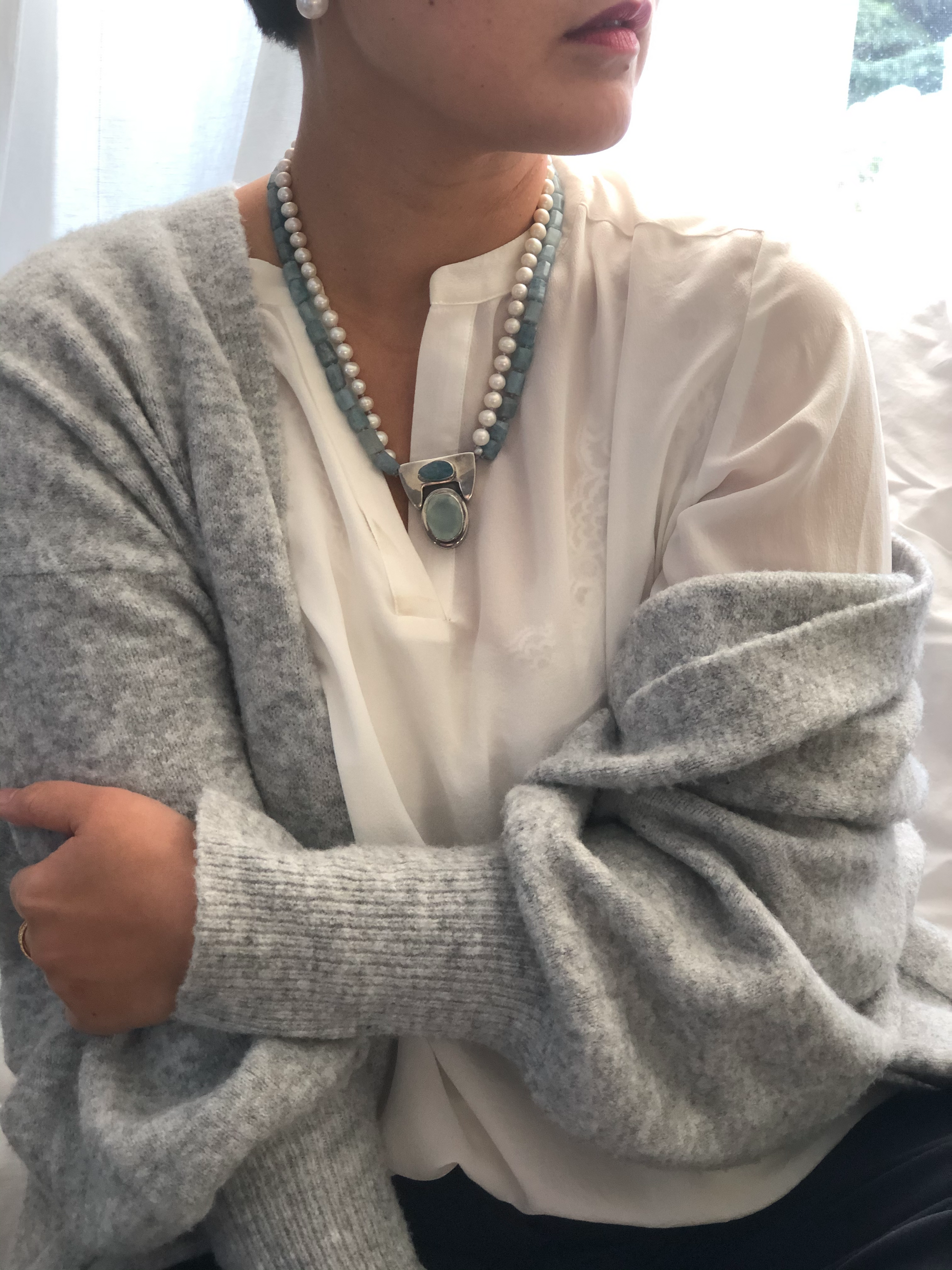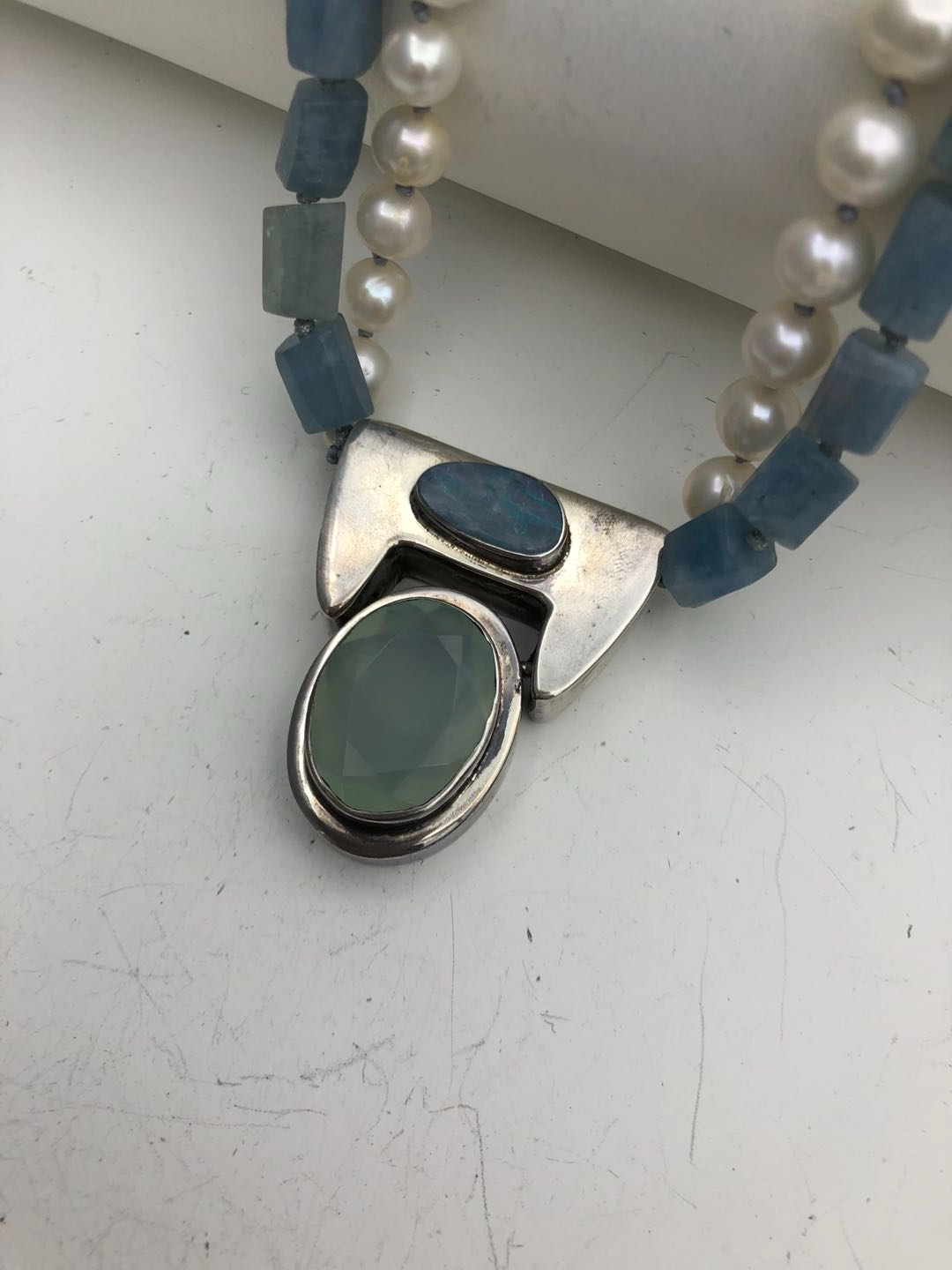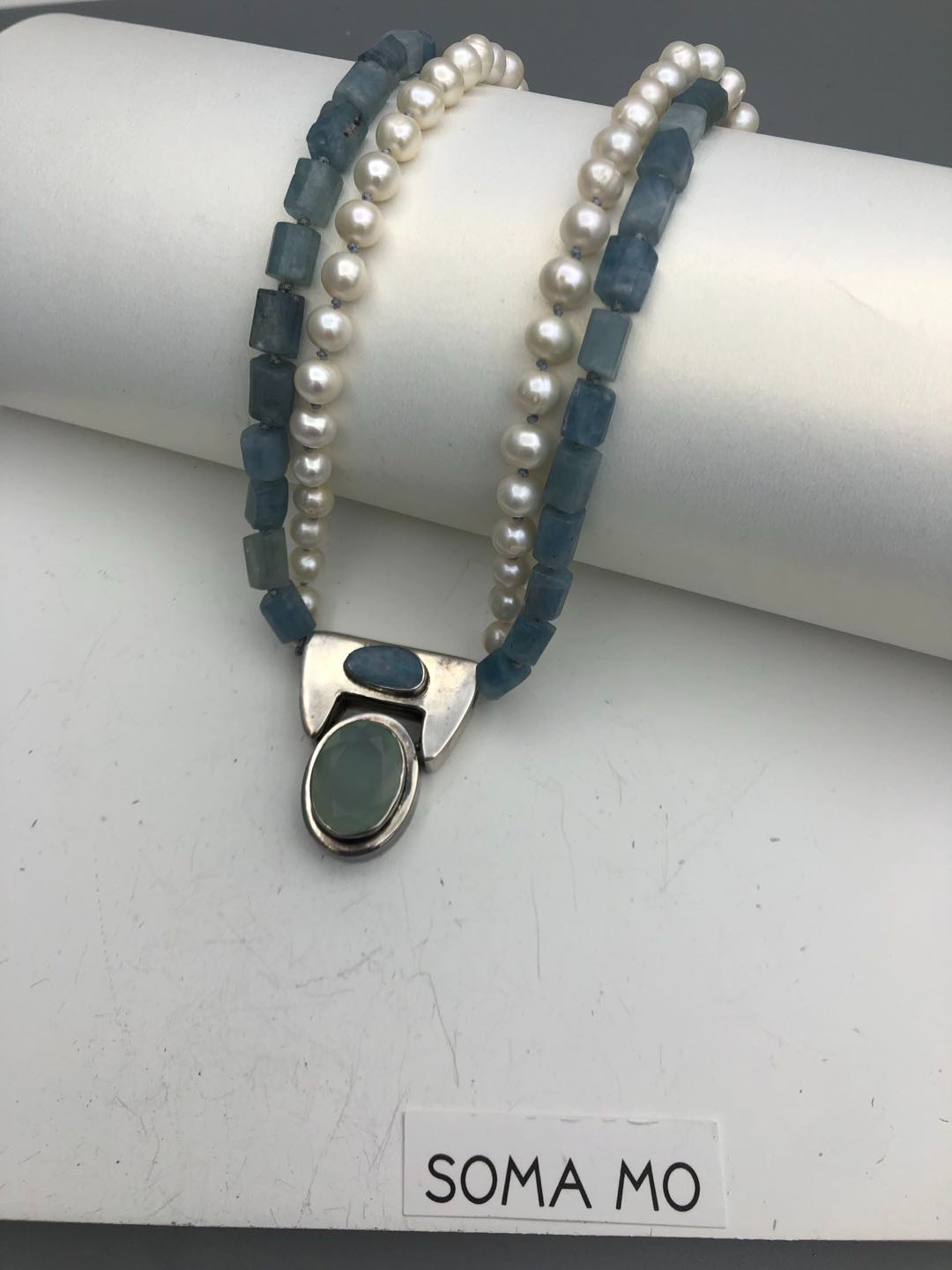 Materials : Aquamarine, fresh water pearl, sterling silver pendent with opal and agate