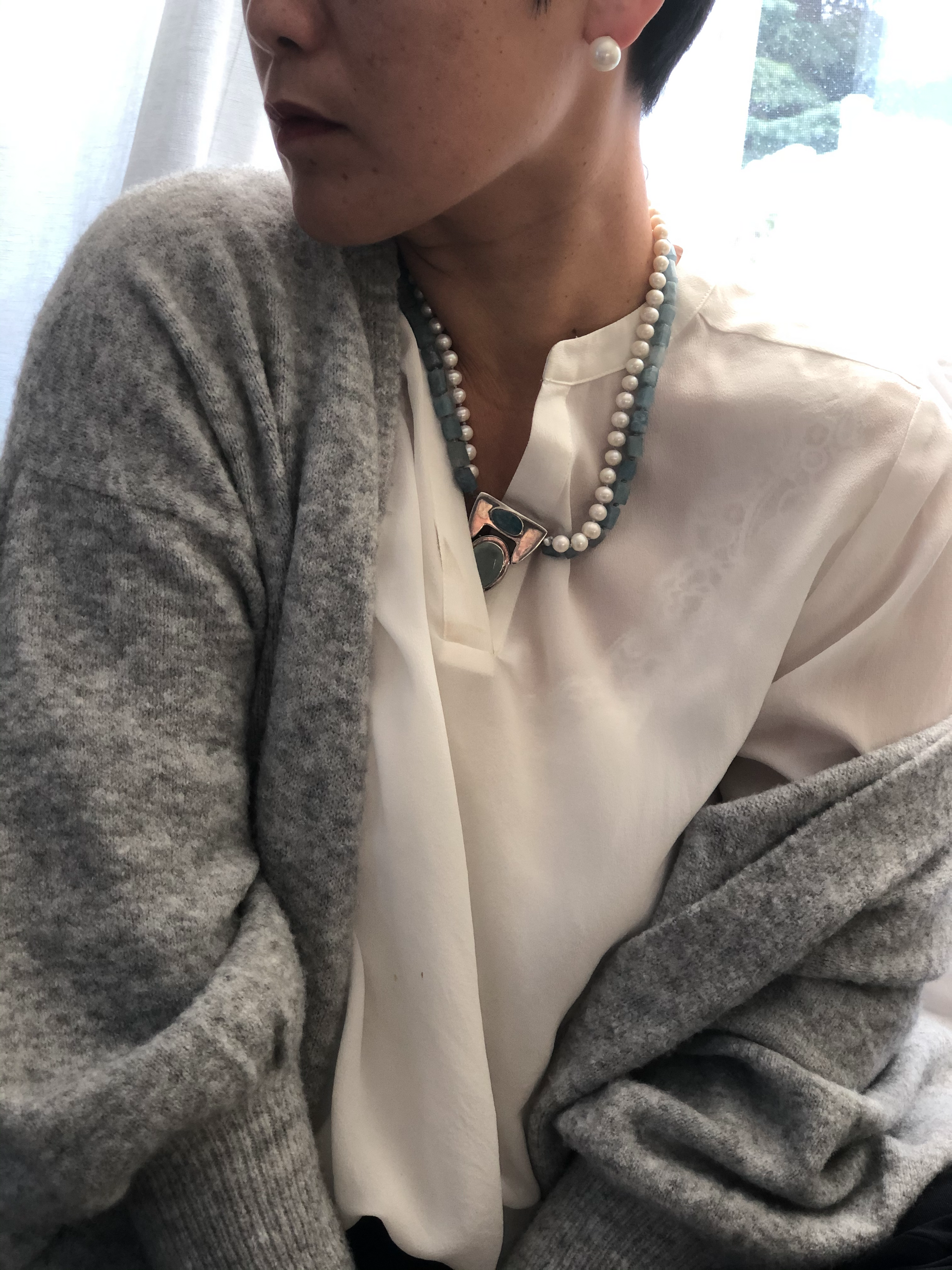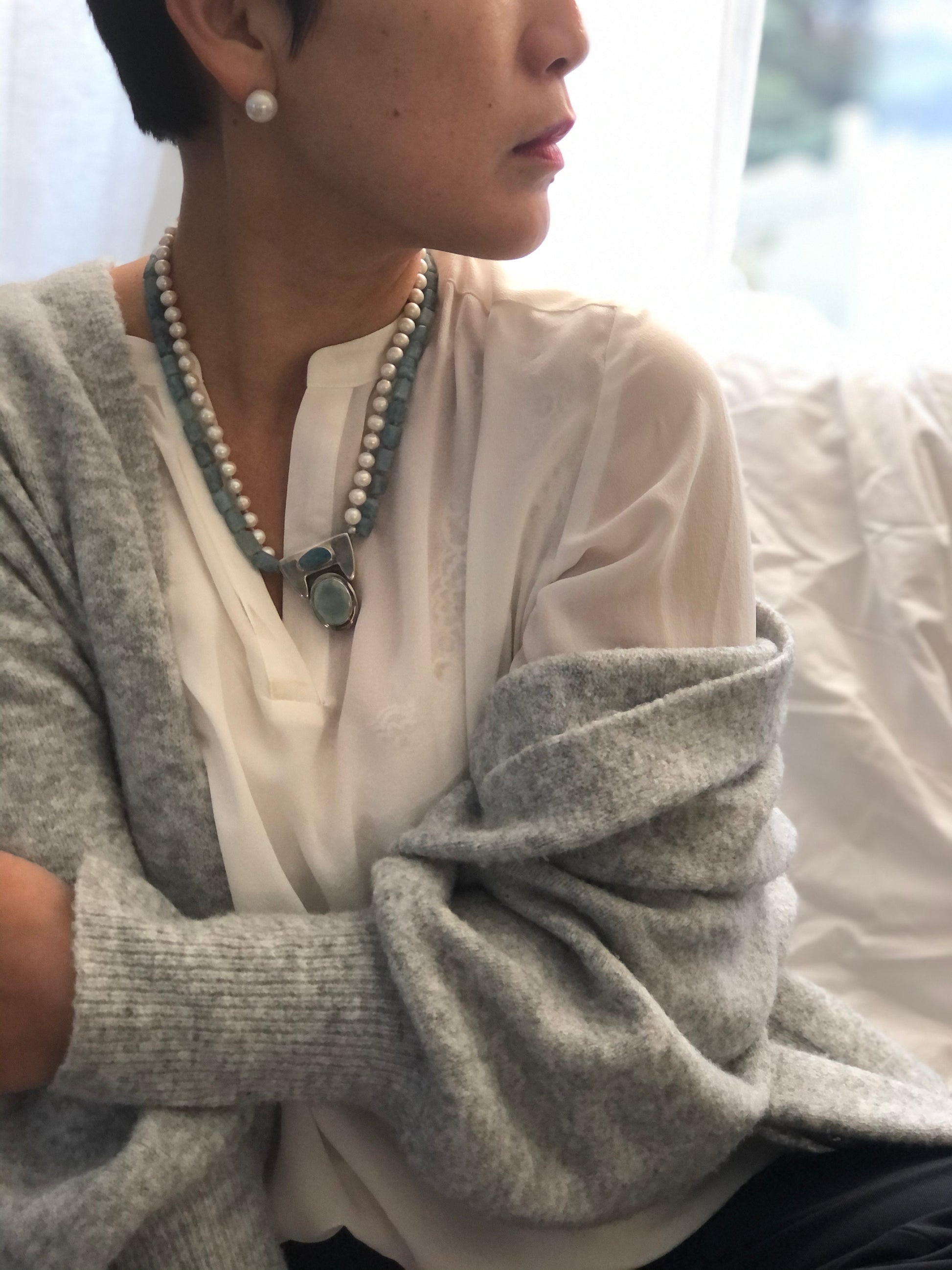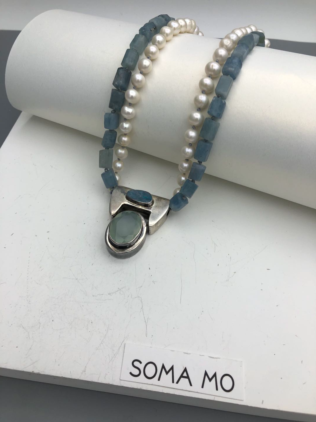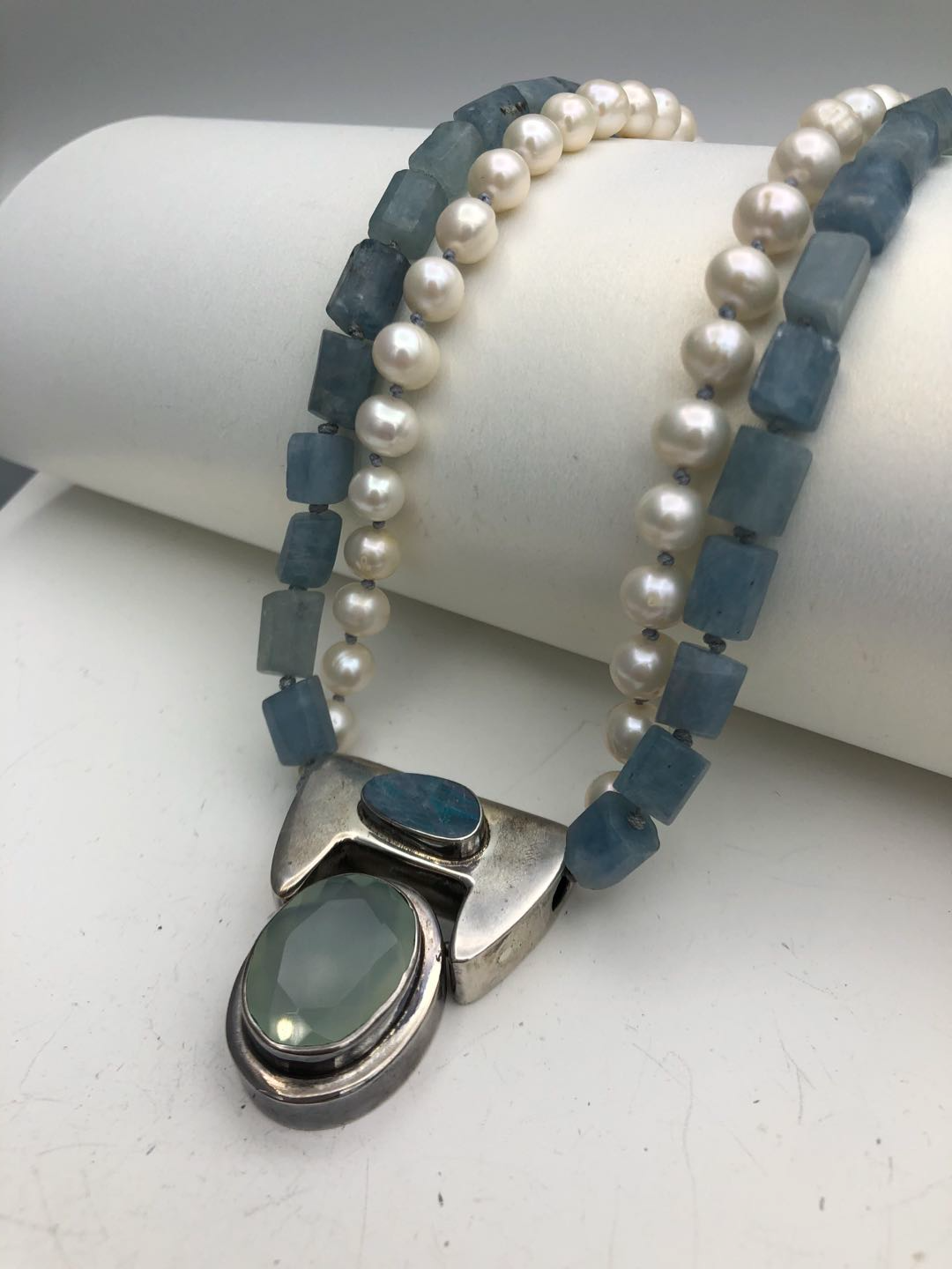 Materials : Aquamarine, fresh water pearl, sterling silver pendent with opal and agate