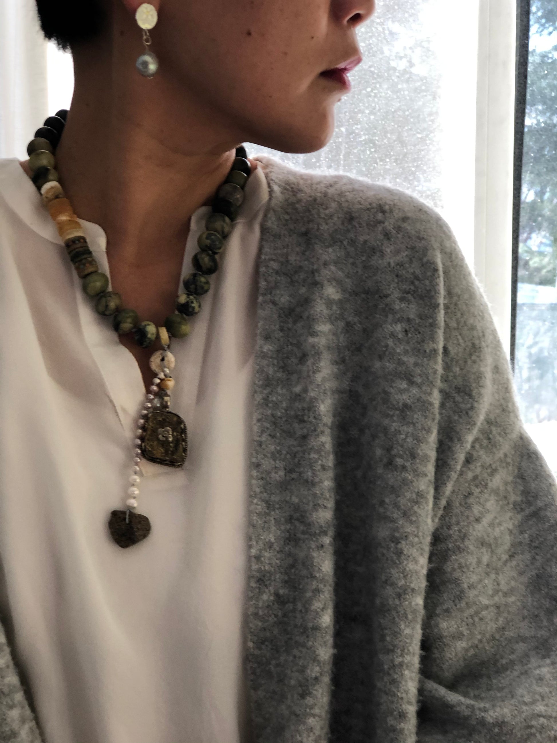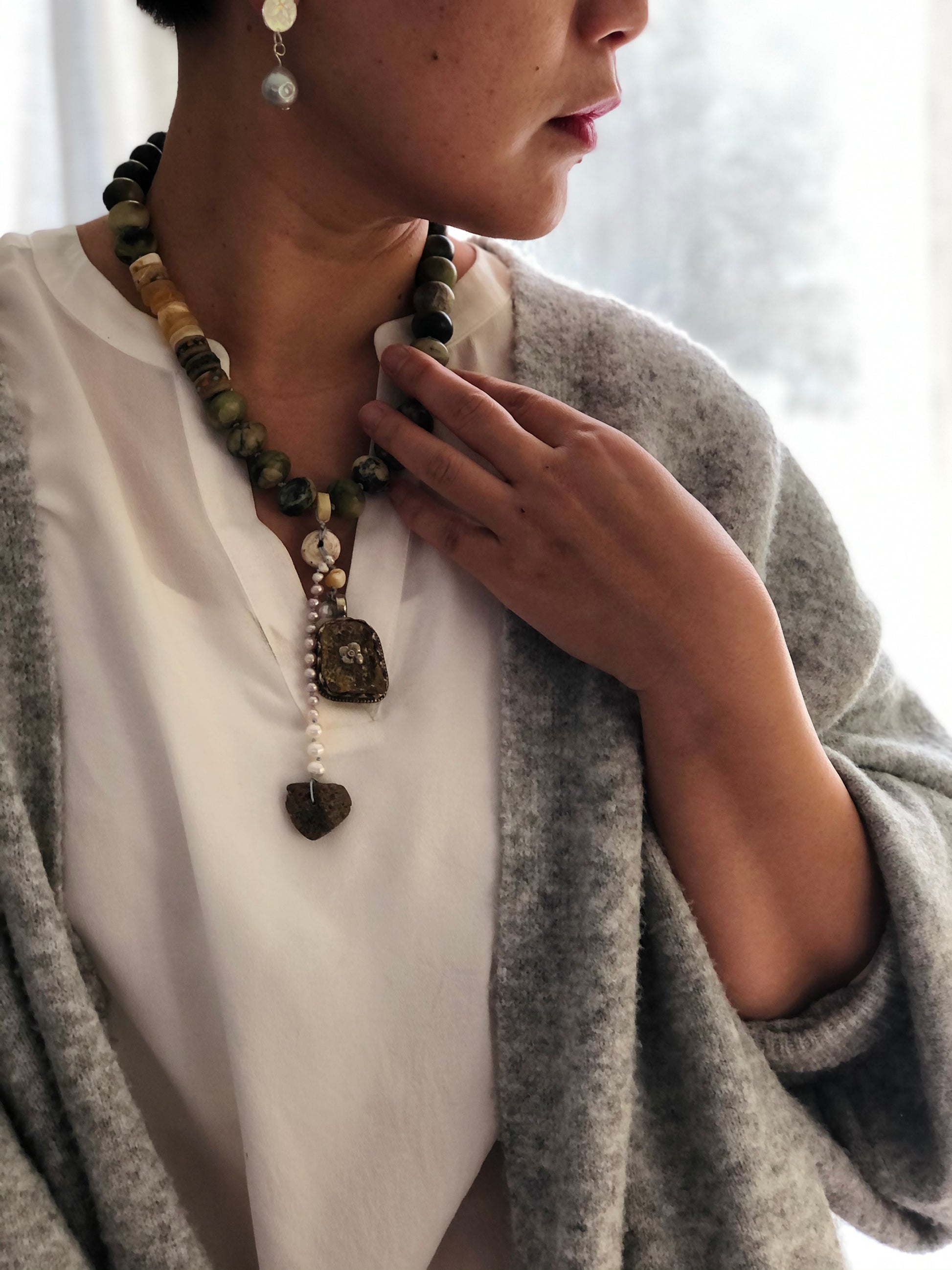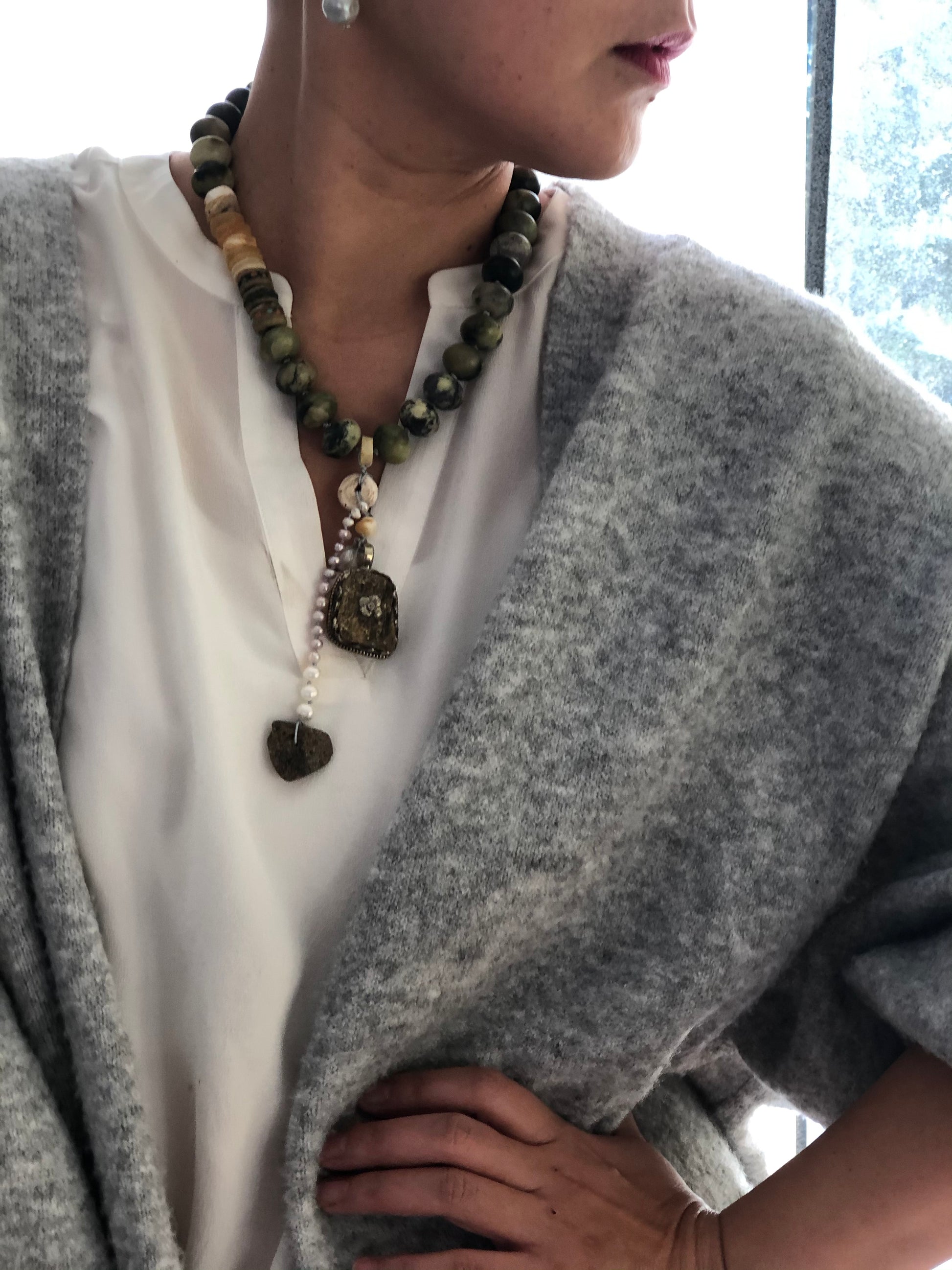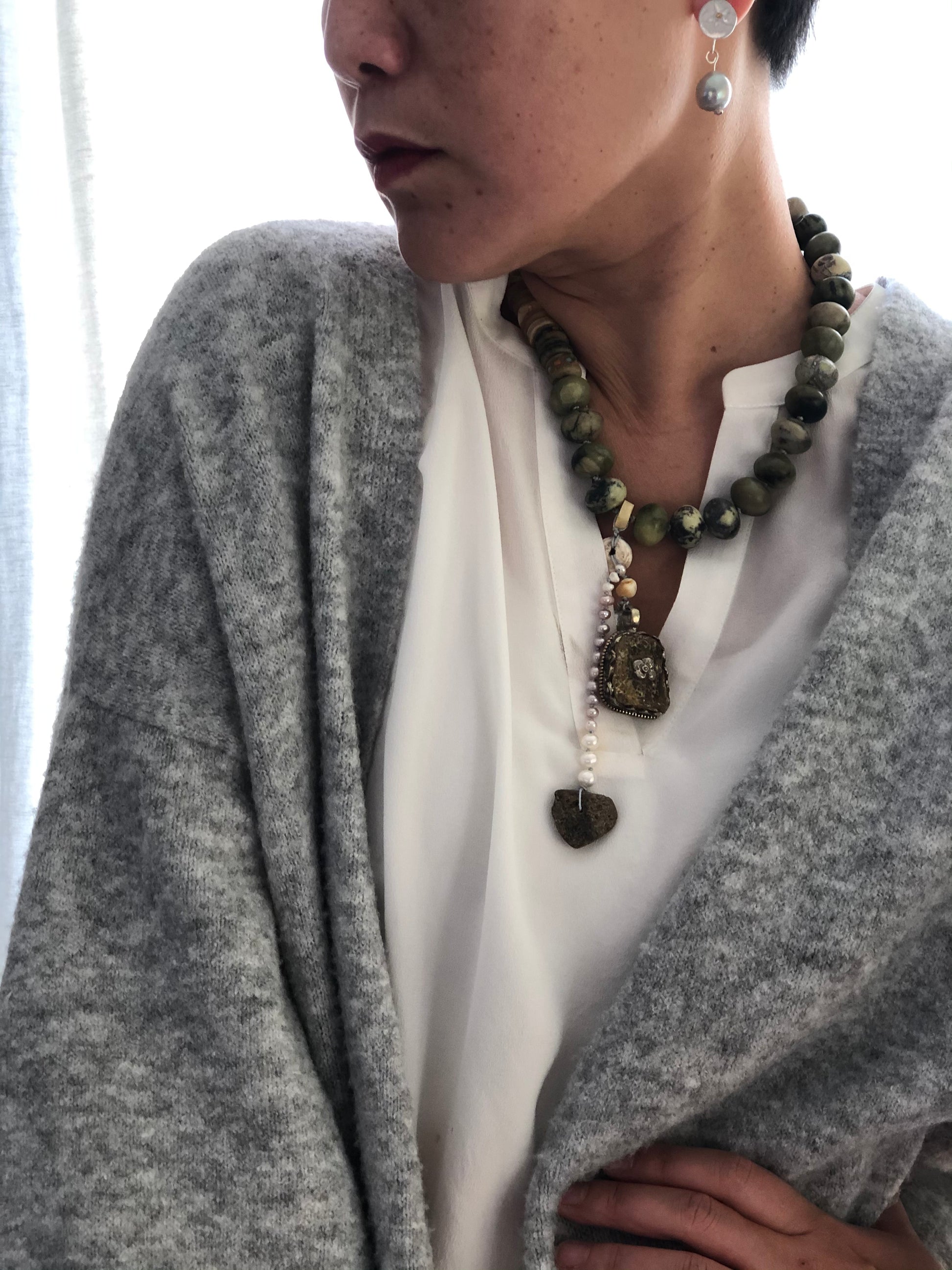 Materials : Jasper, Tibetan silver pendent with amber, baltic amber