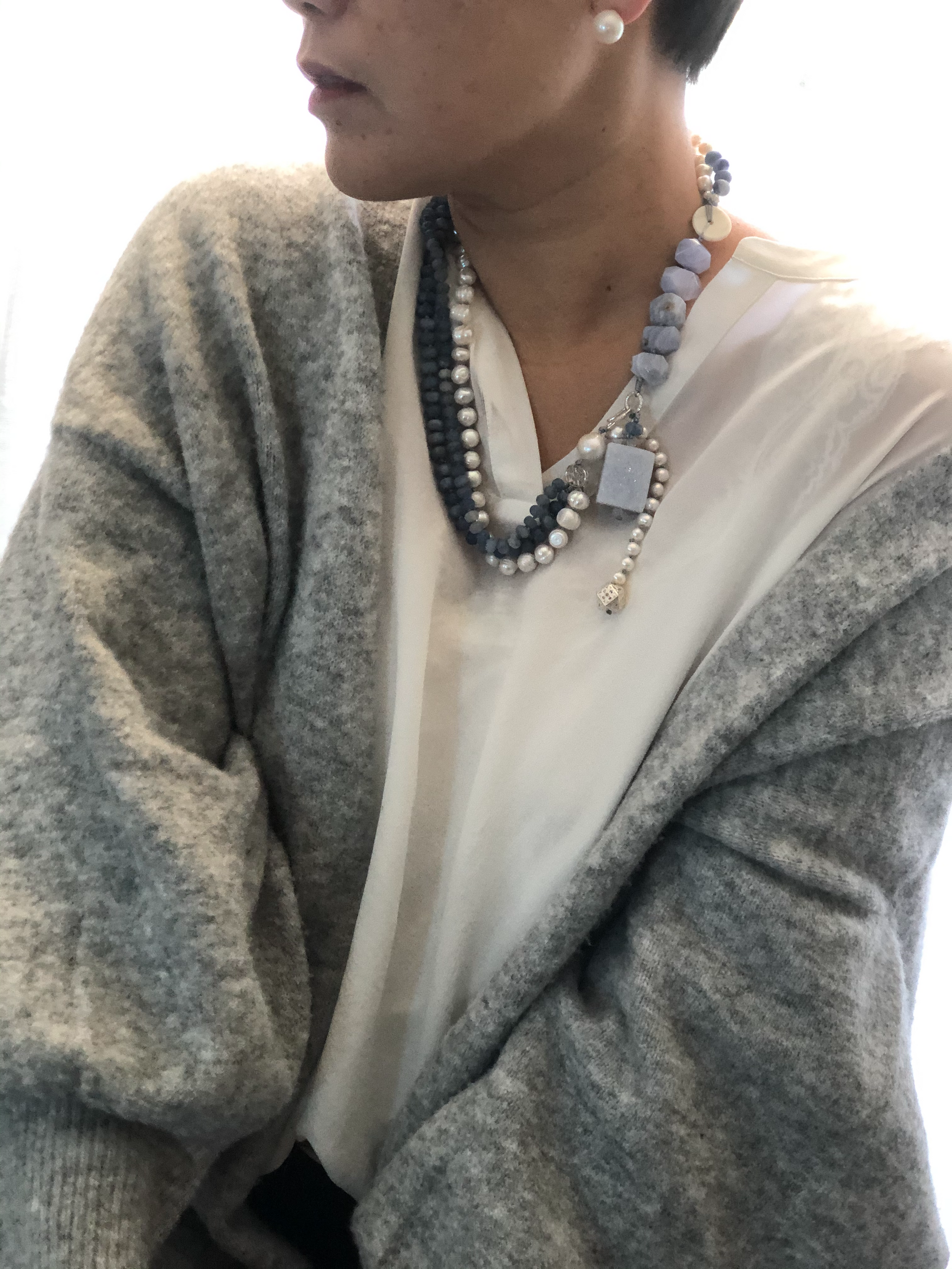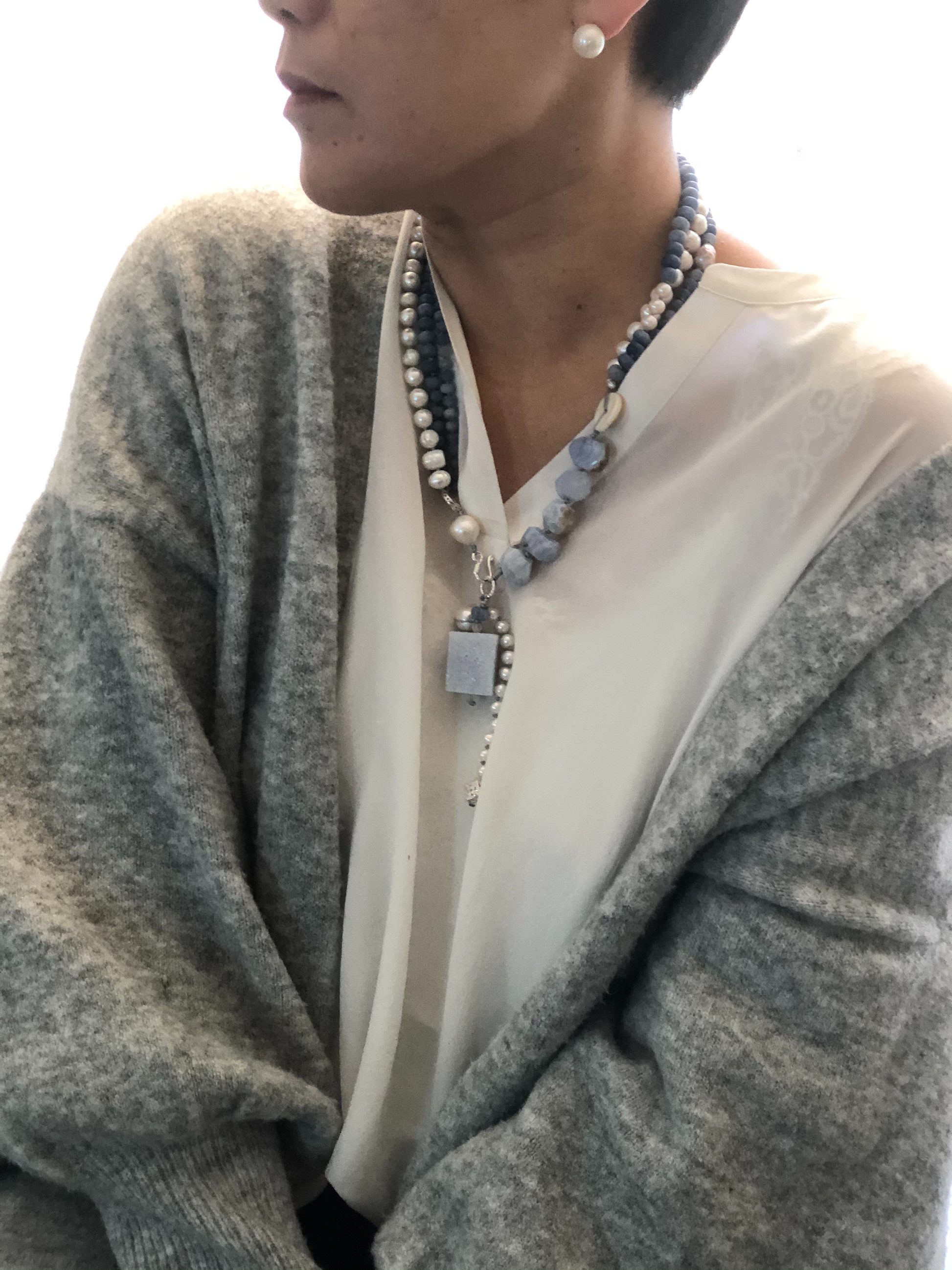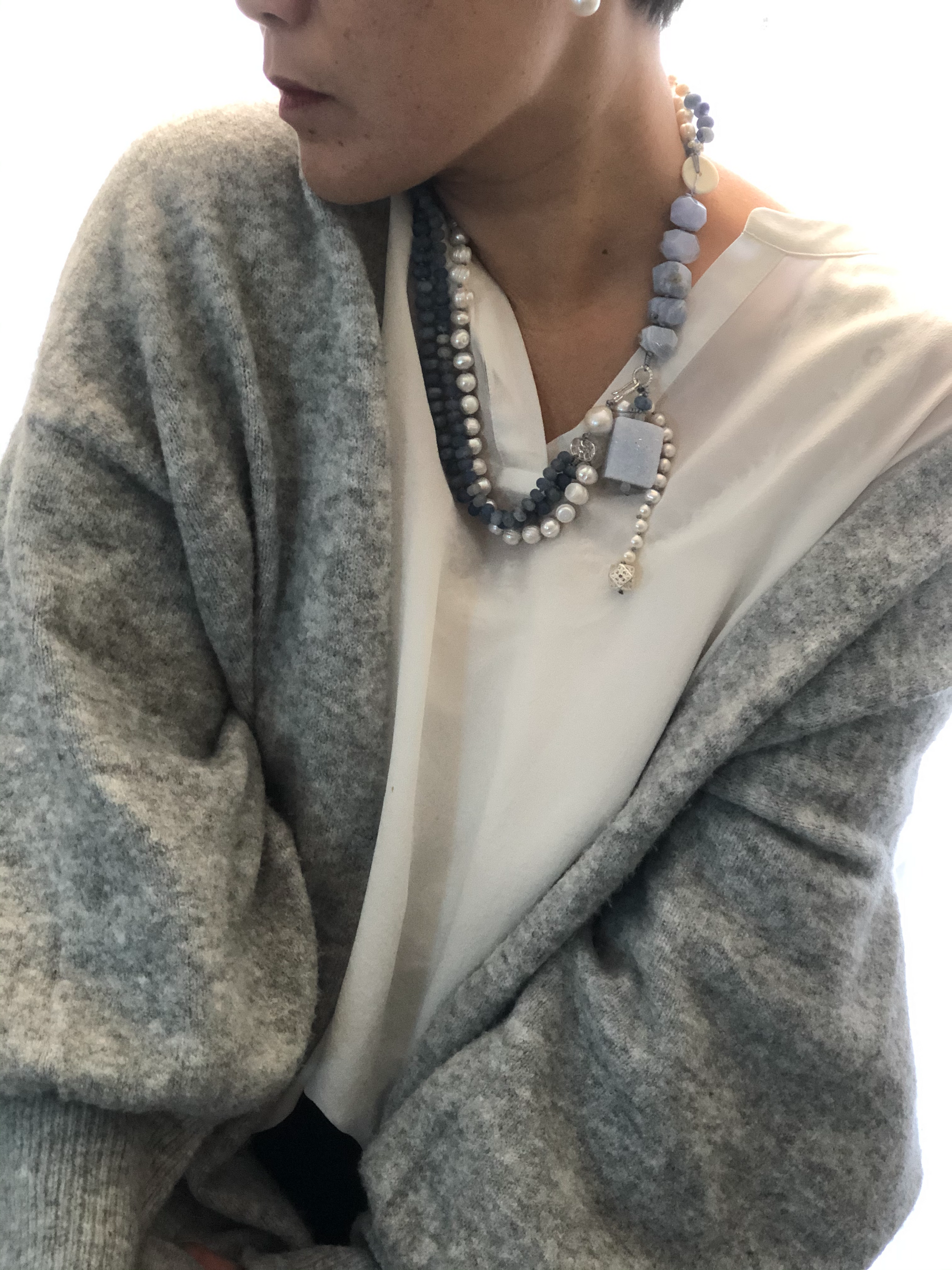 Materials : Blue lace agate, blue agate, fresh water pearl , fine silver