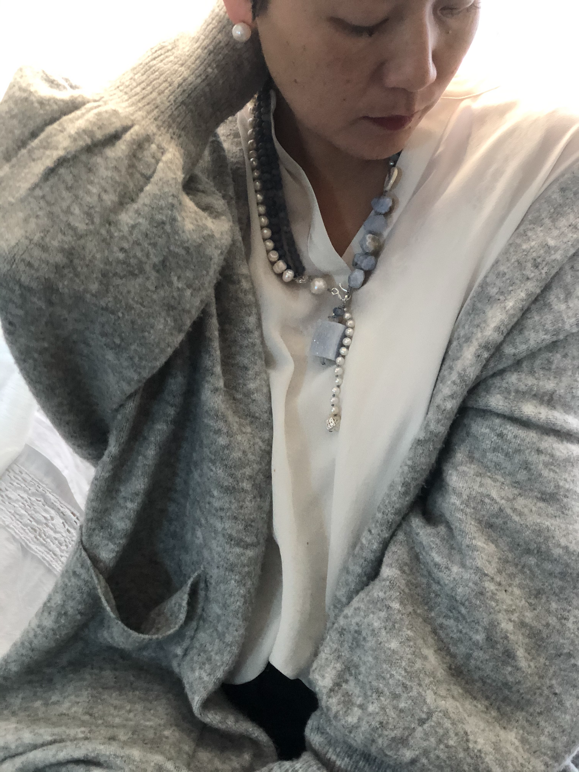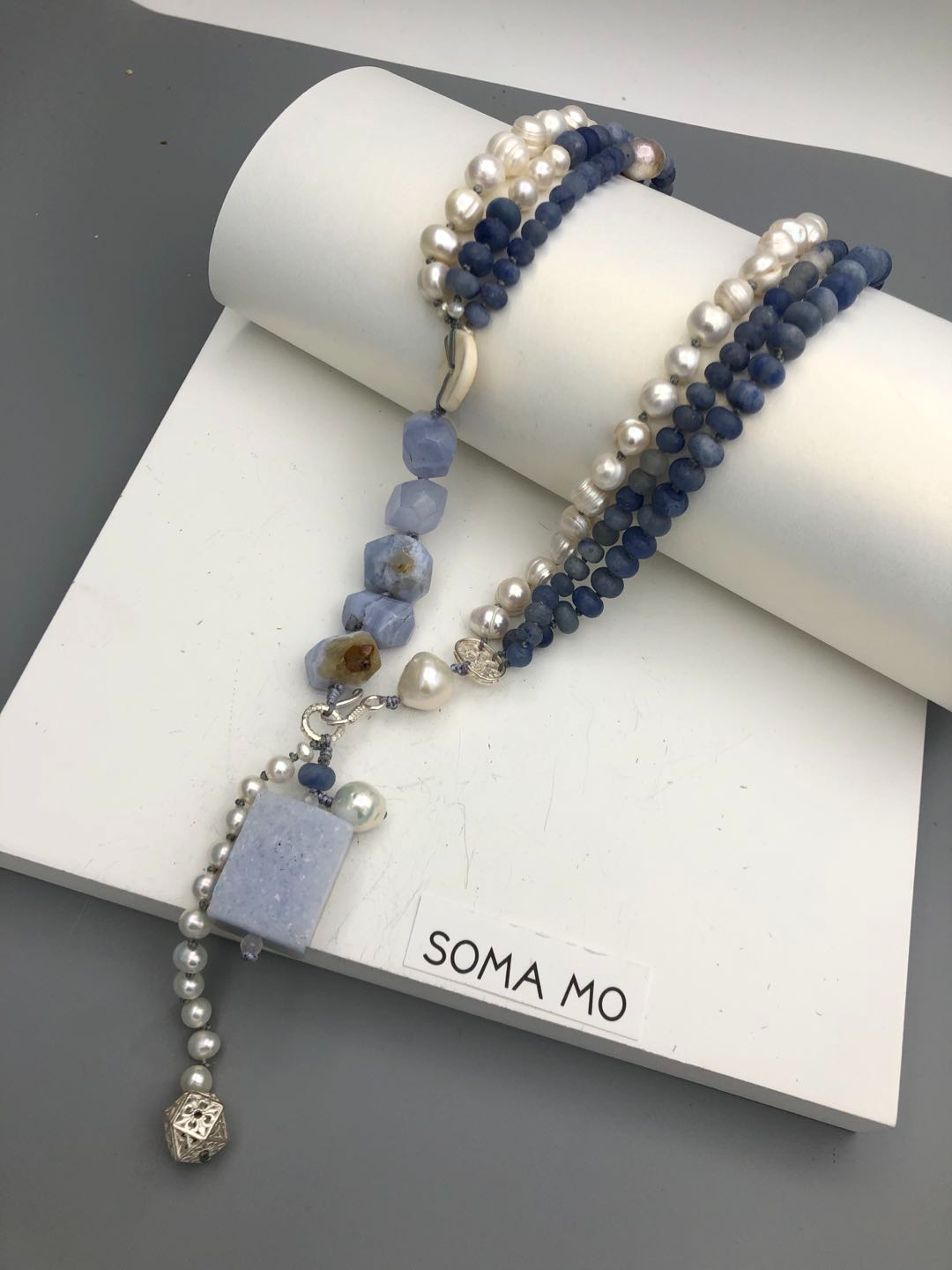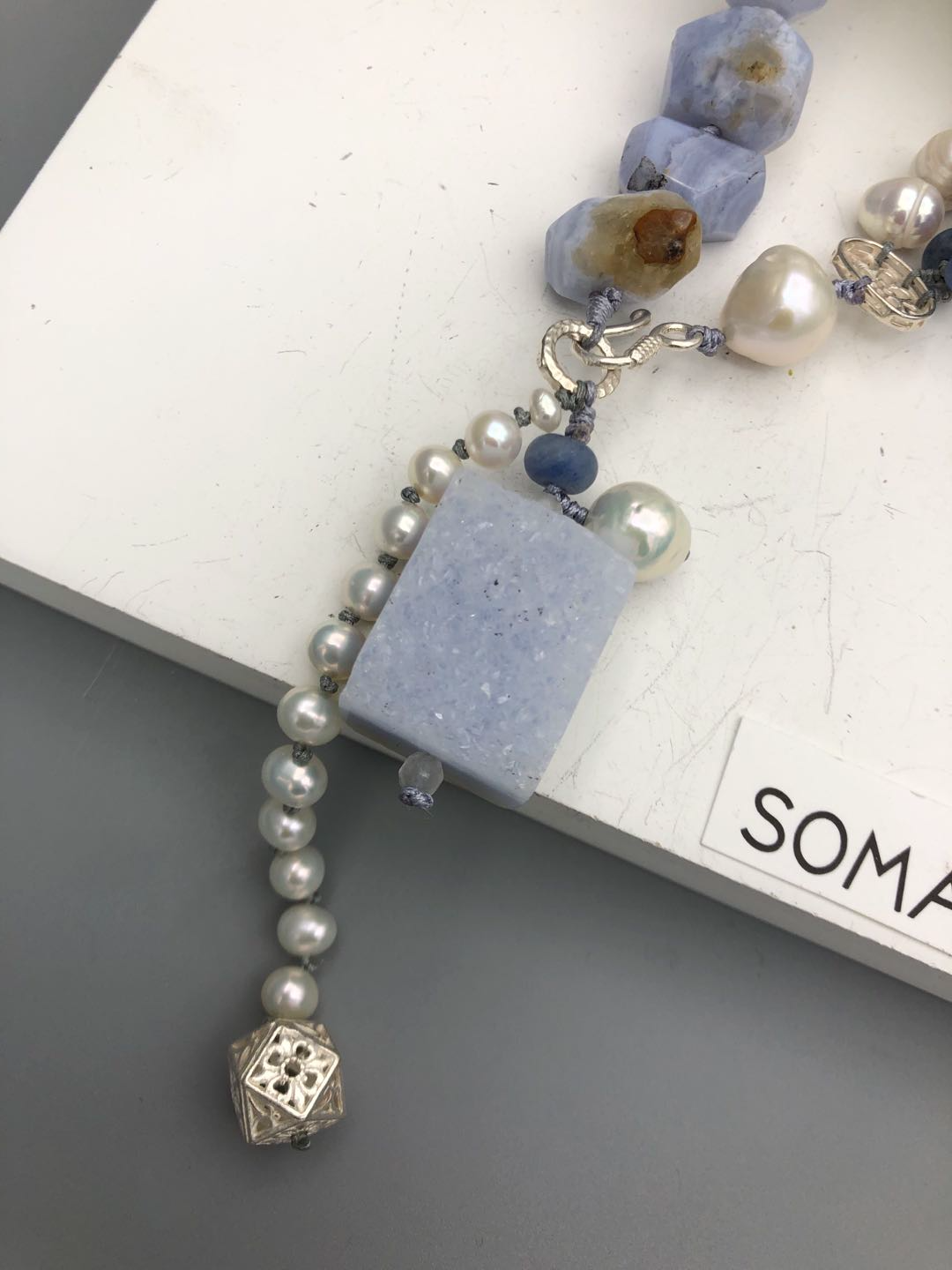 Materials : Blue lace agate, blue agate, fresh water pearl , fine silver