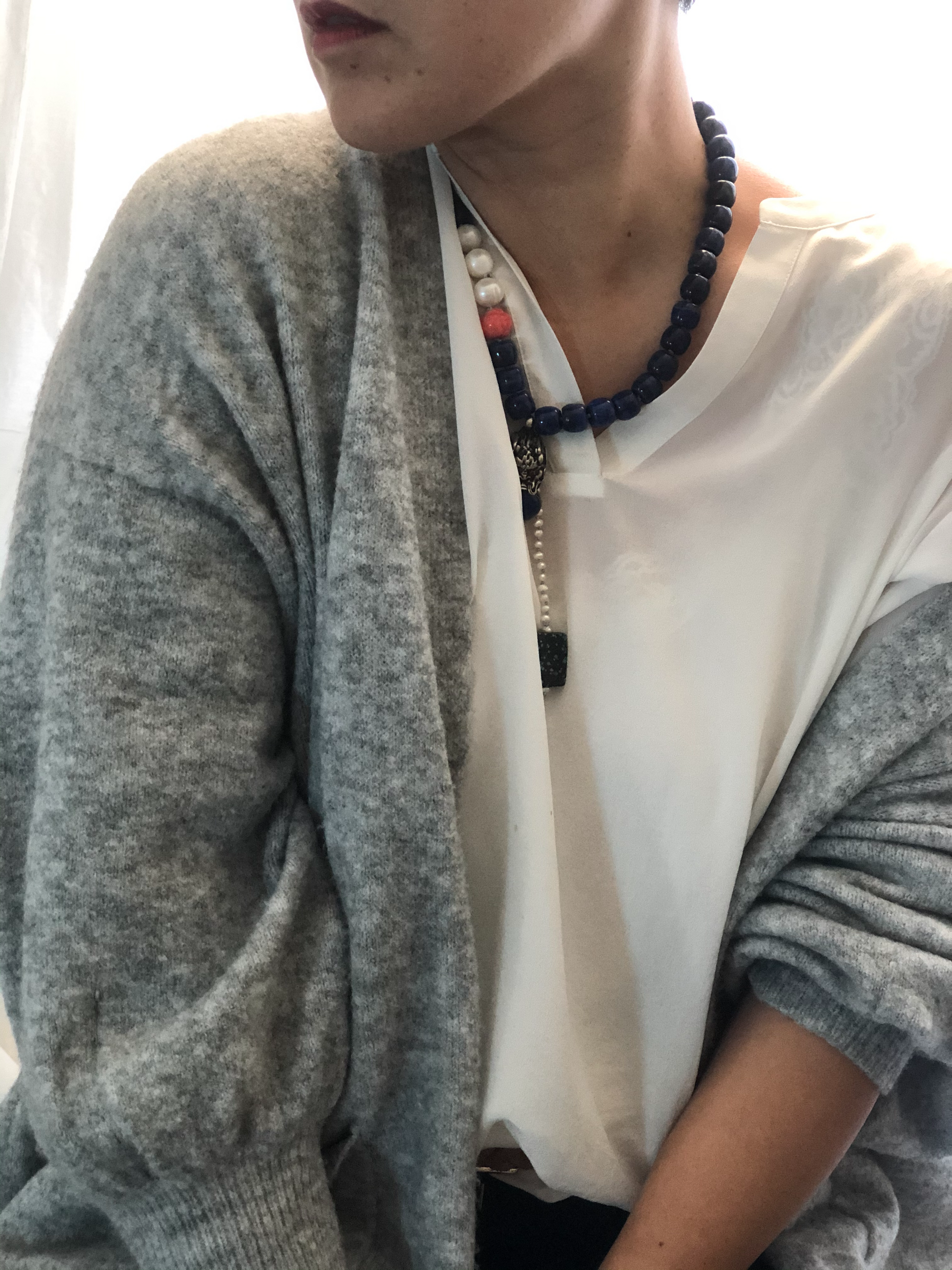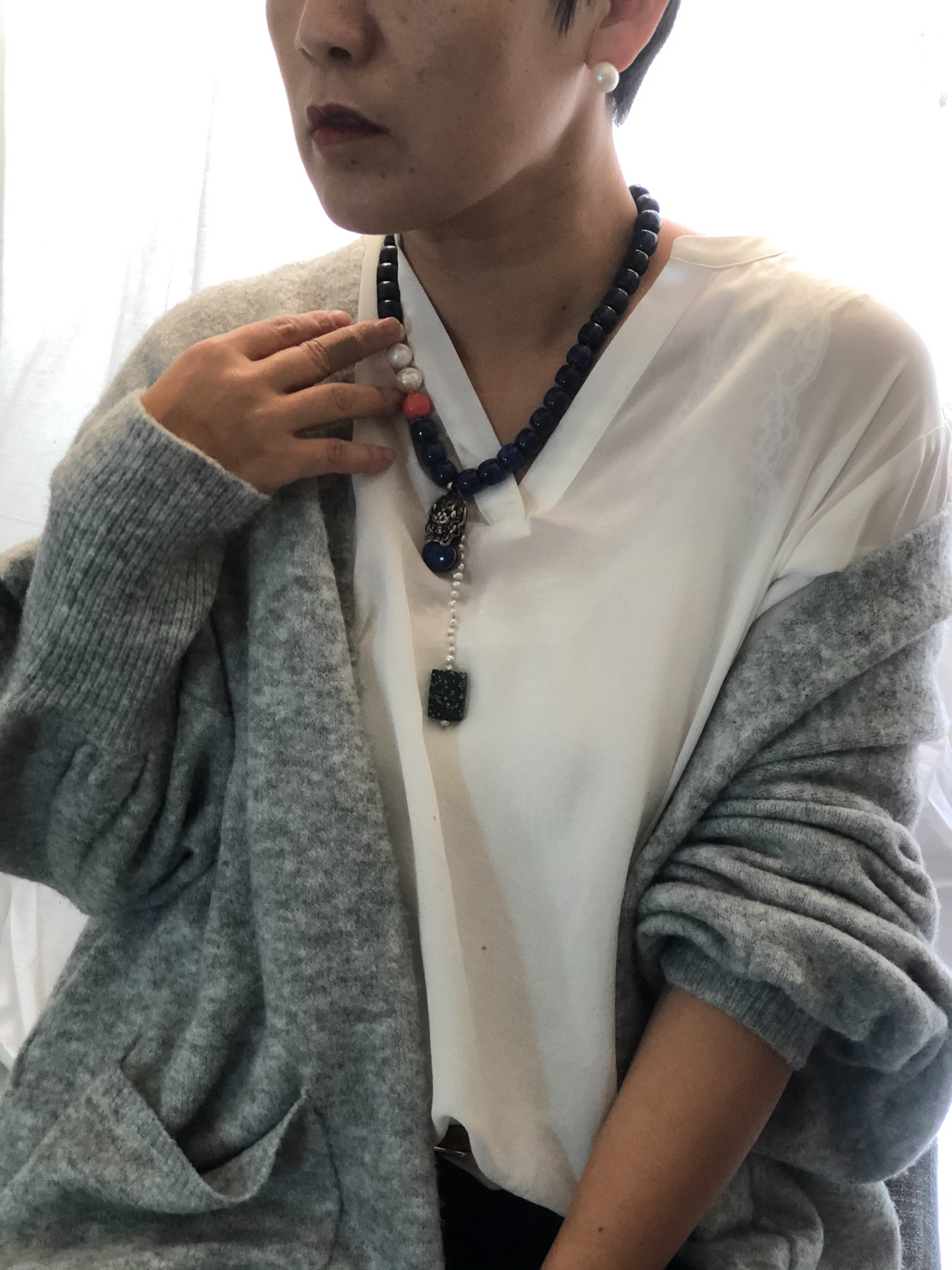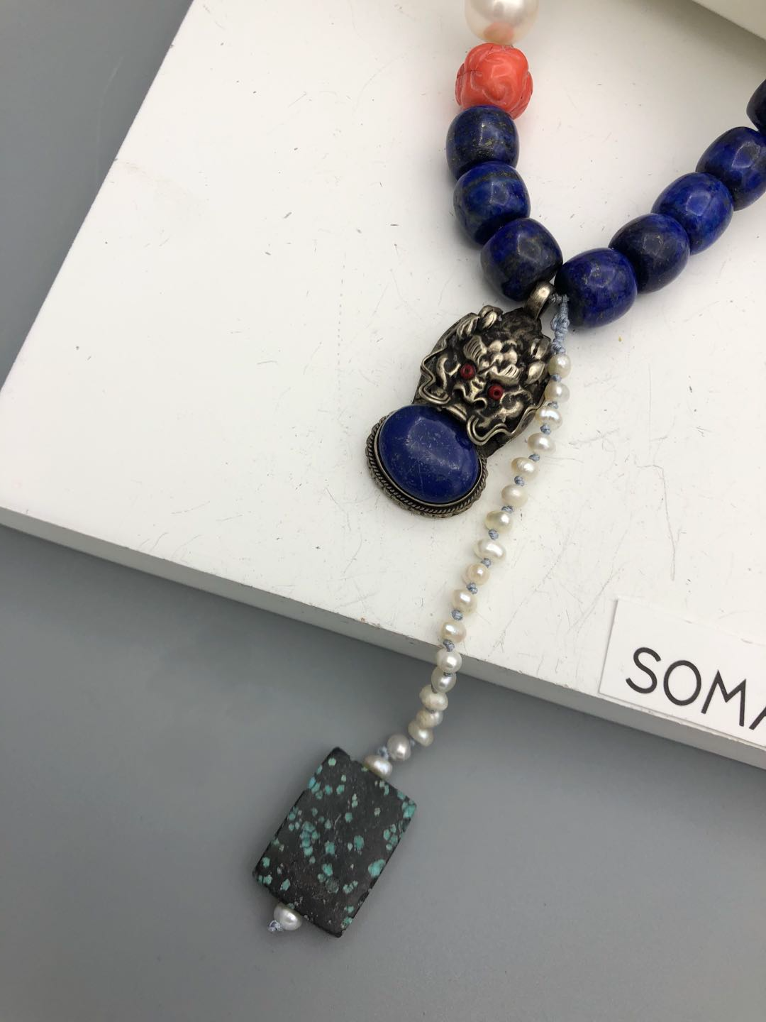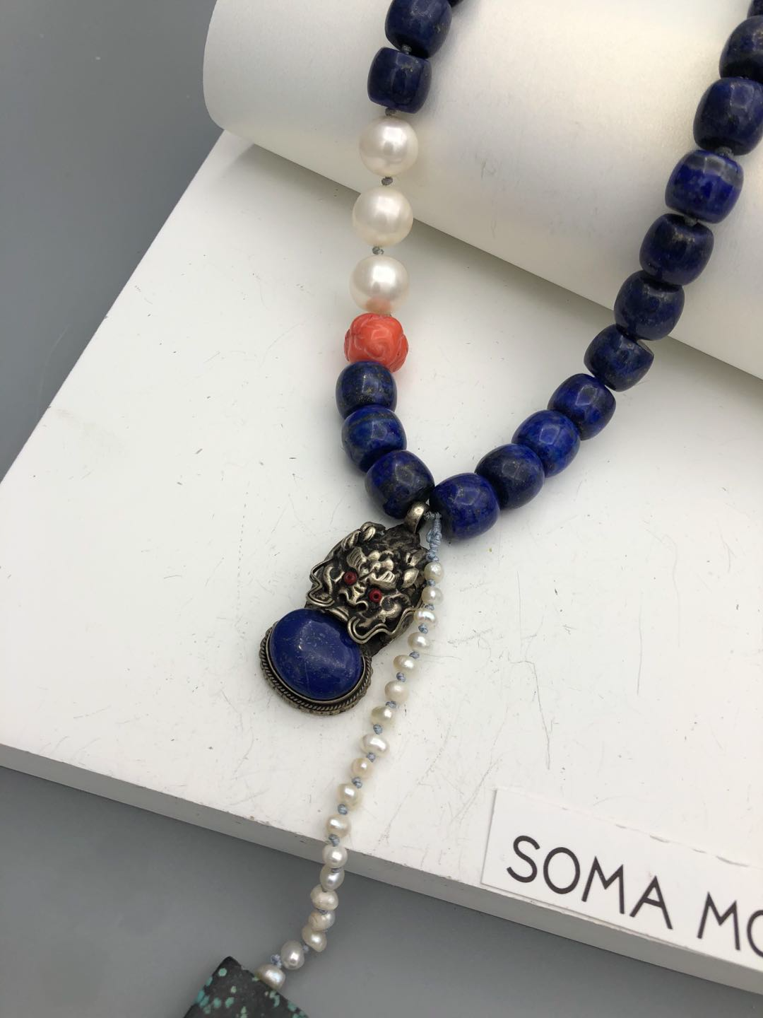 Materials : Lapis, fresh water pearl, red coral, Tibetan dragon pendent , tequoise