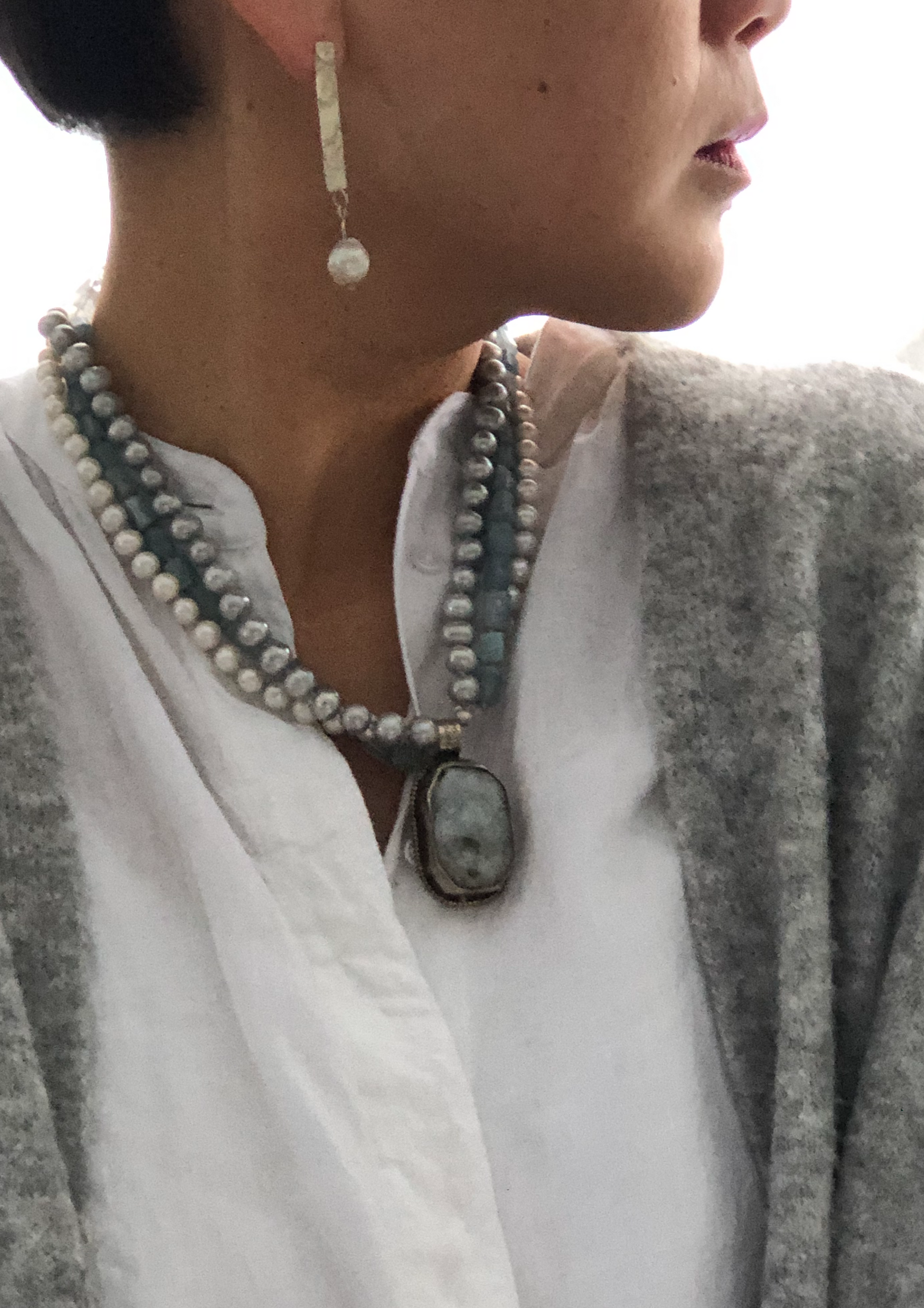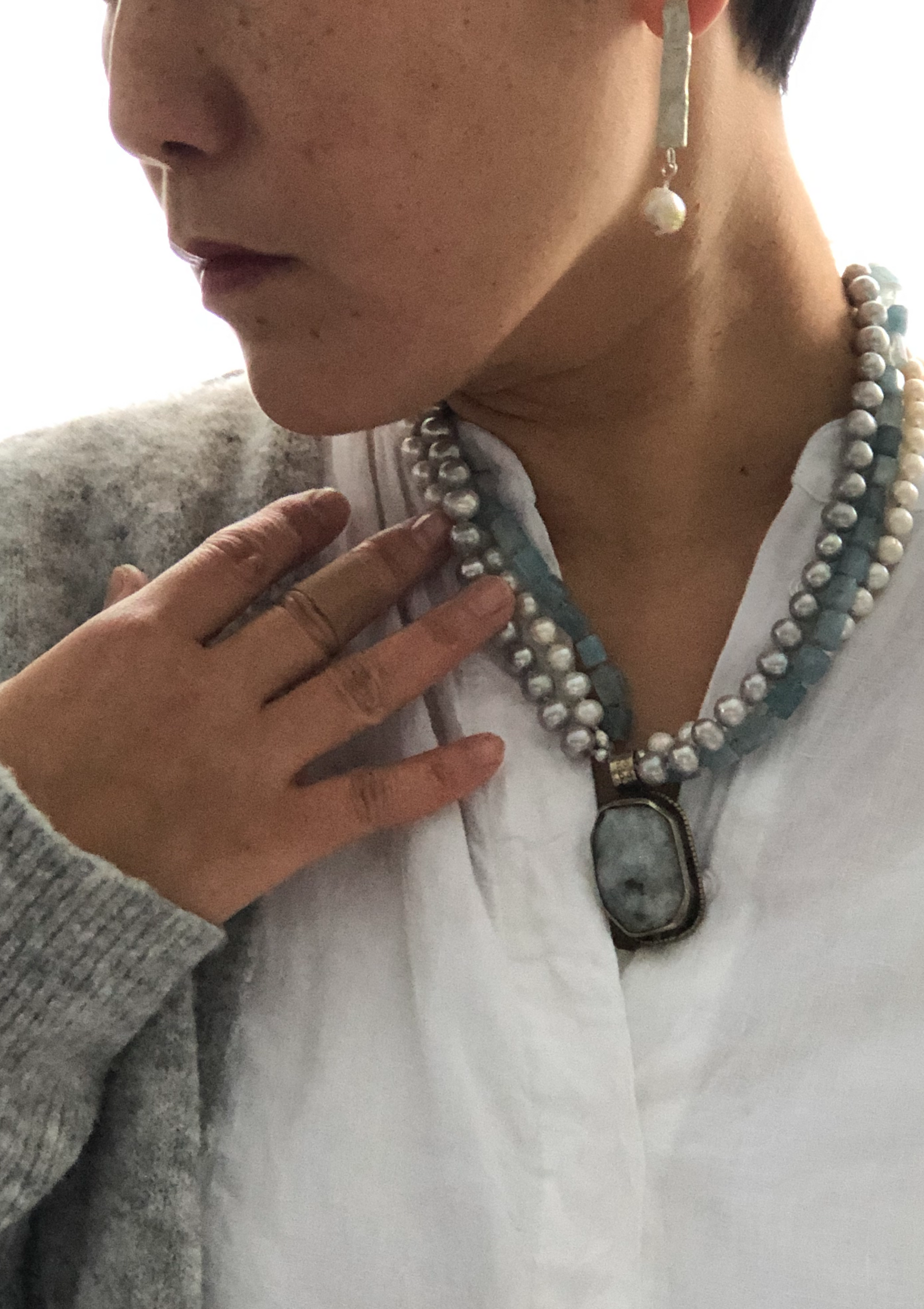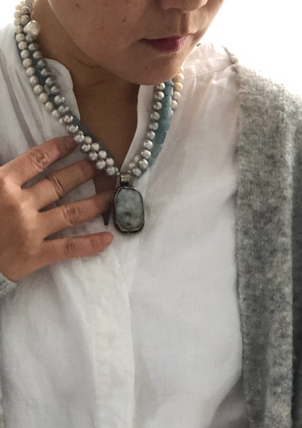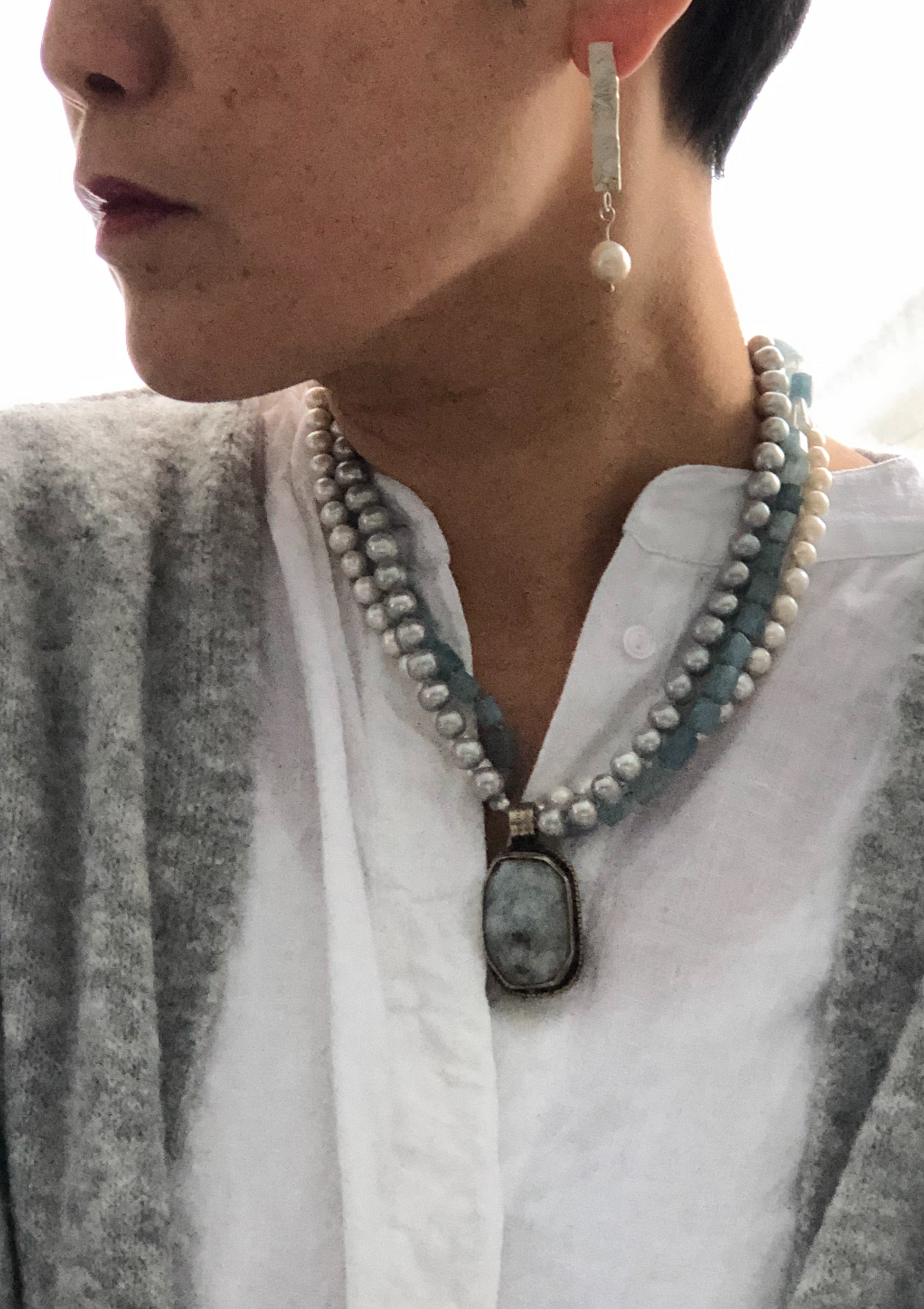Materials : Aquamarine, fresh water pearl , Tibetan silver pendent with aquamarine.