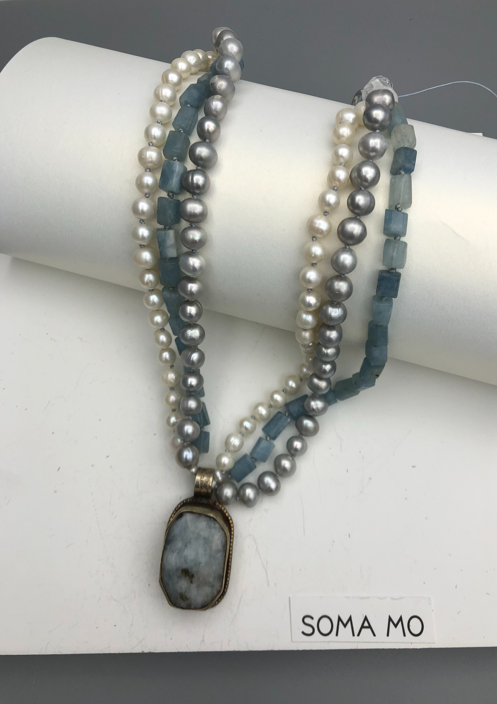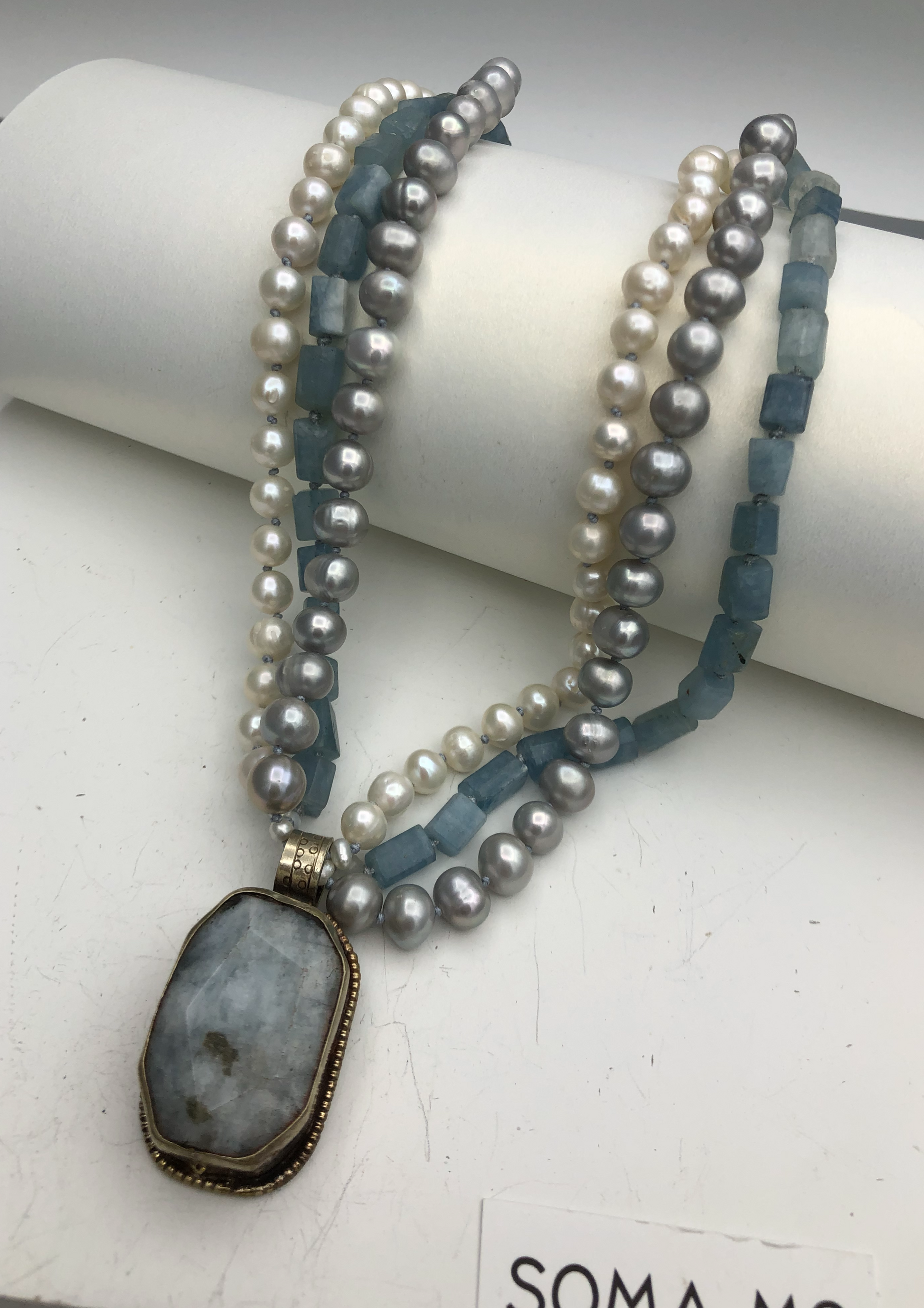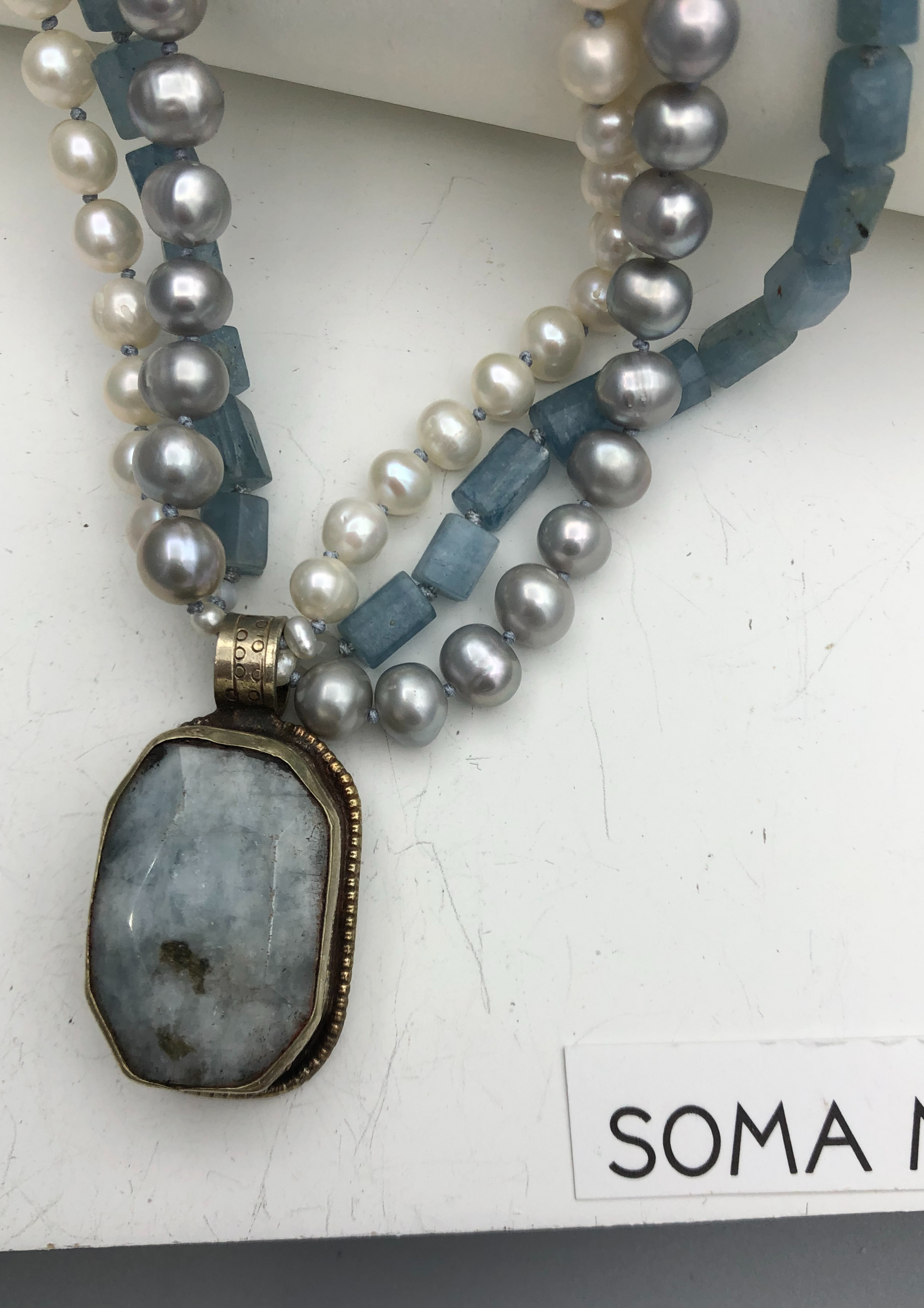 Materials : Aquamarine, fresh water pearl , Tibetan silver pendent with aquamarine.