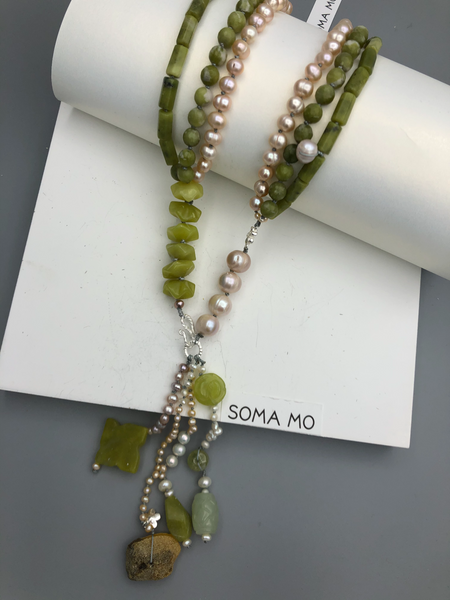 Materials : Olive jade, fresh water pearl, jade, fine silver