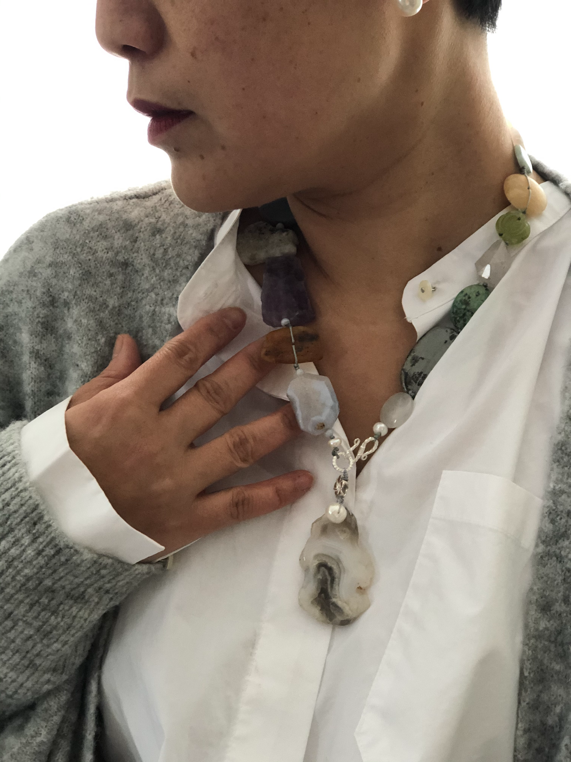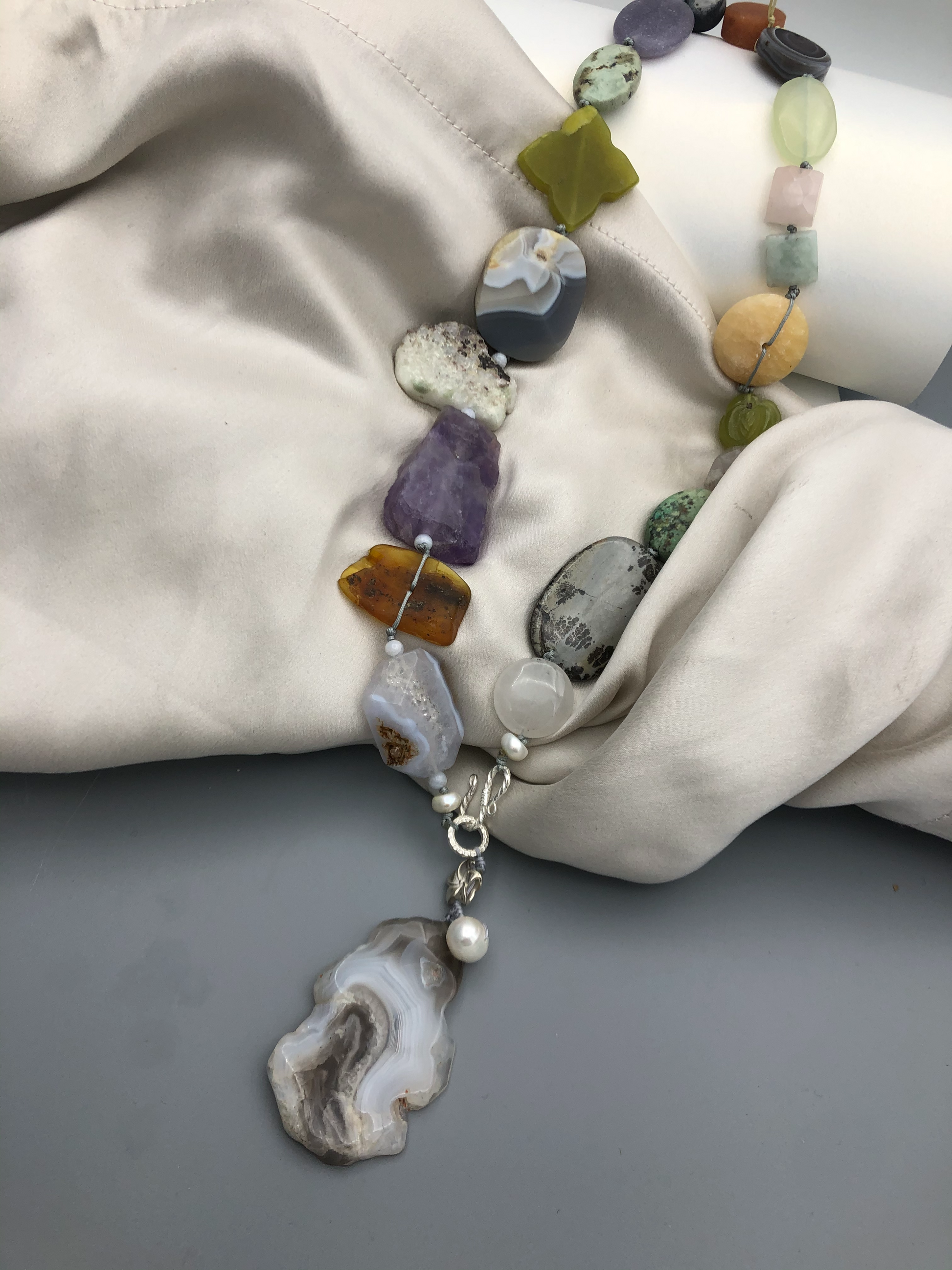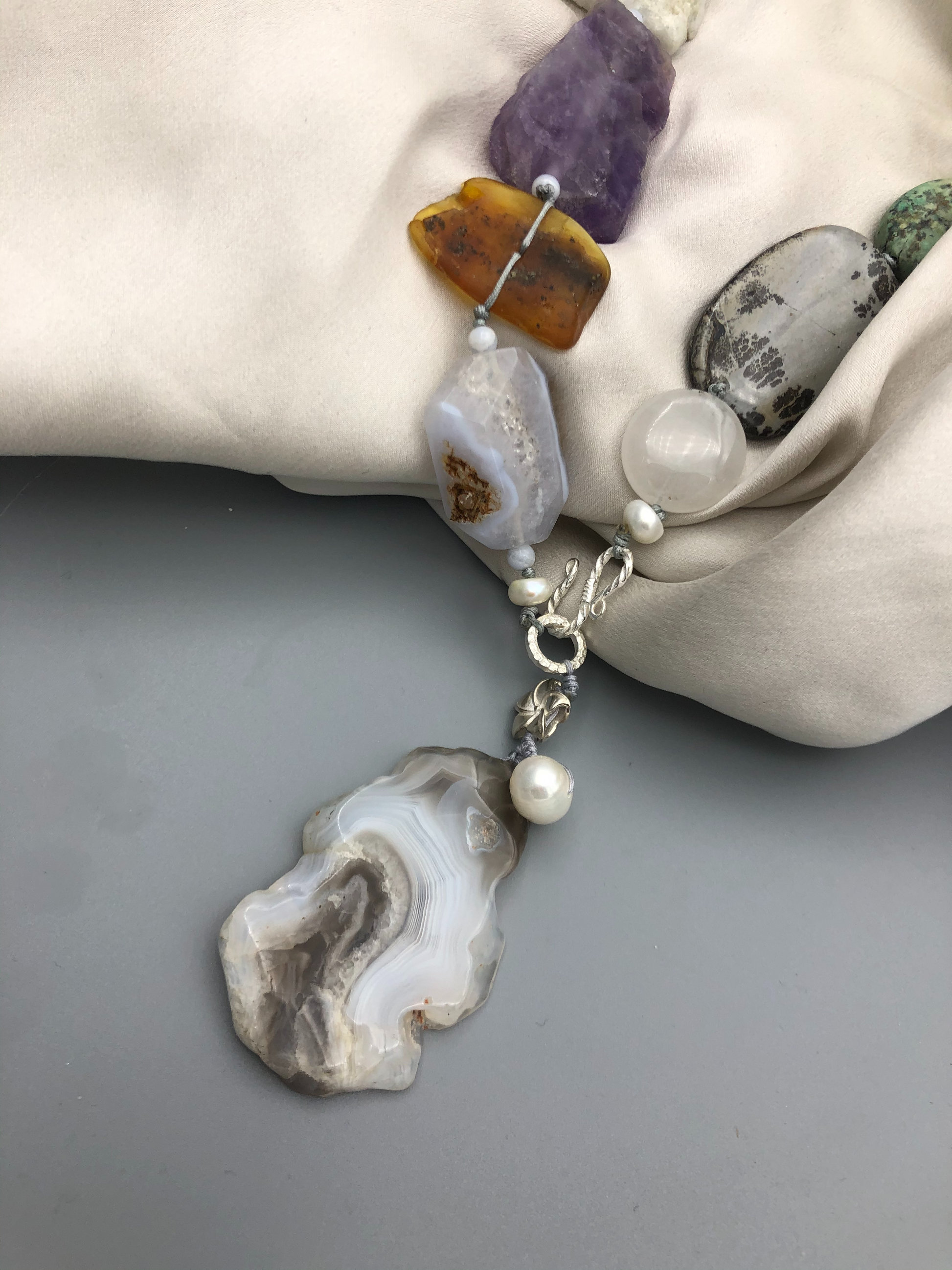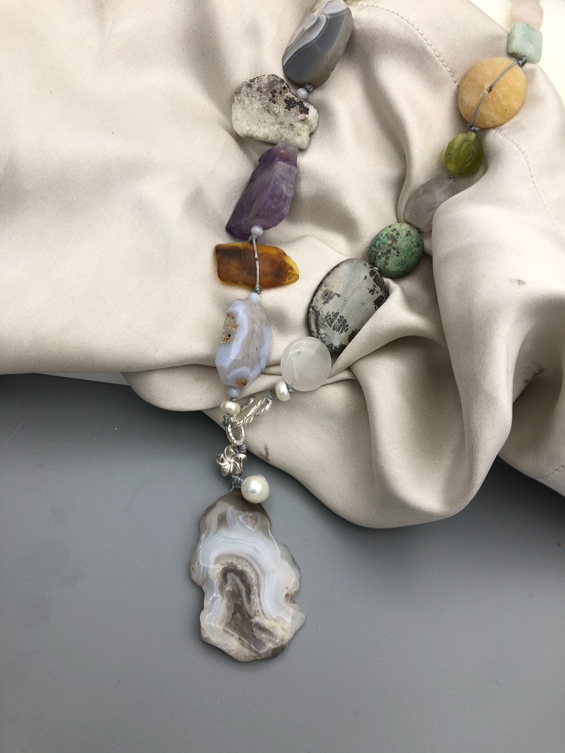 Materials : Agate, amethyst, olive jade, baltic amber, blue lace agate, fine silver