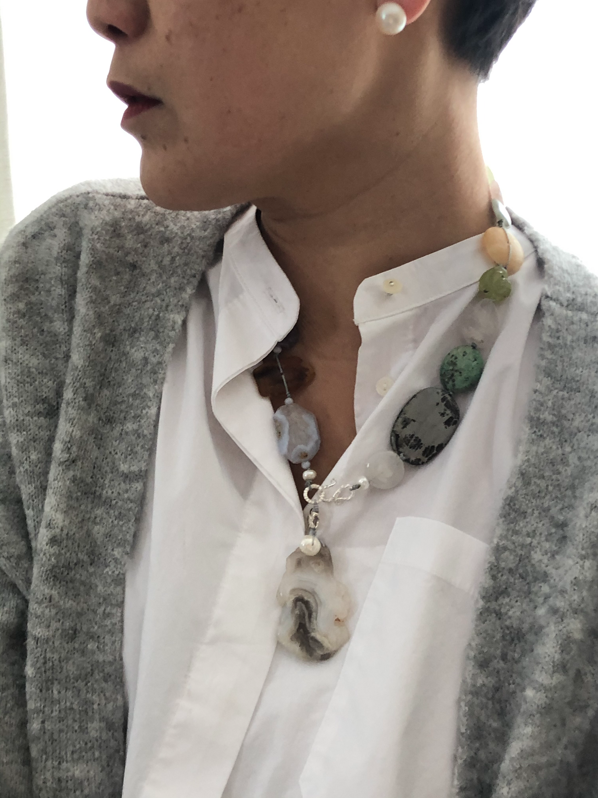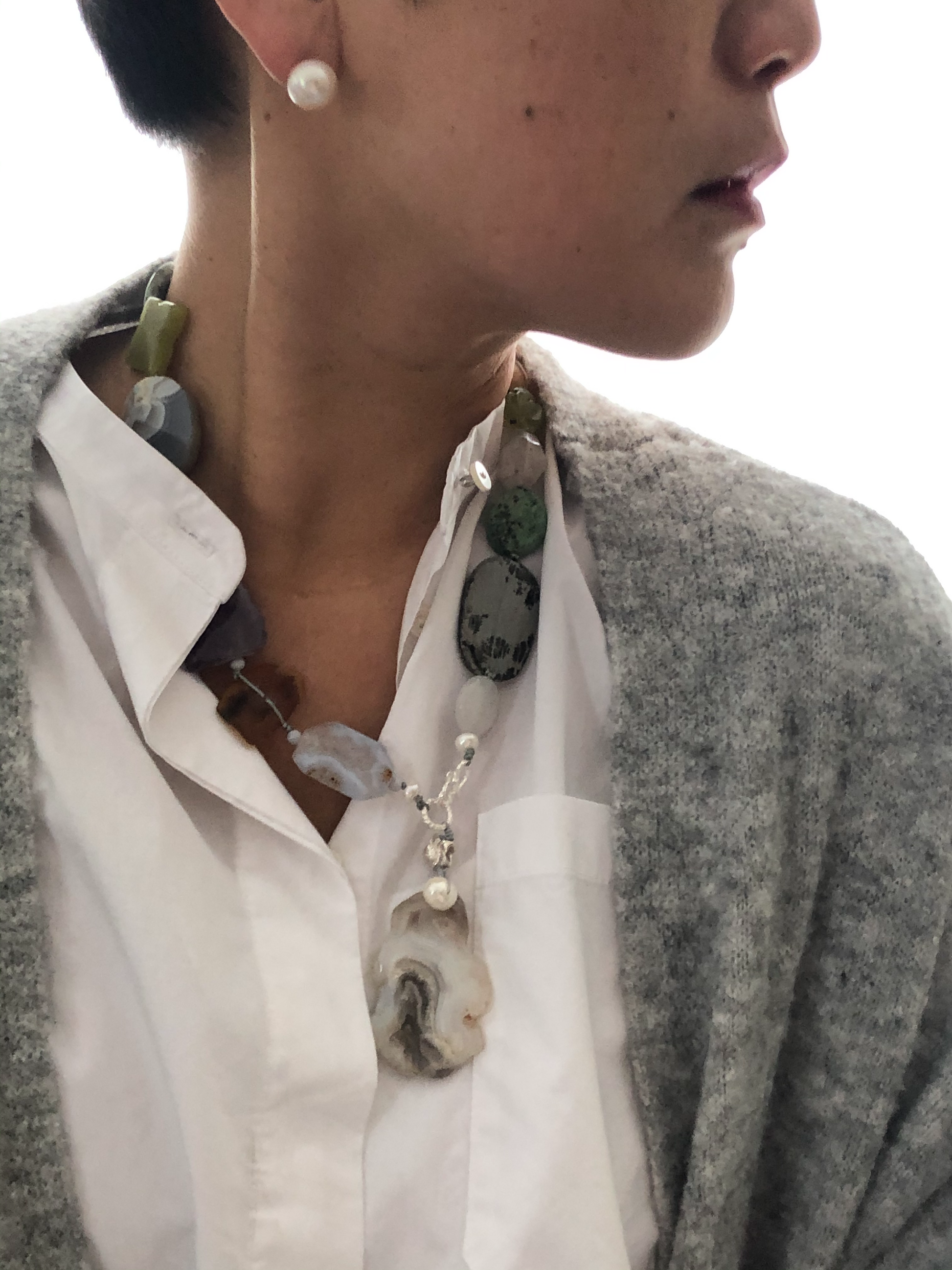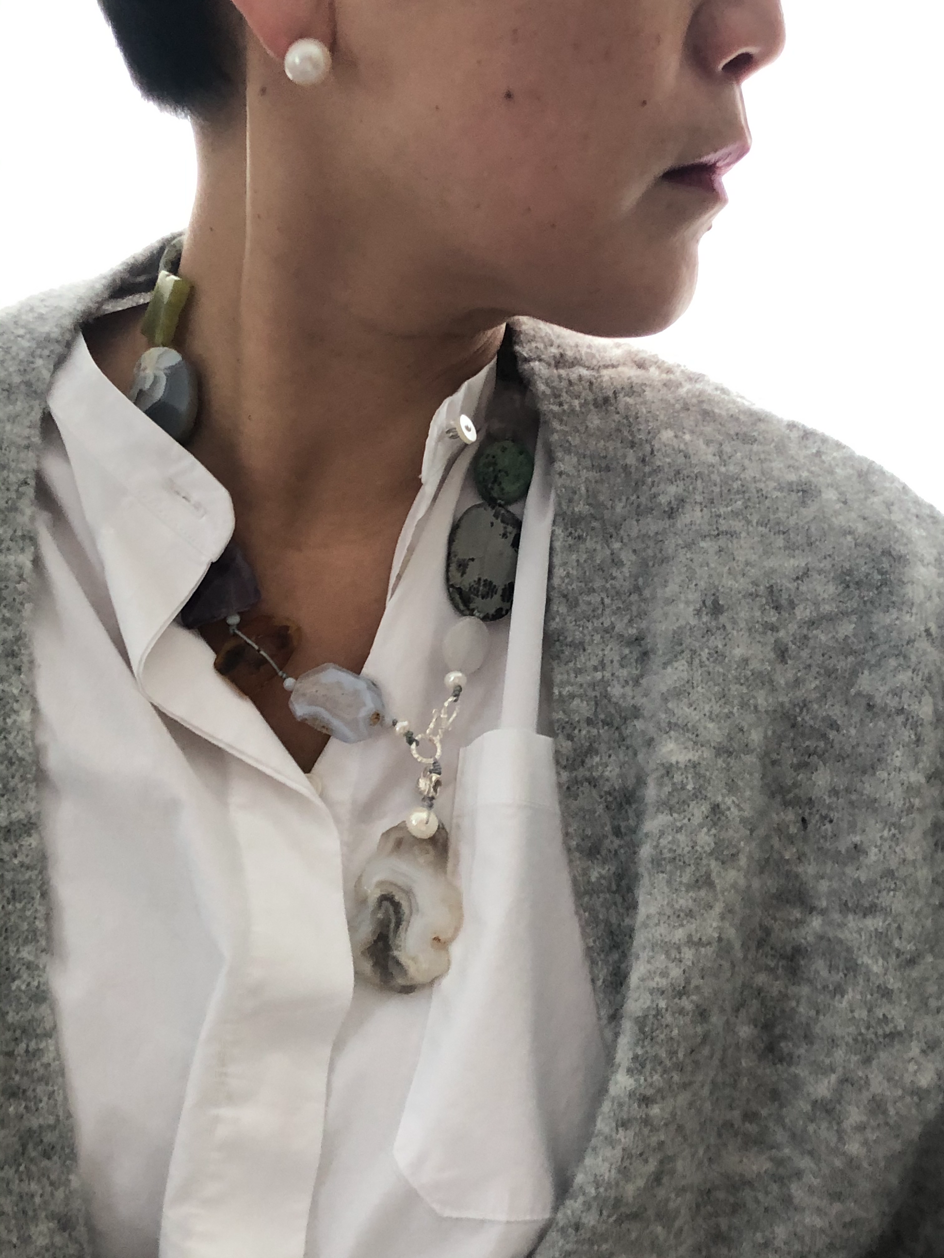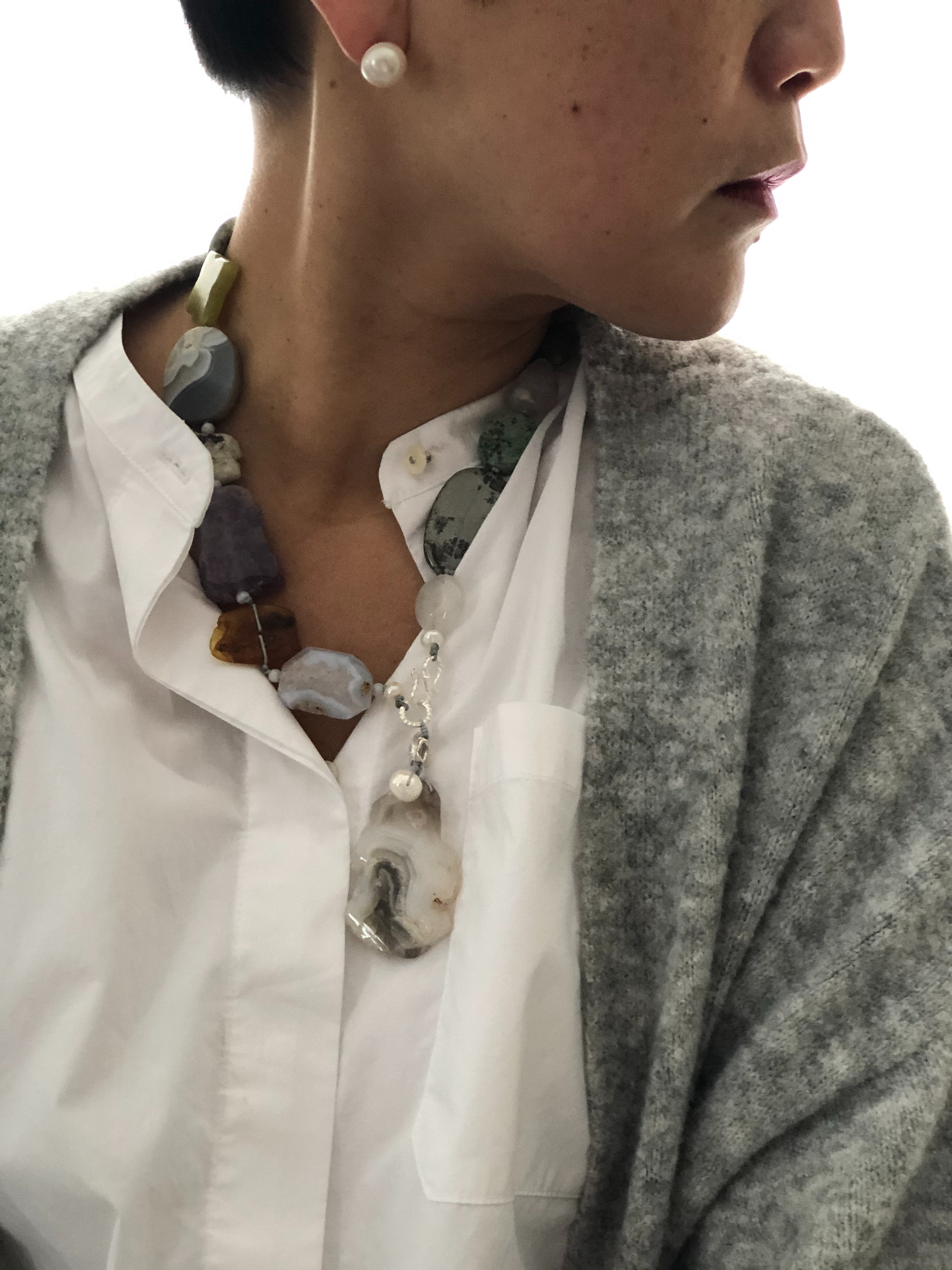 Materials : Agate, amethyst, olive jade, baltic amber, blue lace agate, fine silver