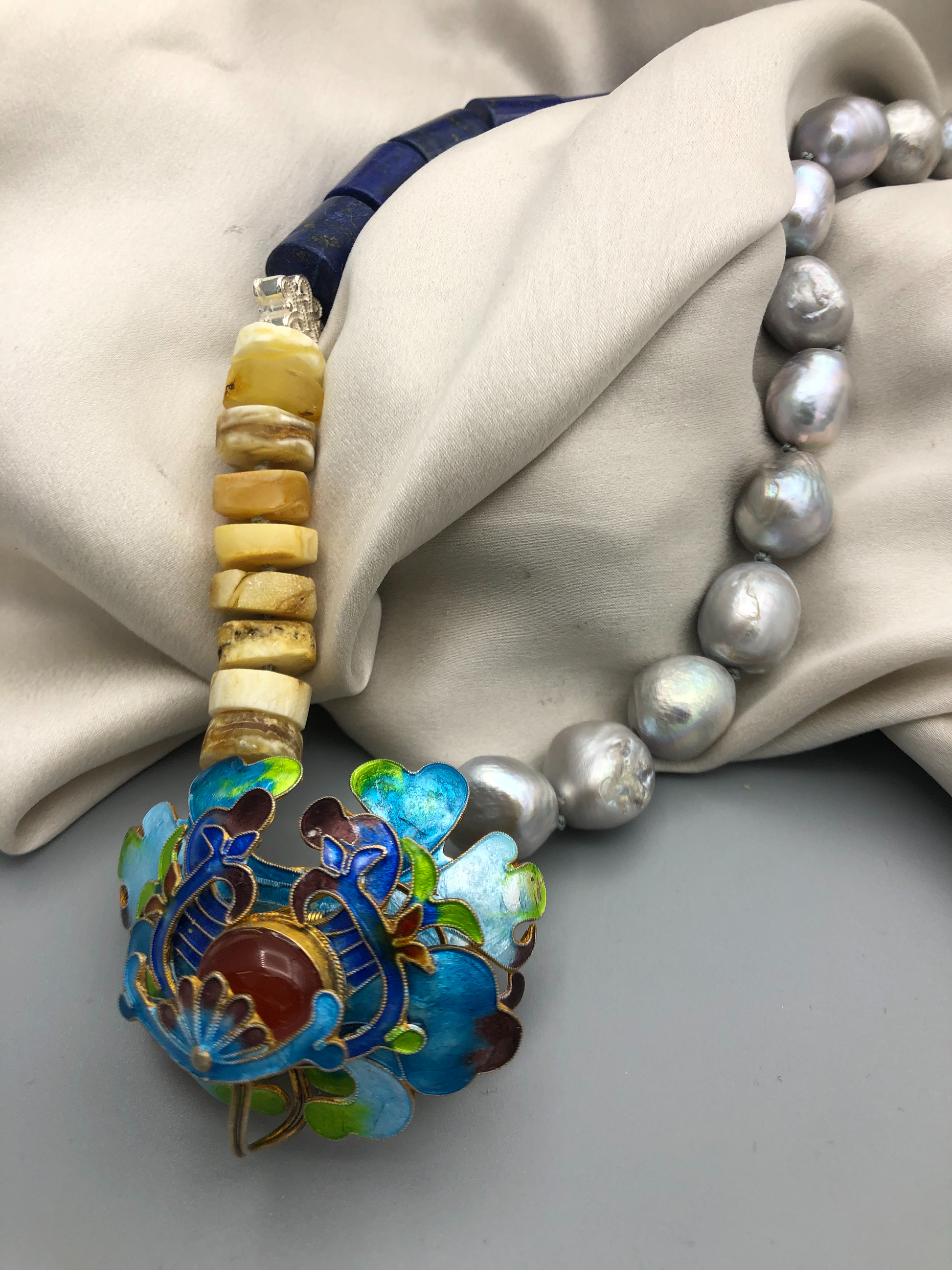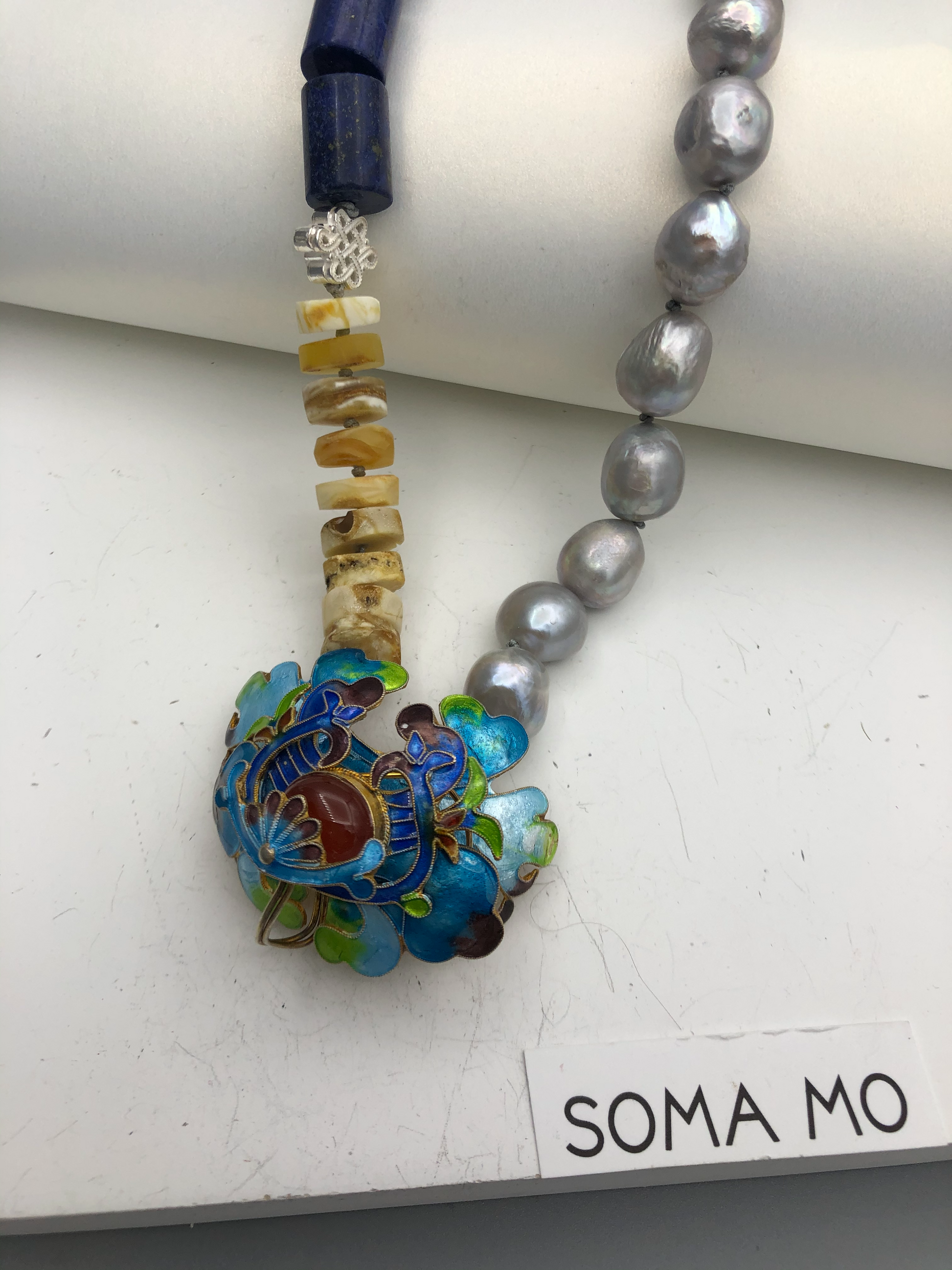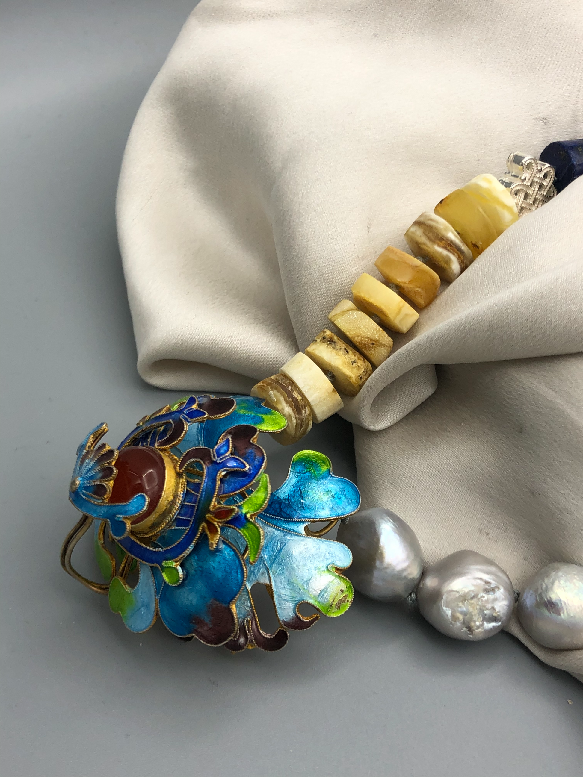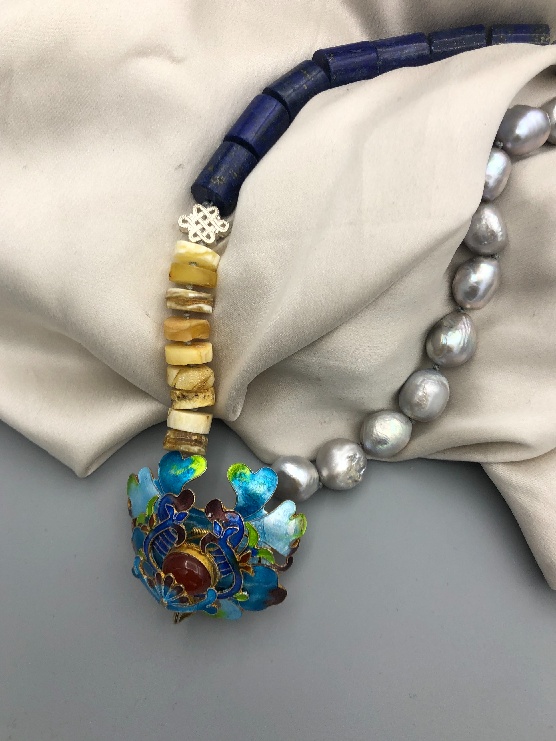 Materials : Baltic amber, lapis, fresh water pearl , silver enamal pendent